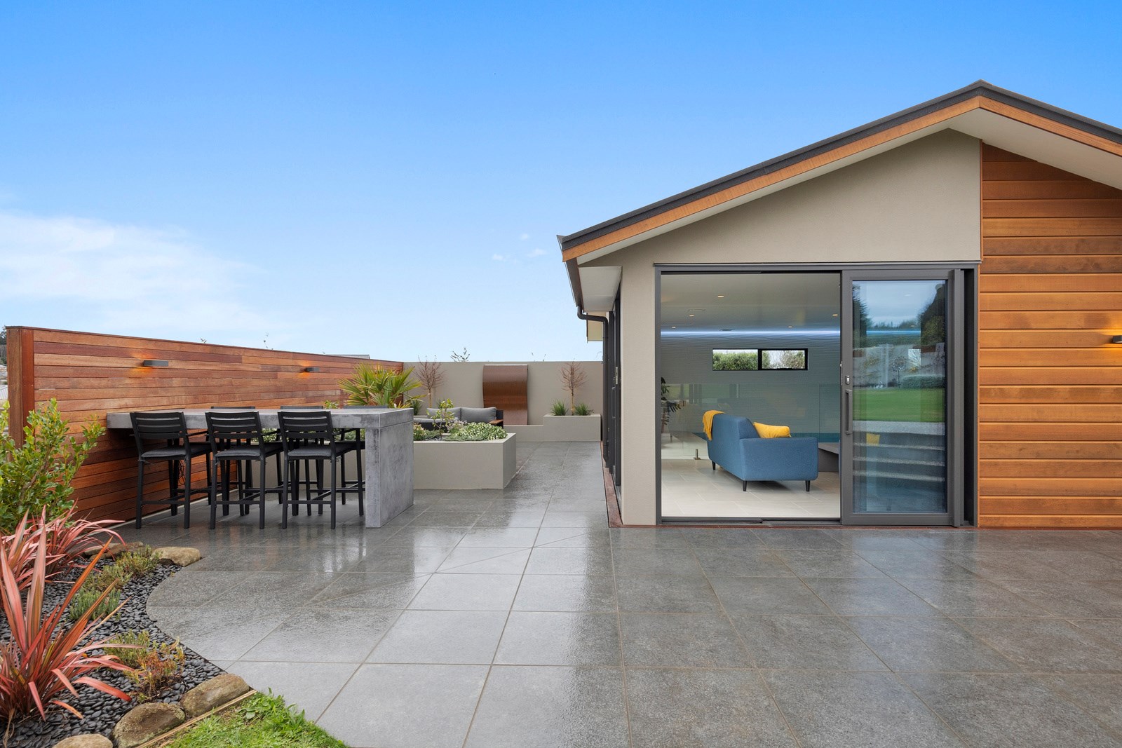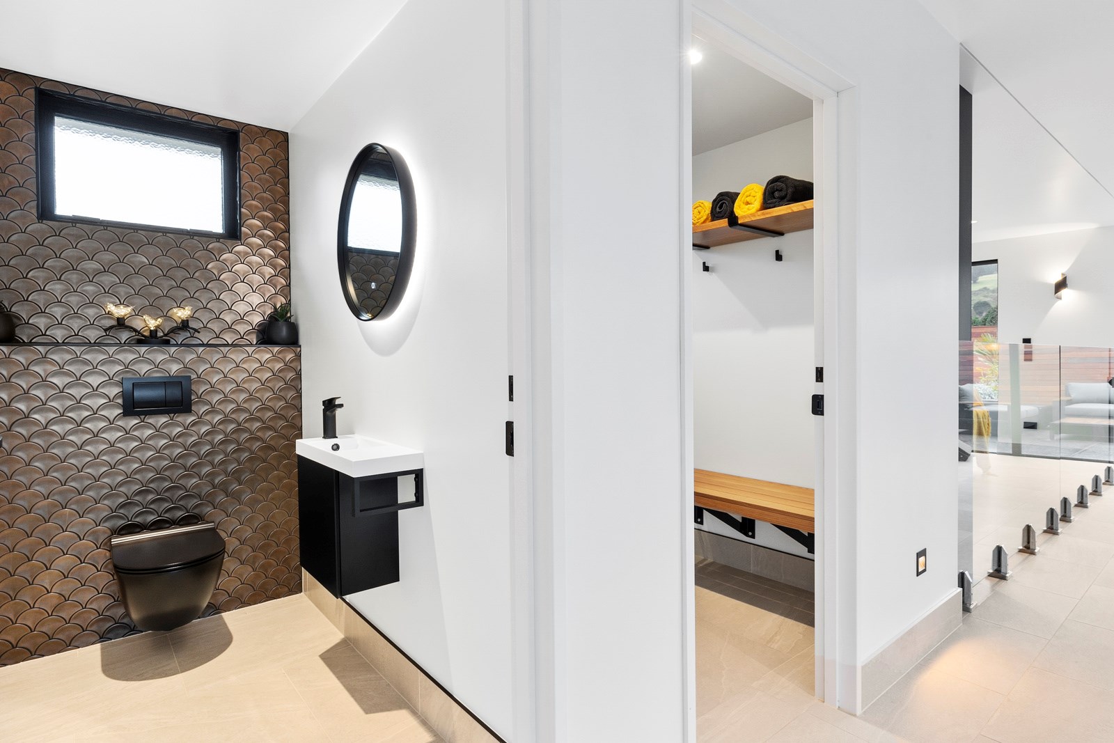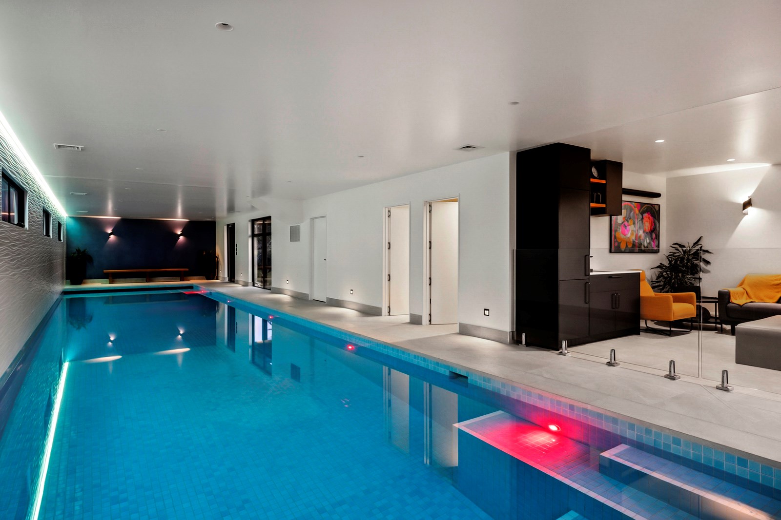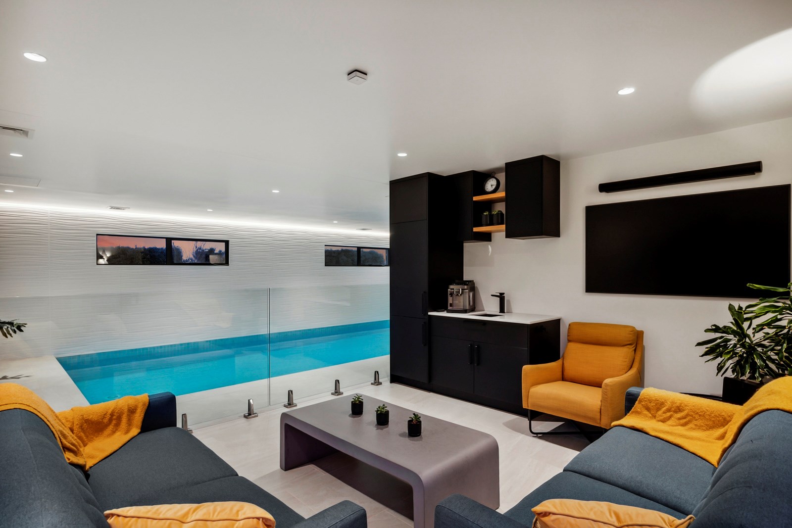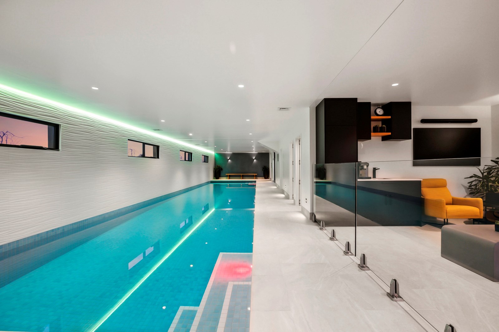 Special doesn’t come close to describing this project. Yes, it’s a pool house, but it does much more than housing the 18m-long in-ground heated swimming pool. The 163sqm building, clad in lightweight concrete panels and horizontal cedar, is like a private health club on the same property as the owners’ house. Designed to match the home’s exterior, the pool house also has a lounge that opens onto a sheltered, private, landscaped terrace. In the relaxing space next to the pool, you’ll find a TV, sound bar and speaker that can be operated by smartphone. If views of the cool blue pool are not enough, feature lighting in neon shades can change the ambience instantly. The building also has a changing room, tiled shower, toilet and plant room.
