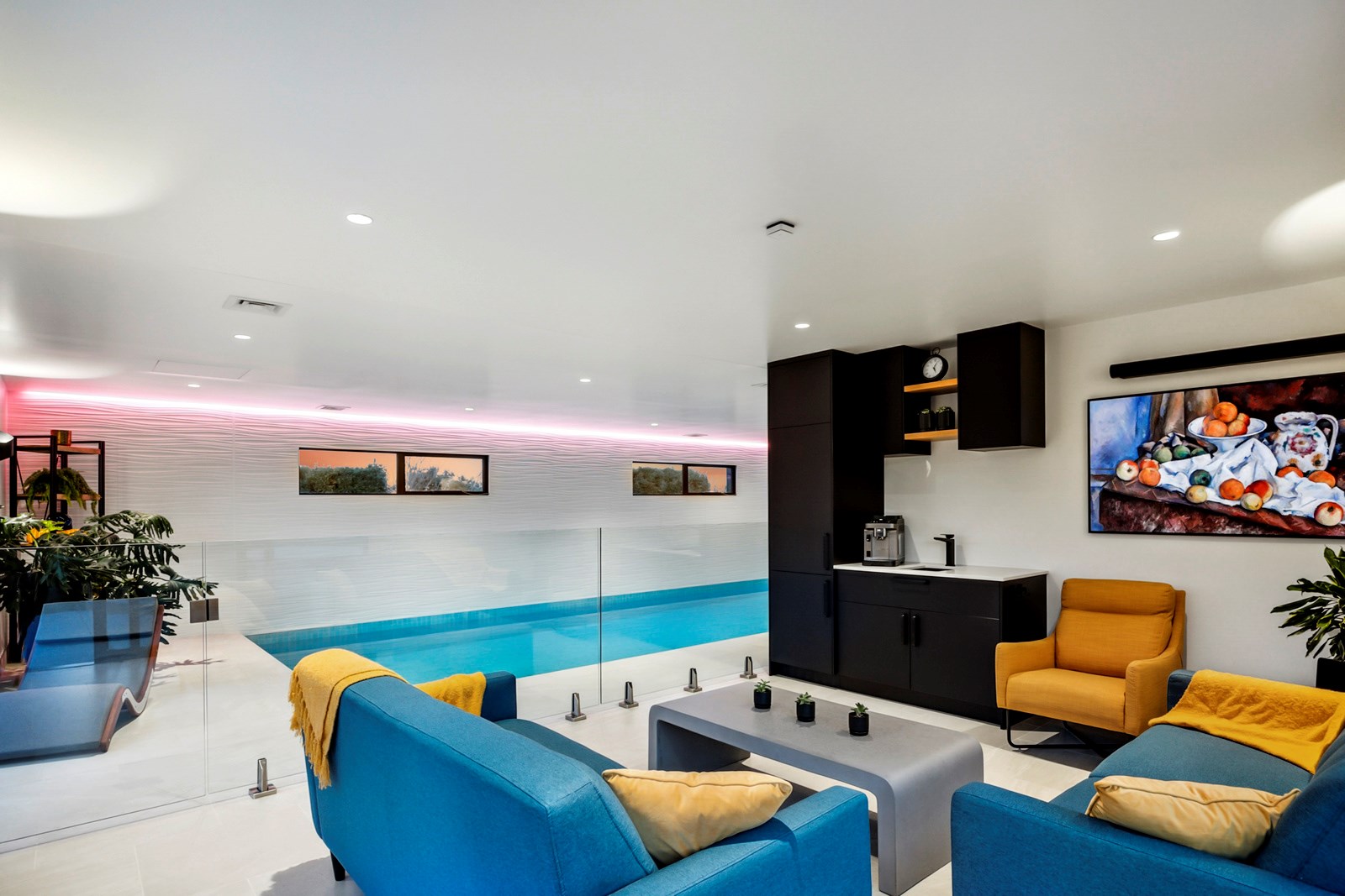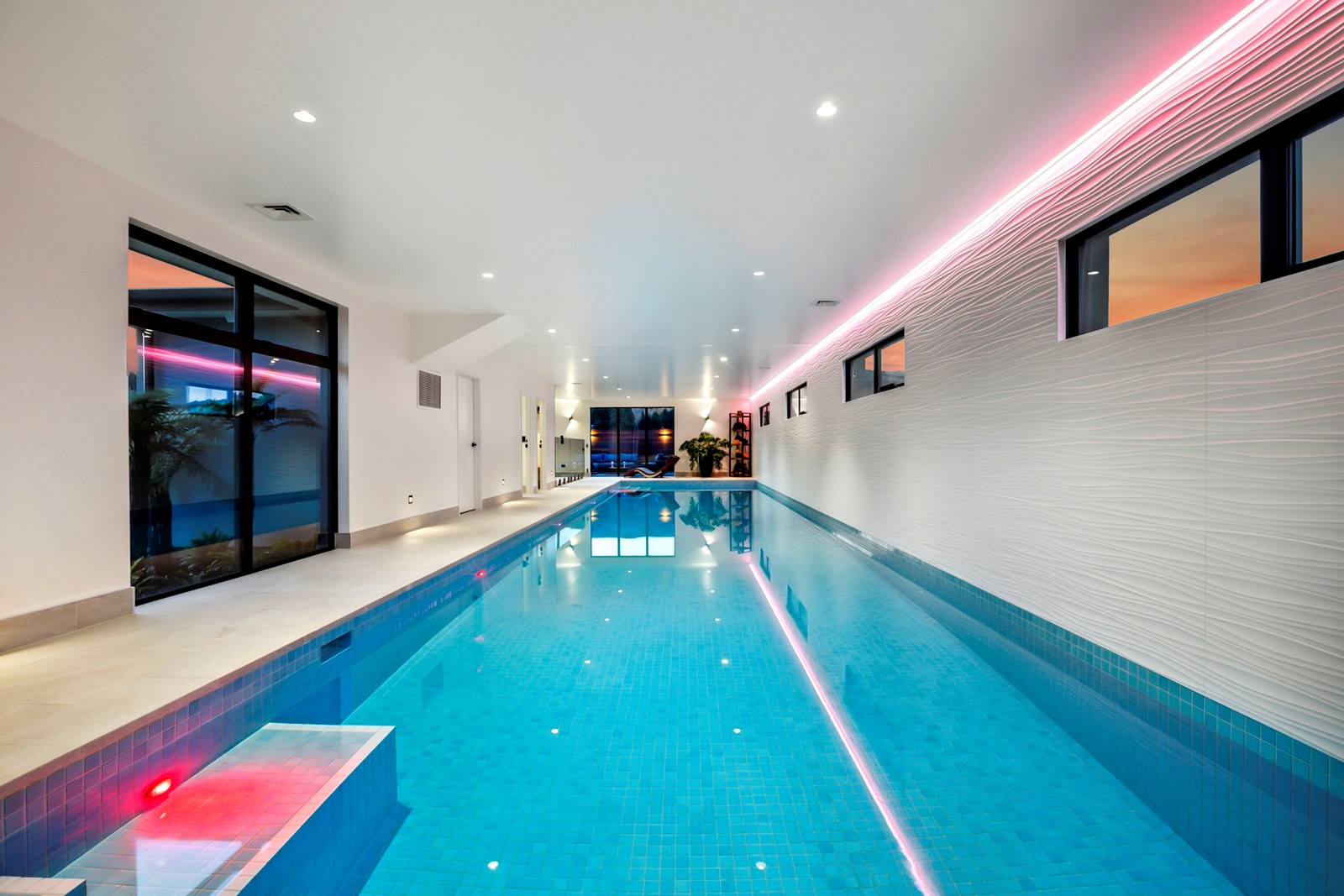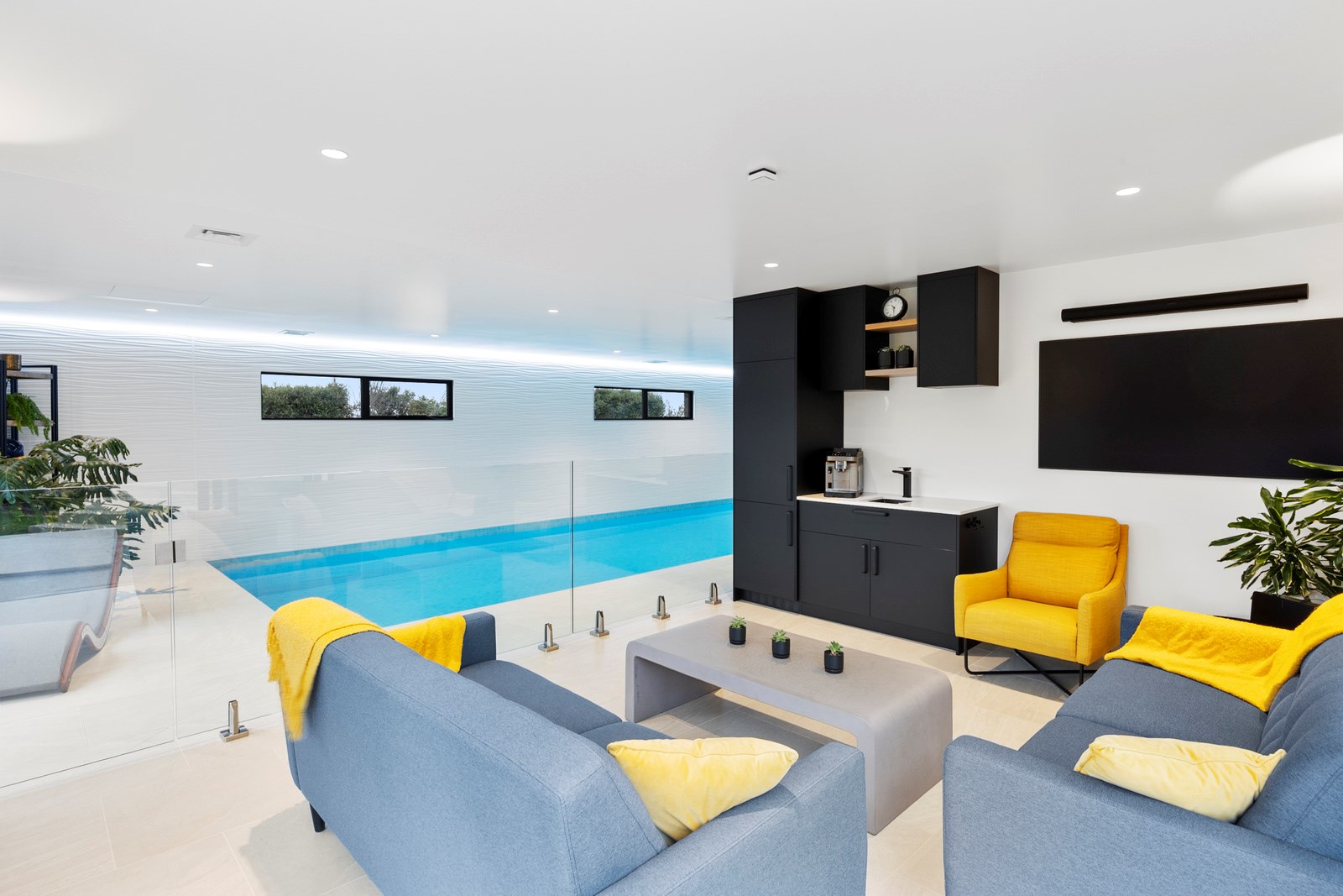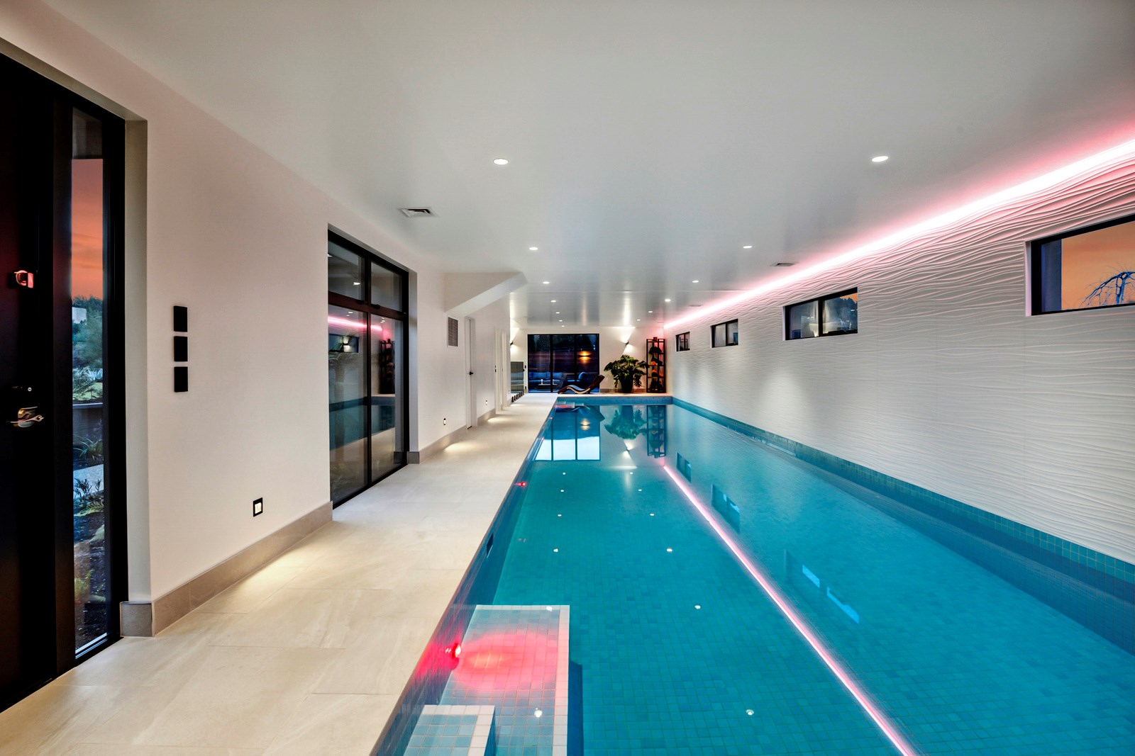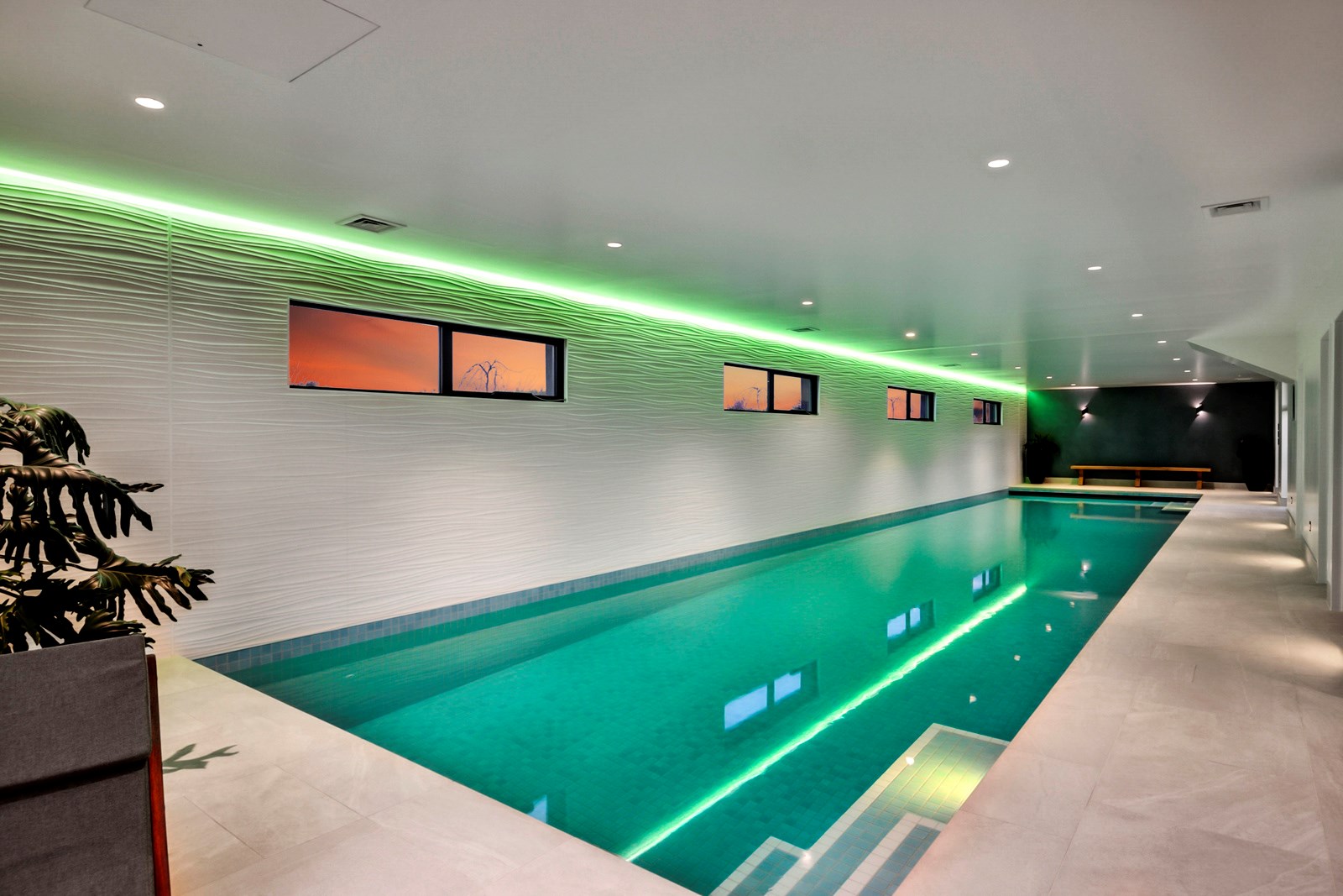 Special doesn’t come close to describing this project. Yes, it’s a pool house, but it does much more than housing the 18m-long in-ground heated swimming pool. The 163sqm building, clad in lightweight concrete panels and horizontal cedar, is like a private health club on the same property as the owners’ house. Designed to match the home’s exterior, the pool house also has a lounge that opens onto a sheltered, private, landscaped terrace. In the relaxing space next to the pool, you’ll find a TV, sound bar and speaker that can be operated by smartphone. If views of the cool blue pool are not enough, feature lighting in neon shades can change the ambience instantly. The building also has a changing room, tiled shower, toilet and plant room.