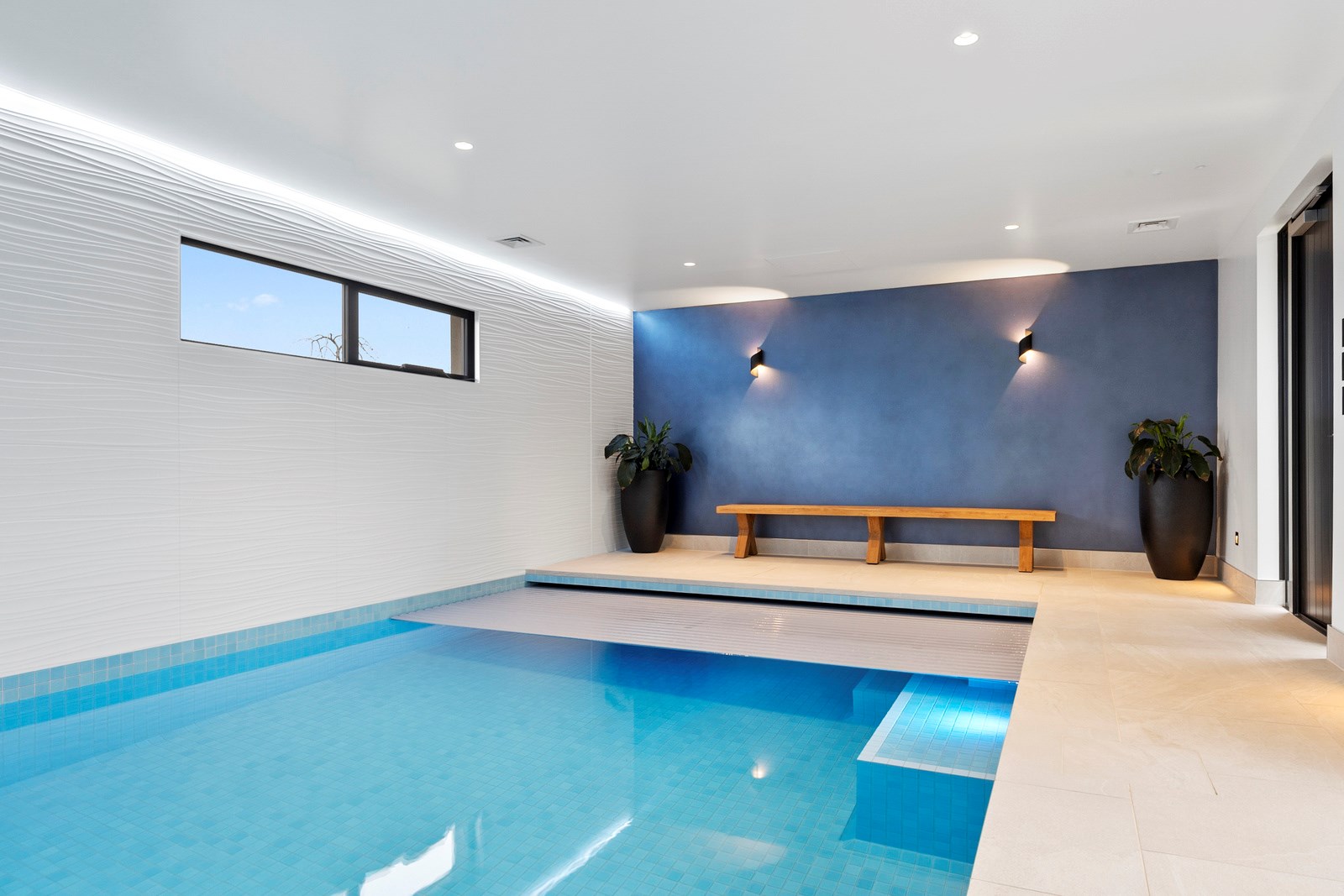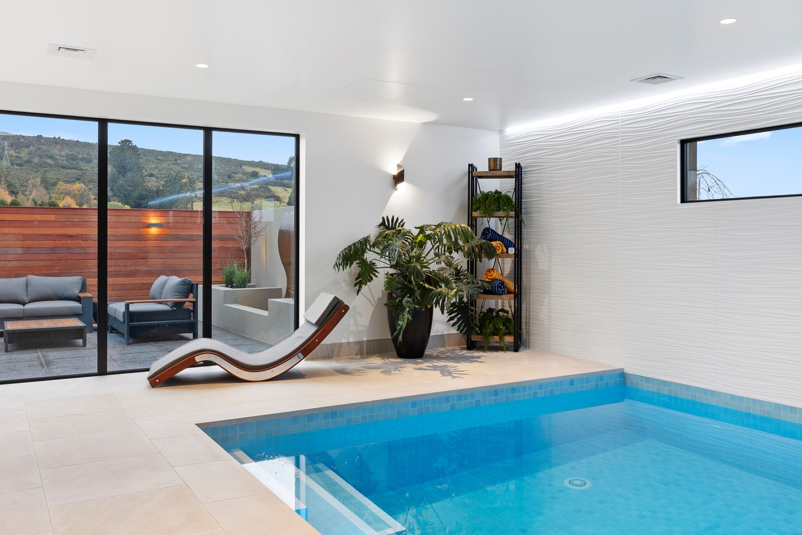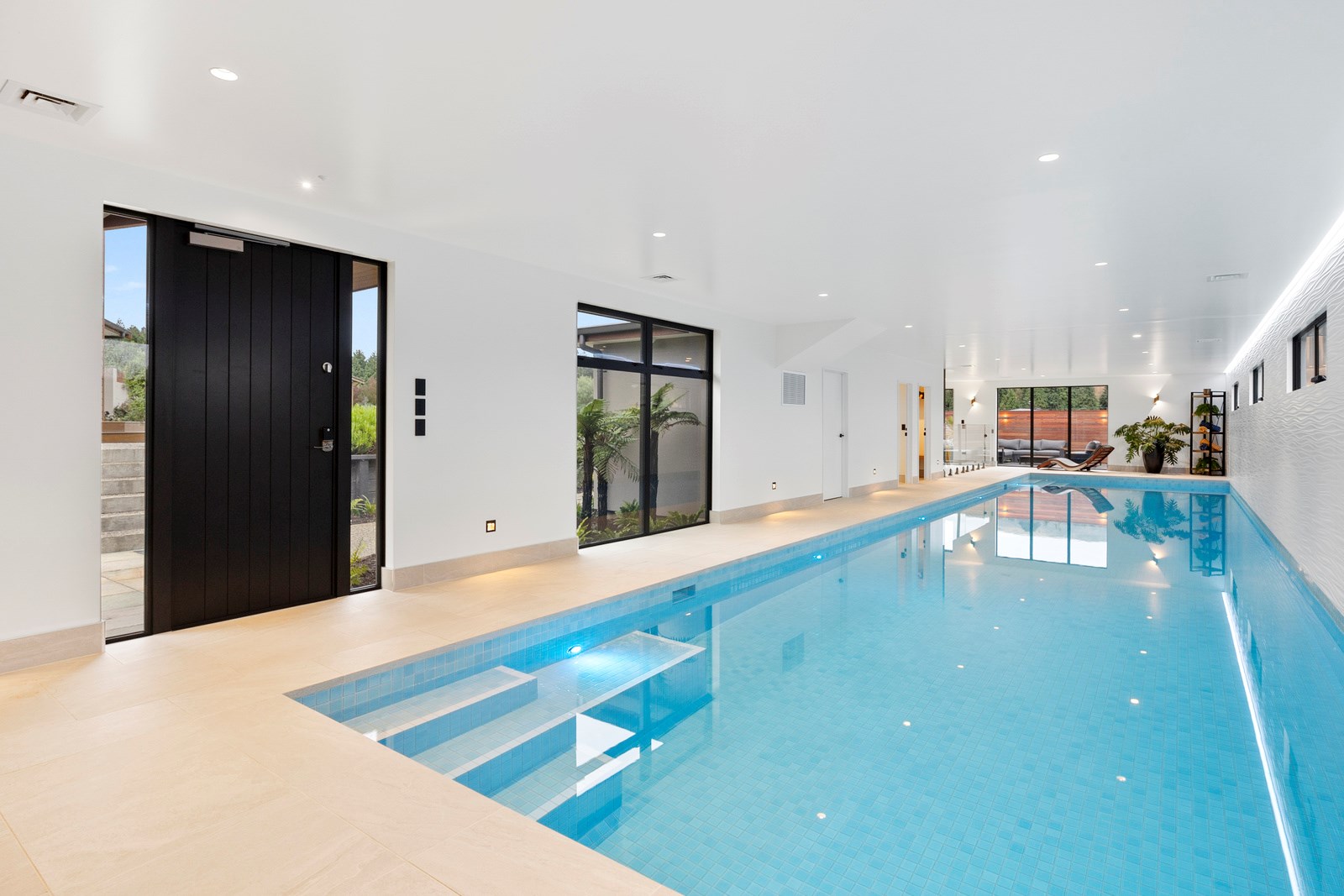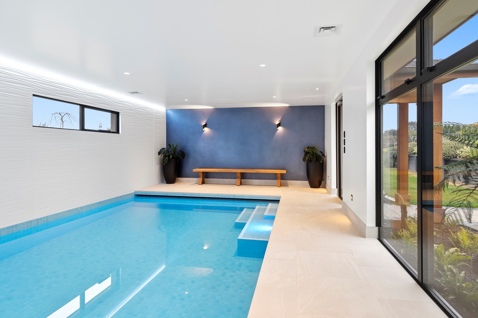 Temperature and ventilation are crucial in pool environments, and the entire sanctuary is automatically controlled through underfloor water-pipe heating and ducted air conditioning. Wool insulation in the walls and ceilings is above code. It’s warm and comfortable in here, but without condensation. These thermal upgrades also help to maintain the pool temperature. Security cameras and electric windows complete the dream pool-house package. When the owners have ploughed up and down the pool, they can shower, dress and relax or dine in the lap of luxury – without leaving their property.