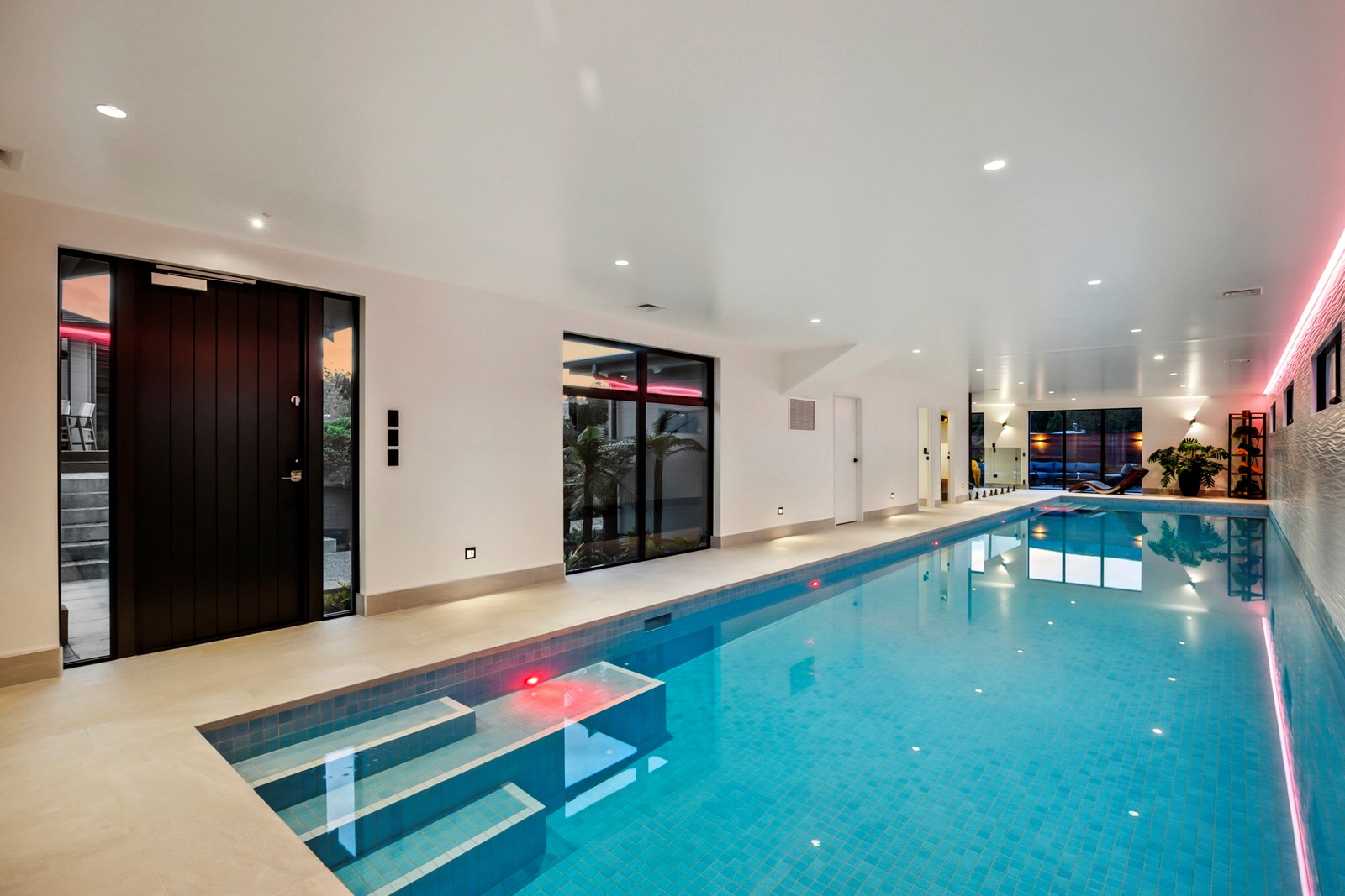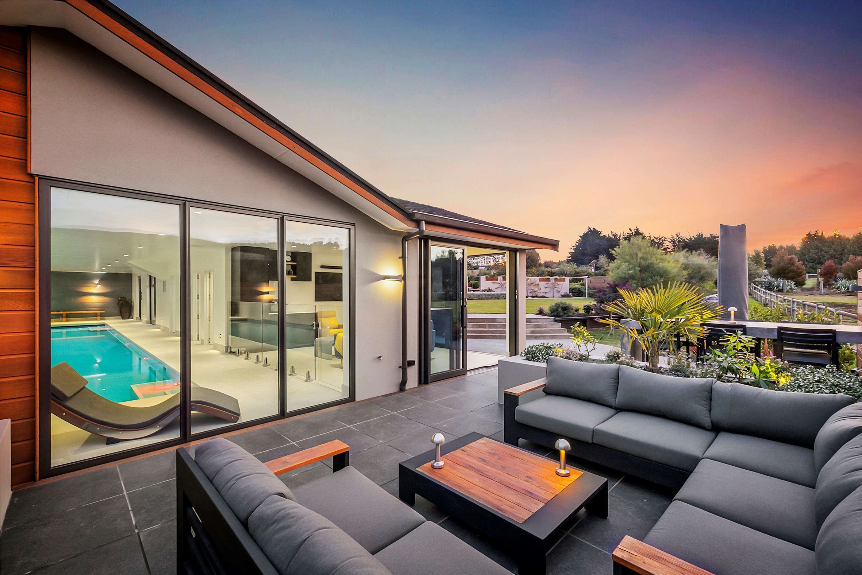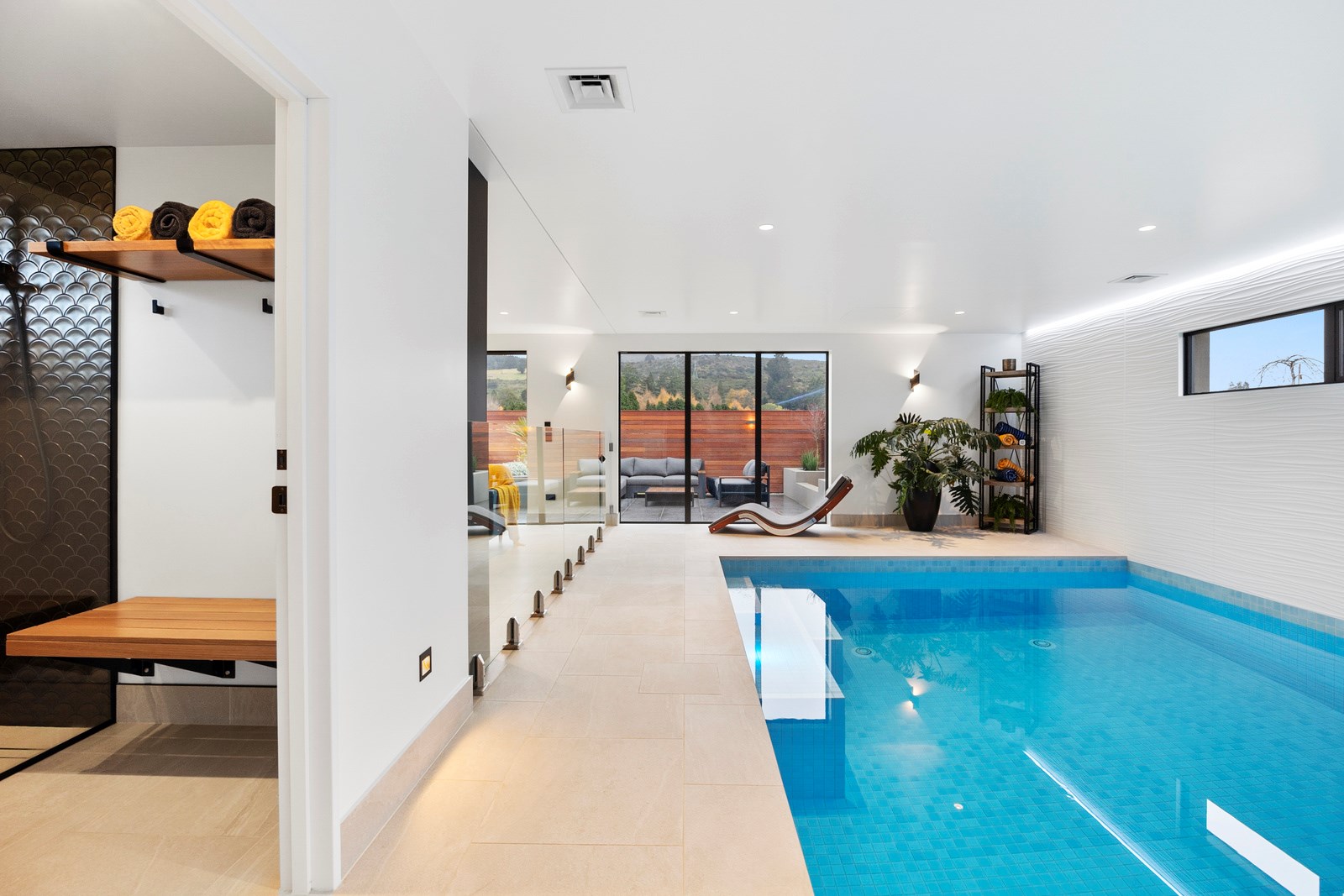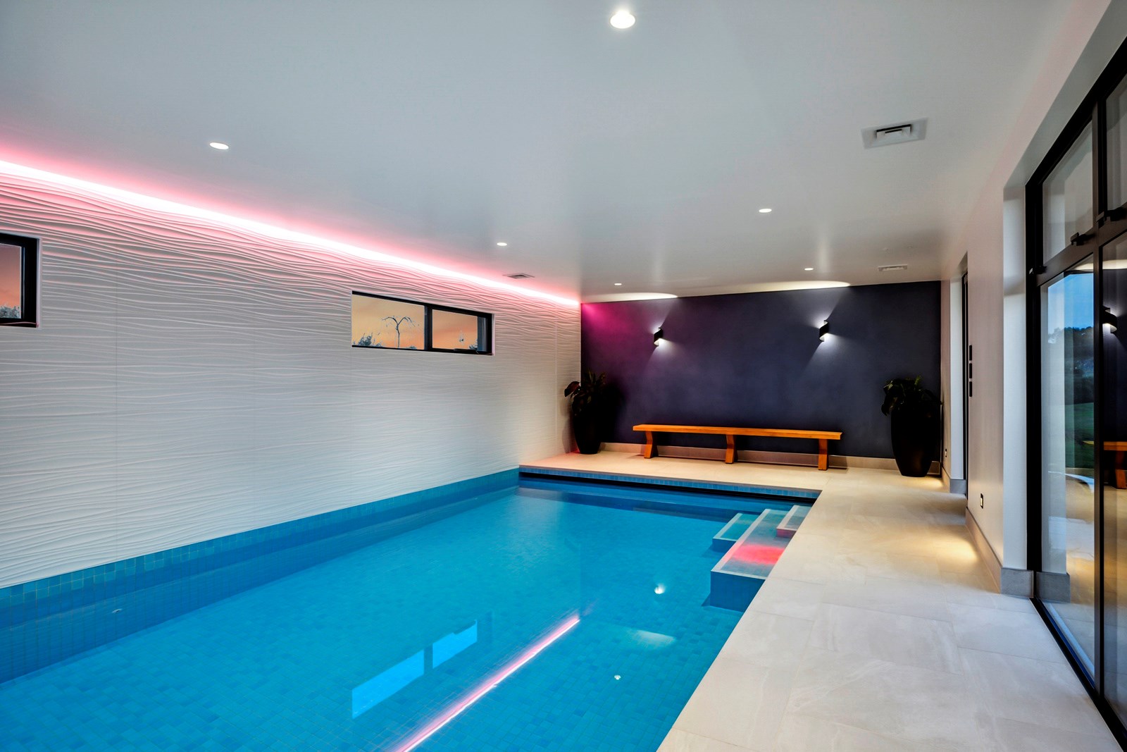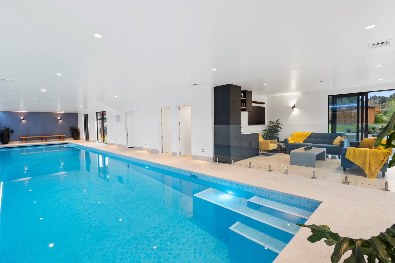 Temperature and ventilation are crucial in pool environments, and the entire sanctuary is automatically controlled through underfloor water-pipe heating and ducted air conditioning. Wool insulation in the walls and ceilings is above code. It’s warm and comfortable in here, but without condensation. These thermal upgrades also help to maintain the pool temperature. Security cameras and electric windows complete the dream pool-house package. When the owners have ploughed up and down the pool, they can shower, dress and relax or dine in the lap of luxury – without leaving their property.