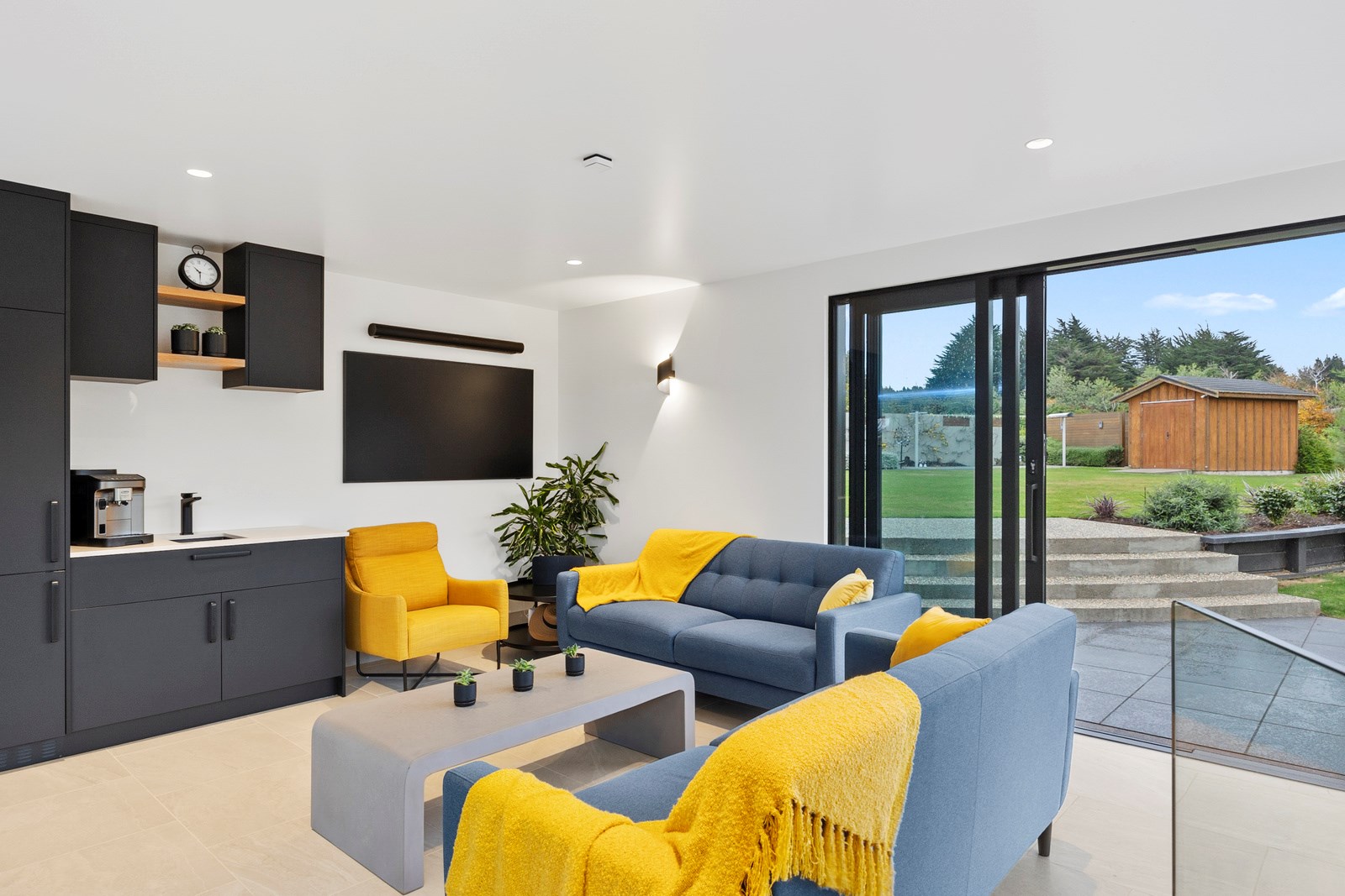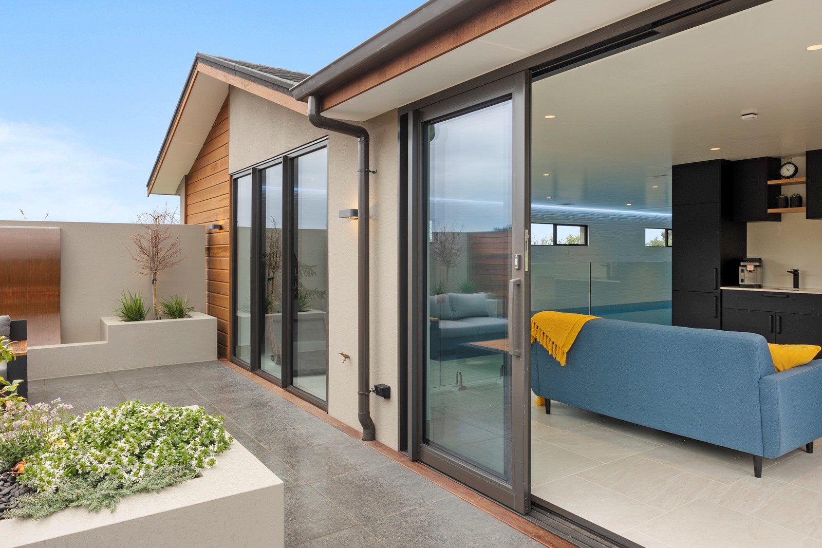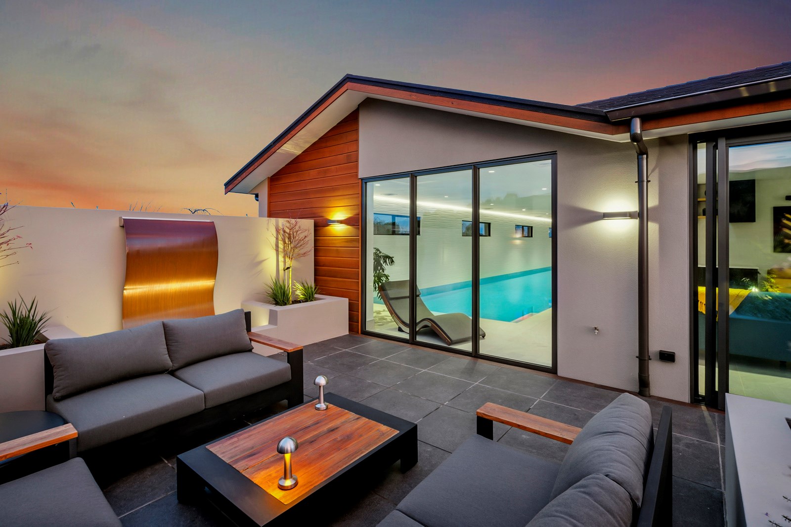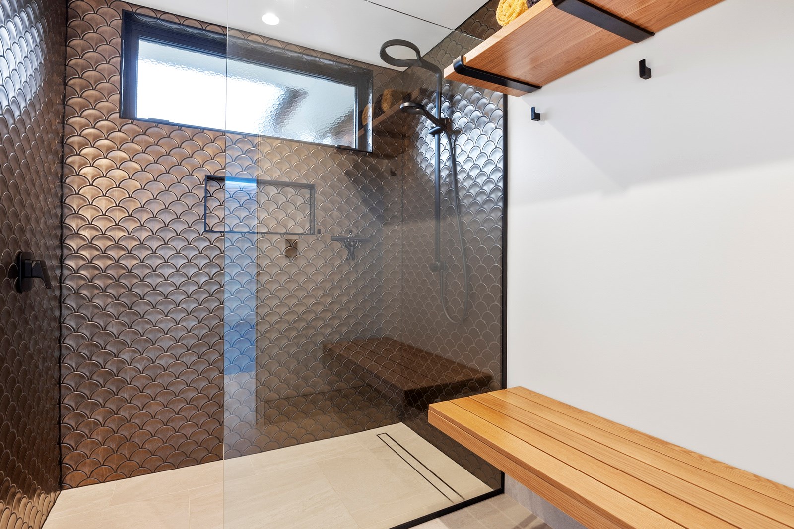 Temperature and ventilation are crucial in pool environments, and the entire sanctuary is automatically controlled through underfloor water-pipe heating and ducted air conditioning. Wool insulation in the walls and ceilings is above code. It’s warm and comfortable in here, but without condensation. These thermal upgrades also help to maintain the pool temperature. Security cameras and electric windows complete the dream pool-house package. When the owners have ploughed up and down the pool, they can shower, dress and relax or dine in the lap of luxury – without leaving their property.