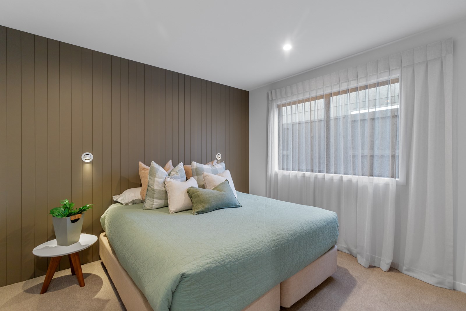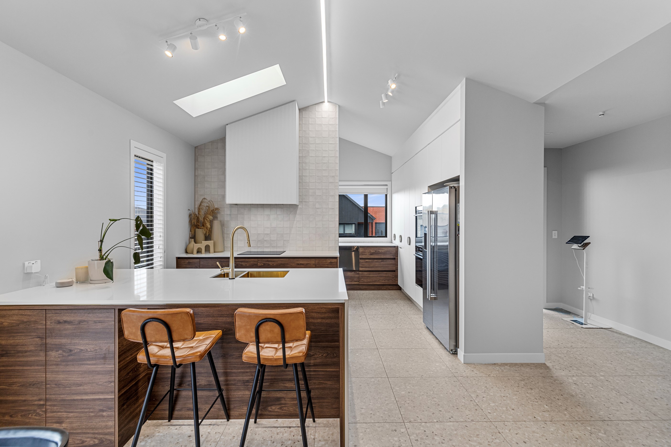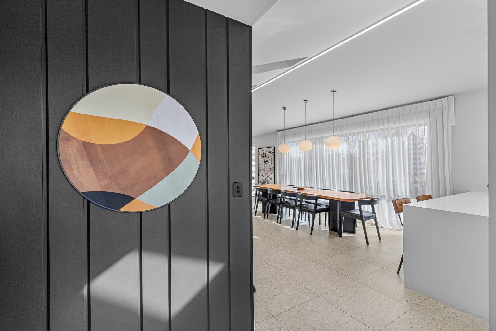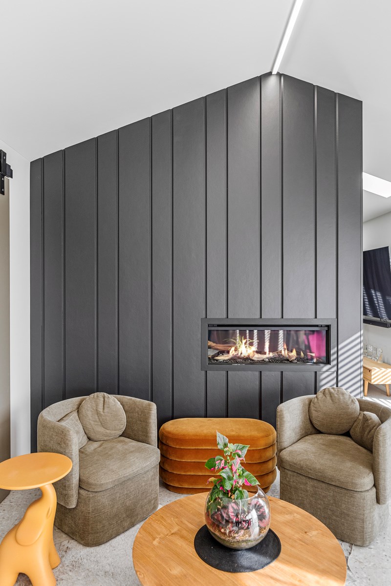 From intricately designing the smart-home interface to seamlessly integrating technology into every aspect of the build, the team persevered, turning obstacles into opportunities for innovation. Interiors are pretty smart, too. Painted panel feature walls in most rooms break the otherwise white aesthetic with luxurious tiling and dark timber joinery in the kitchen that also boasts a hidden scullery. A two-way fire separates two sitting rooms which both open to outdoor living areas, and a barn-style door from the living area closes off the bedroom area for complete privacy. Street appeal is abundant with neutral brick and dark vertical timber cladding setting this 230sqm home into its corner site in the heart of Hamilton’s vibrant community.