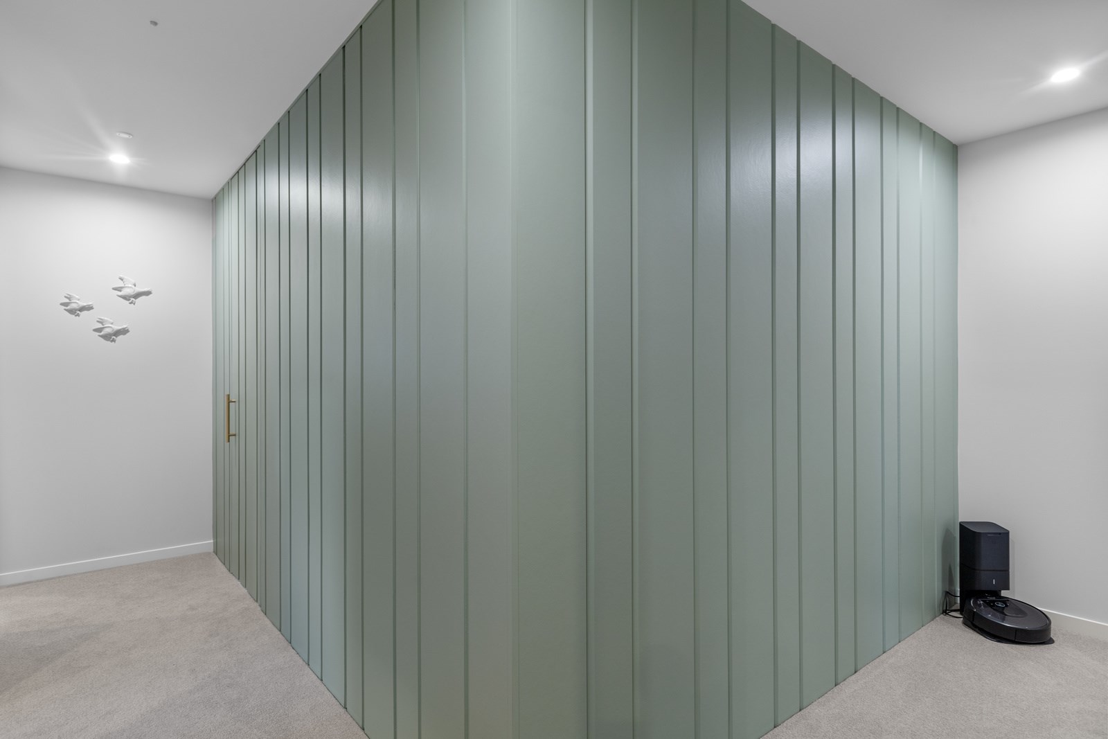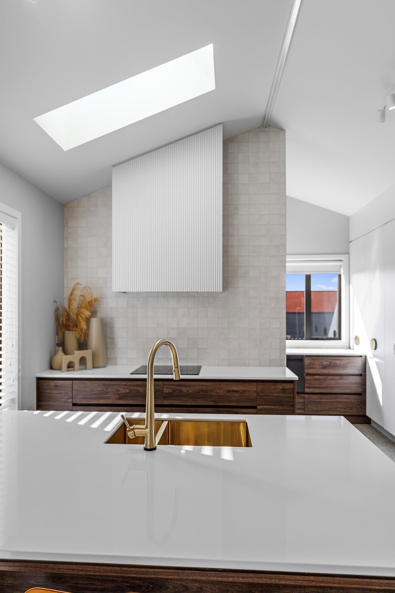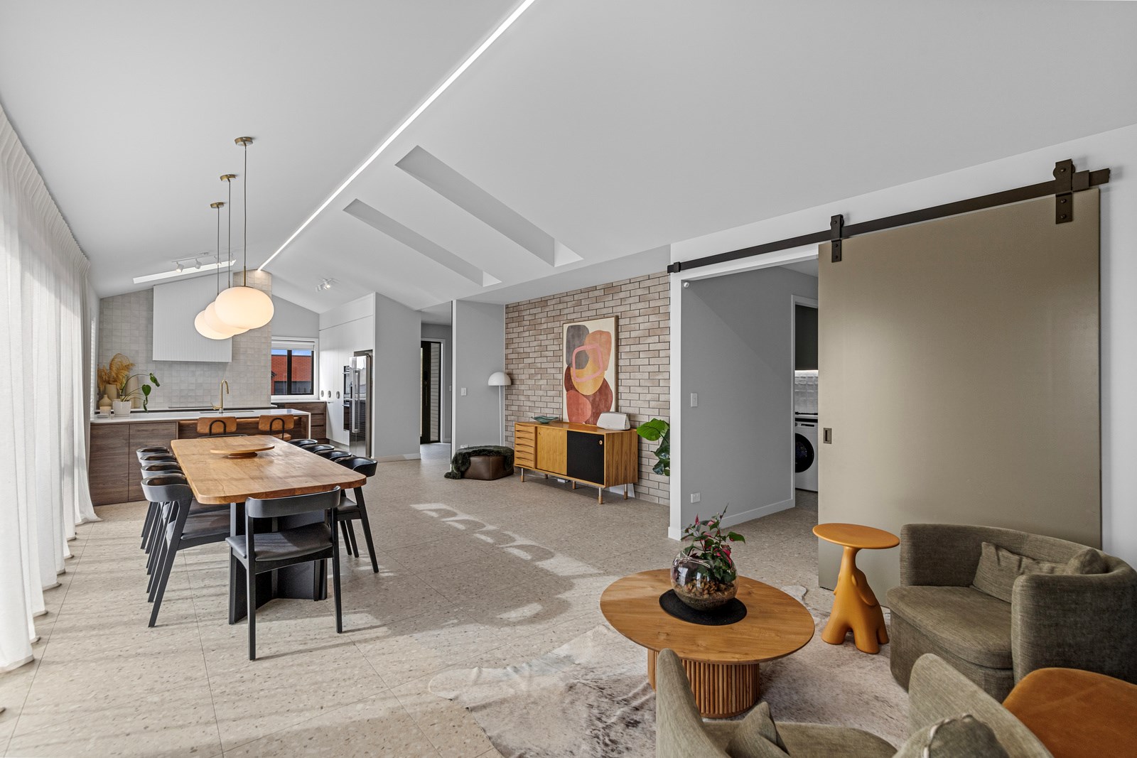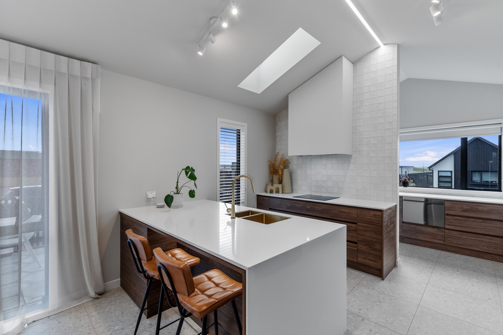From intricately designing the smart-home interface to seamlessly integrating technology into every aspect of the build, the team persevered, turning obstacles into opportunities for innovation. Interiors are pretty smart, too. Painted panel feature walls in most rooms break the otherwise white aesthetic with luxurious tiling and dark timber joinery in the kitchen that also boasts a hidden scullery. A two-way fire separates two sitting rooms which both open to outdoor living areas, and a barn-style door from the living area closes off the bedroom area for complete privacy. Street appeal is abundant with neutral brick and dark vertical timber cladding setting this 230sqm home into its corner site in the heart of Hamilton’s vibrant community.