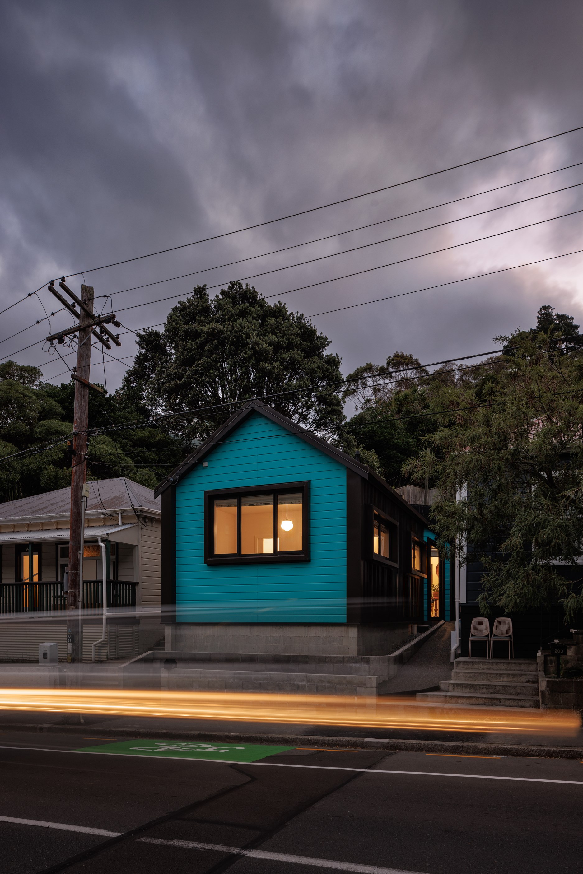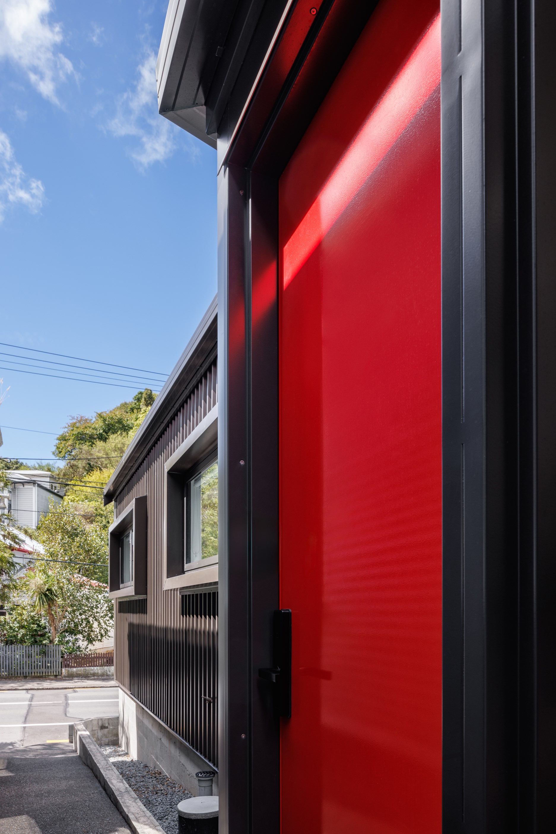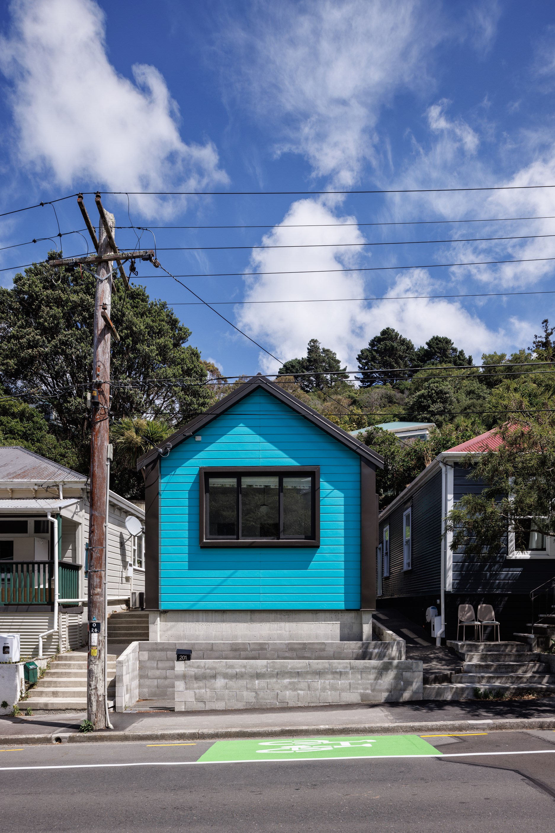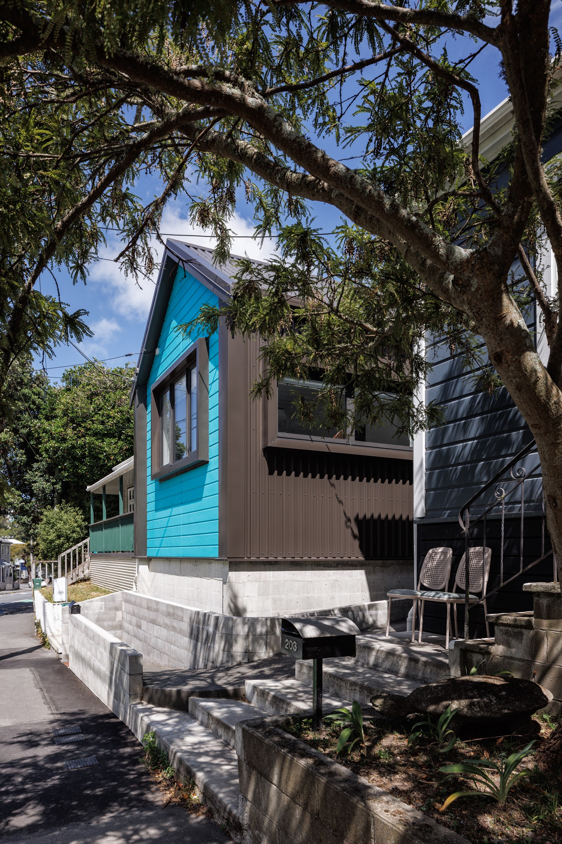 Character-filled Aro Valley has a colourful new resident. At 92sqm, this newbie is not large, but it has big character thanks to teal timber weatherboards with dark metal trim. If you thought the vibrancy stops at the street front, think again. A fire-engine red front door, cobalt kitchen splashback and vibrant furnishings pop, thanks to backdrops of concrete-block and white walls, and light funnelled through skylights, clerestory windows and bifolds. To ease into the section, the two-bedroom, two-bathroom design had to be long and relatively slender – tricky when it comes to the placement and rhythm of the rooms.