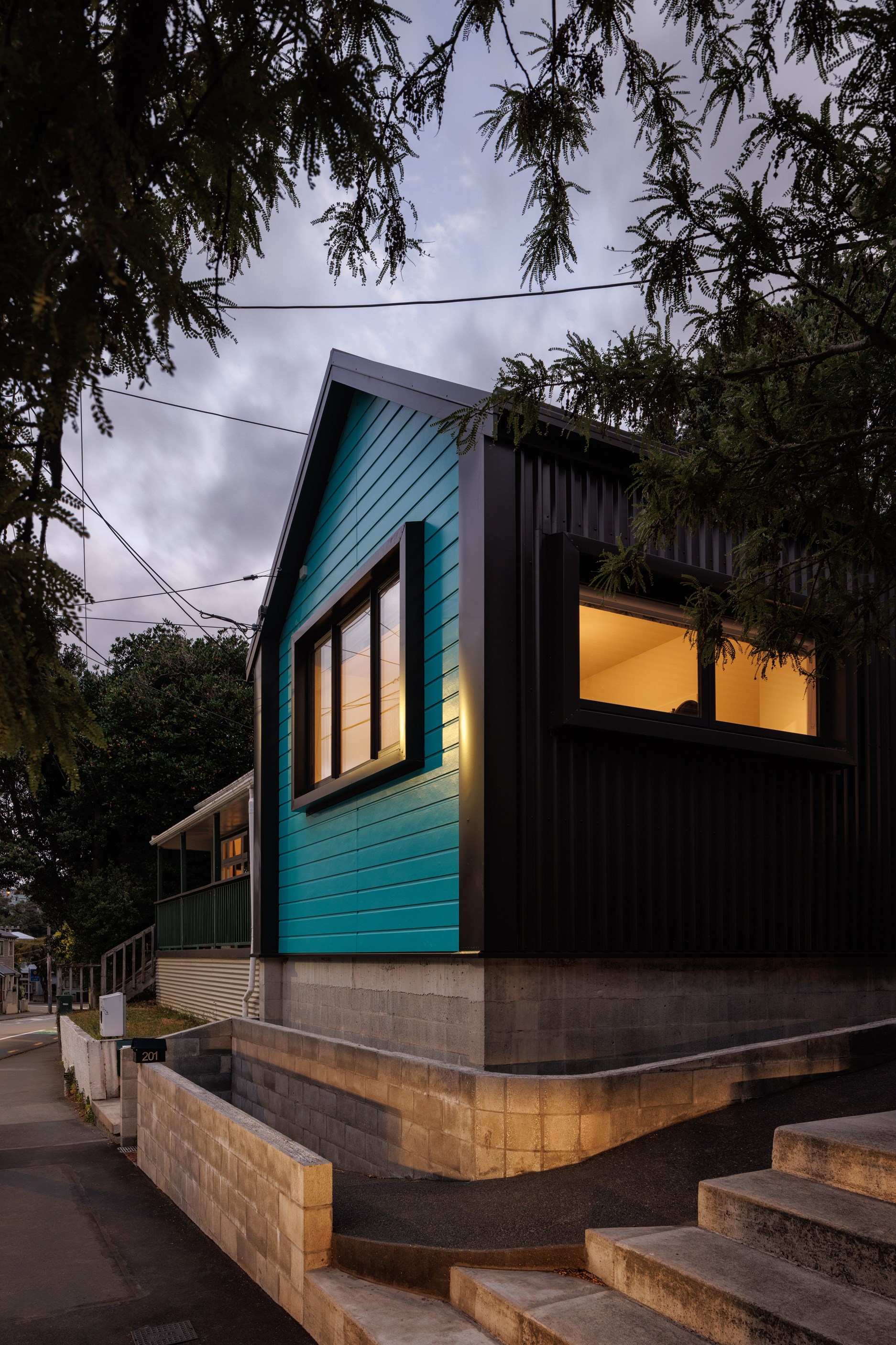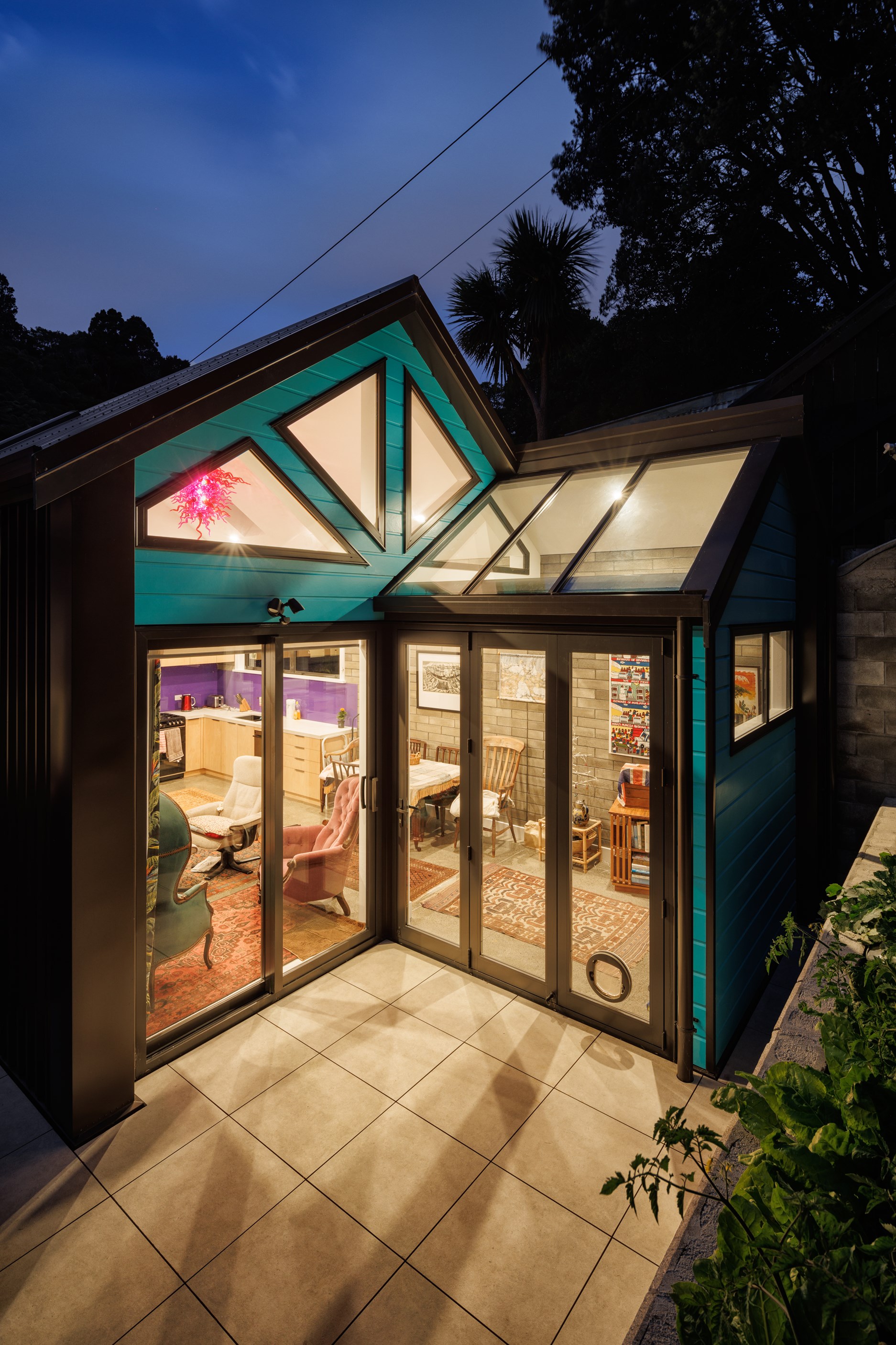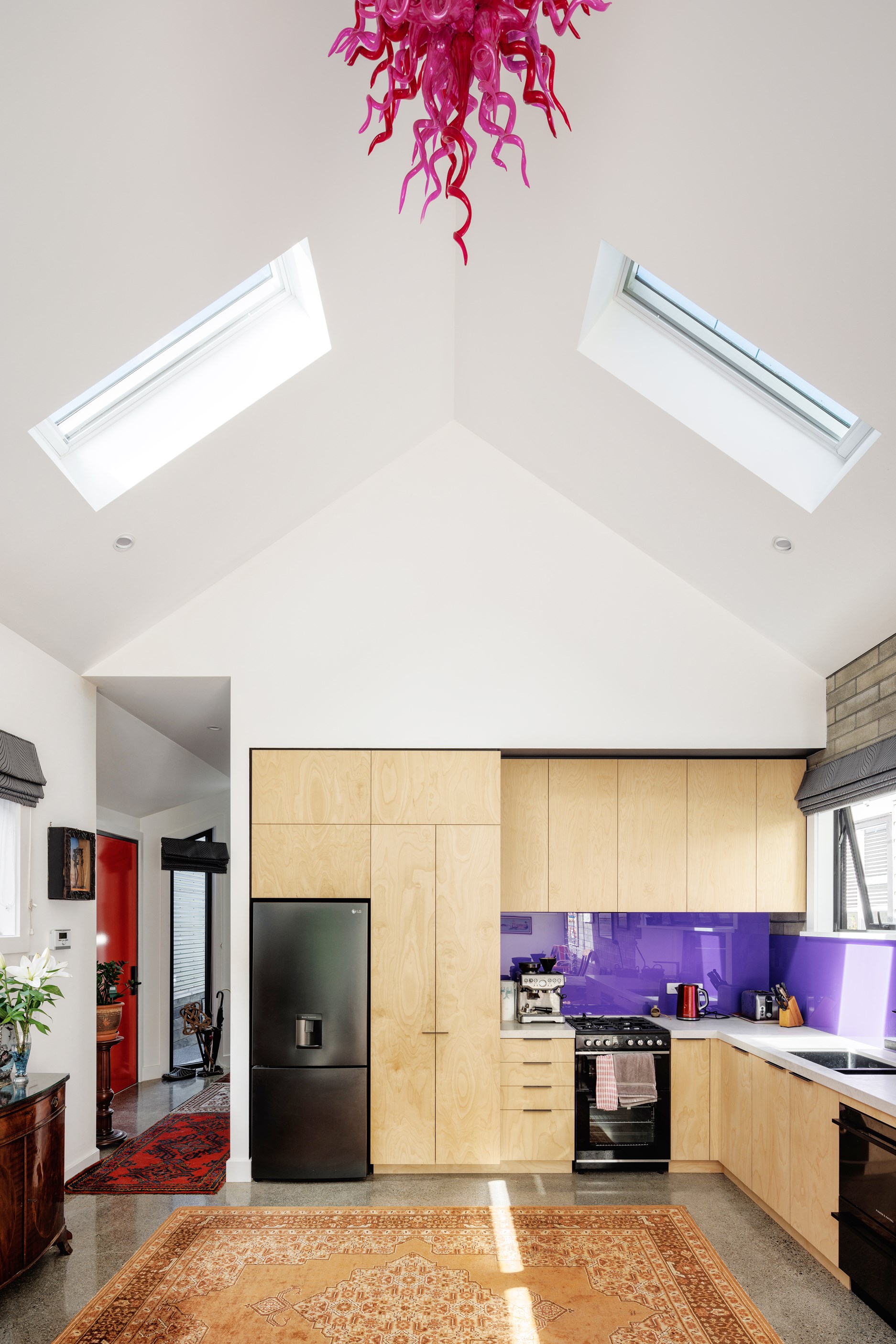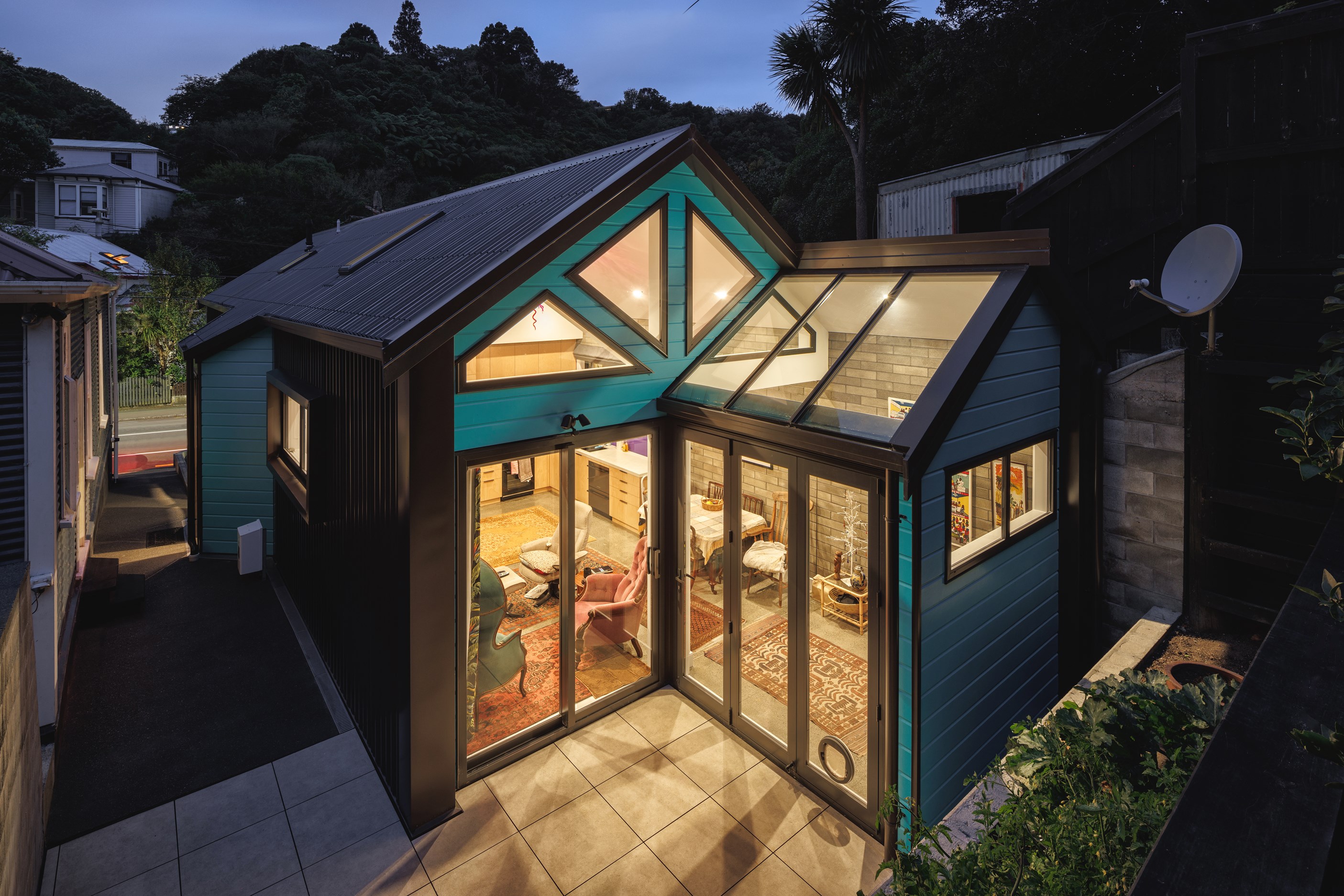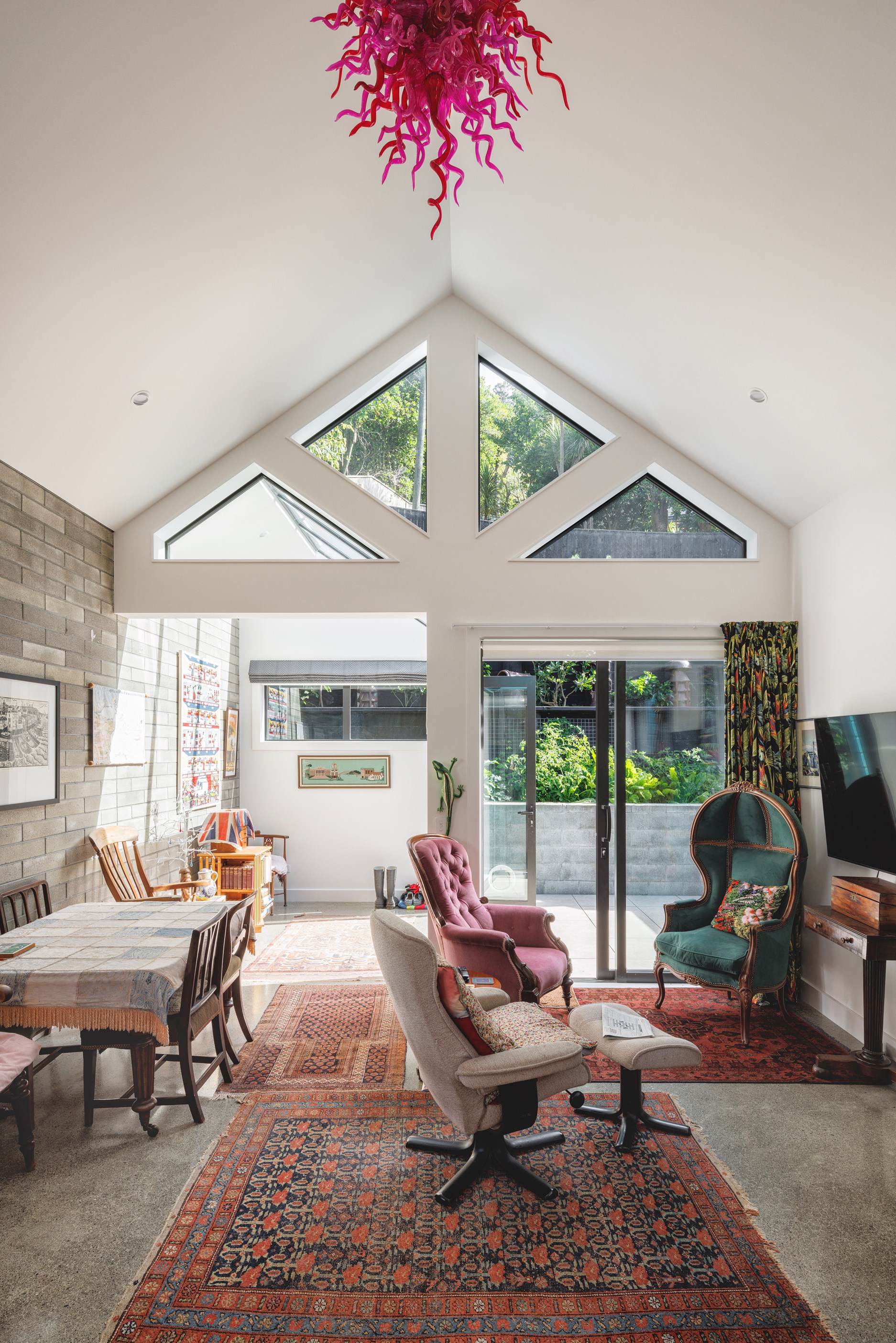 Character-filled Aro Valley has a colourful new resident. At 92sqm, this newbie is not large, but it has big character thanks to teal timber weatherboards with dark metal trim. If you thought the vibrancy stops at the street front, think again. A fire-engine red front door, cobalt kitchen splashback and vibrant furnishings pop, thanks to backdrops of concrete-block and white walls, and light funnelled through skylights, clerestory windows and bifolds. To ease into the section, the two-bedroom, two-bathroom design had to be long and relatively slender – tricky when it comes to the placement and rhythm of the rooms.