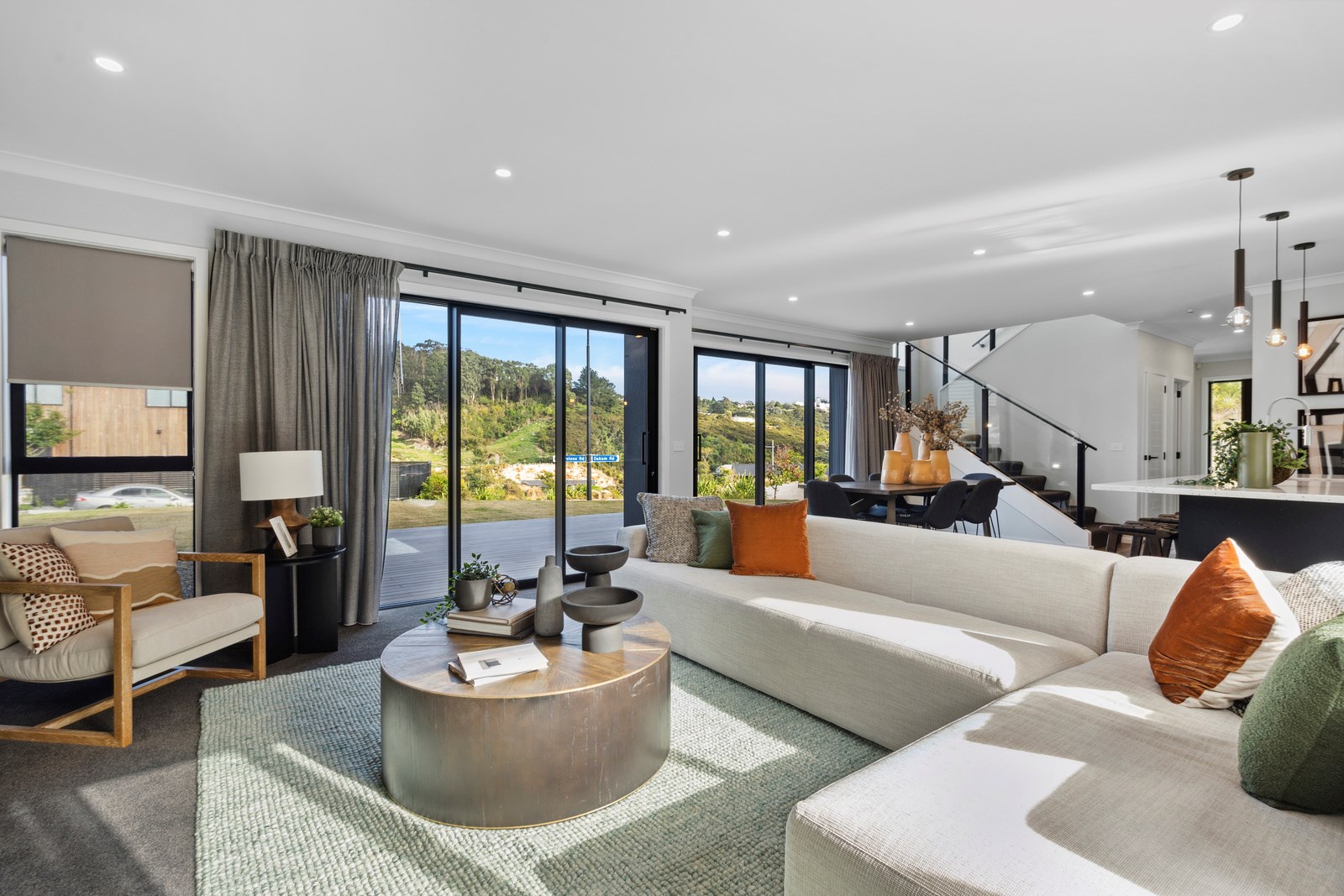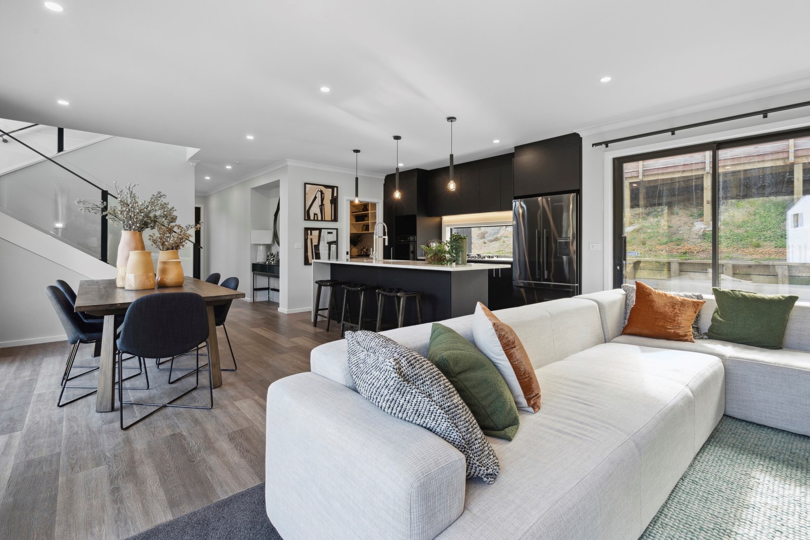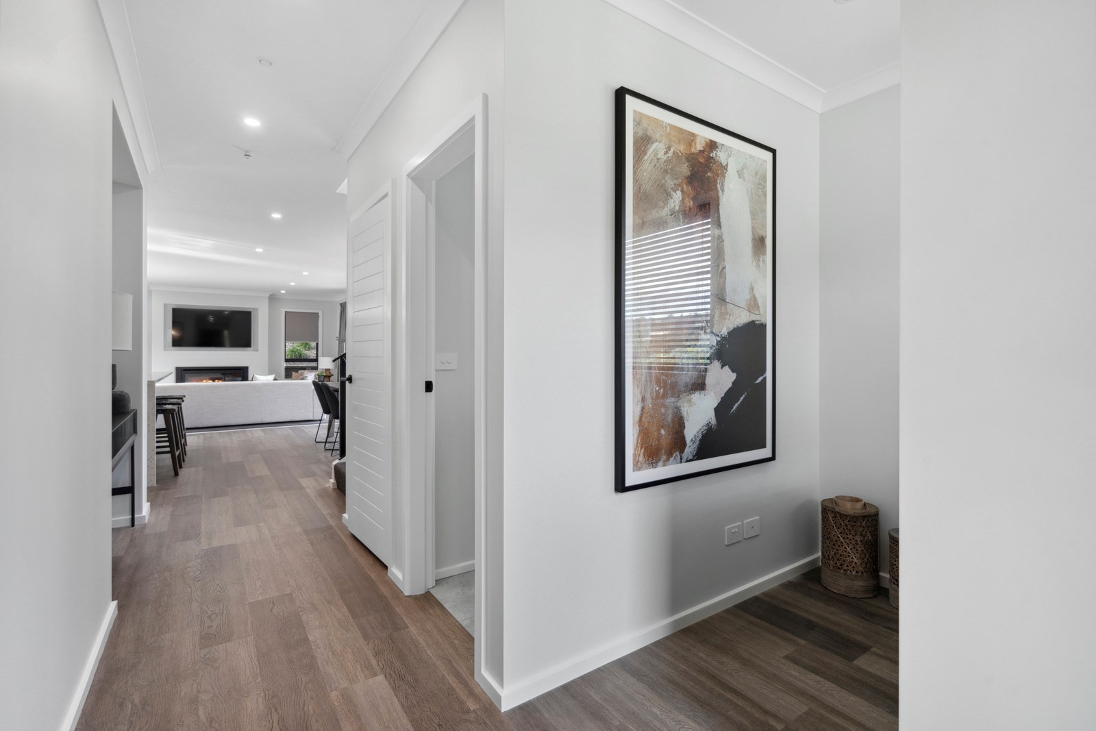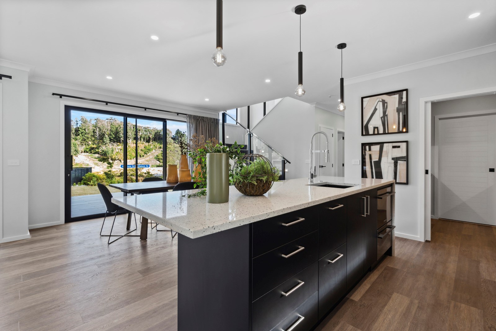 The generous spaces in this two-storey Whitby home cleverly flow into each other without the need for hallways. Groceries go from the car in the double garage straight into the walk-through pantry – a design feature that makes the occupants wonder how they ever lived without it. Spacious living and dining areas spread out from the kitchen’s large island bench. The ample use of glass sliding doors ensures plenty of indoor / outdoor flow to the timber decks on both sides of the house located to catch either morning or afternoon sun.