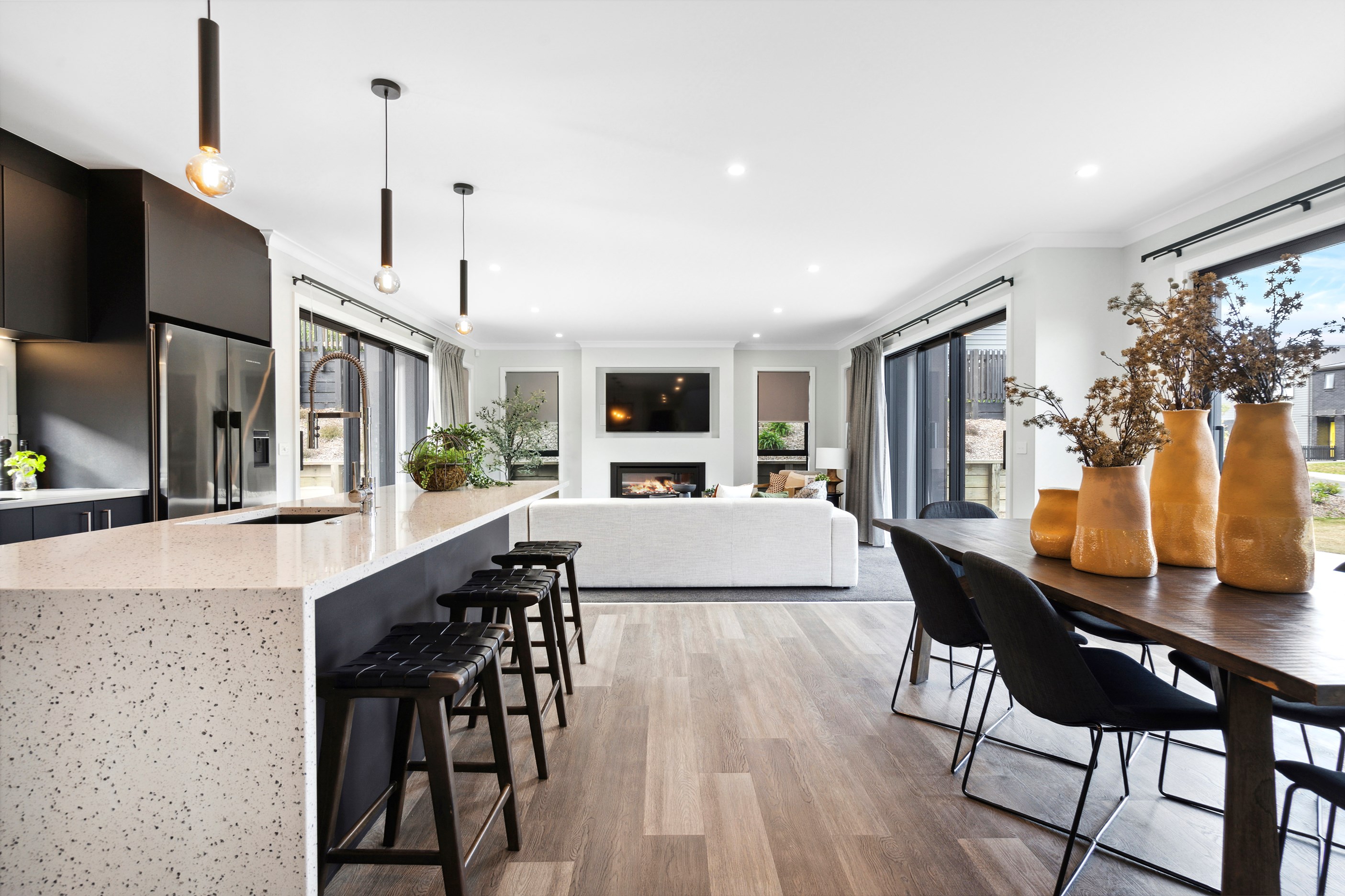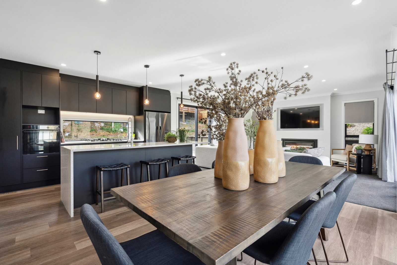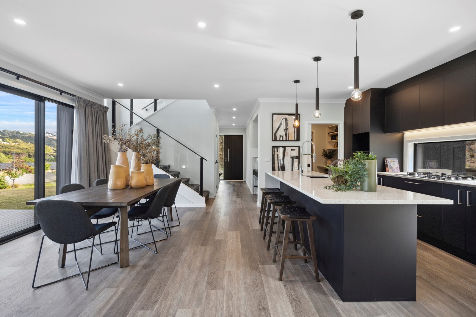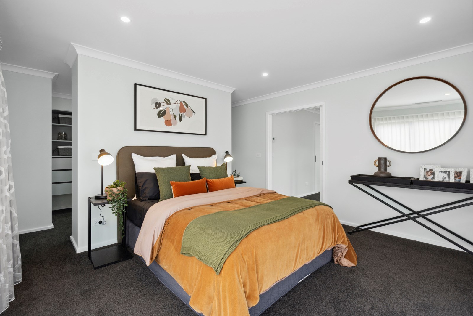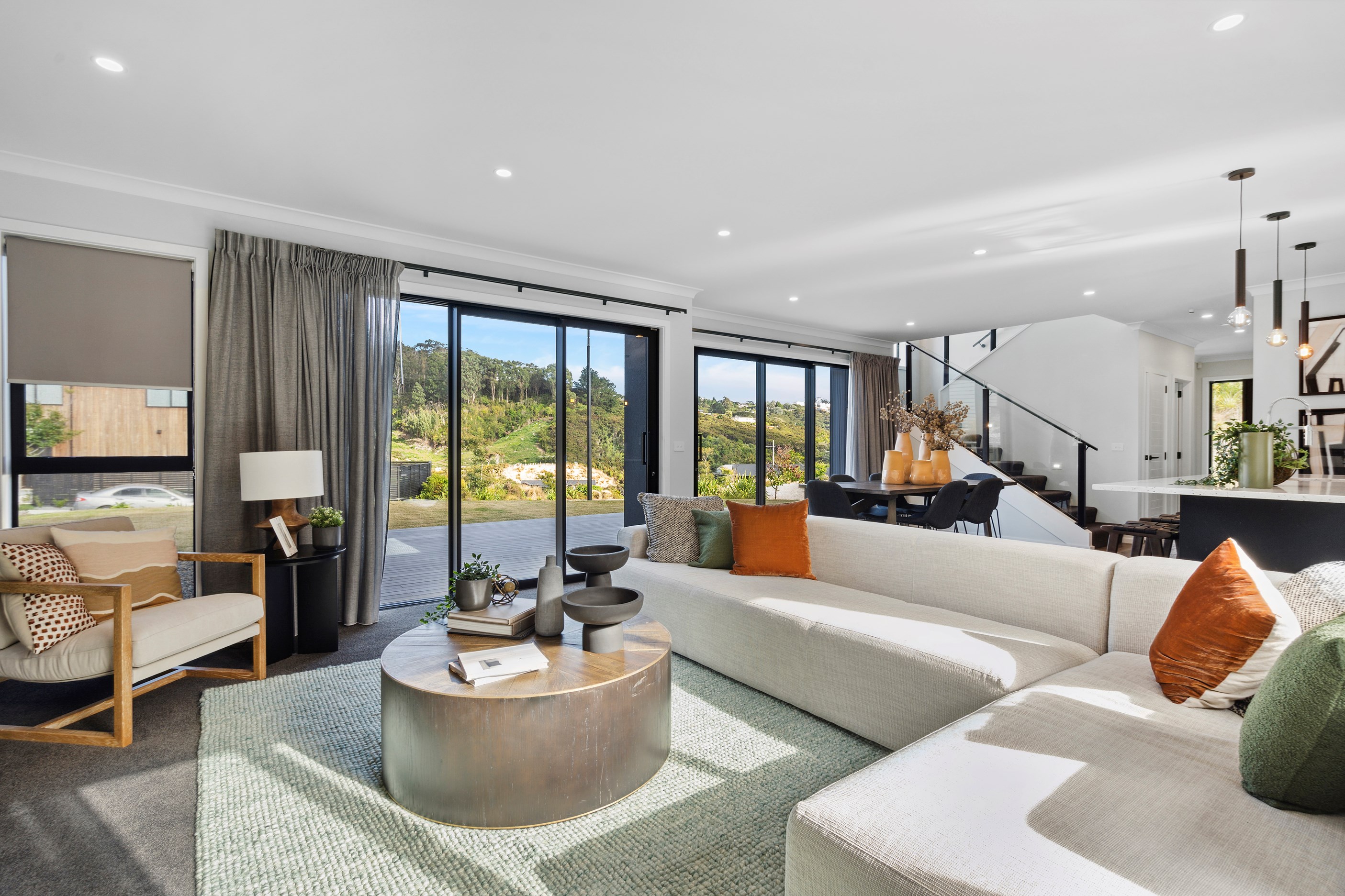 The generous spaces in this two-storey Whitby home cleverly flow into each other without the need for hallways. Groceries go from the car in the double garage straight into the walk-through pantry – a design feature that makes the occupants wonder how they ever lived without it. Spacious living and dining areas spread out from the kitchen’s large island bench. The ample use of glass sliding doors ensures plenty of indoor / outdoor flow to the timber decks on both sides of the house located to catch either morning or afternoon sun.