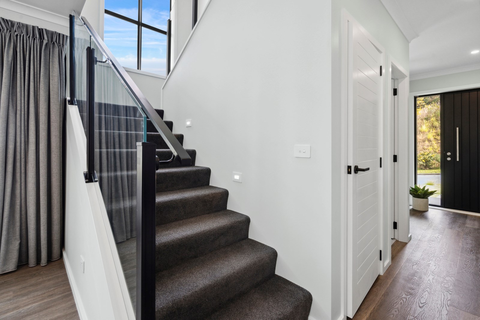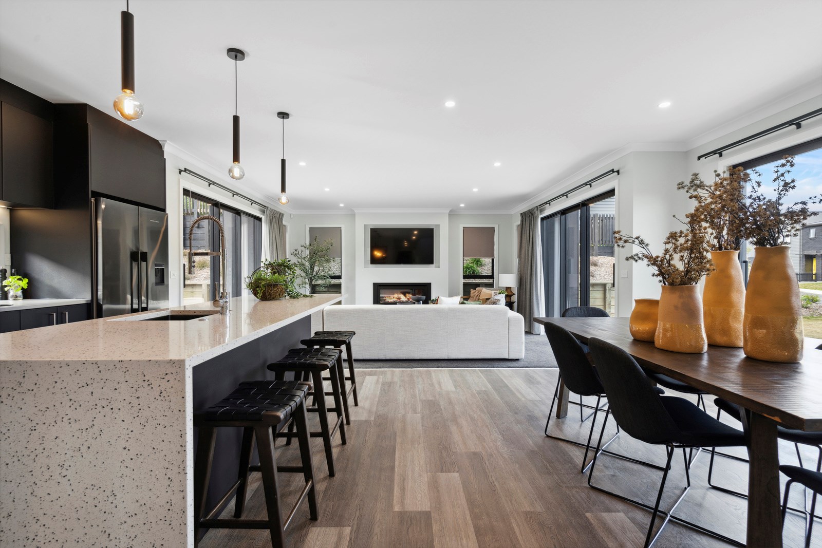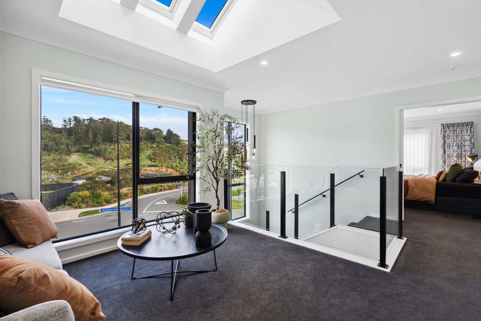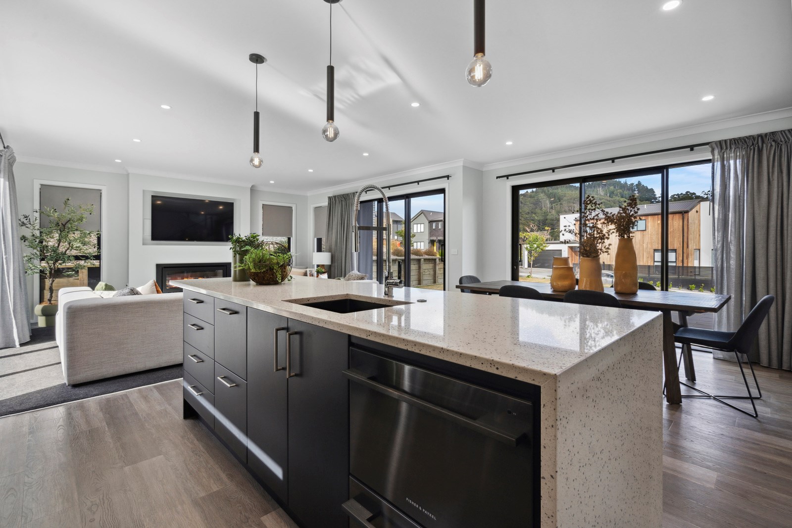 The generous spaces in this two-storey Whitby home cleverly flow into each other without the need for hallways. Groceries go from the car in the double garage straight into the walk-through pantry – a design feature that makes the occupants wonder how they ever lived without it. Spacious living and dining areas spread out from the kitchen’s large island bench. The ample use of glass sliding doors ensures plenty of indoor / outdoor flow to the timber decks on both sides of the house located to catch either morning or afternoon sun.