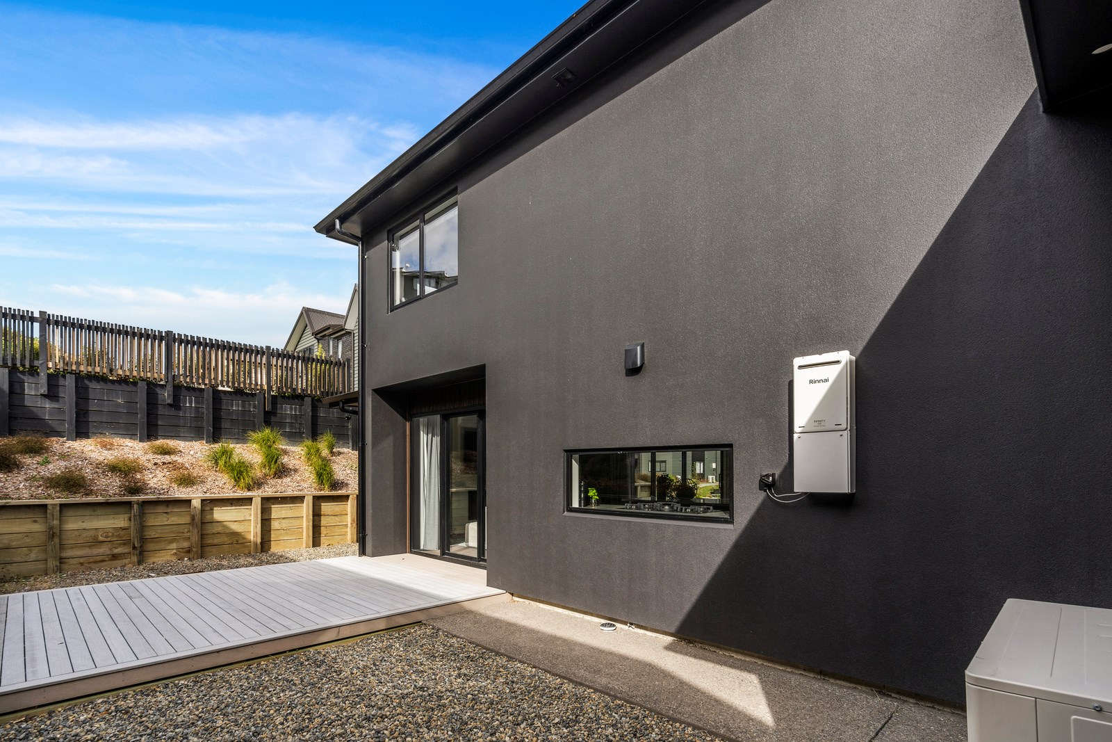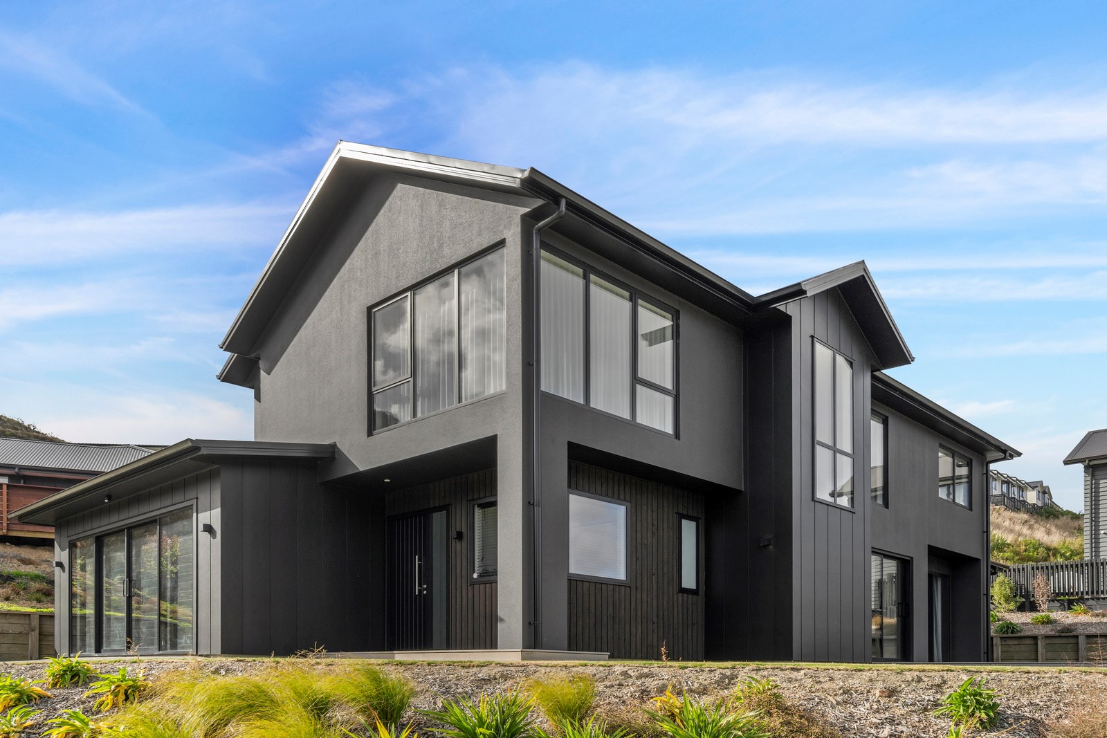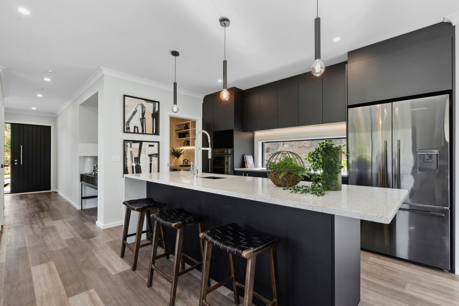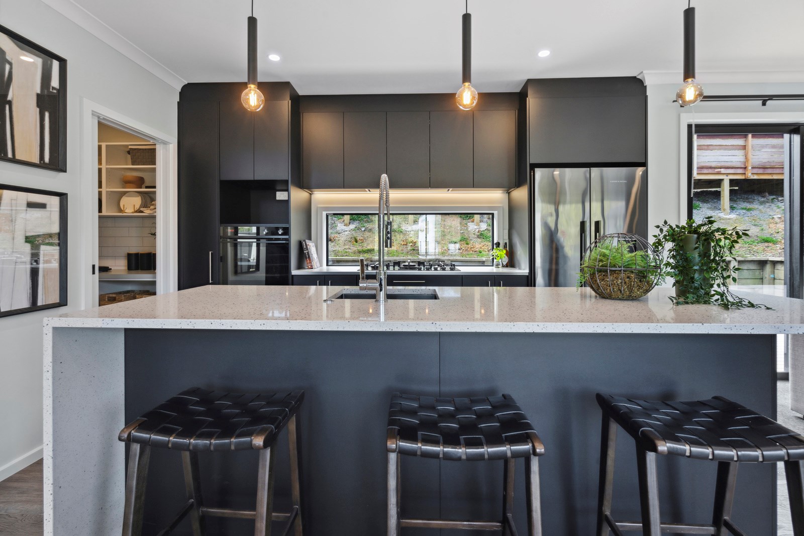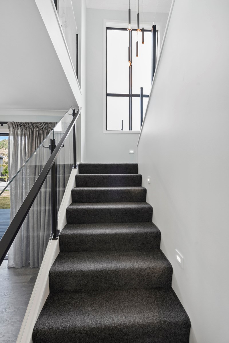 Light streaming down the glass-balustraded staircase leads you up to a second living area – a landing pad for three double bedrooms, including main with, you guessed it, a luxuriously sized walk-in wardrobe and ensuite. While not short of windows, glorious amounts of light flood the second level thanks to an impressive set of skylights – eight in total, four of which are operable. The exterior of the home is clad in stylish Iron coloured Rockcote, along with vertical Dark Brown timber weatherboard and vertical James Hardie Stria in Blackjack – a modern shade of deep, dark grey. This works to enhance the sense of grandeur of the house which stands proud on its corner site, graciously defying its 212sqm size.