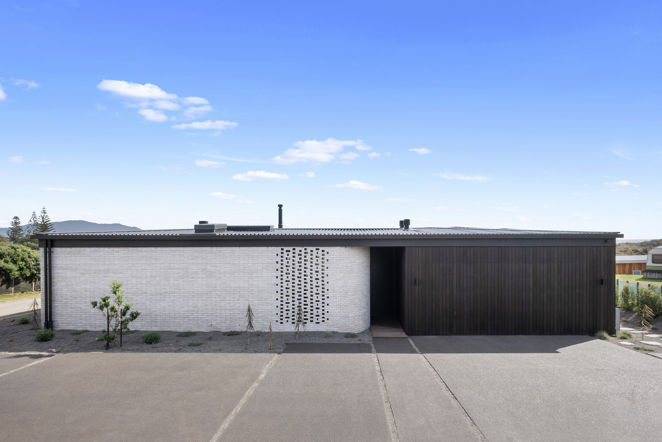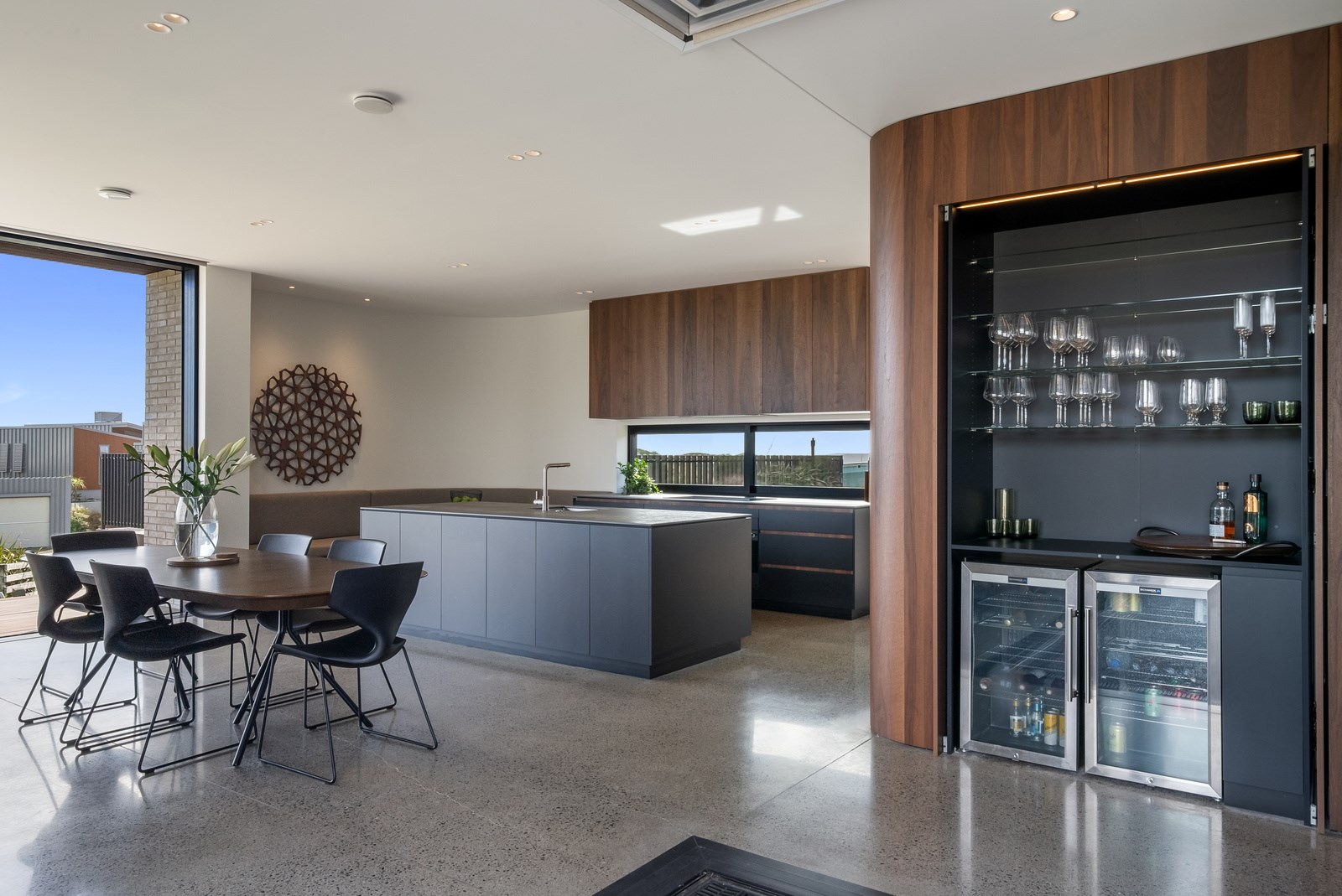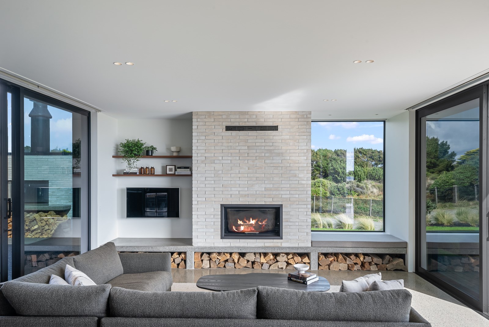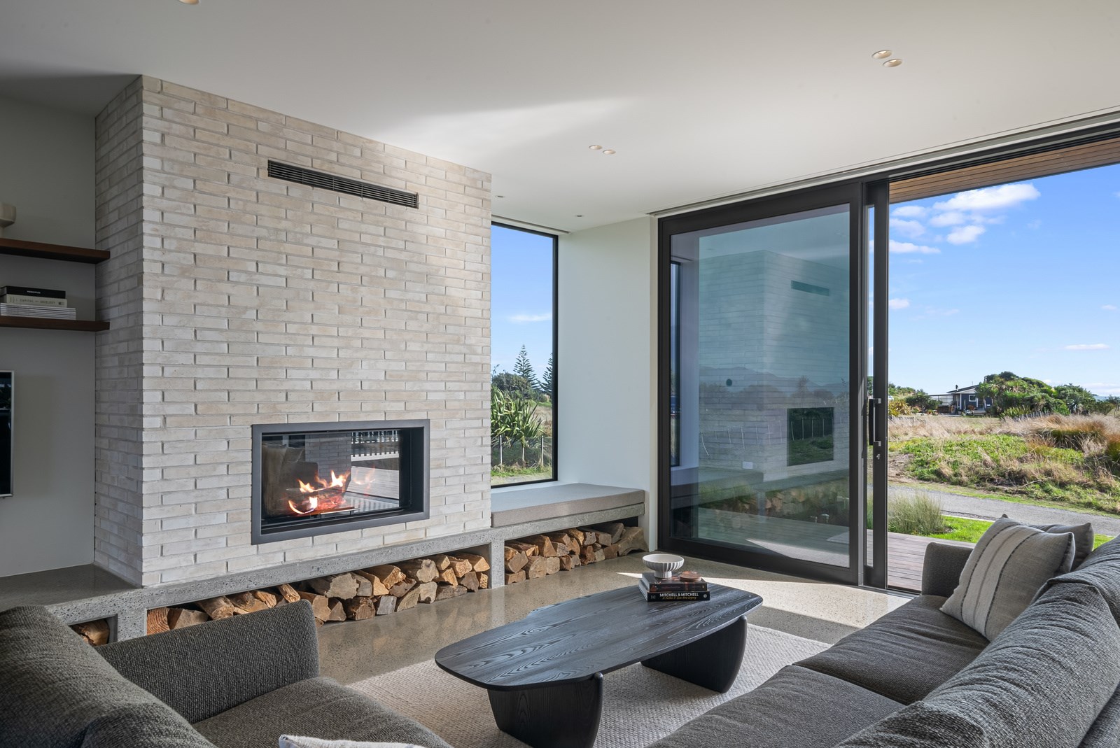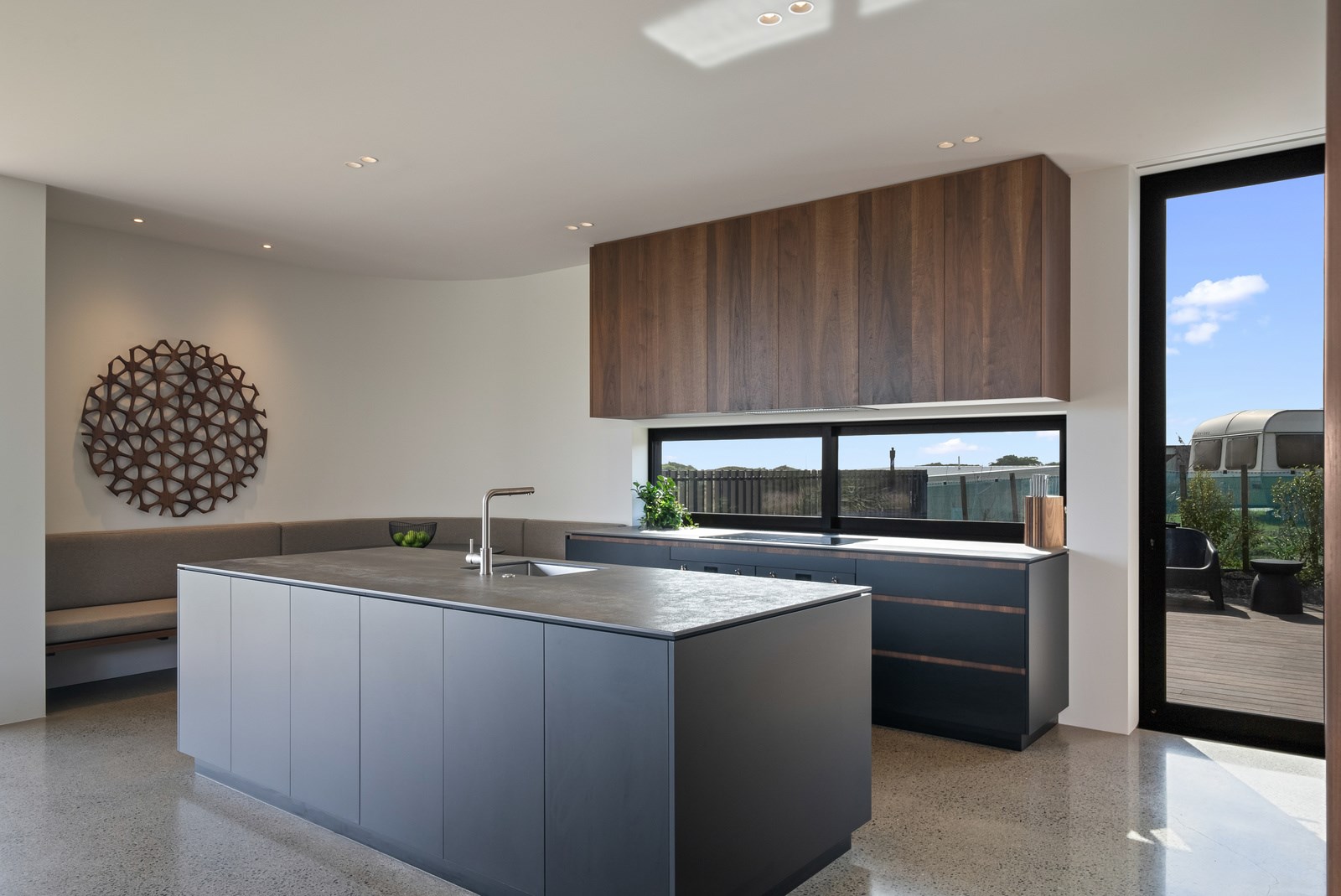 Sometimes, true beauty is low-key, relaxed and understated. Here’s a stellar example a stone’s throw from the sea on the Kāpiti Coast. Although the entrance to this tulipwood- and brick-clad beachside home has detailing and an intriguing curve, they do not overpower. Instead, they whet the appetite for what’s inside. Step into the entrance between the brick and vertical timber that disguises a double garage and you’re in a hallway stretching through the 240sqm U-shaped beach house, culminating in the open-plan living zone with dining space, kitchen and scullery. Polished-concrete floors are both stylish and practical, a walnut feature wall draws the eye and the fire keeps things toasty in winter.