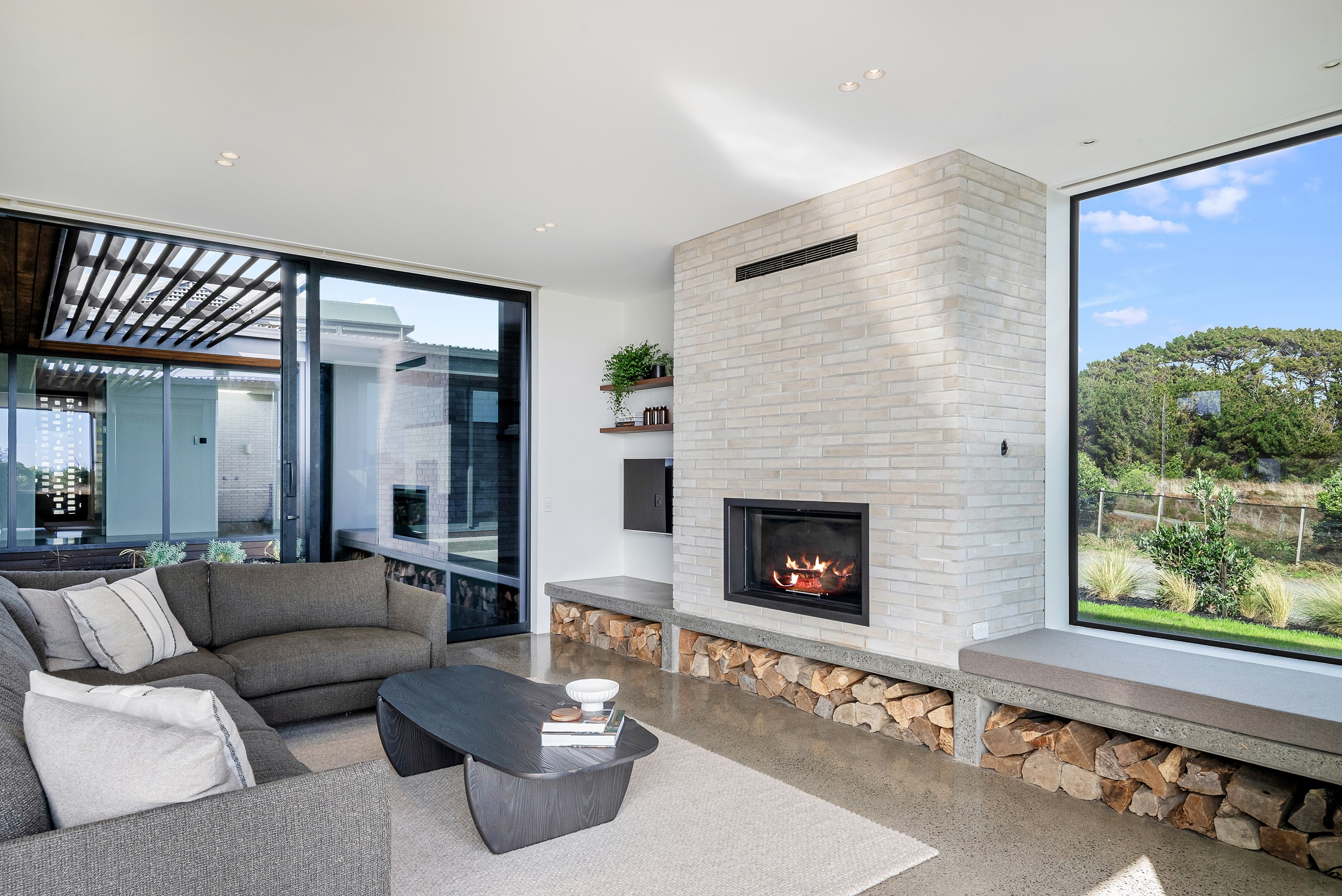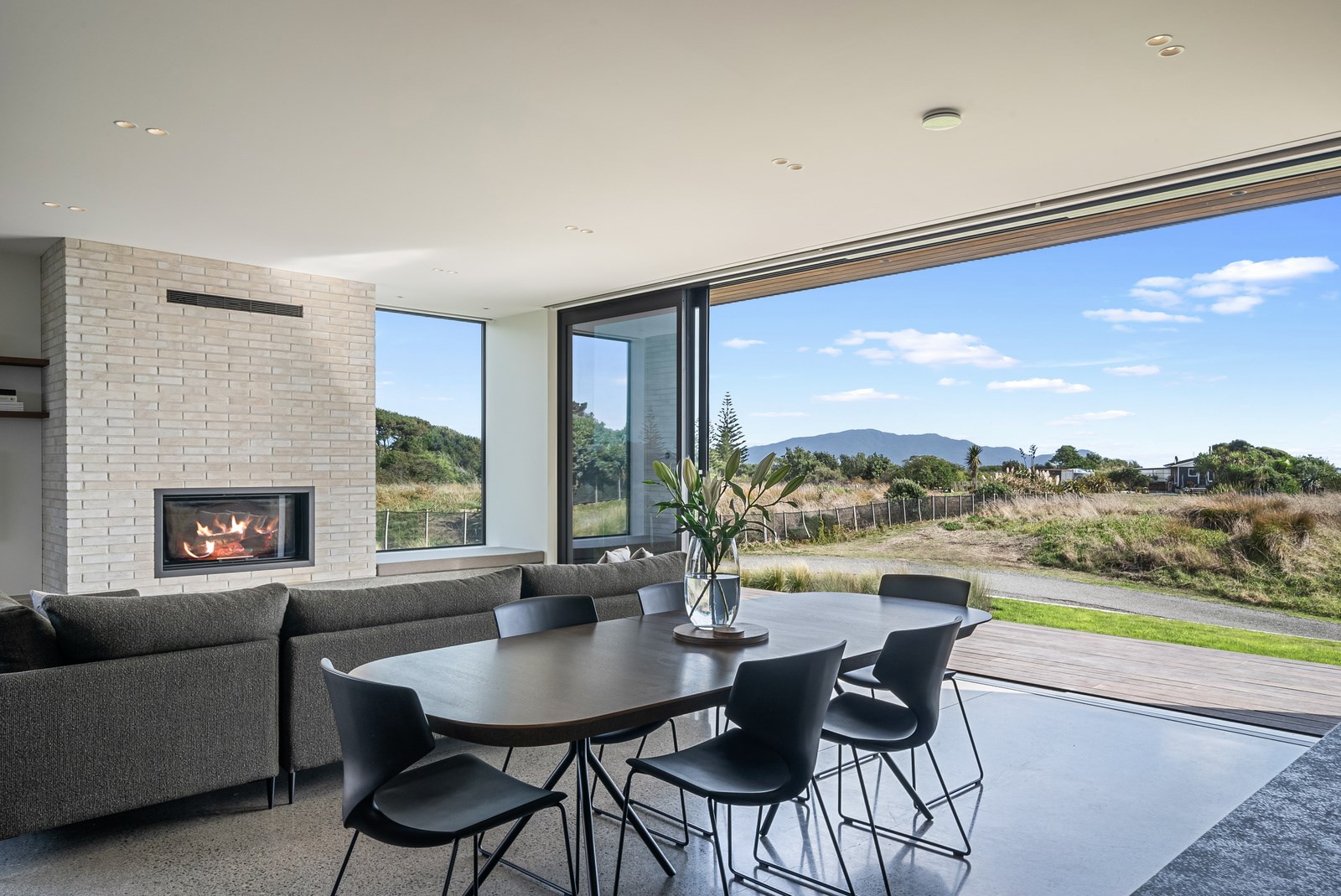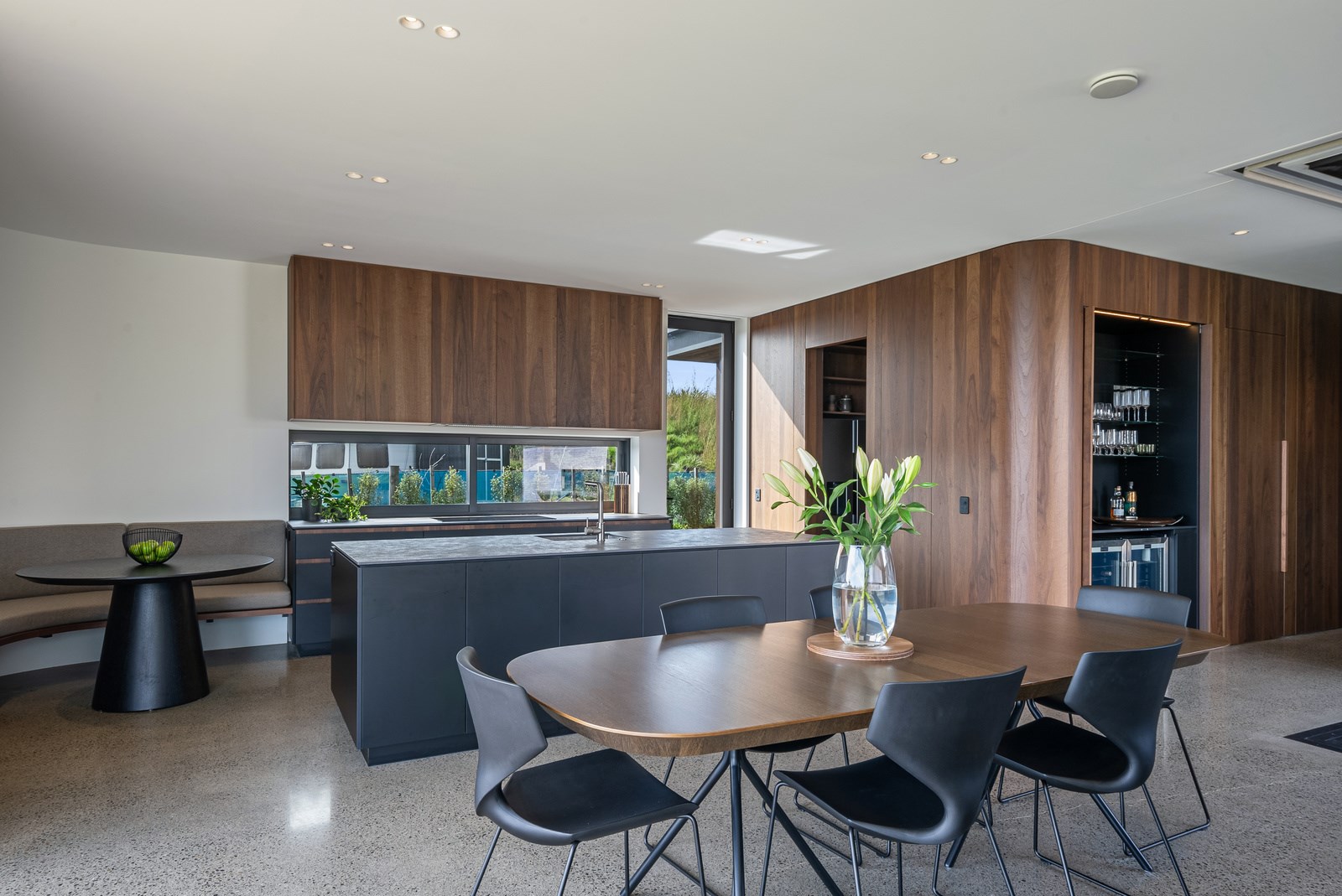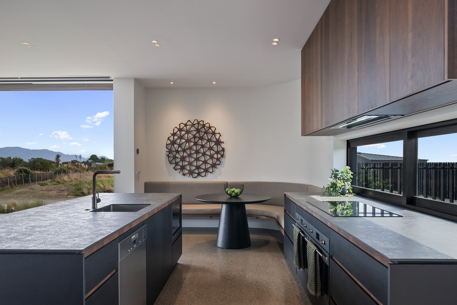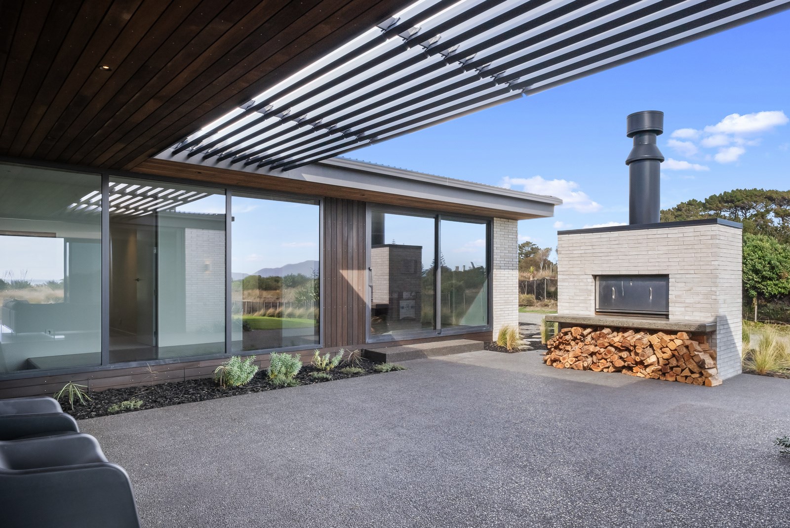 Sometimes, true beauty is low-key, relaxed and understated. Here’s a stellar example a stone’s throw from the sea on the Kāpiti Coast. Although the entrance to this tulipwood- and brick-clad beachside home has detailing and an intriguing curve, they do not overpower. Instead, they whet the appetite for what’s inside. Step into the entrance between the brick and vertical timber that disguises a double garage and you’re in a hallway stretching through the 240sqm U-shaped beach house, culminating in the open-plan living zone with dining space, kitchen and scullery. Polished-concrete floors are both stylish and practical, a walnut feature wall draws the eye and the fire keeps things toasty in winter.