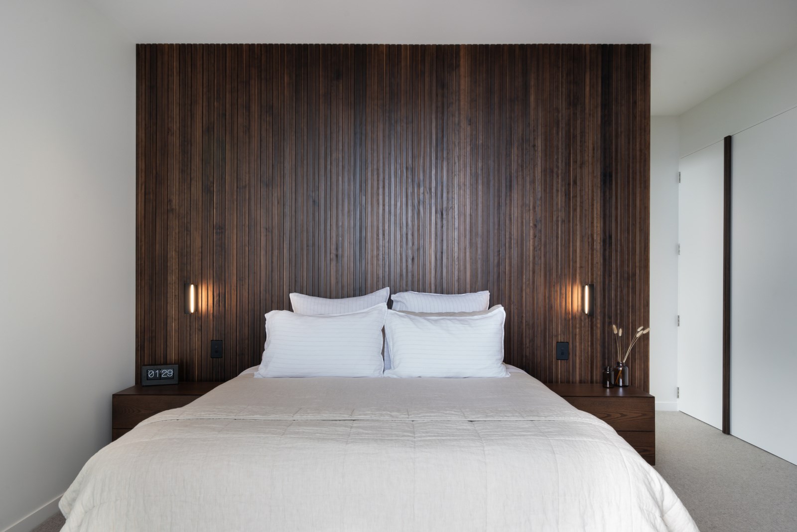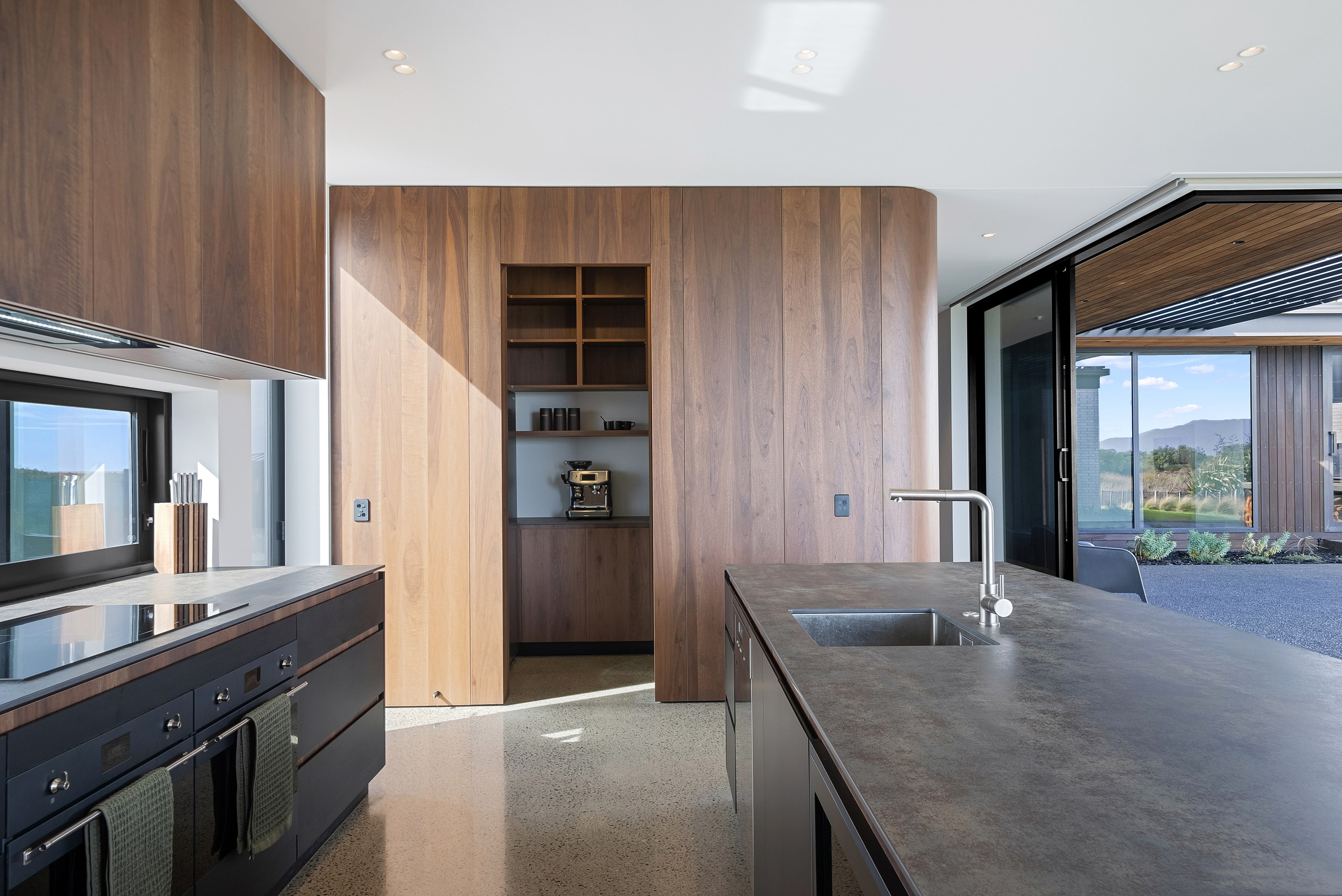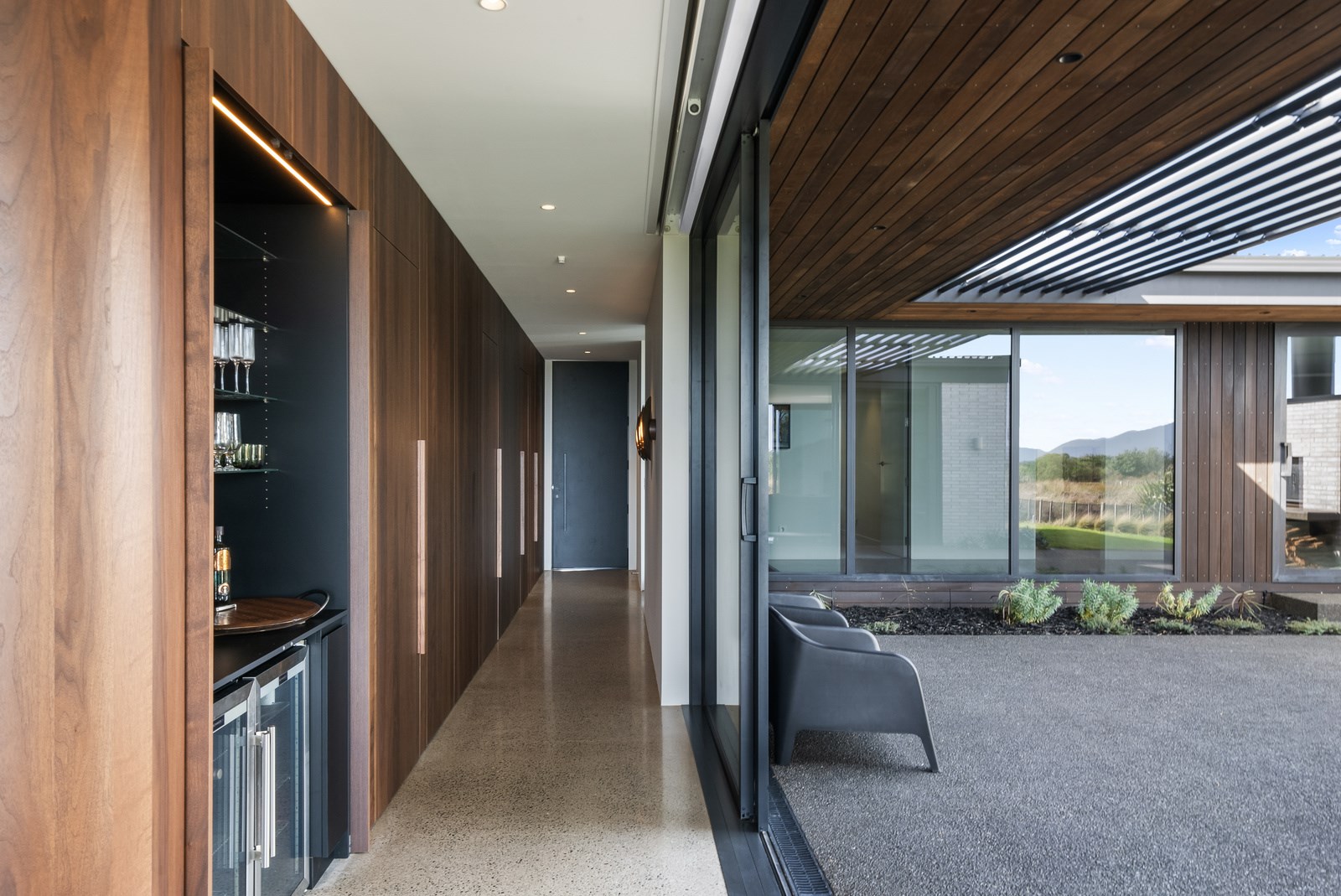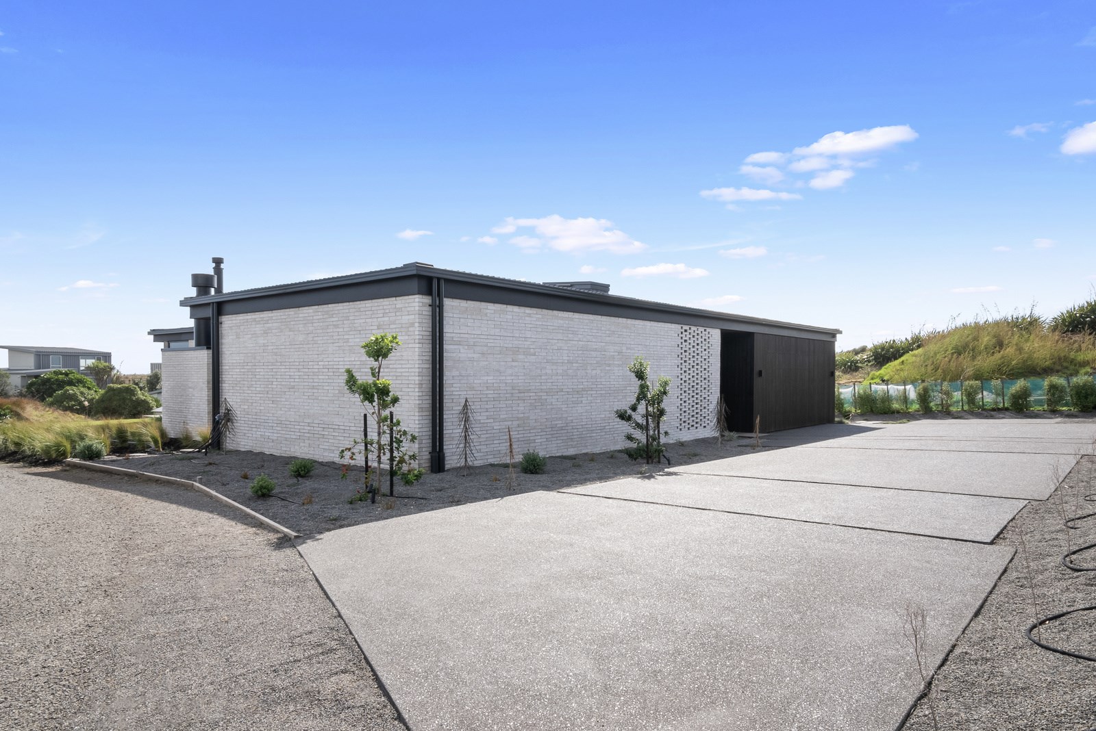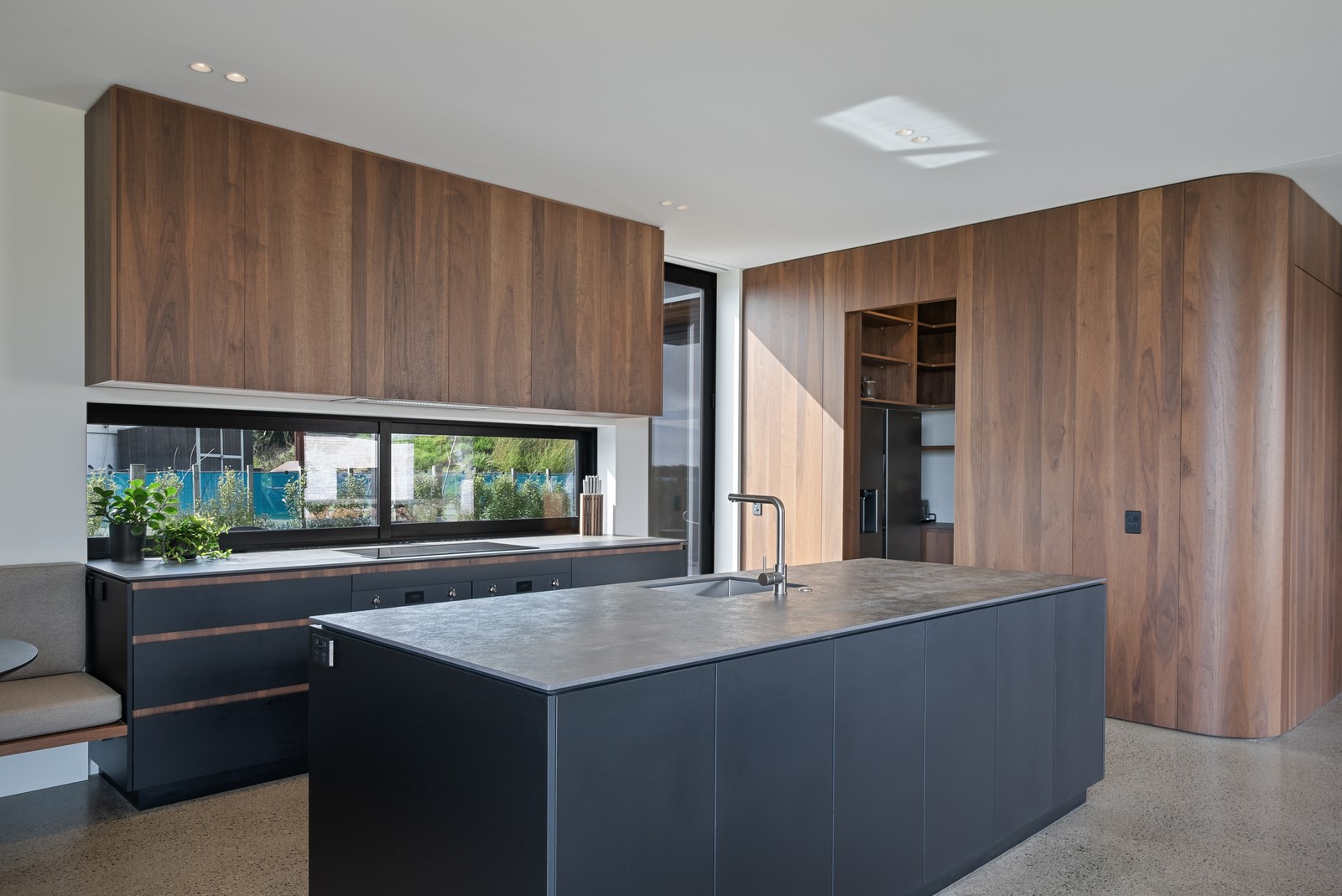 Sometimes, true beauty is low-key, relaxed and understated. Here’s a stellar example a stone’s throw from the sea on the Kāpiti Coast. Although the entrance to this tulipwood- and brick-clad beachside home has detailing and an intriguing curve, they do not overpower. Instead, they whet the appetite for what’s inside. Step into the entrance between the brick and vertical timber that disguises a double garage and you’re in a hallway stretching through the 240sqm U-shaped beach house, culminating in the open-plan living zone with dining space, kitchen and scullery. Polished-concrete floors are both stylish and practical, a walnut feature wall draws the eye and the fire keeps things toasty in winter.