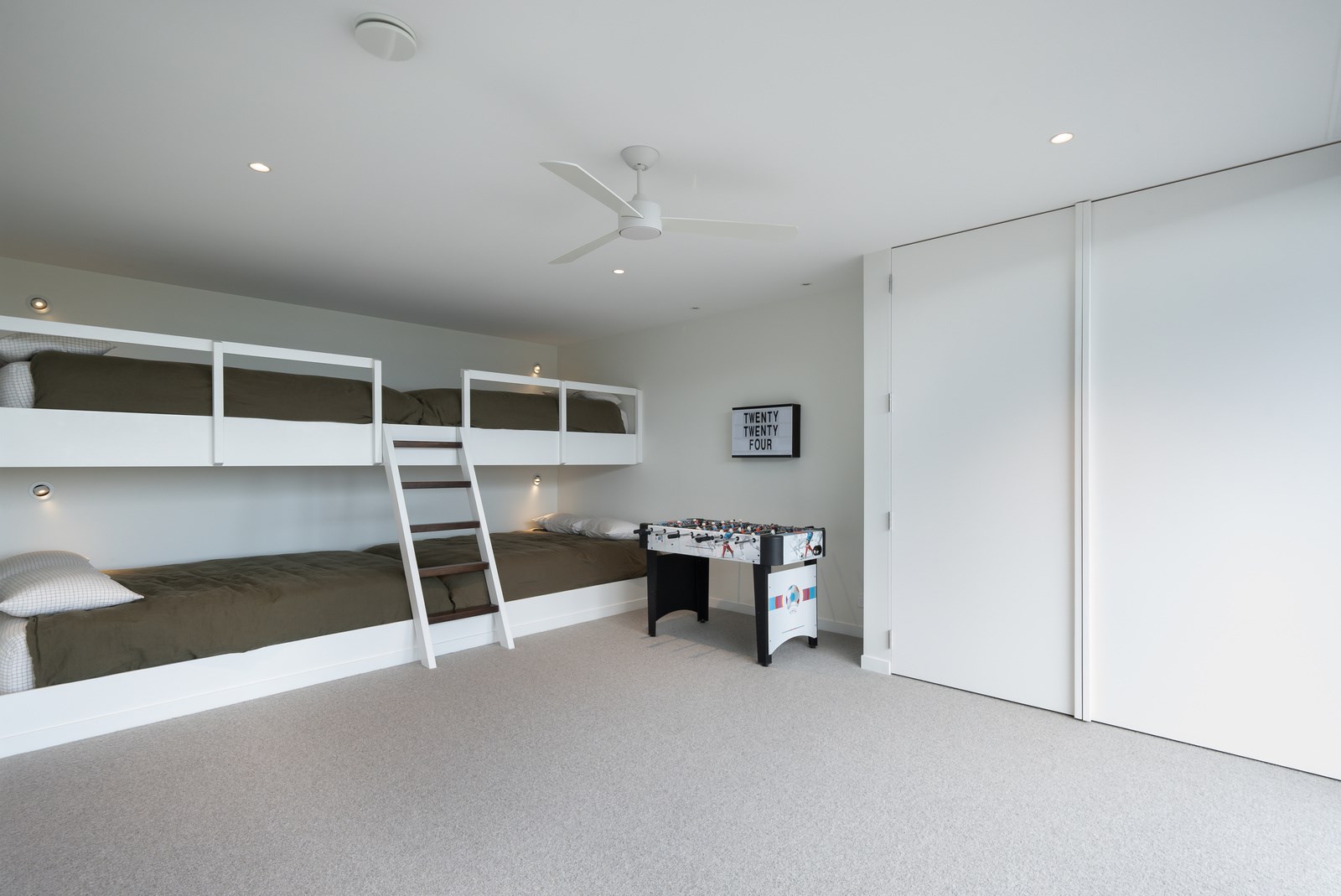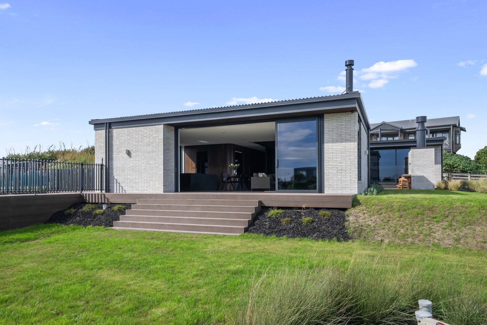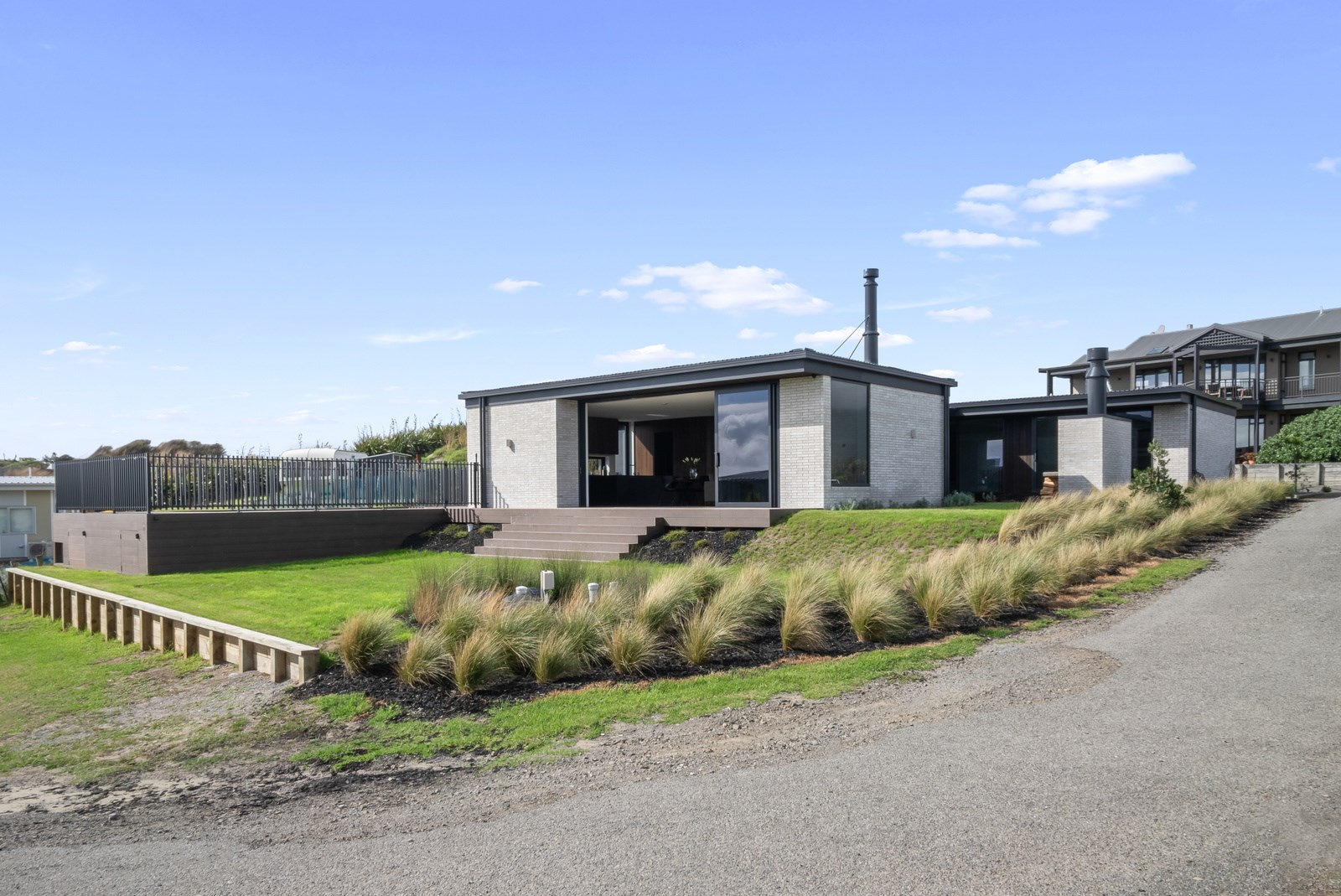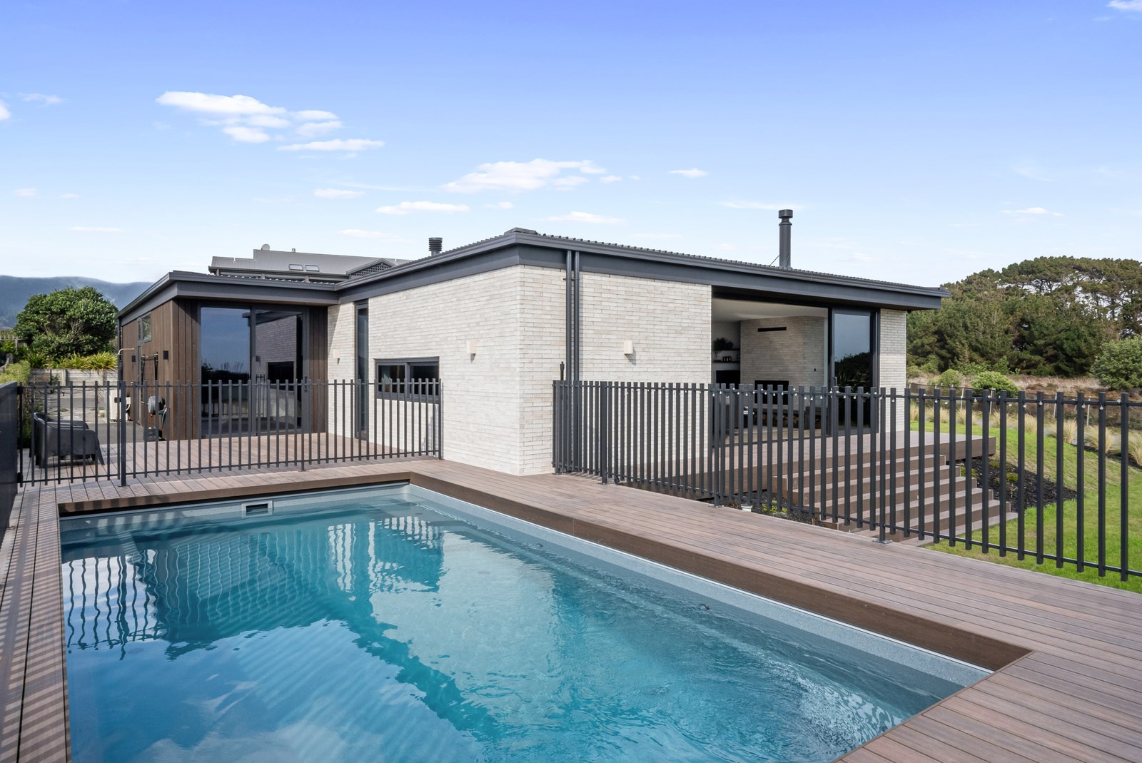 Turn right from the entry, and you’ll find the opulent main-bedroom suite and an internal entry to the garage. To the left, a hall leads to two more bedrooms, including a bunkroom, as well as a bathroom. Off the hallway itself is a powder room. In the notch formed by the U is a sheltered patio with an outdoor fire – just the spot for alfresco meals, relaxing or warming up after a dip in the pool or the water beyond. Sea swimmers can rinse off sand and salt under the outside shower. This house is warm and energy-efficient, too. It has an airtight wrap, heating and cooling concrete slab, vented roof, mechanical central ventilation system and solar panels on the roof