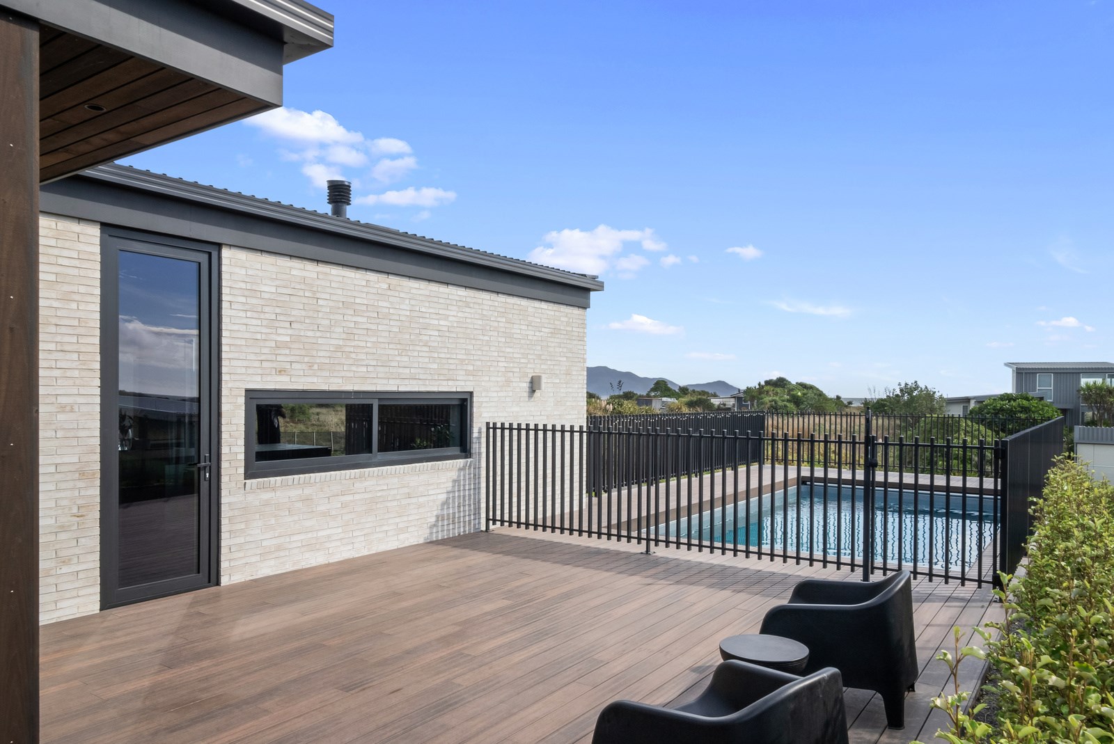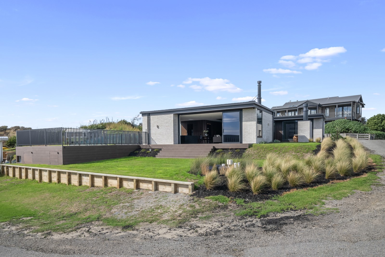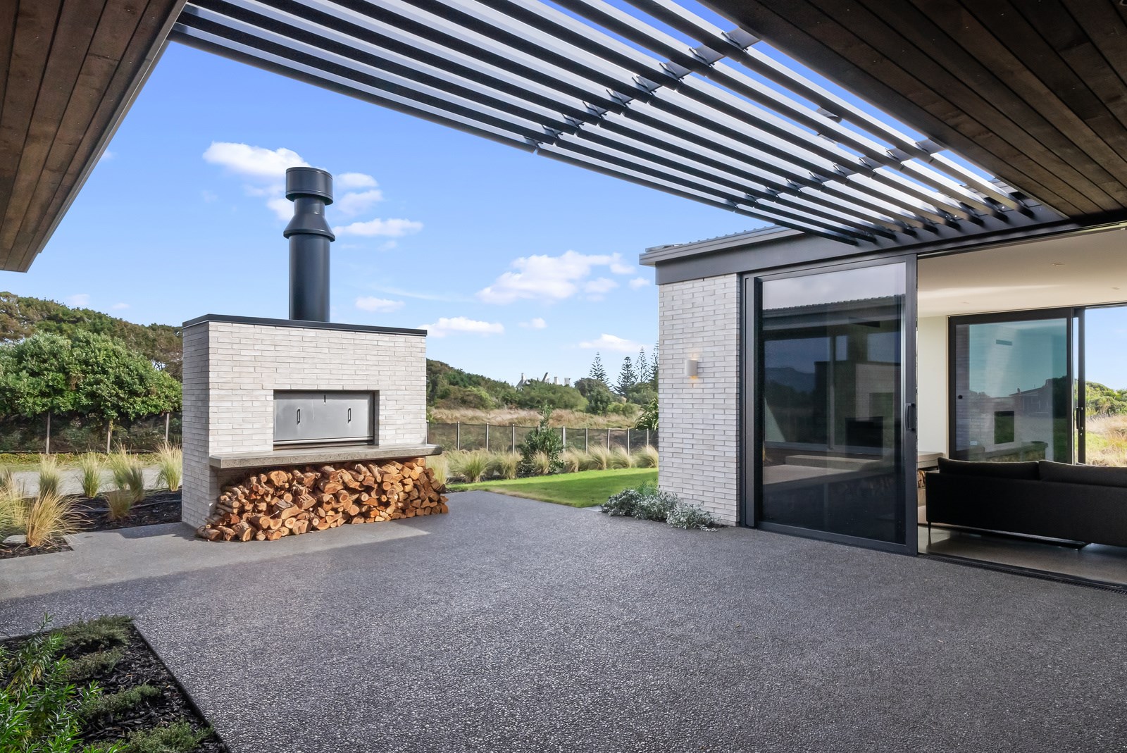 Turn right from the entry, and you’ll find the opulent main-bedroom suite and an internal entry to the garage. To the left, a hall leads to two more bedrooms, including a bunkroom, as well as a bathroom. Off the hallway itself is a powder room. In the notch formed by the U is a sheltered patio with an outdoor fire – just the spot for alfresco meals, relaxing or warming up after a dip in the pool or the water beyond. Sea swimmers can rinse off sand and salt under the outside shower. This house is warm and energy-efficient, too. It has an airtight wrap, heating and cooling concrete slab, vented roof, mechanical central ventilation system and solar panels on the roof