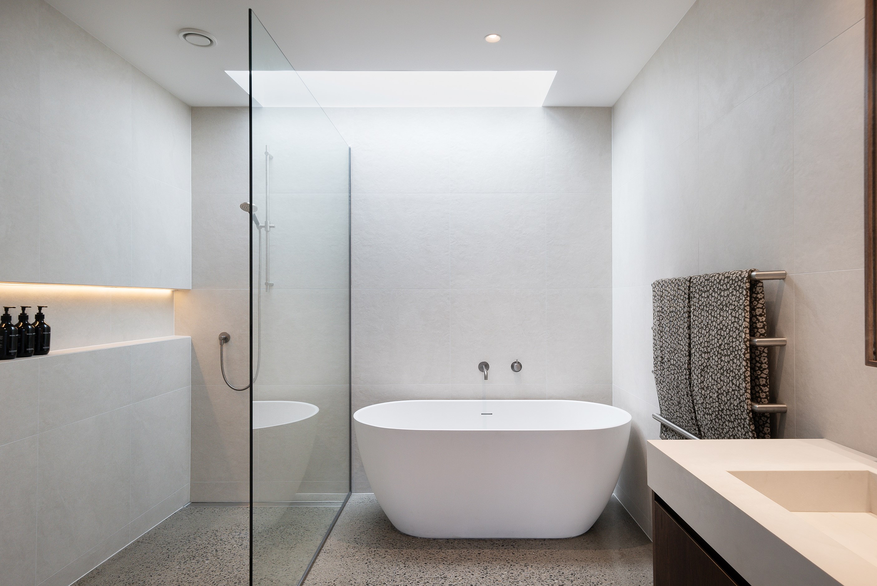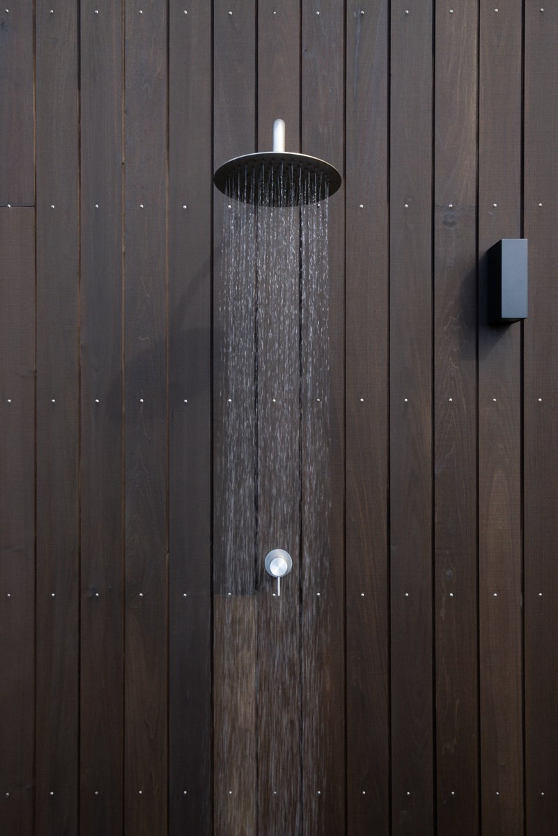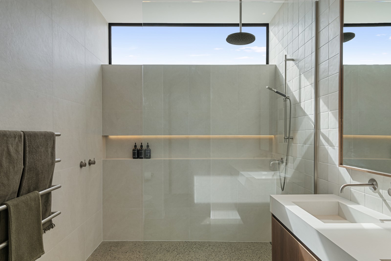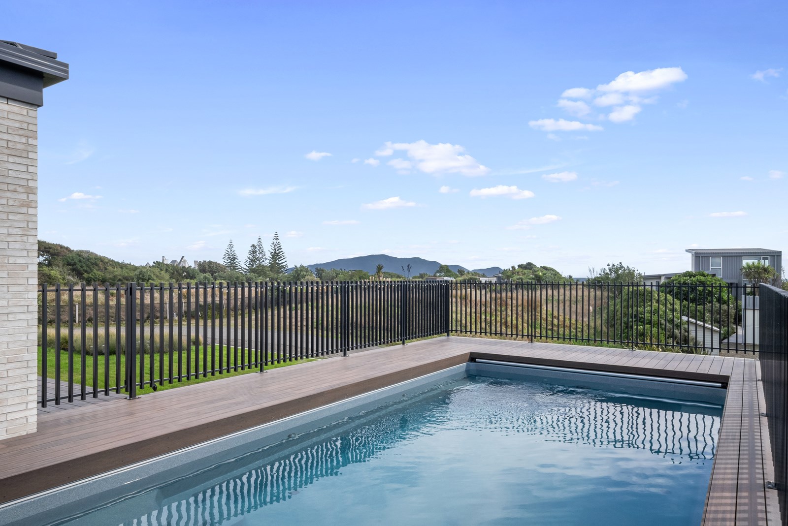 Turn right from the entry, and you’ll find the opulent main-bedroom suite and an internal entry to the garage. To the left, a hall leads to two more bedrooms, including a bunkroom, as well as a bathroom. Off the hallway itself is a powder room. In the notch formed by the U is a sheltered patio with an outdoor fire – just the spot for alfresco meals, relaxing or warming up after a dip in the pool or the water beyond. Sea swimmers can rinse off sand and salt under the outside shower. This house is warm and energy-efficient, too. It has an airtight wrap, heating and cooling concrete slab, vented roof, mechanical central ventilation system and solar panels on the roof