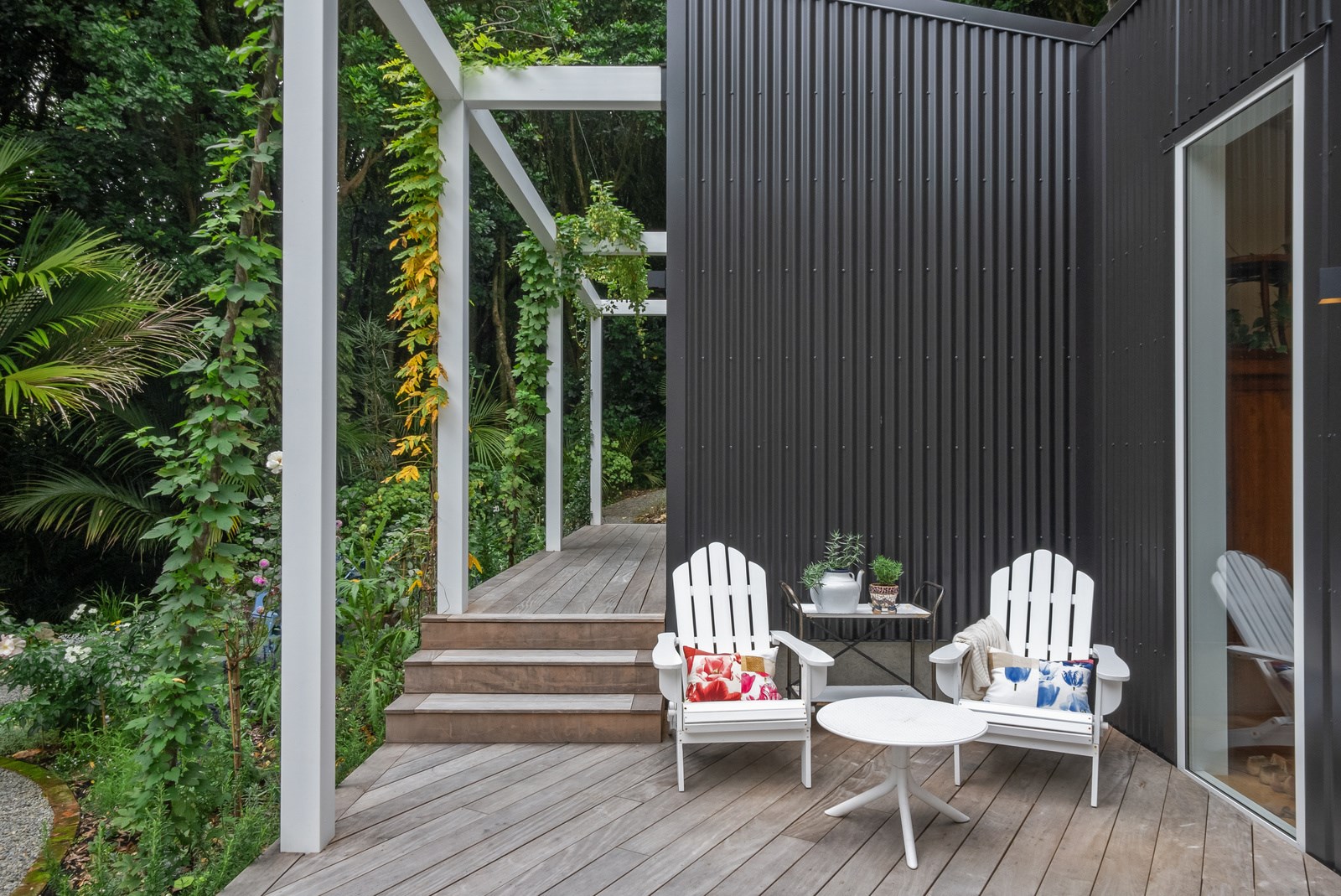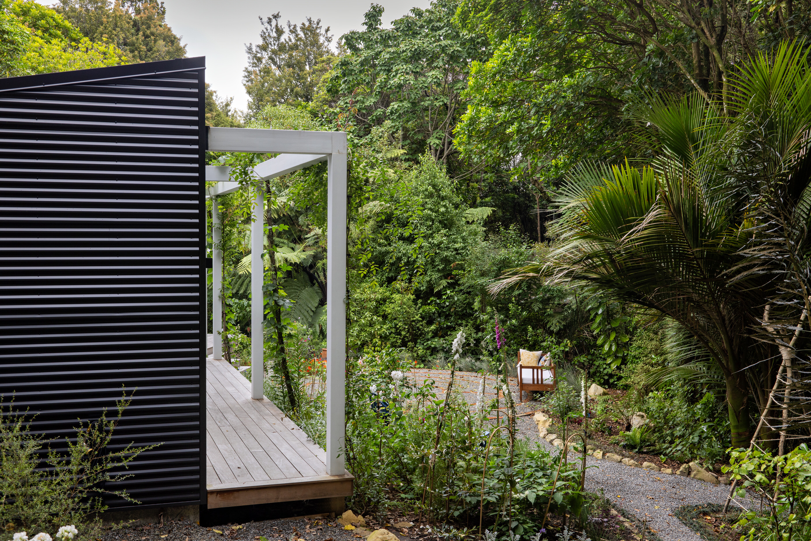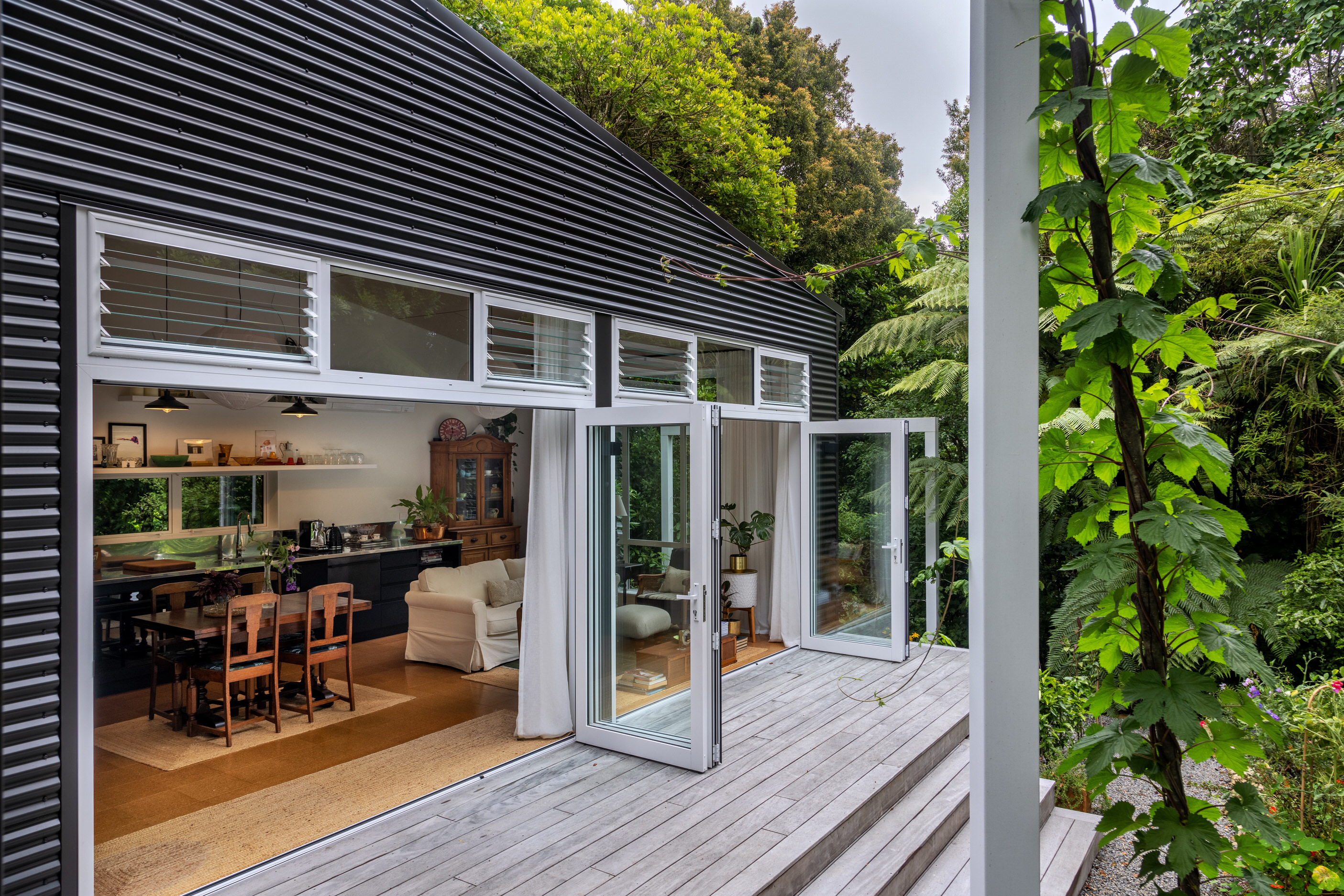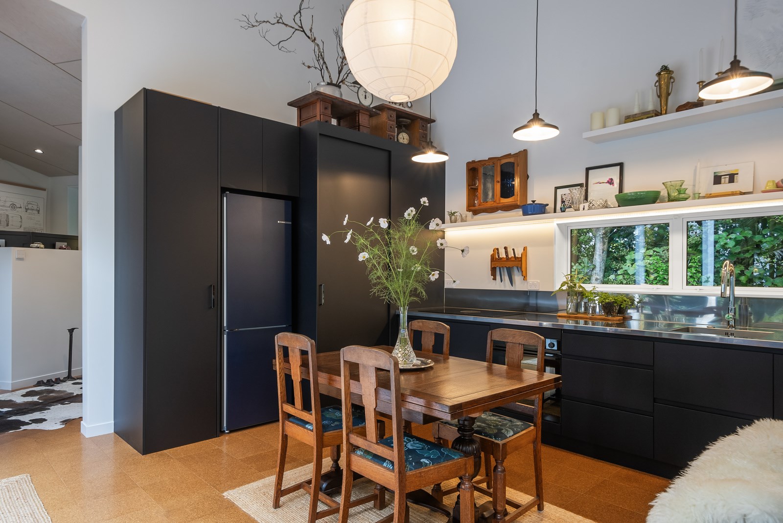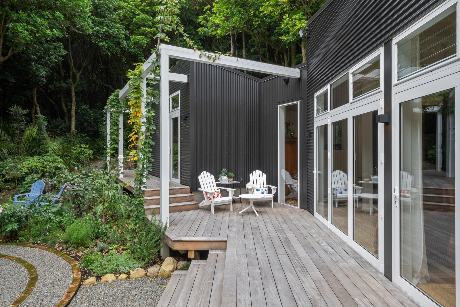 How did they manage it all in the 89sqm floorplan? First, says Tim Sunderland, owner and managing director of David Reid Homes (Kāpiti), which also operates across the Wellington region, the firm had to survey not only the land, but the tree-line, too. “The site is completely surrounded by trees, so we needed to know where was going to get sun throughout the day and over the year.” They also had to factor in a view shaft through the trees plus prized possessions the owners wanted to bring with them. The design – two linked wings at different angles and heights – covers the sunlight angle, and dark metal cladding helps settle the home into its remarkable spot. Most utilities are on the south side where towering trees flank the walkway to the entrance. The north elevation is an exemplar of how to capture sun and scenery in equal measure. The living, kitchen and dining space as well as the two bedrooms (one is used as a second sitting room), face north and a clearing, before the bush and tree canopy continue. Sunshine is plentiful enough for a pergola with a developing vine. Decking flows from the living spaces as well as the bedroom, reinforcing the home’s connection to nature. The kitchen winds around the wall of the living-dining area with a rectangular window that frames the trees. Windows and doors fill the north and west walls.