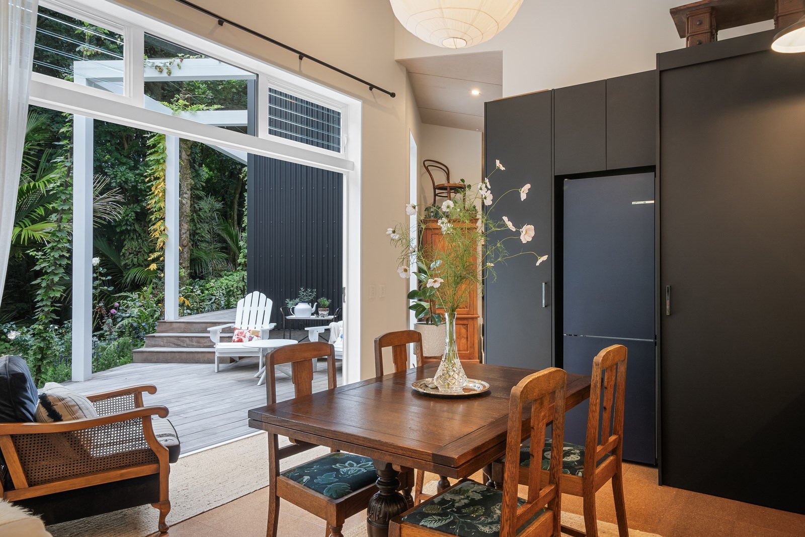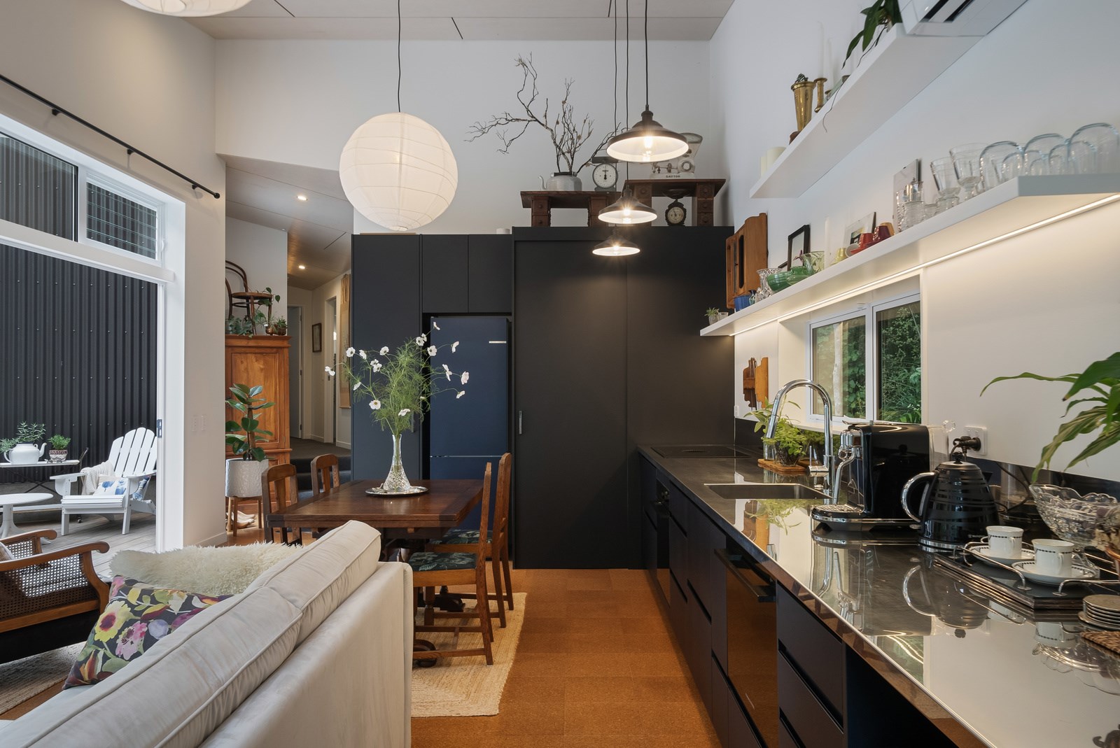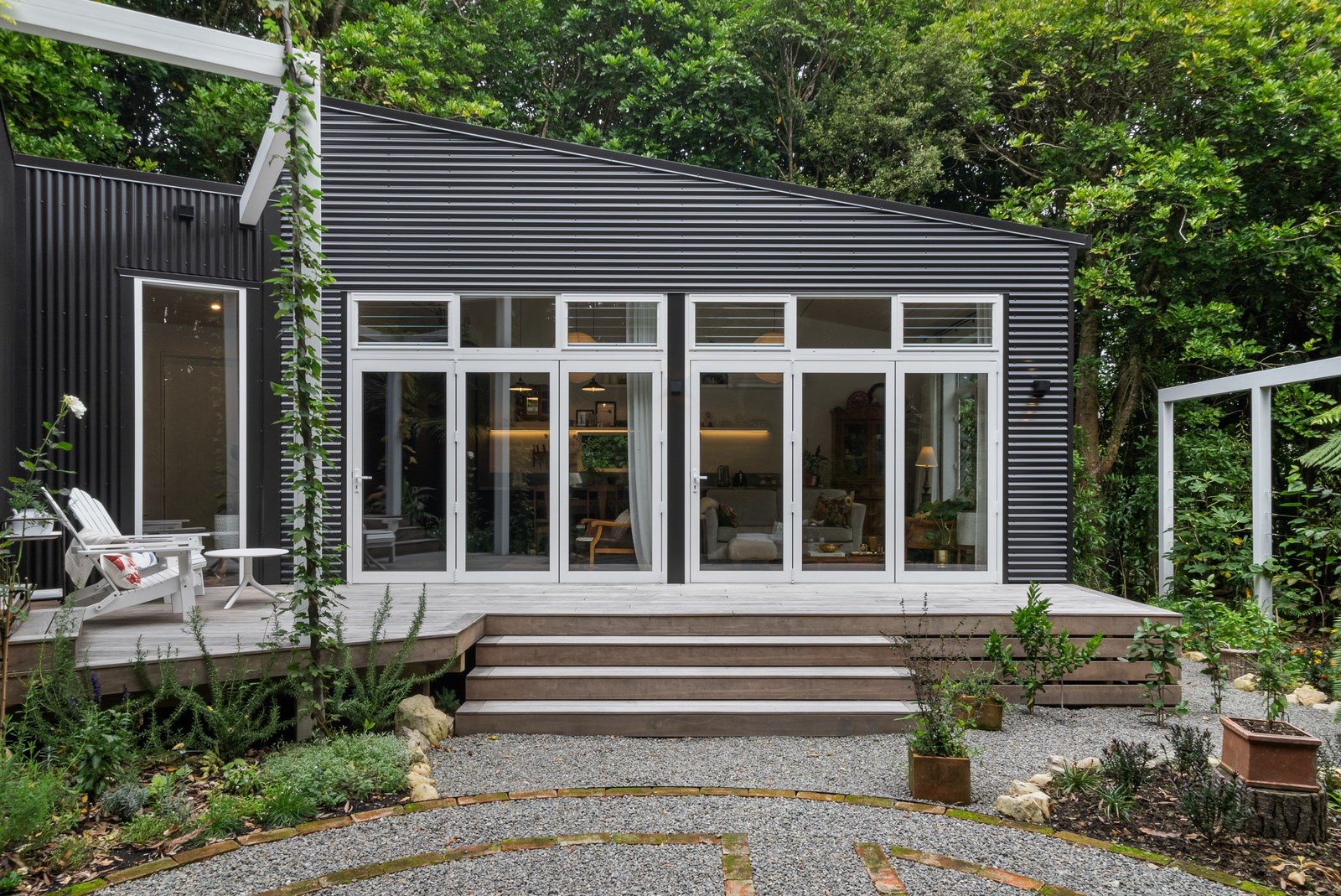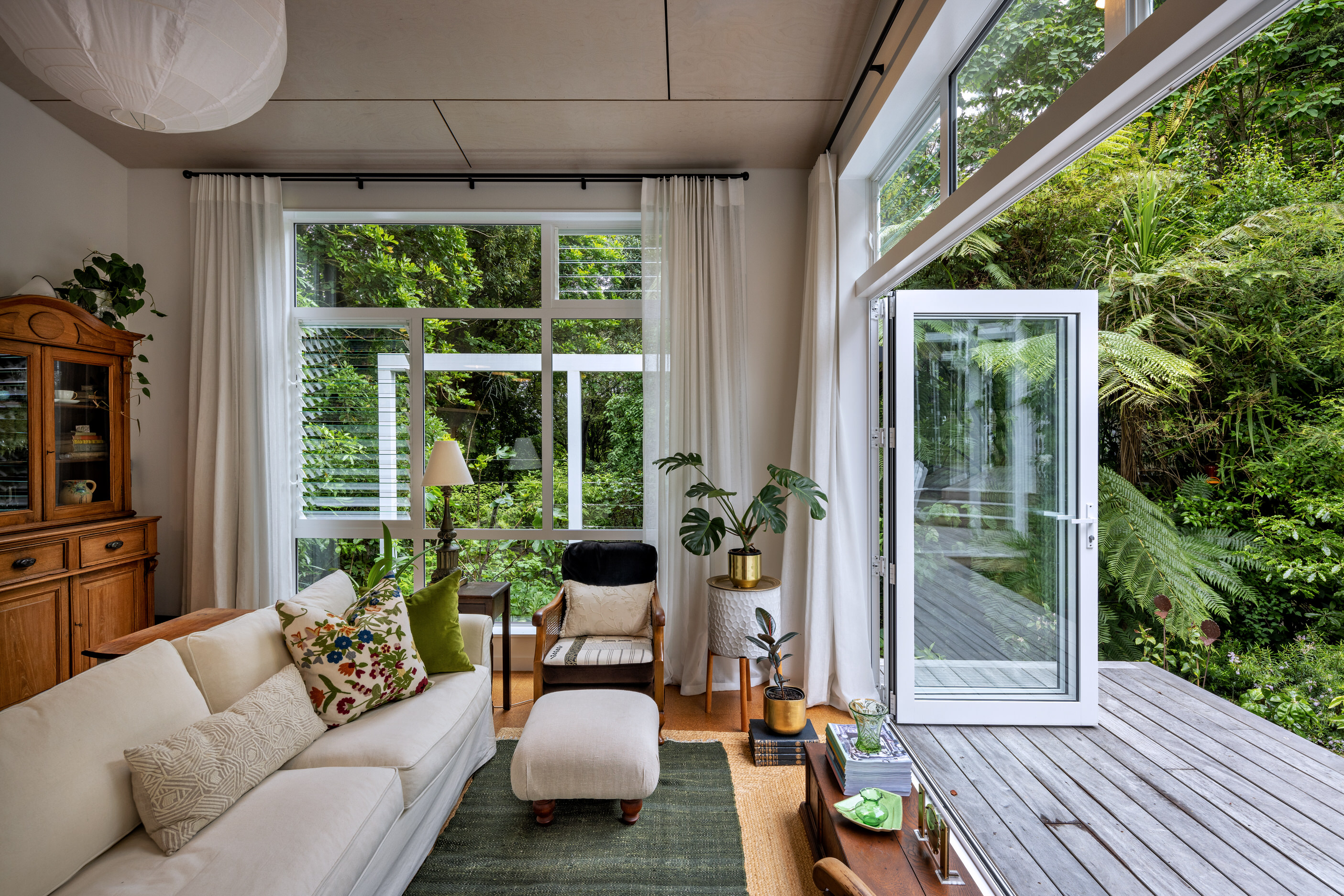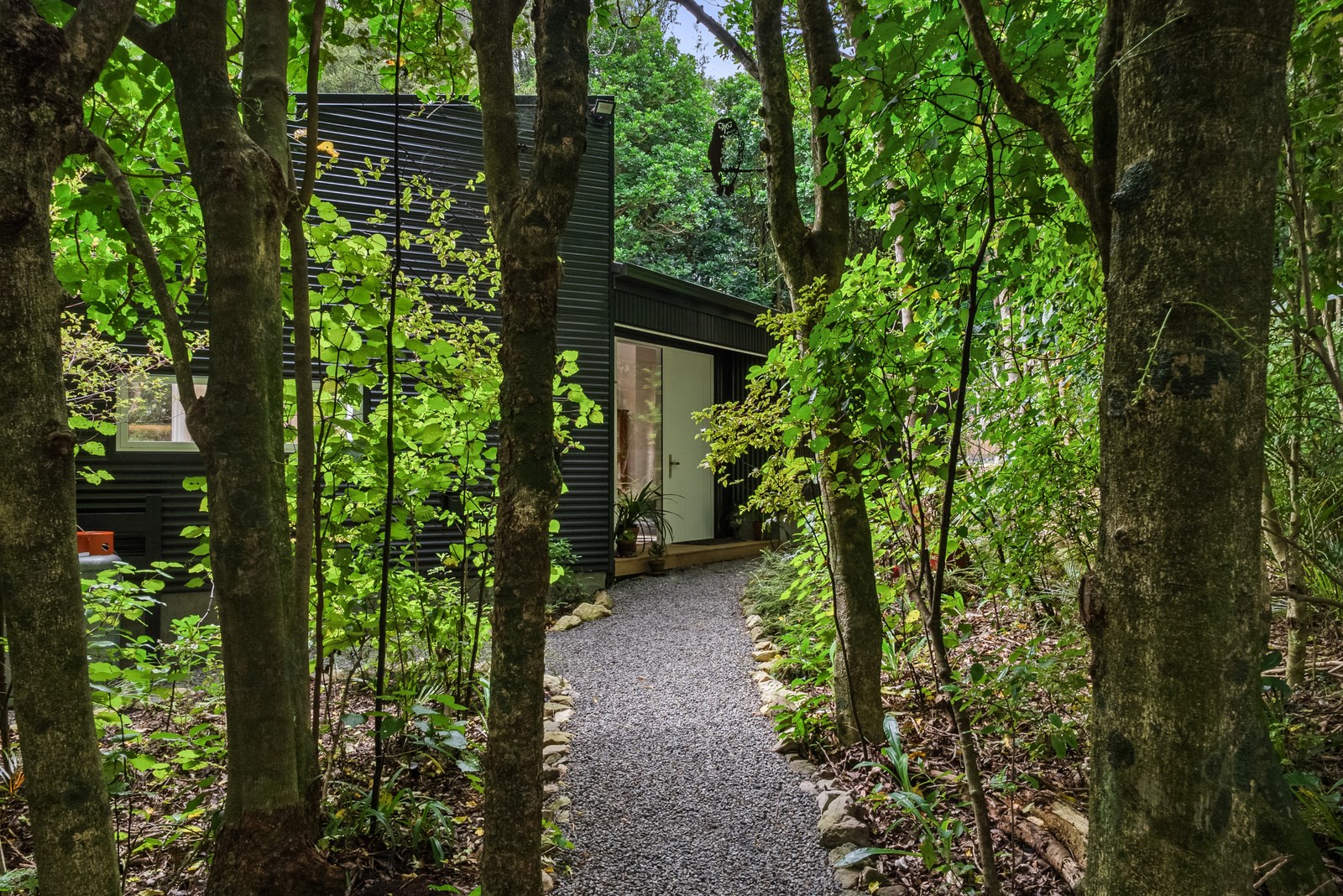 How did they manage it all in the 89sqm floorplan? First, says Tim Sunderland, owner and managing director of David Reid Homes (Kāpiti), which also operates across the Wellington region, the firm had to survey not only the land, but the tree-line, too. “The site is completely surrounded by trees, so we needed to know where was going to get sun throughout the day and over the year.” They also had to factor in a view shaft through the trees plus prized possessions the owners wanted to bring with them. The design – two linked wings at different angles and heights – covers the sunlight angle, and dark metal cladding helps settle the home into its remarkable spot. Most utilities are on the south side where towering trees flank the walkway to the entrance. The north elevation is an exemplar of how to capture sun and scenery in equal measure. The living, kitchen and dining space as well as the two bedrooms (one is used as a second sitting room), face north and a clearing, before the bush and tree canopy continue. Sunshine is plentiful enough for a pergola with a developing vine. Decking flows from the living spaces as well as the bedroom, reinforcing the home’s connection to nature. The kitchen winds around the wall of the living-dining area with a rectangular window that frames the trees. Windows and doors fill the north and west walls.