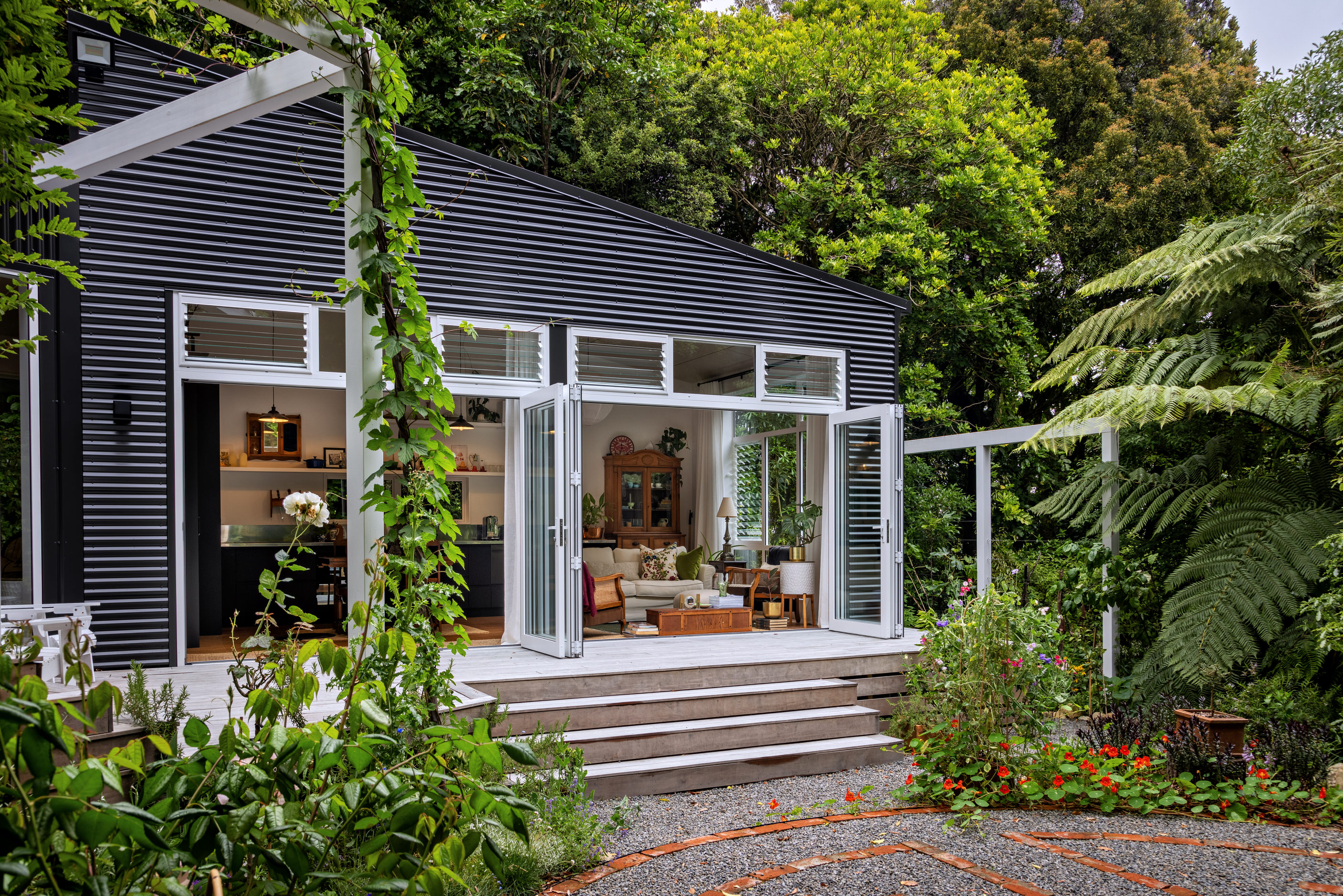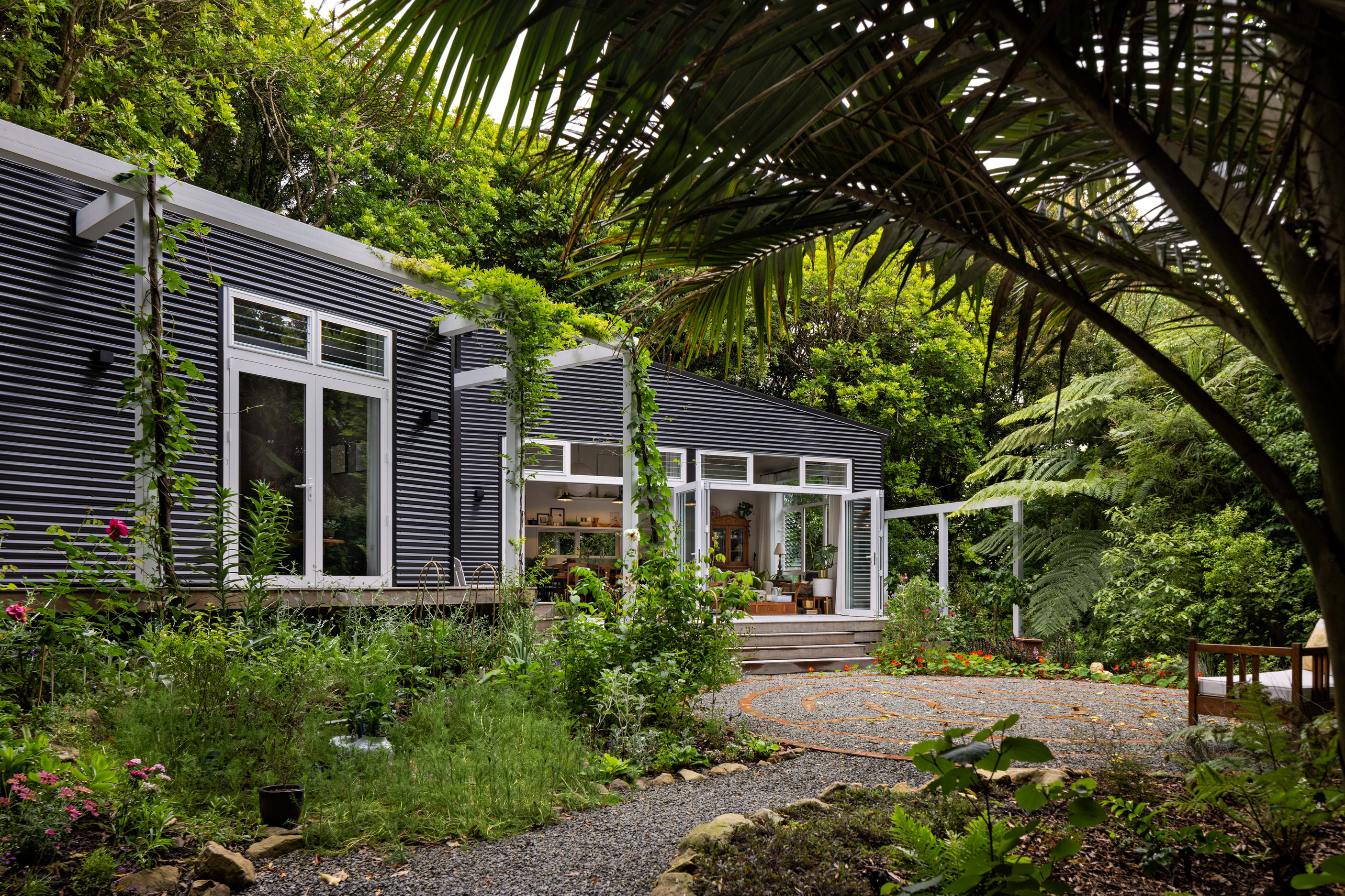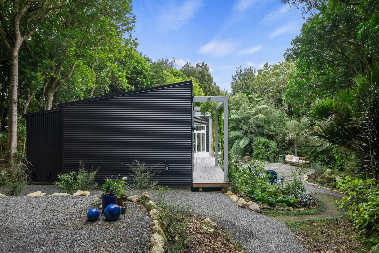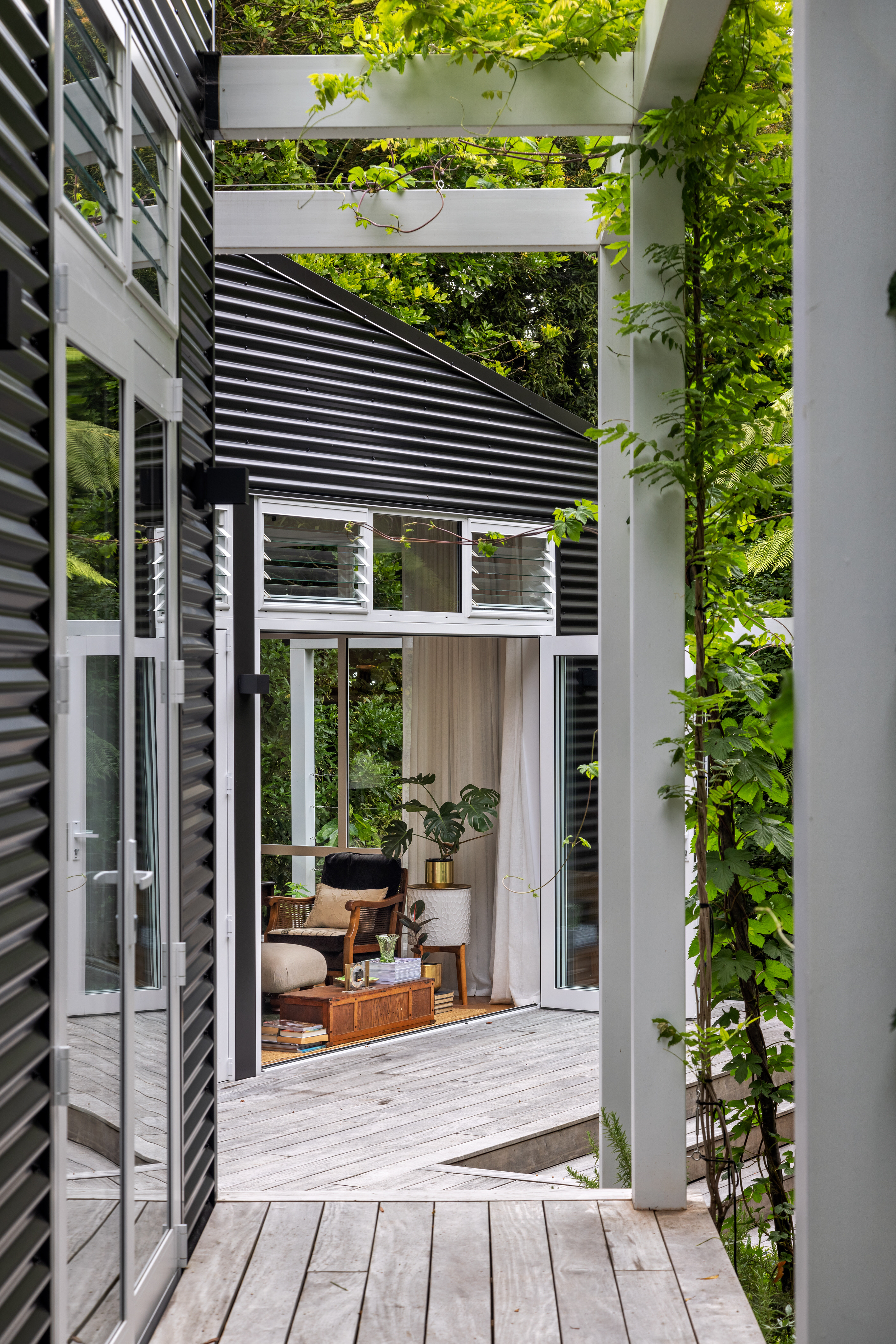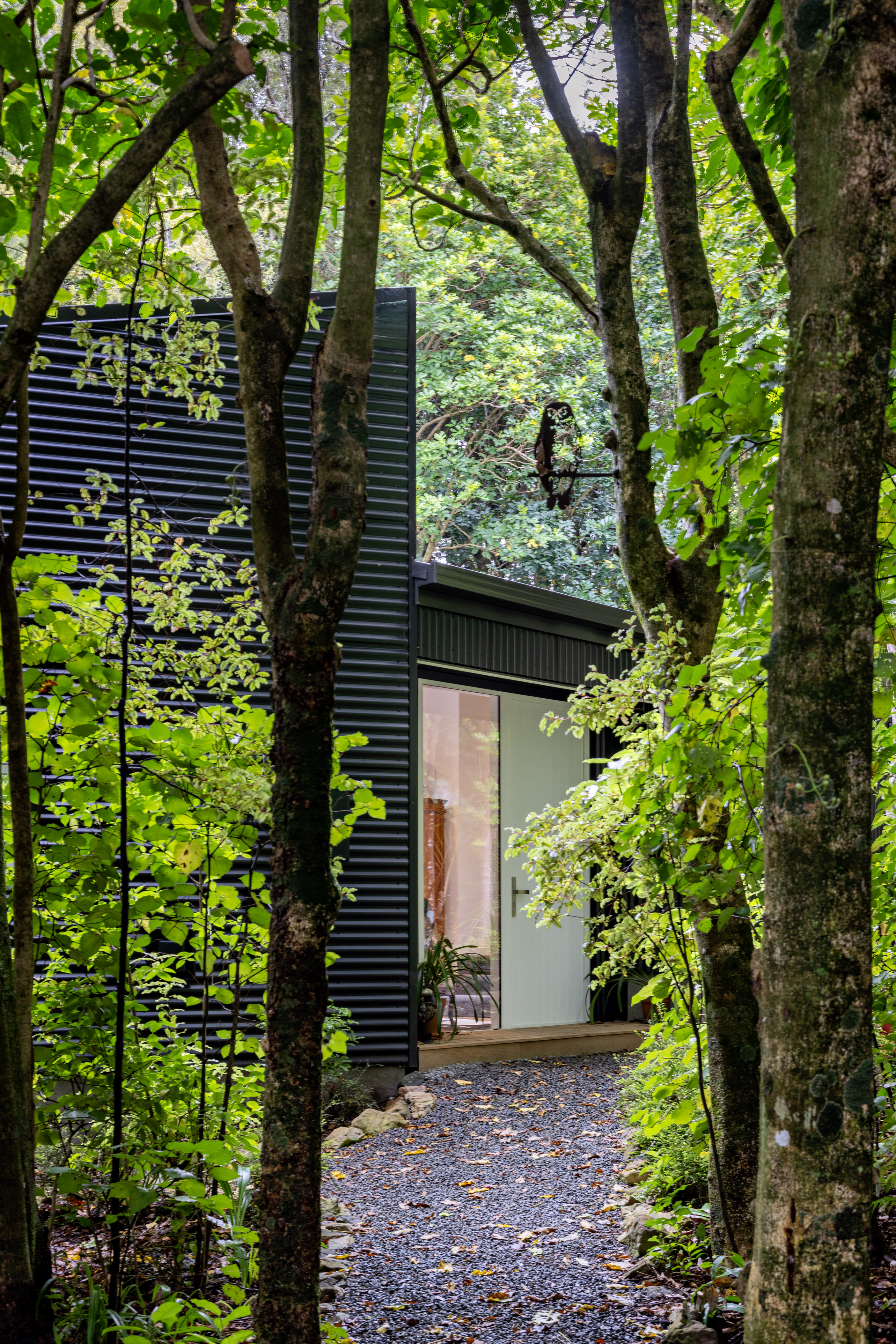 How did they manage it all in the 89sqm floorplan? First, says Tim Sunderland, owner and managing director of David Reid Homes (Kāpiti), which also operates across the Wellington region, the firm had to survey not only the land, but the tree-line, too. “The site is completely surrounded by trees, so we needed to know where was going to get sun throughout the day and over the year.” They also had to factor in a view shaft through the trees plus prized possessions the owners wanted to bring with them. The design – two linked wings at different angles and heights – covers the sunlight angle, and dark metal cladding helps settle the home into its remarkable spot. Most utilities are on the south side where towering trees flank the walkway to the entrance. The north elevation is an exemplar of how to capture sun and scenery in equal measure. The living, kitchen and dining space as well as the two bedrooms (one is used as a second sitting room), face north and a clearing, before the bush and tree canopy continue. Sunshine is plentiful enough for a pergola with a developing vine. Decking flows from the living spaces as well as the bedroom, reinforcing the home’s connection to nature. The kitchen winds around the wall of the living-dining area with a rectangular window that frames the trees. Windows and doors fill the north and west walls.