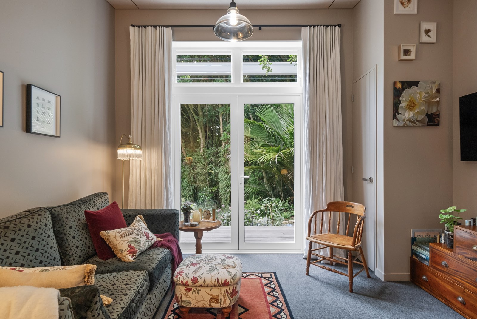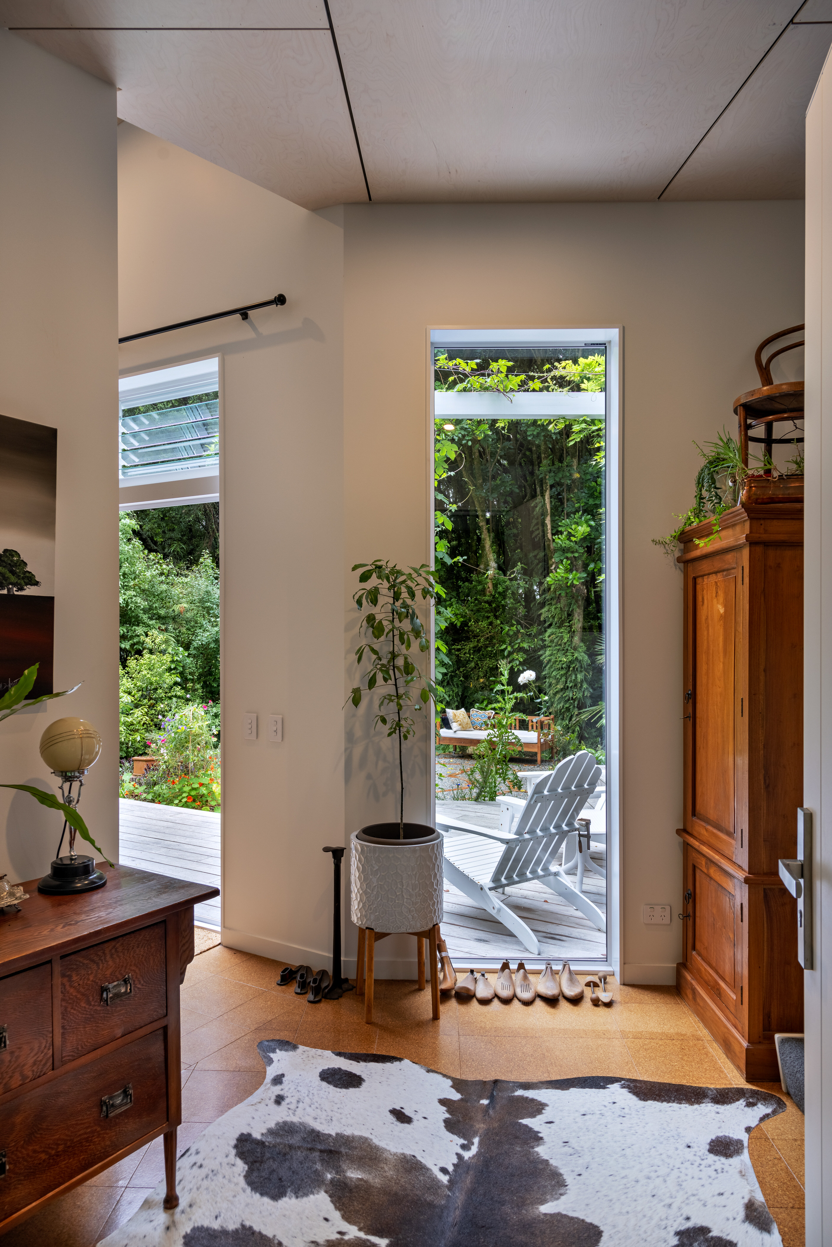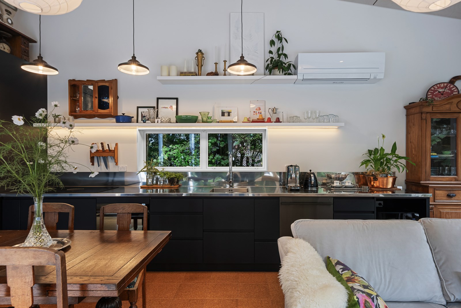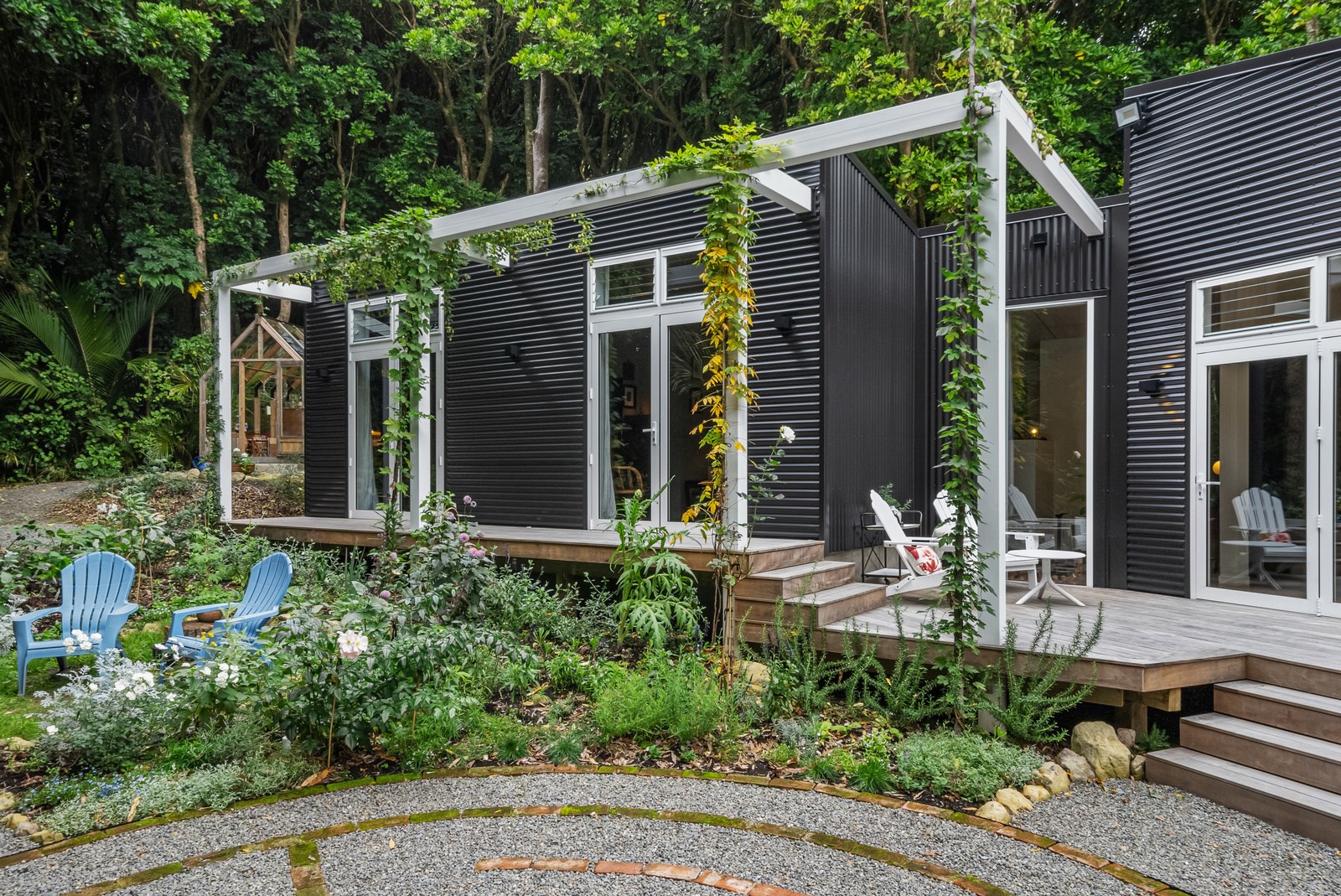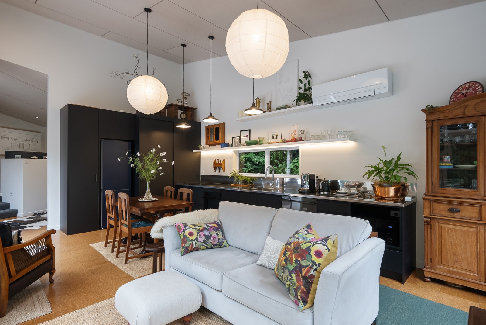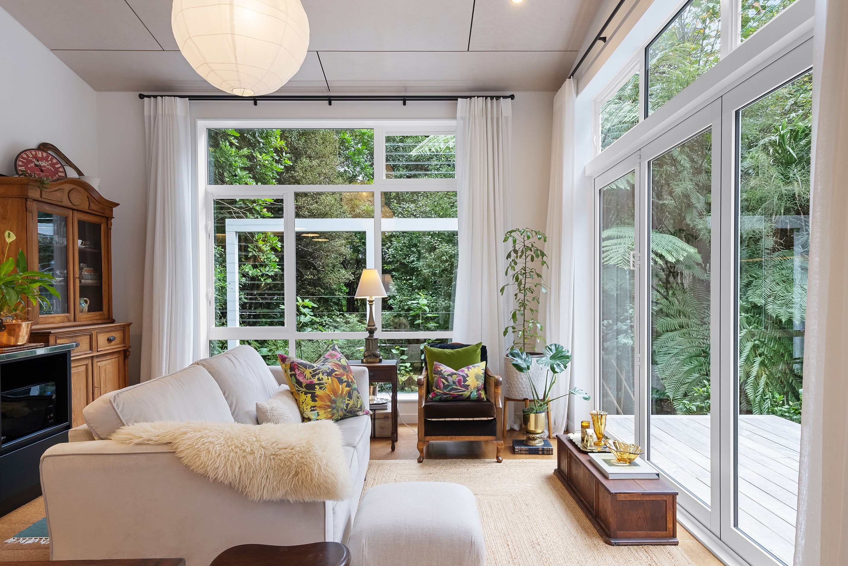 How did they manage it all in the 89sqm floorplan? First, says Tim Sunderland, owner and managing director of David Reid Homes (Kāpiti), which also operates across the Wellington region, the firm had to survey not only the land, but the tree-line, too. “The site is completely surrounded by trees, so we needed to know where was going to get sun throughout the day and over the year.” They also had to factor in a view shaft through the trees plus prized possessions the owners wanted to bring with them. The design – two linked wings at different angles and heights – covers the sunlight angle, and dark metal cladding helps settle the home into its remarkable spot. Most utilities are on the south side where towering trees flank the walkway to the entrance. The north elevation is an exemplar of how to capture sun and scenery in equal measure. The living, kitchen and dining space as well as the two bedrooms (one is used as a second sitting room), face north and a clearing, before the bush and tree canopy continue. Sunshine is plentiful enough for a pergola with a developing vine. Decking flows from the living spaces as well as the bedroom, reinforcing the home’s connection to nature. The kitchen winds around the wall of the living-dining area with a rectangular window that frames the trees. Windows and doors fill the north and west walls.