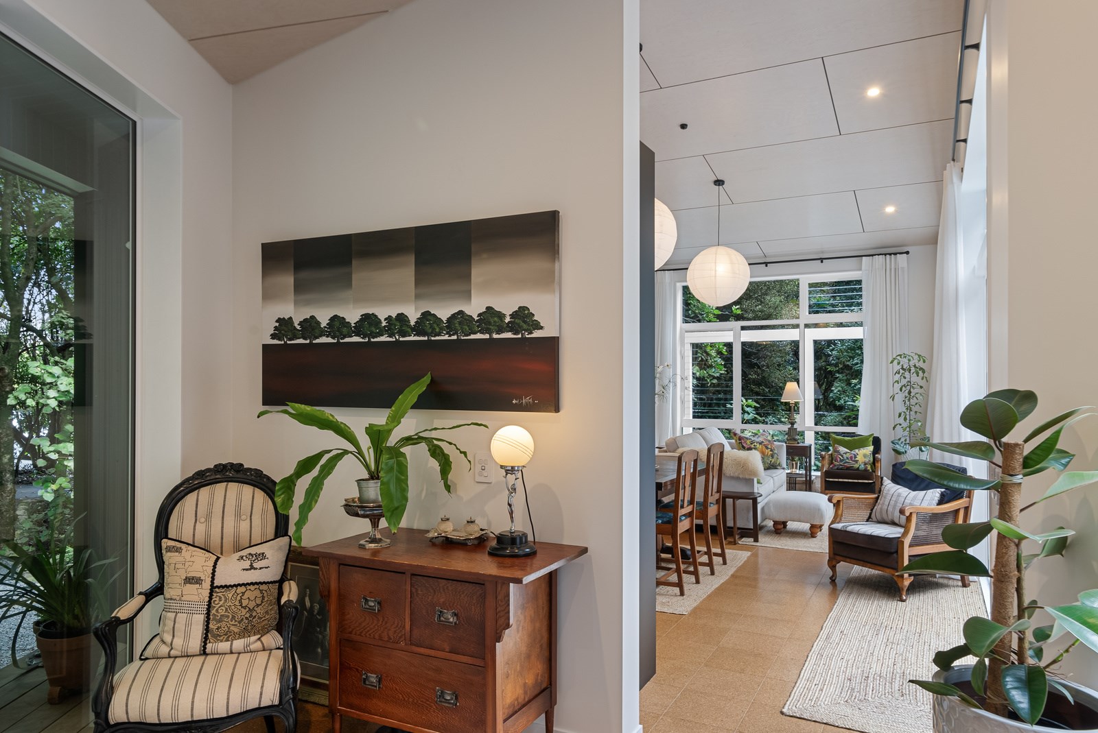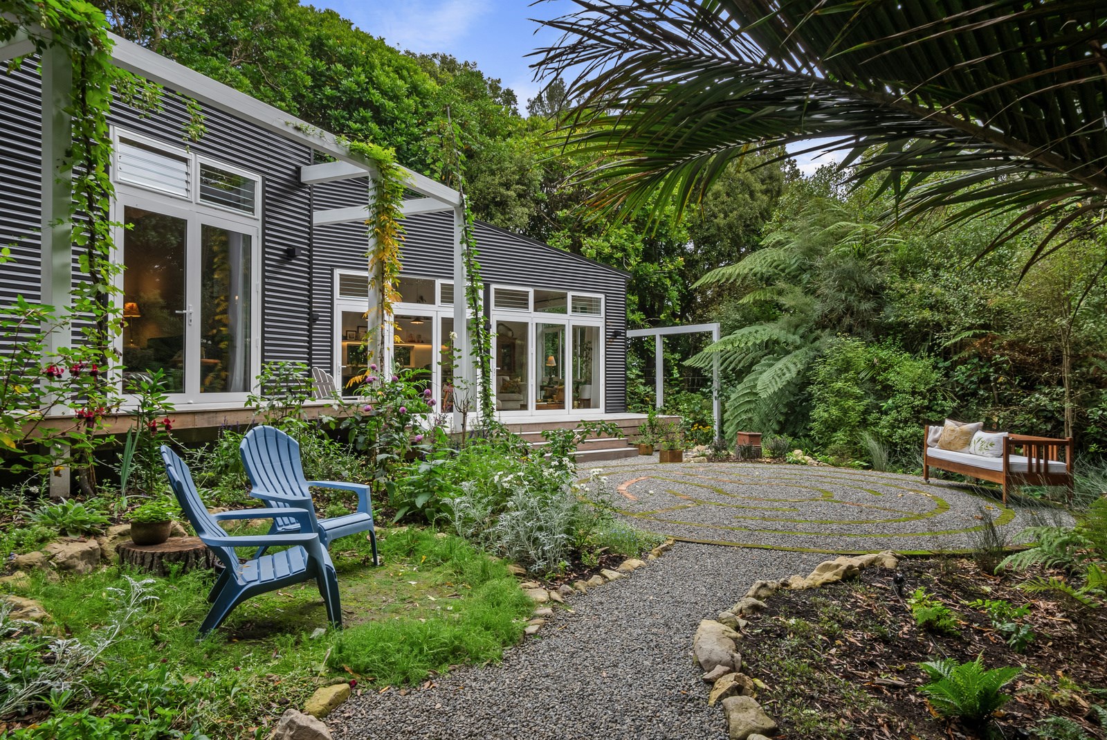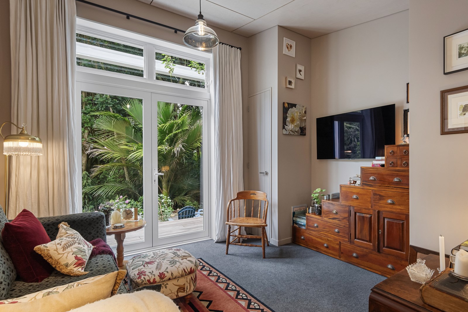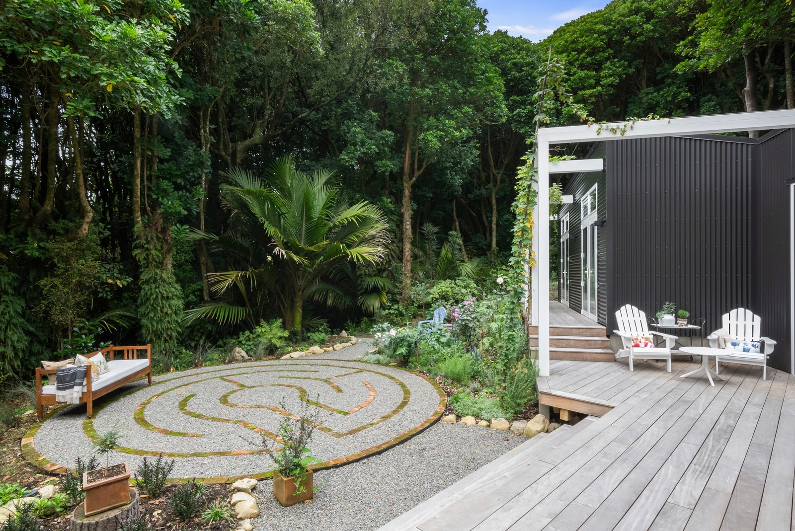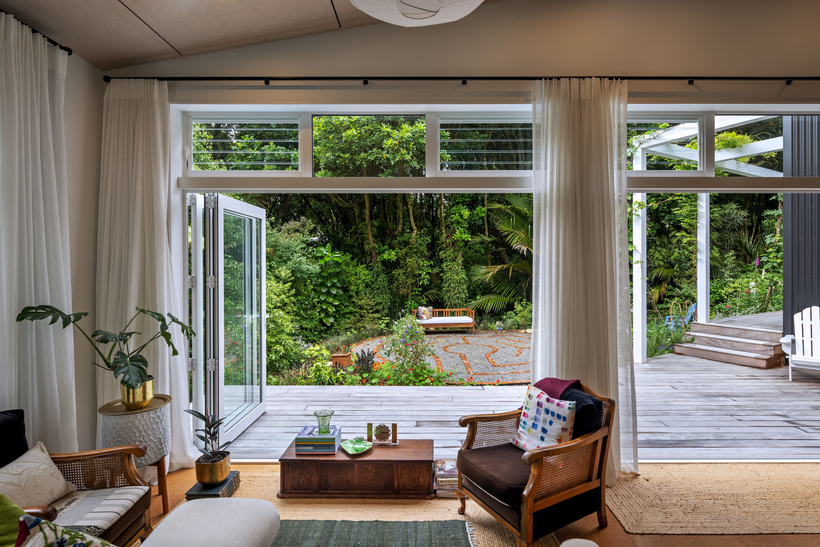 How did they manage it all in the 89sqm floorplan? First, says Tim Sunderland, owner and managing director of David Reid Homes (Kāpiti), which also operates across the Wellington region, the firm had to survey not only the land, but the tree-line, too. “The site is completely surrounded by trees, so we needed to know where was going to get sun throughout the day and over the year.” They also had to factor in a view shaft through the trees plus prized possessions the owners wanted to bring with them. The design – two linked wings at different angles and heights – covers the sunlight angle, and dark metal cladding helps settle the home into its remarkable spot. Most utilities are on the south side where towering trees flank the walkway to the entrance. The north elevation is an exemplar of how to capture sun and scenery in equal measure. The living, kitchen and dining space as well as the two bedrooms (one is used as a second sitting room), face north and a clearing, before the bush and tree canopy continue. Sunshine is plentiful enough for a pergola with a developing vine. Decking flows from the living spaces as well as the bedroom, reinforcing the home’s connection to nature. The kitchen winds around the wall of the living-dining area with a rectangular window that frames the trees. Windows and doors fill the north and west walls.