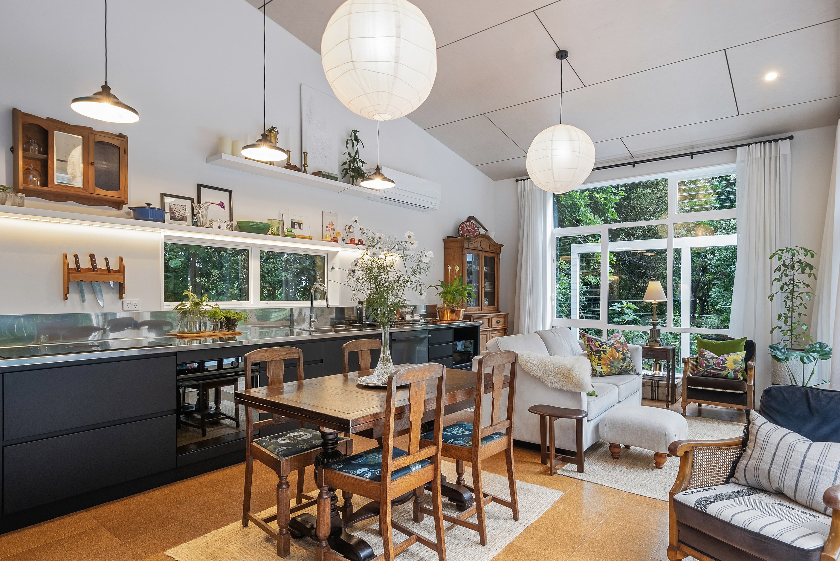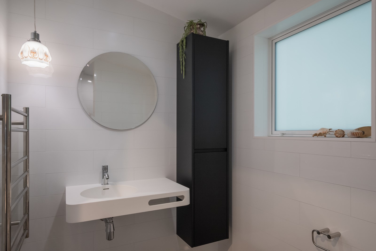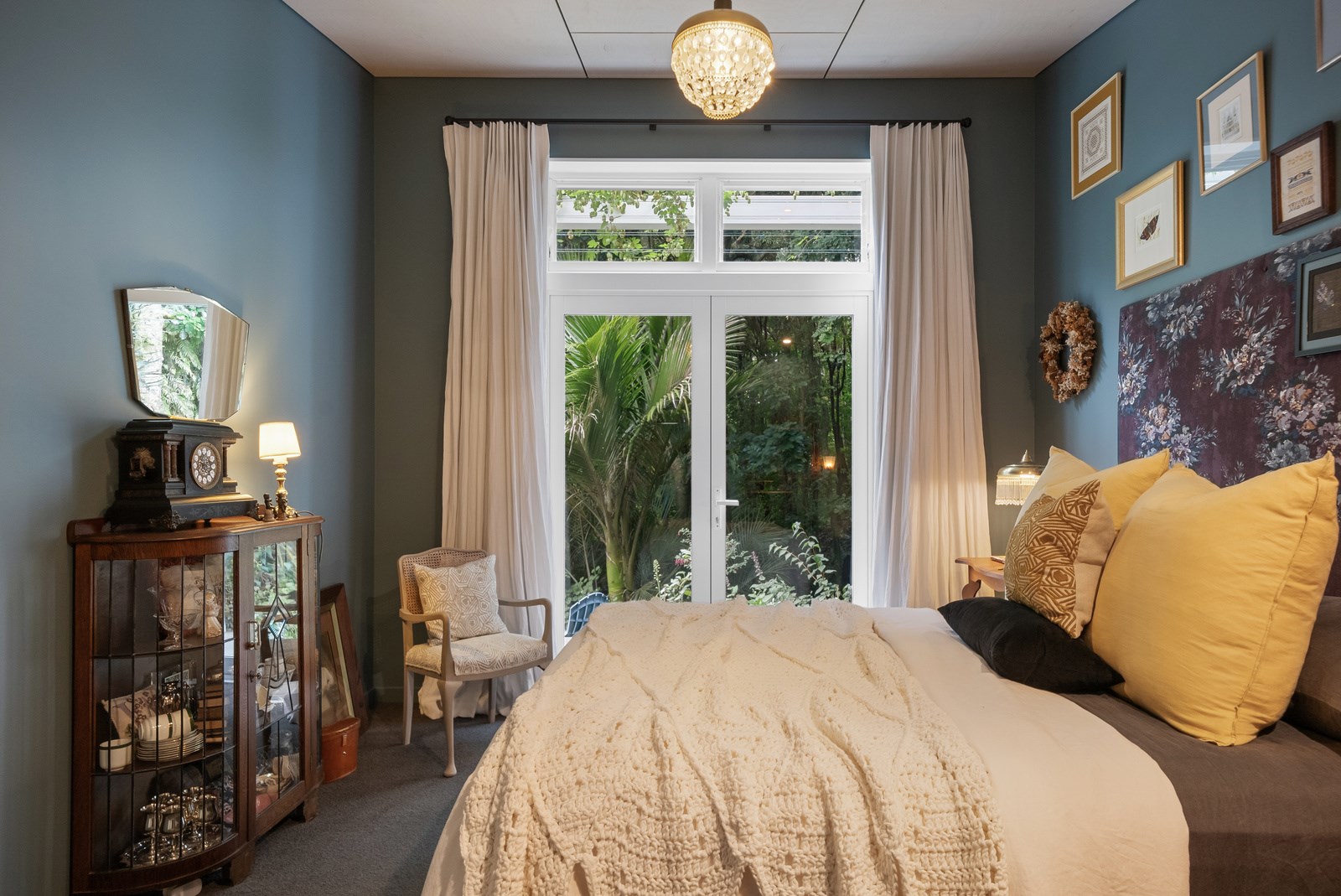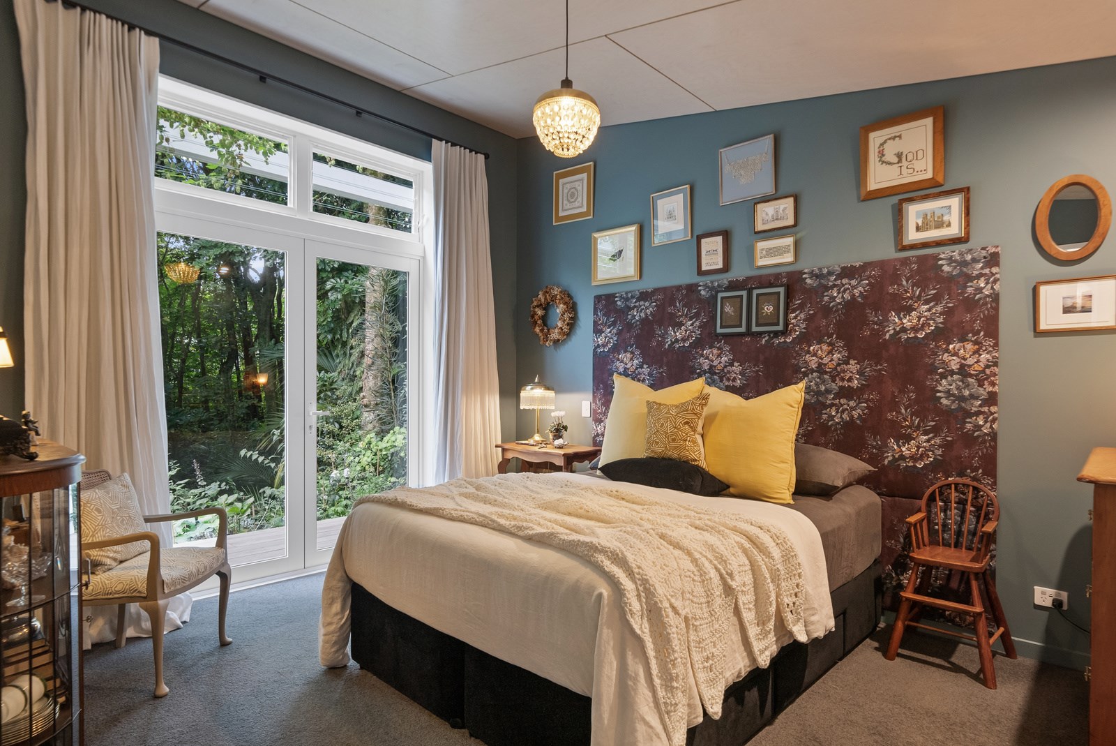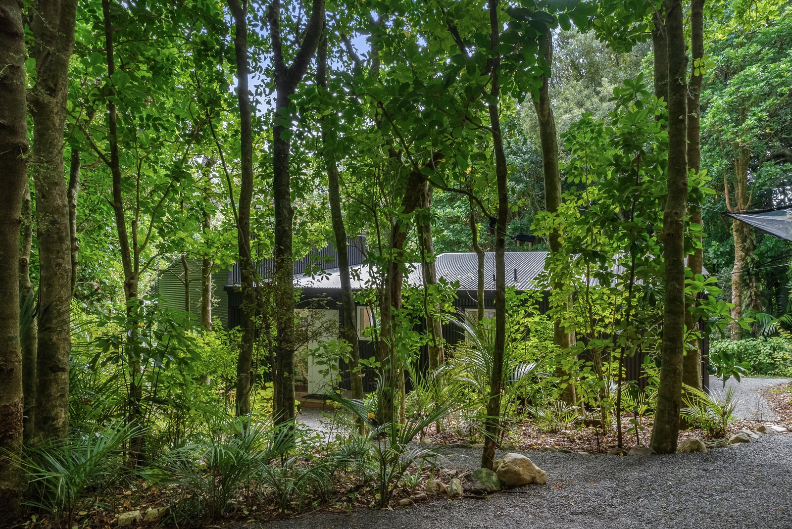 How did they manage it all in the 89sqm floorplan? First, says Tim Sunderland, owner and managing director of David Reid Homes (Kāpiti), which also operates across the Wellington region, the firm had to survey not only the land, but the tree-line, too. “The site is completely surrounded by trees, so we needed to know where was going to get sun throughout the day and over the year.” They also had to factor in a view shaft through the trees plus prized possessions the owners wanted to bring with them. The design – two linked wings at different angles and heights – covers the sunlight angle, and dark metal cladding helps settle the home into its remarkable spot. Most utilities are on the south side where towering trees flank the walkway to the entrance. The north elevation is an exemplar of how to capture sun and scenery in equal measure. The living, kitchen and dining space as well as the two bedrooms (one is used as a second sitting room), face north and a clearing, before the bush and tree canopy continue. Sunshine is plentiful enough for a pergola with a developing vine. Decking flows from the living spaces as well as the bedroom, reinforcing the home’s connection to nature. The kitchen winds around the wall of the living-dining area with a rectangular window that frames the trees. Windows and doors fill the north and west walls.