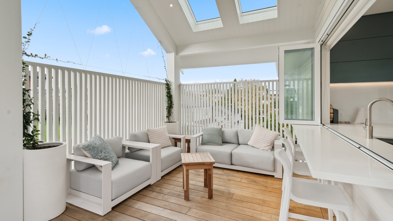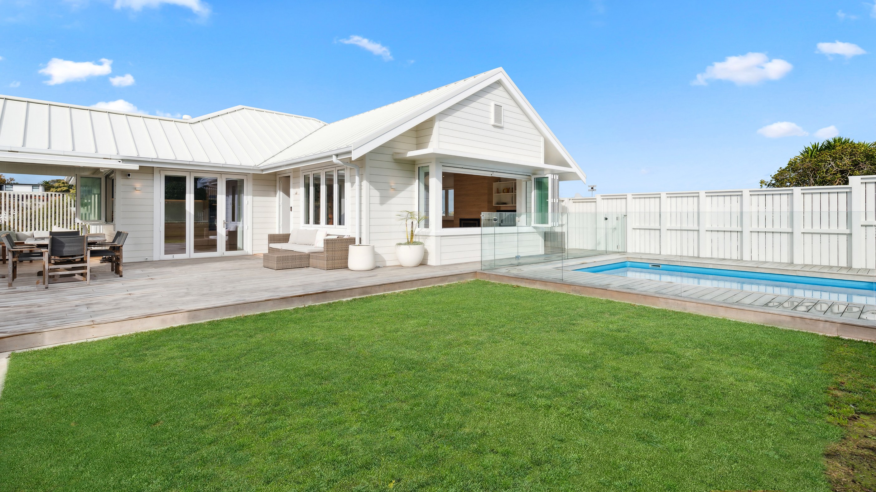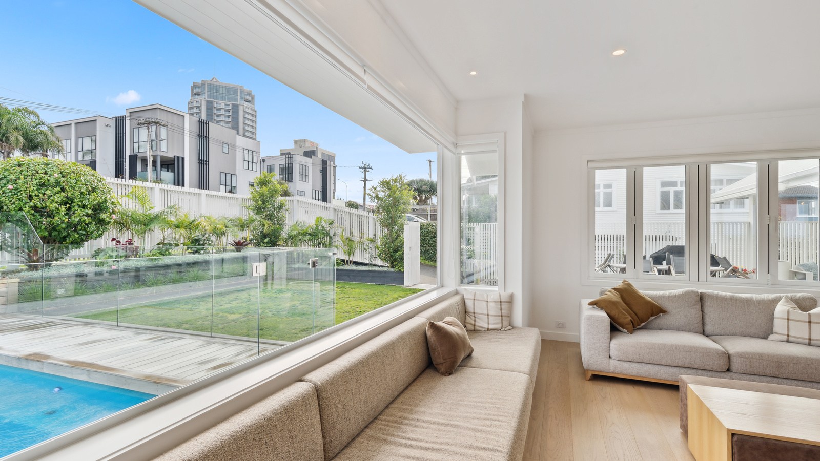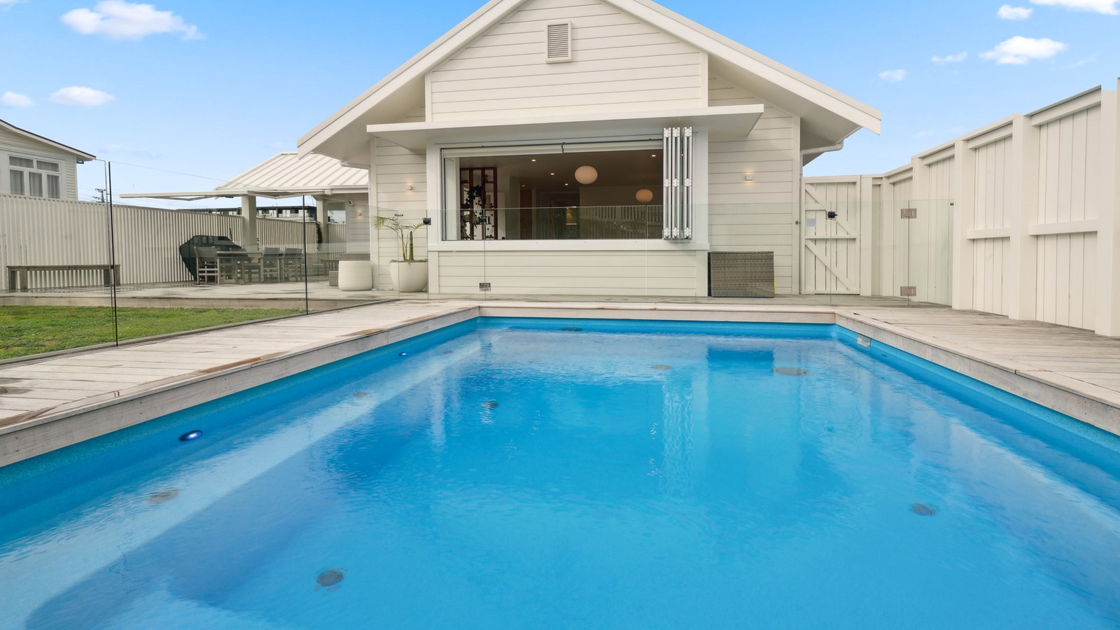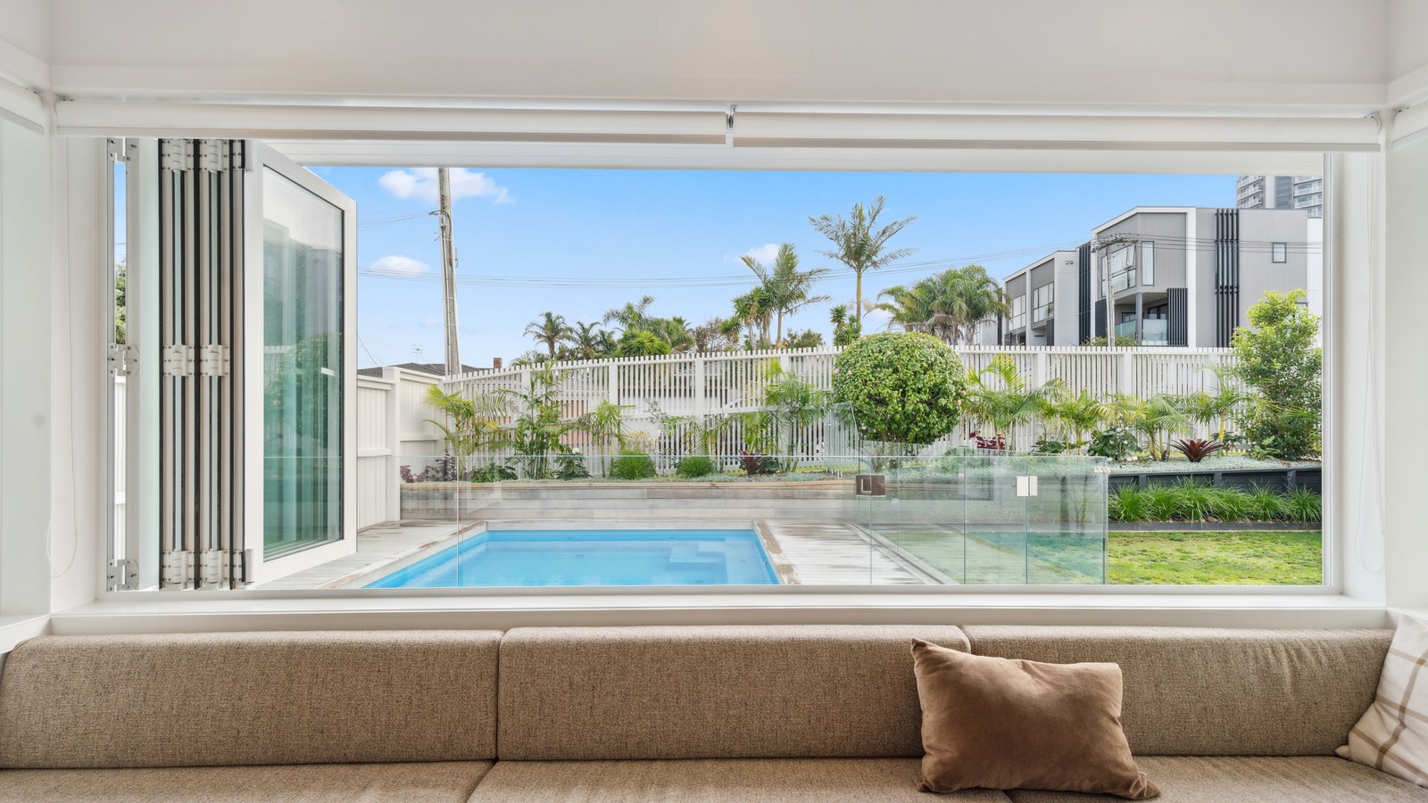 Meanwhile, downstairs, expansive timber floors provide the base for open-plan living and dining areas that flow naturally into the stylish kitchen. Sliding windows open onto a covered breakfast bar area, enhanced by glazed louvres and a retractable umbrella — a space ideal for a family barbecue or Friday evening drinks with friends. Downstairs, the thoughtful design aims to provide younger family members with their own domain — comprising bedrooms, bathroom and a dedicated lounge. Step outside to discover a pristine back garden complemented by a sparkling pool that anchors the inviting outdoor spaces of a home built with just about everything in mind.