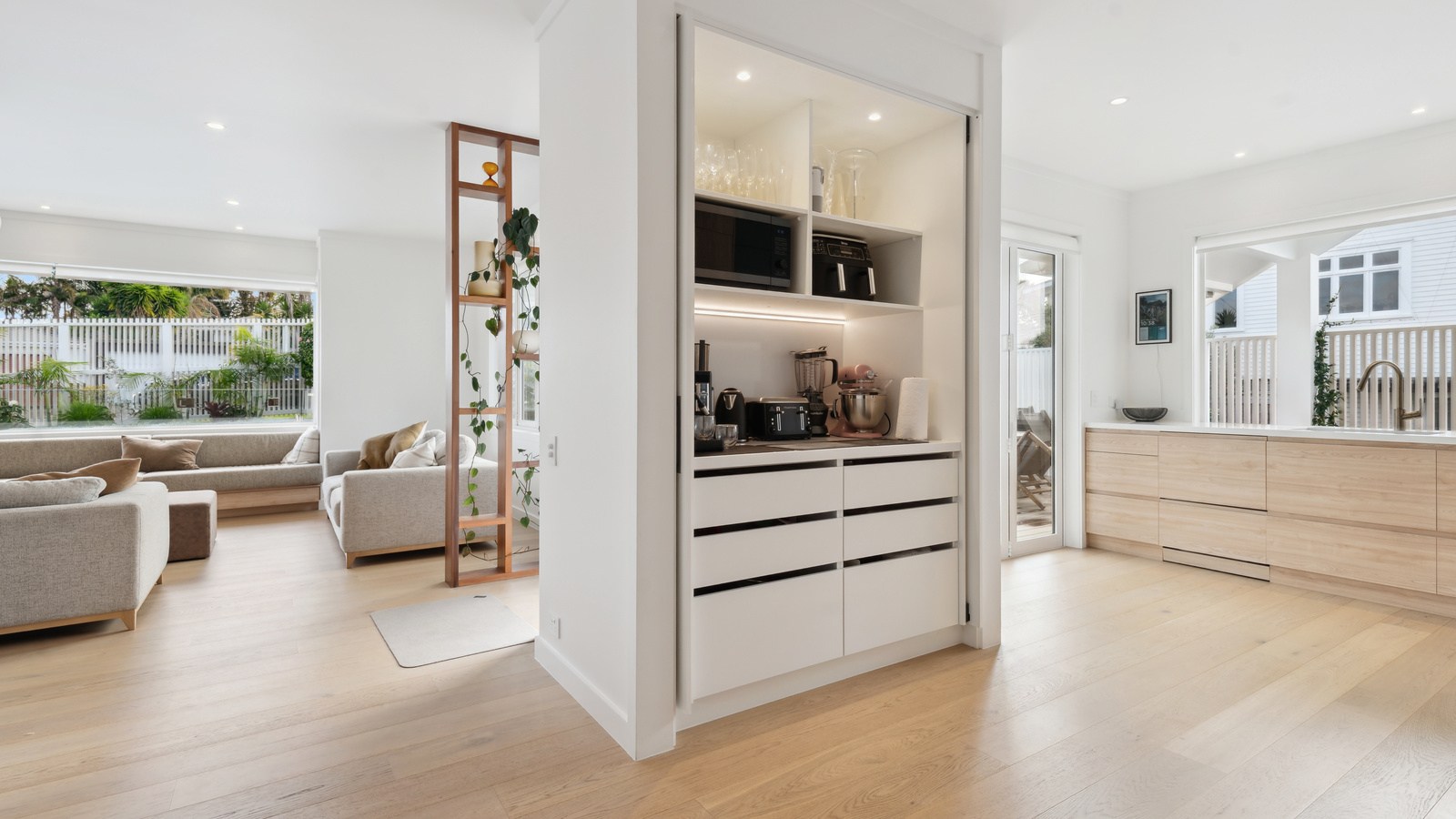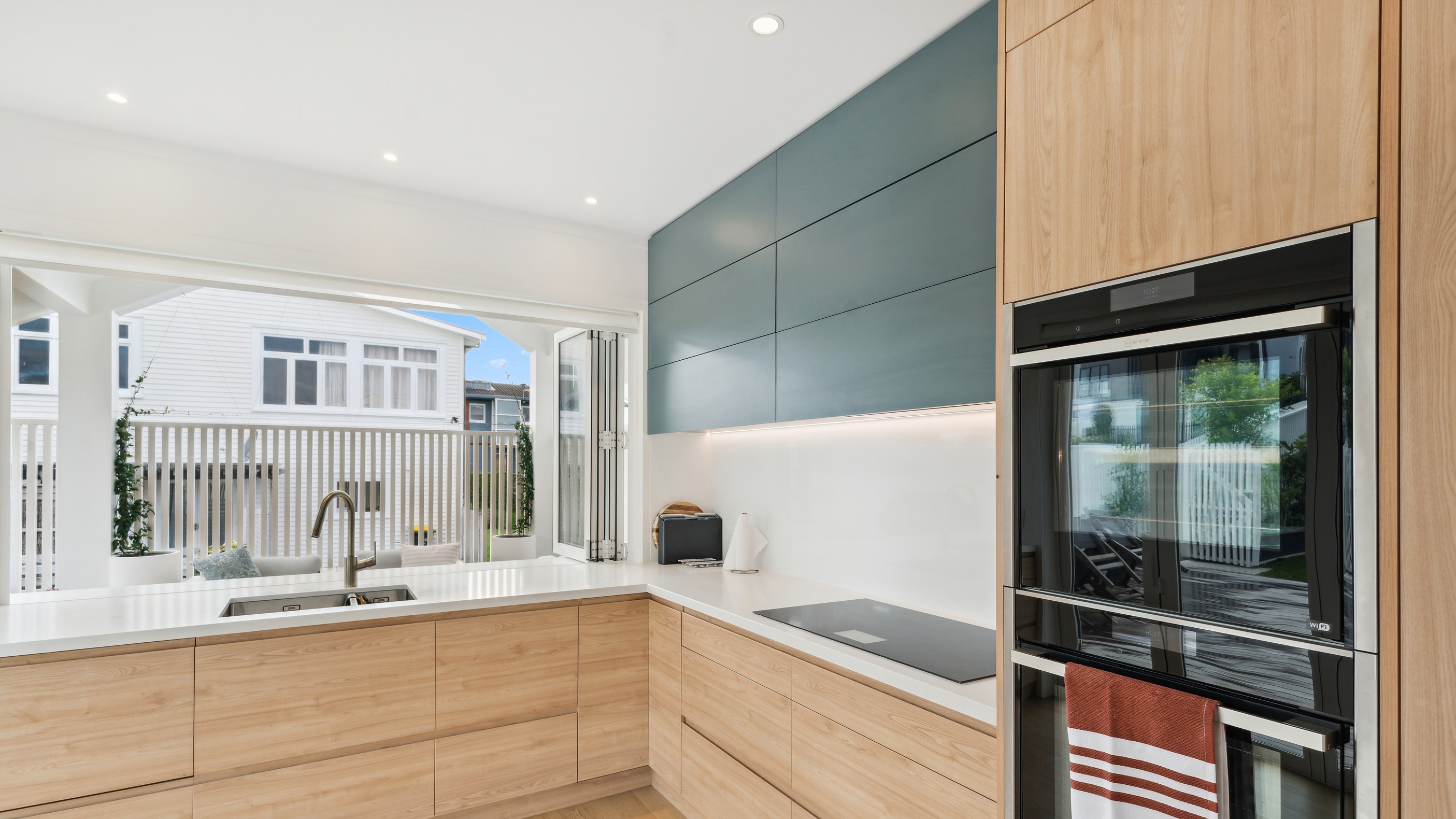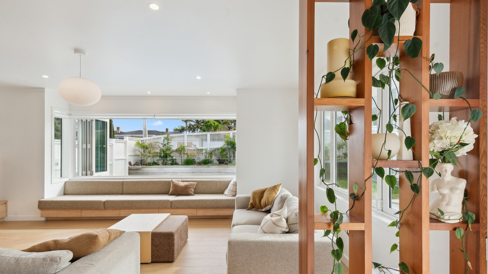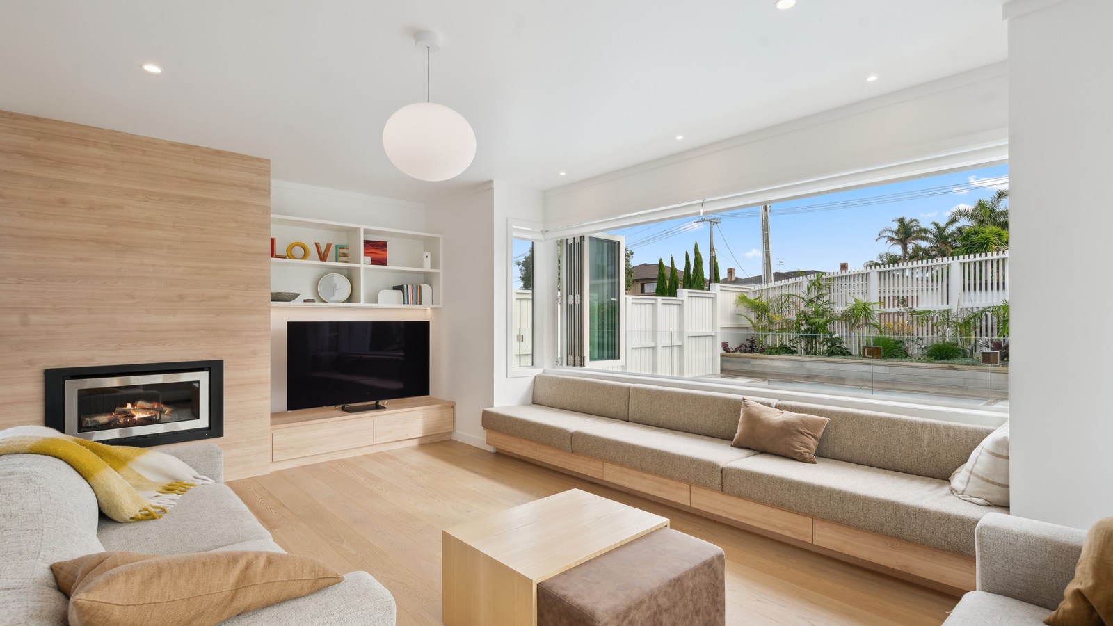 Meanwhile, downstairs, expansive timber floors provide the base for open-plan living and dining areas that flow naturally into the stylish kitchen. Sliding windows open onto a covered breakfast bar area, enhanced by glazed louvres and a retractable umbrella — a space ideal for a family barbecue or Friday evening drinks with friends. Downstairs, the thoughtful design aims to provide younger family members with their own domain — comprising bedrooms, bathroom and a dedicated lounge. Step outside to discover a pristine back garden complemented by a sparkling pool that anchors the inviting outdoor spaces of a home built with just about everything in mind.