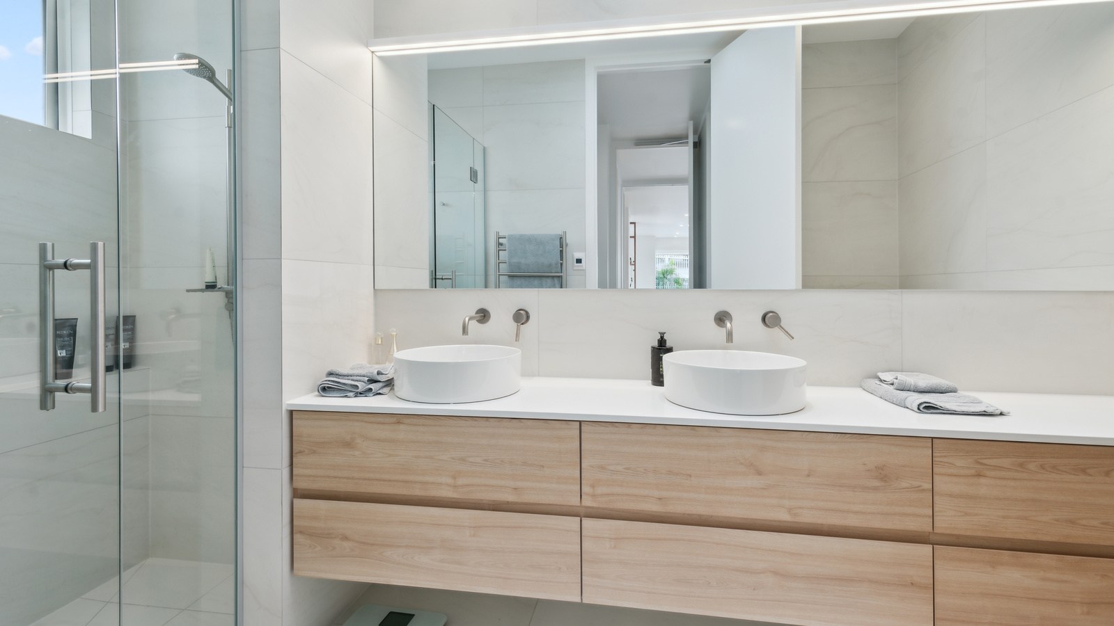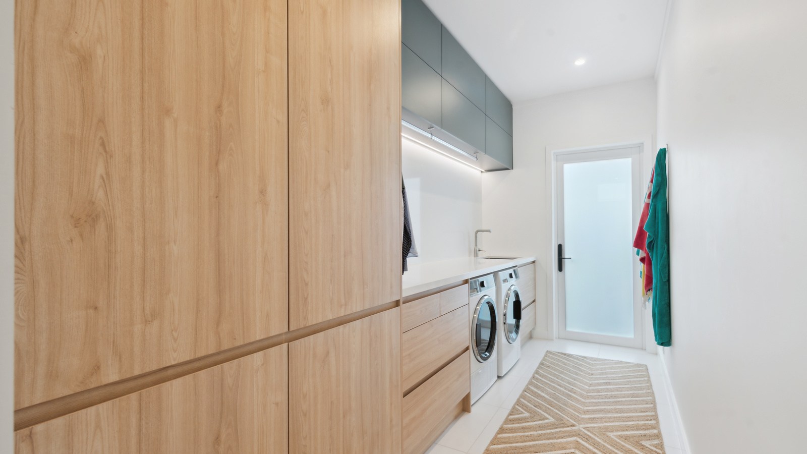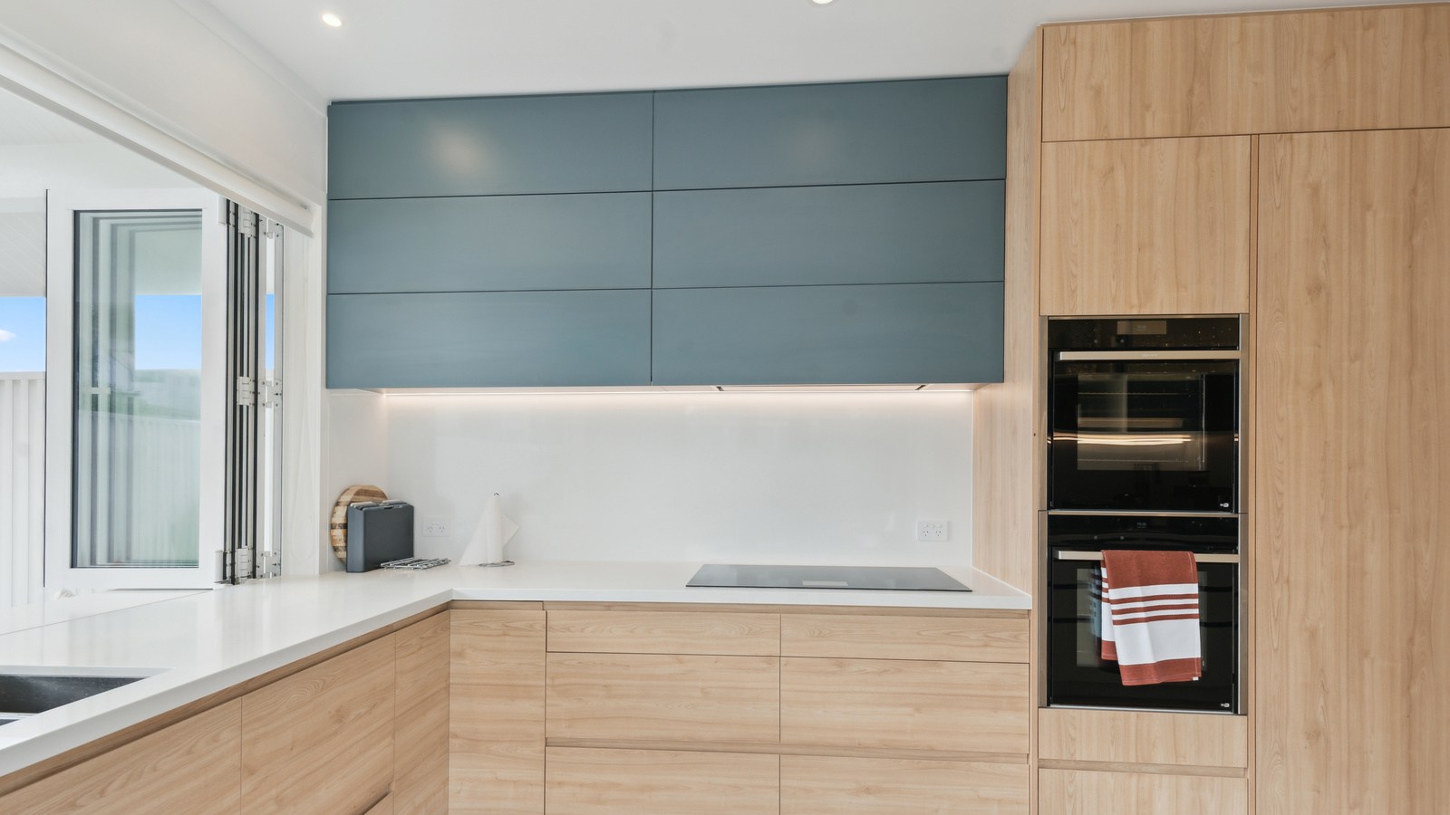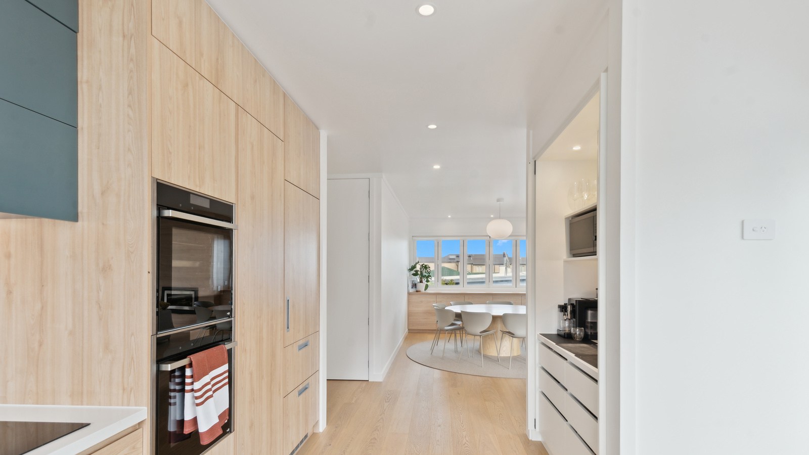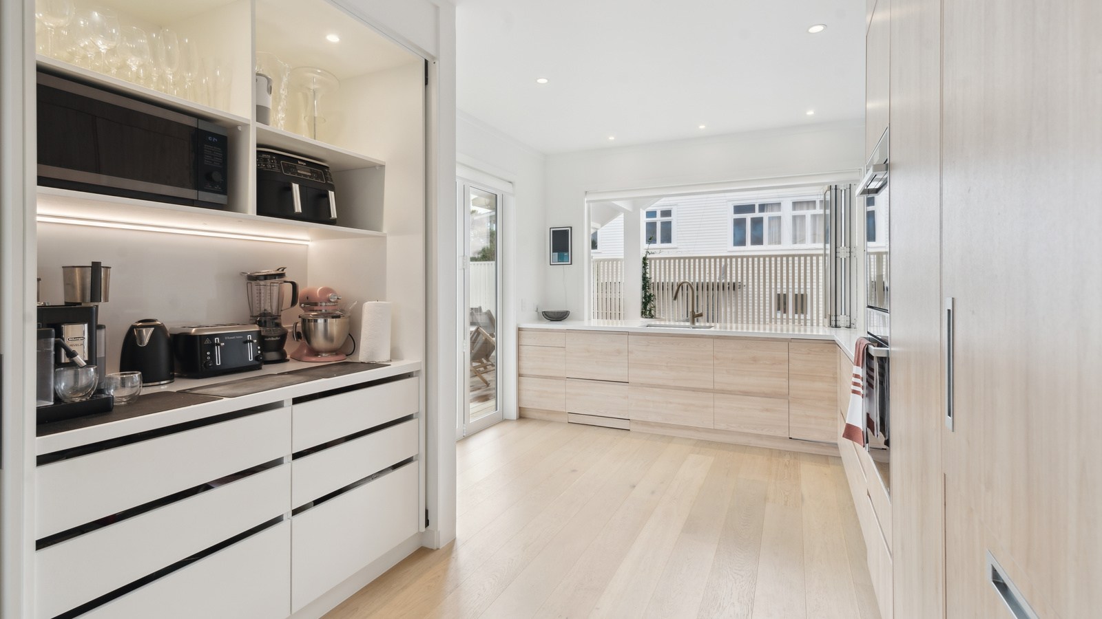 Meanwhile, downstairs, expansive timber floors provide the base for open-plan living and dining areas that flow naturally into the stylish kitchen. Sliding windows open onto a covered breakfast bar area, enhanced by glazed louvres and a retractable umbrella — a space ideal for a family barbecue or Friday evening drinks with friends. Downstairs, the thoughtful design aims to provide younger family members with their own domain — comprising bedrooms, bathroom and a dedicated lounge. Step outside to discover a pristine back garden complemented by a sparkling pool that anchors the inviting outdoor spaces of a home built with just about everything in mind.