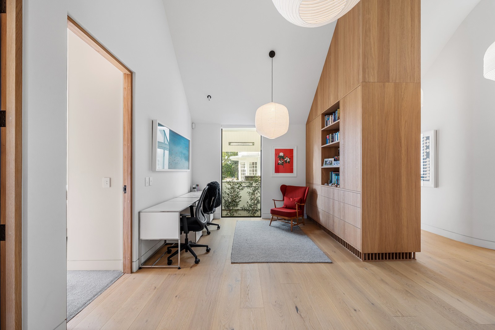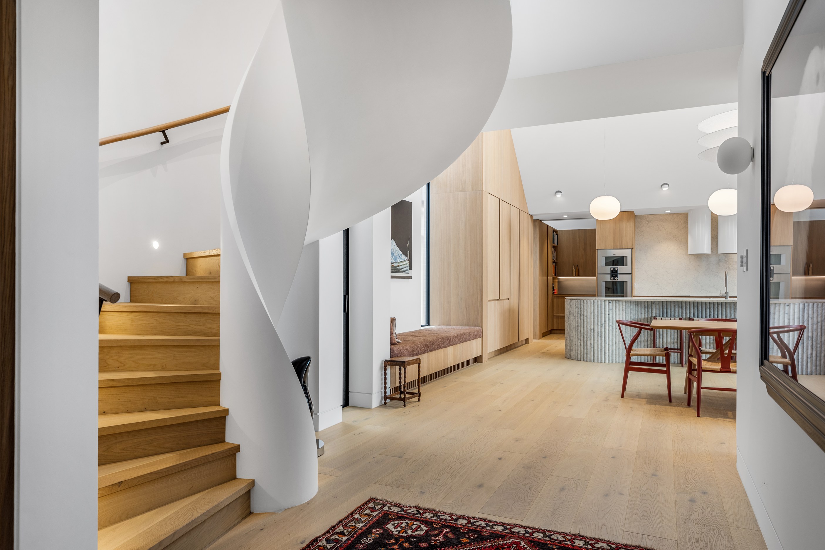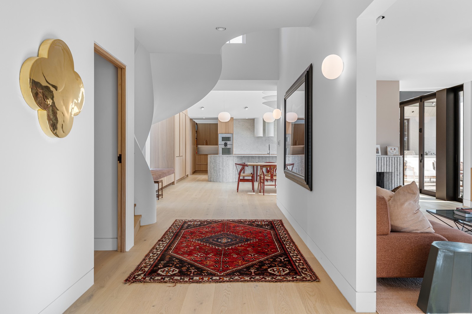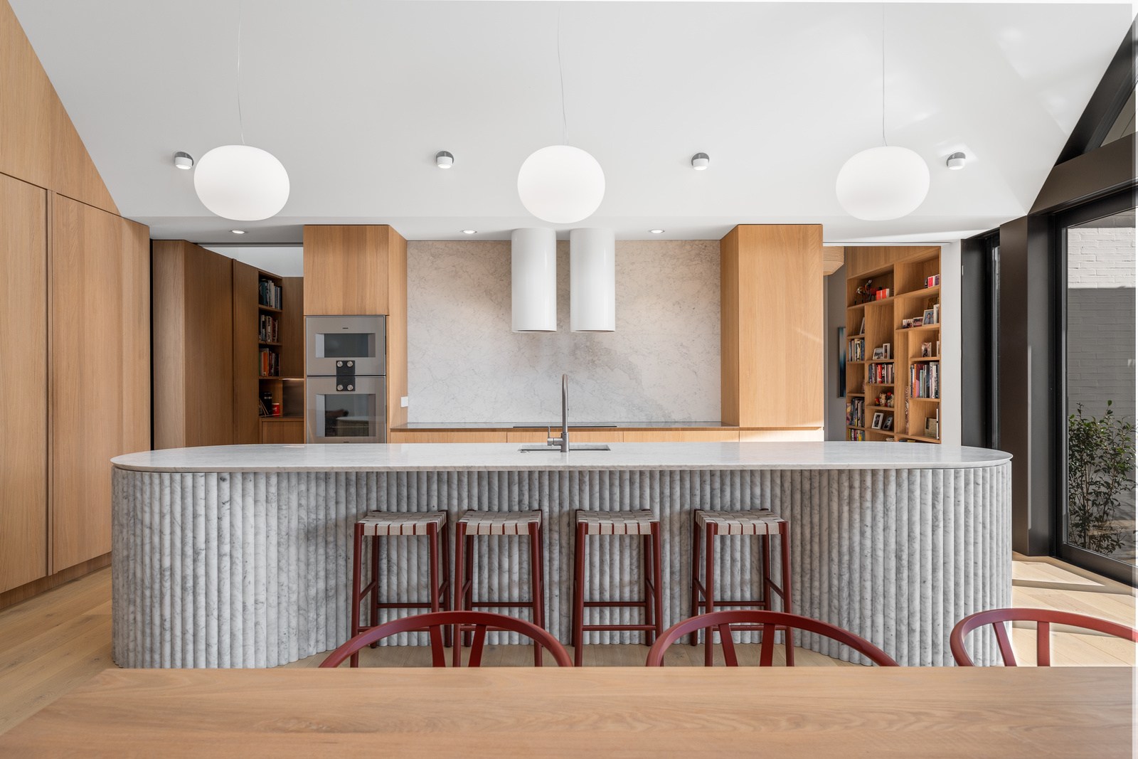 Just look at the twisting staircase that’s as much art as a means to the upper floor, the light flooding through skylights and floor-to-pitched ceiling glazing, and the kitchen with its marbled and fluted curved island. Sustainability measures have also been installed: improved insulation, rainwater collection, solar panels, in-slab water heating and recessed heaters in the loggia ceiling, which help ensure comfort and the house’s longer-term performance. This 405sqm home with four bedrooms, three bathrooms and two living rooms is an exemplar of how to flawlessly merge the past and present. That’s what happens when award winning design is carried out by builders at the top of their game.