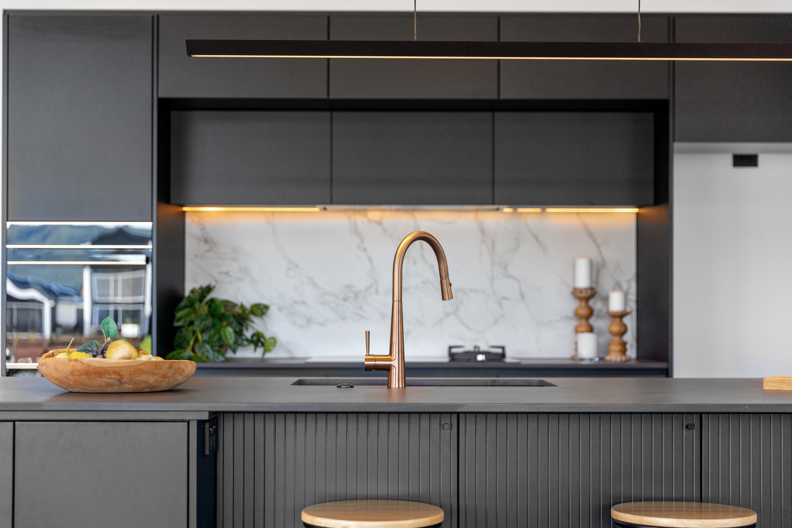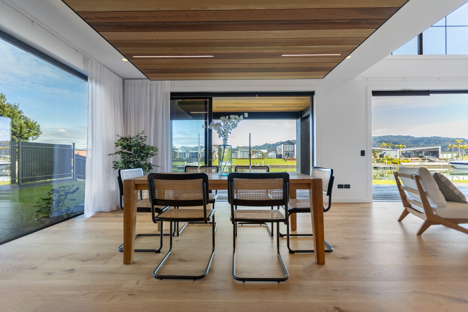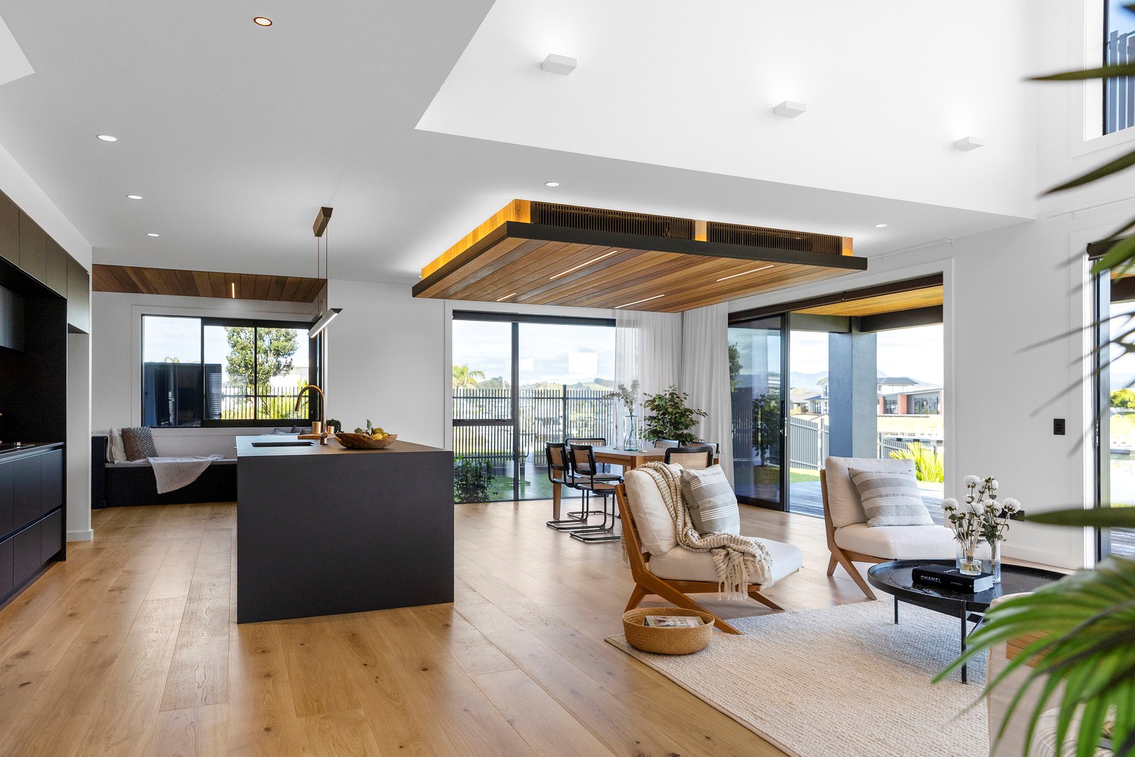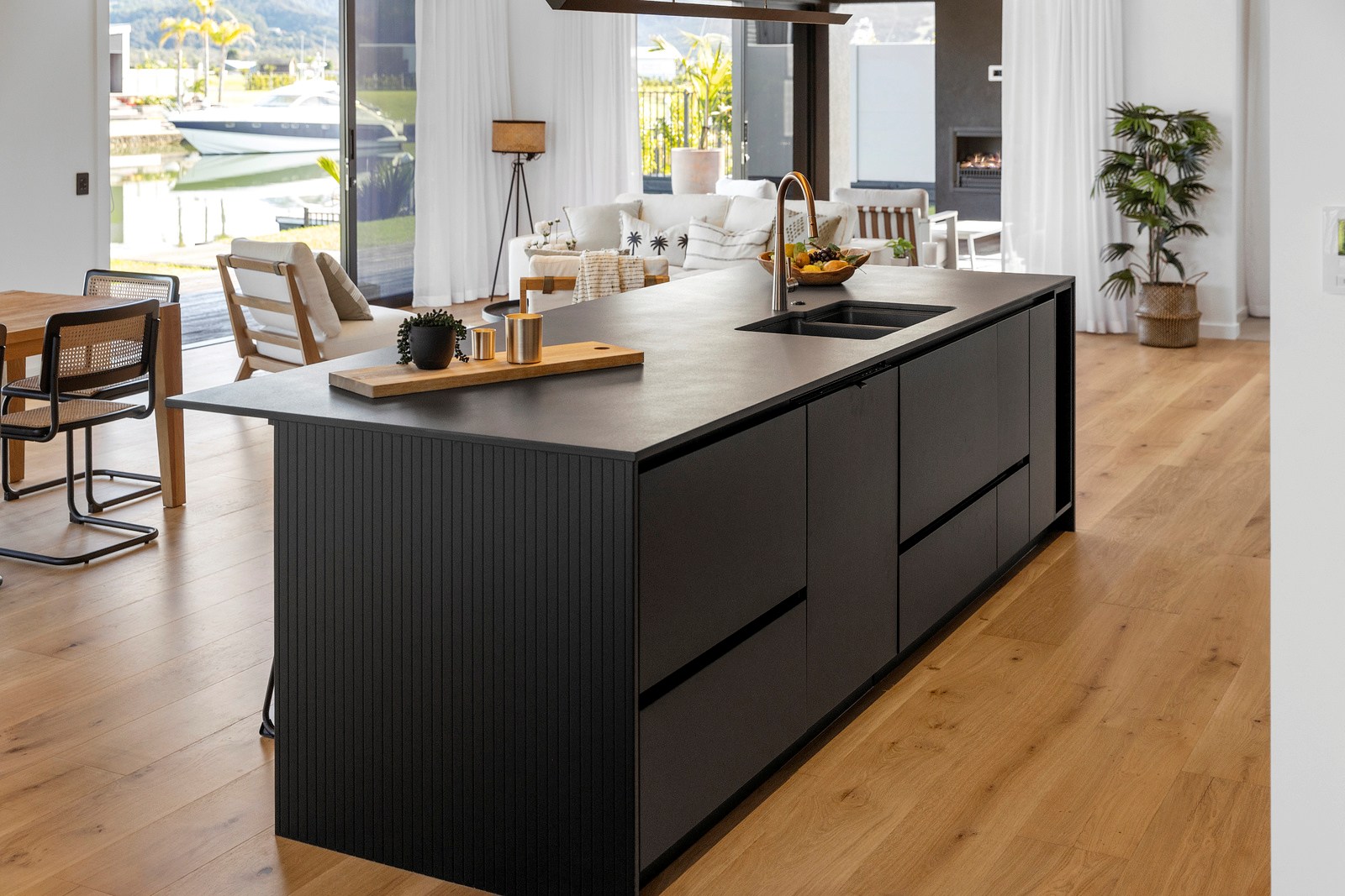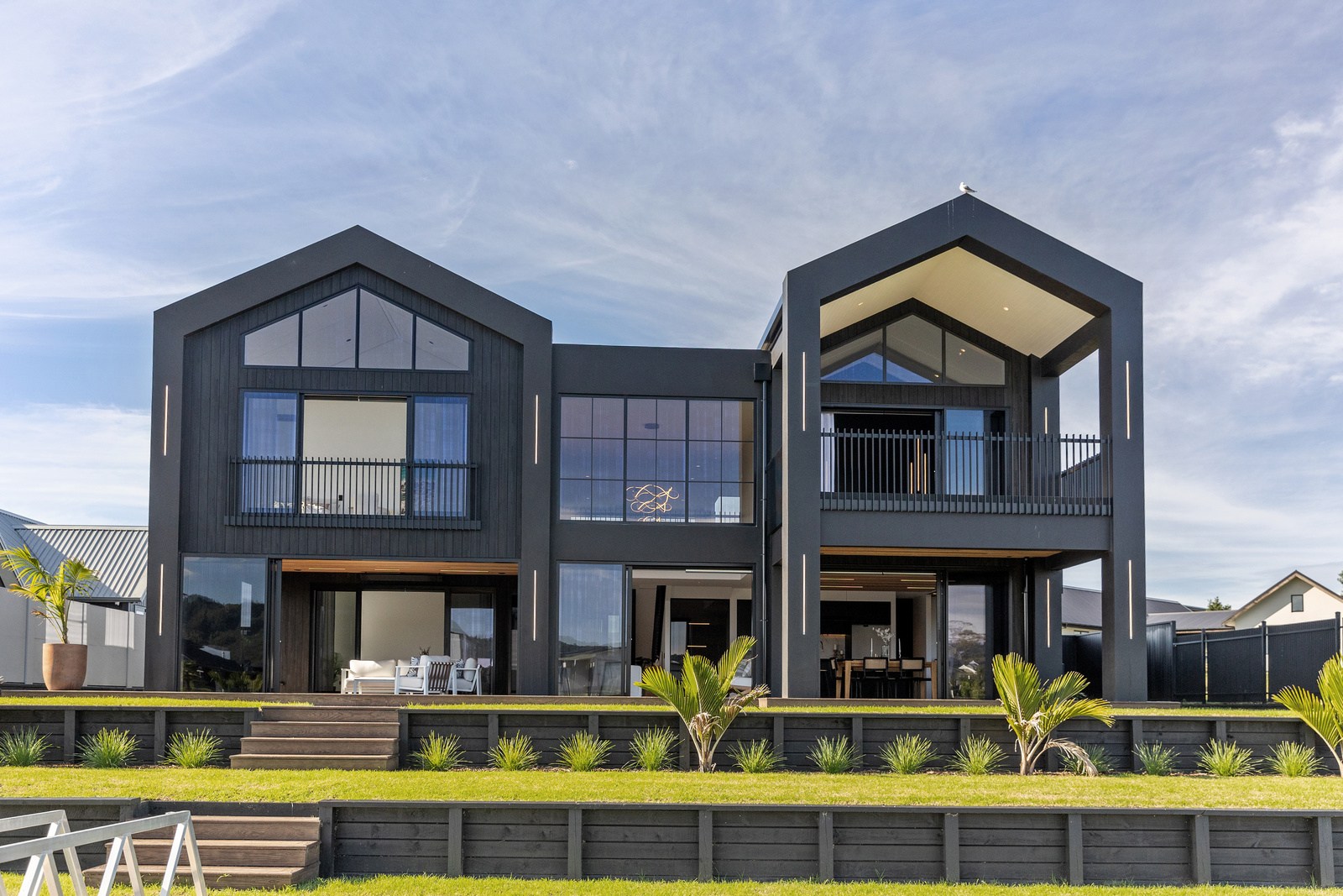 A prime canal-front section deserved an epic home. The result? This 413sqm four-bedroom house that matches the quality of the site in every way. Sea and hill views, top-class materials, designer features, special additions (such as a wine cellar) and rarely found grandeur can all be enjoyed in this home. The exterior, with twin gables and a horizontal link, and clad in black vertical timber, brick and timber screening, is a real showstopper on the waterfront. Inside, however, it’s all warmth, light, natural materials and carefully curated high-end details such as chandeliers and dark kitchen cabinetry.