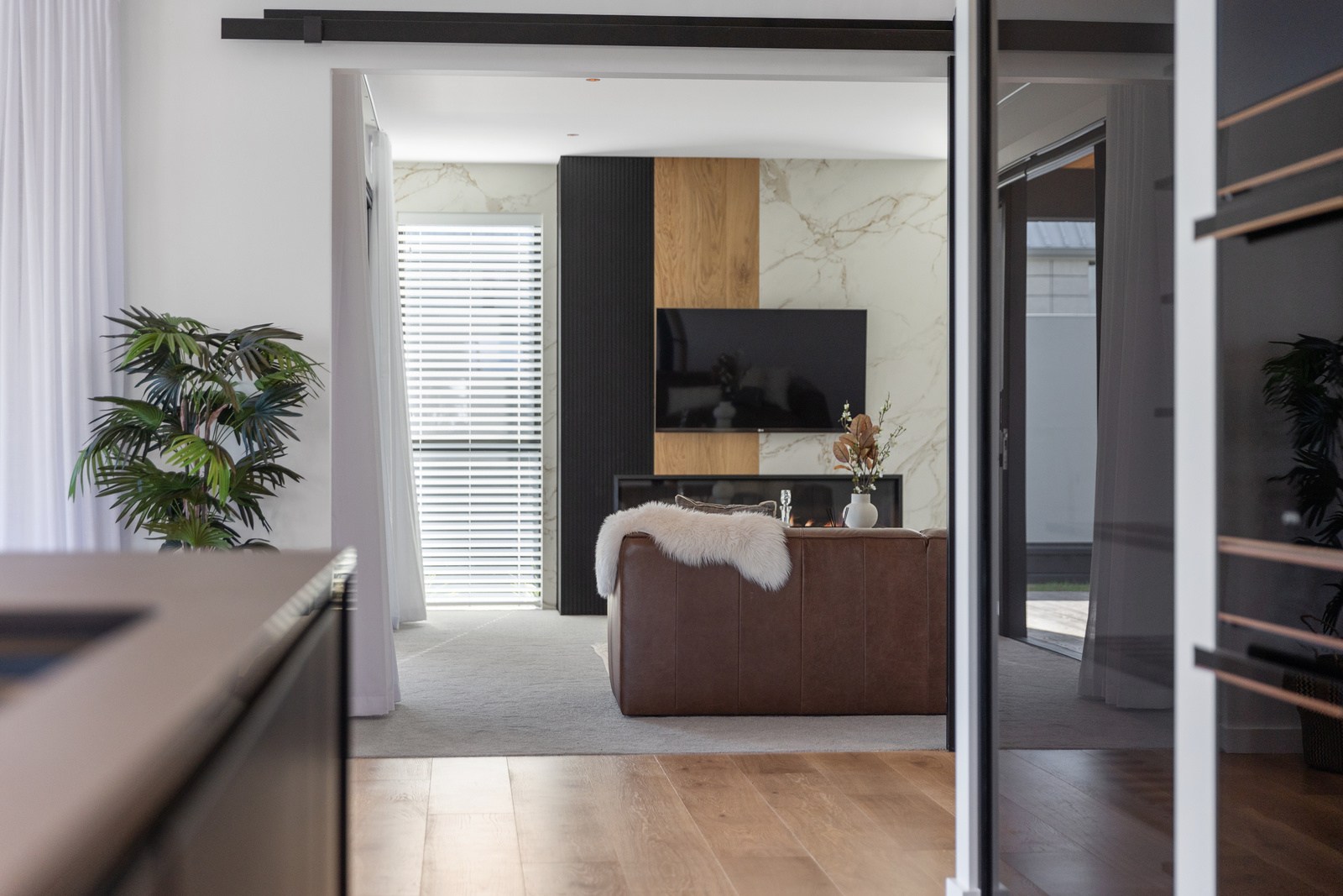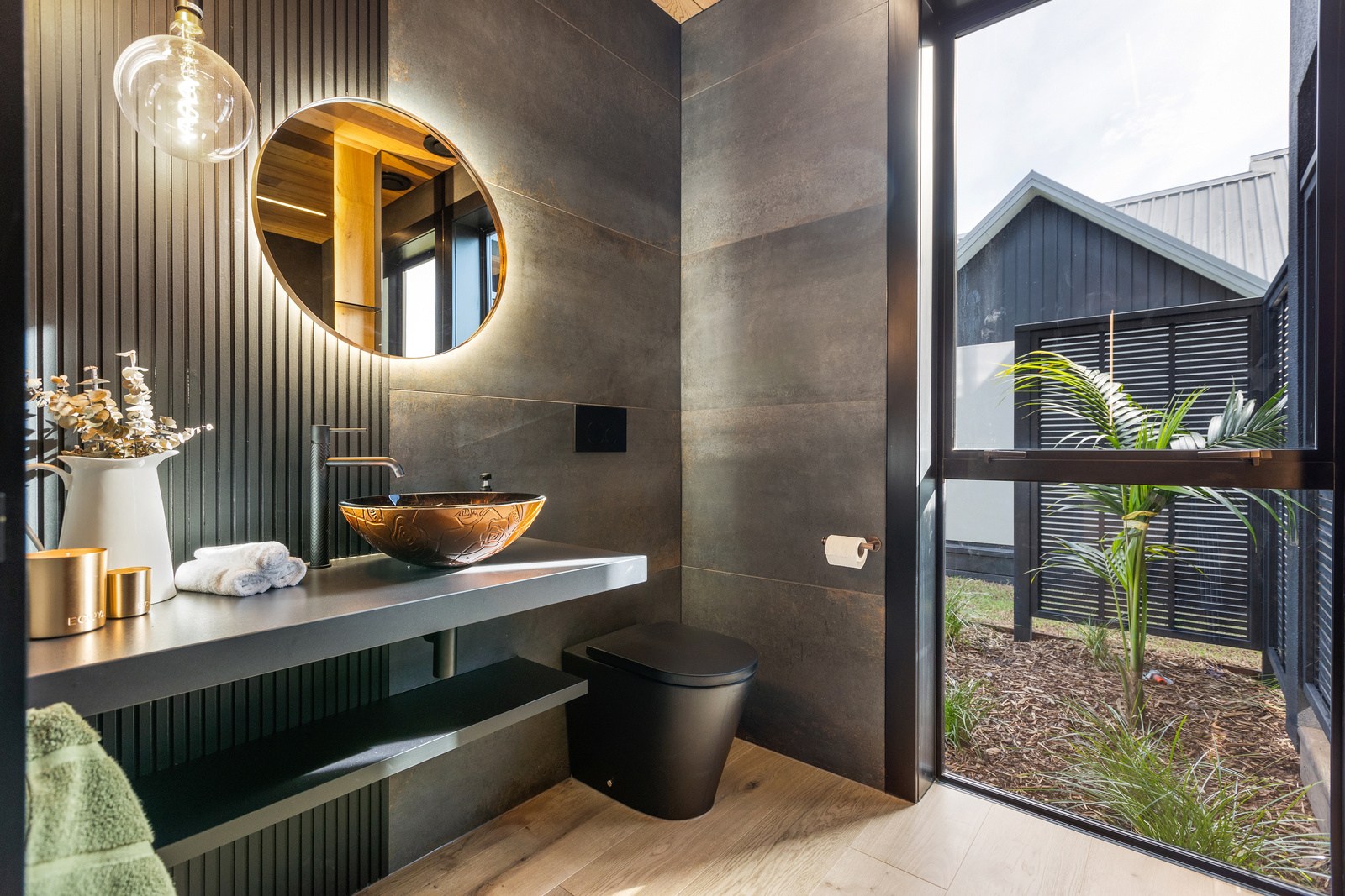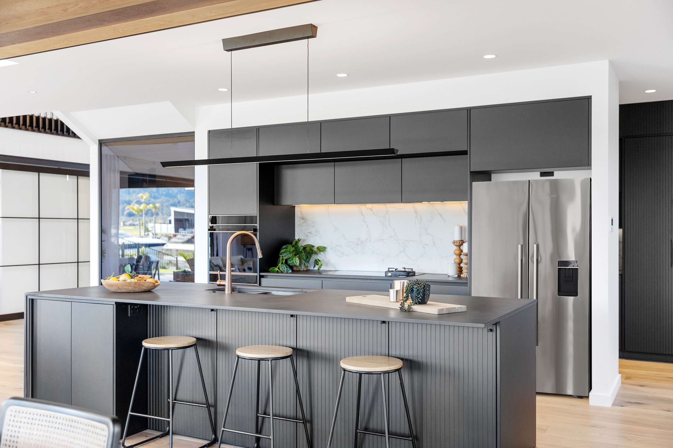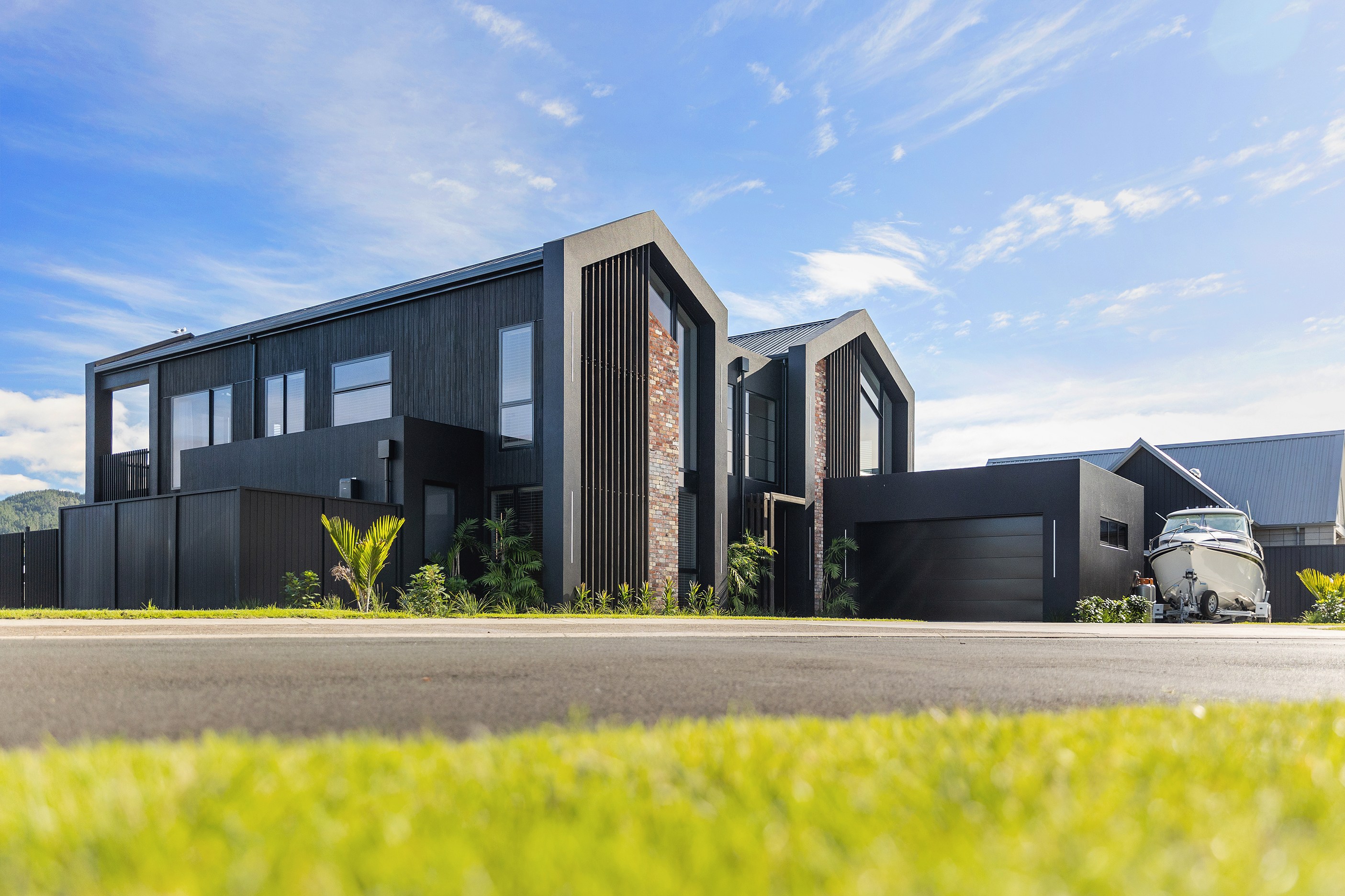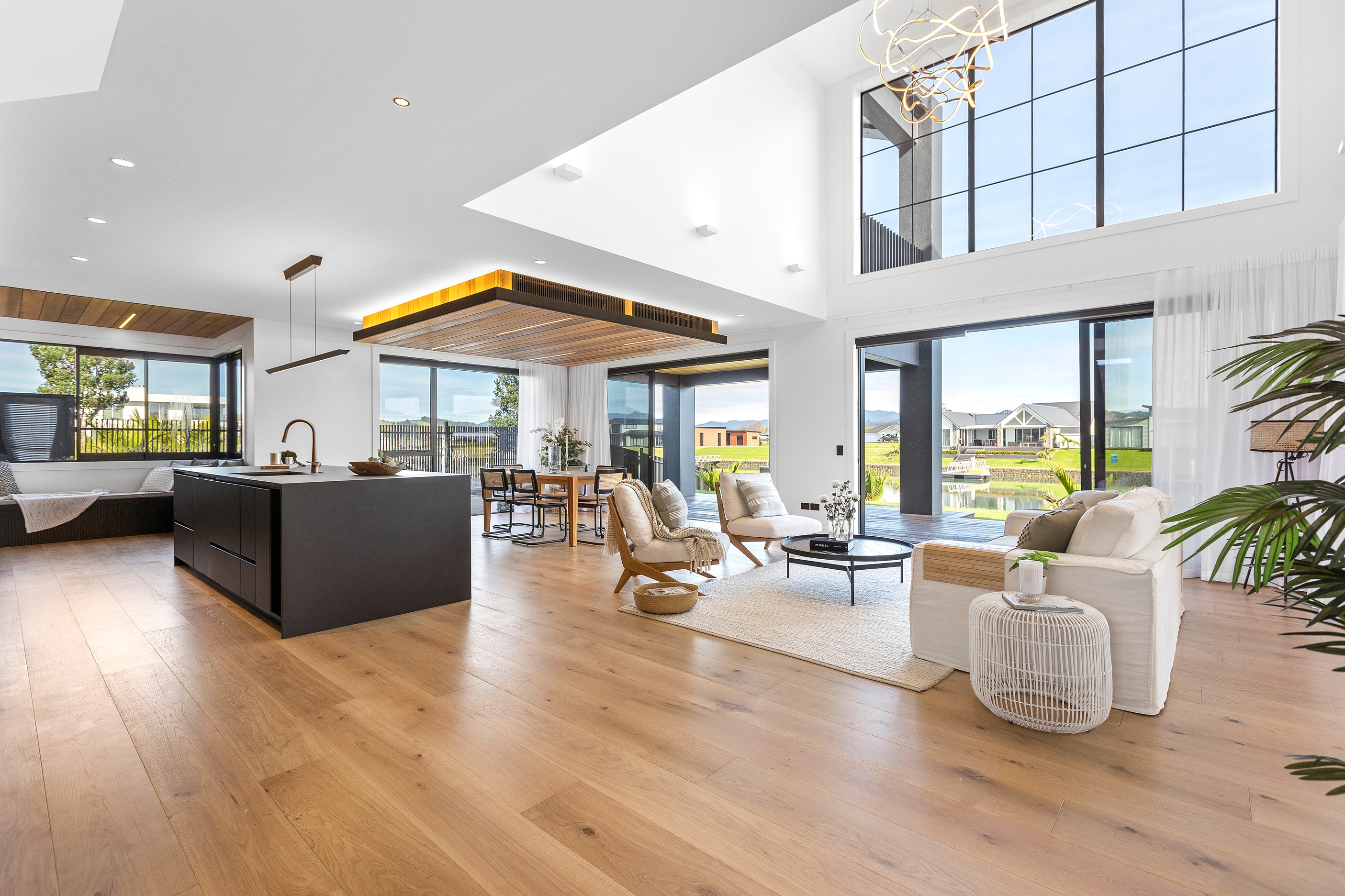 A prime canal-front section deserved an epic home. The result? This 413sqm four-bedroom house that matches the quality of the site in every way. Sea and hill views, top-class materials, designer features, special additions (such as a wine cellar) and rarely found grandeur can all be enjoyed in this home. The exterior, with twin gables and a horizontal link, and clad in black vertical timber, brick and timber screening, is a real showstopper on the waterfront. Inside, however, it’s all warmth, light, natural materials and carefully curated high-end details such as chandeliers and dark kitchen cabinetry.