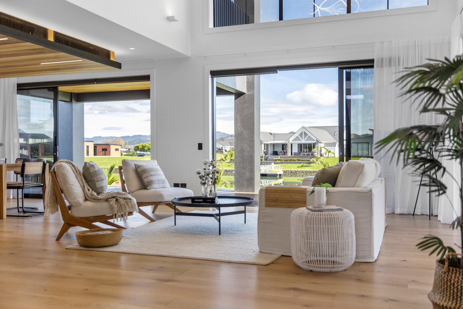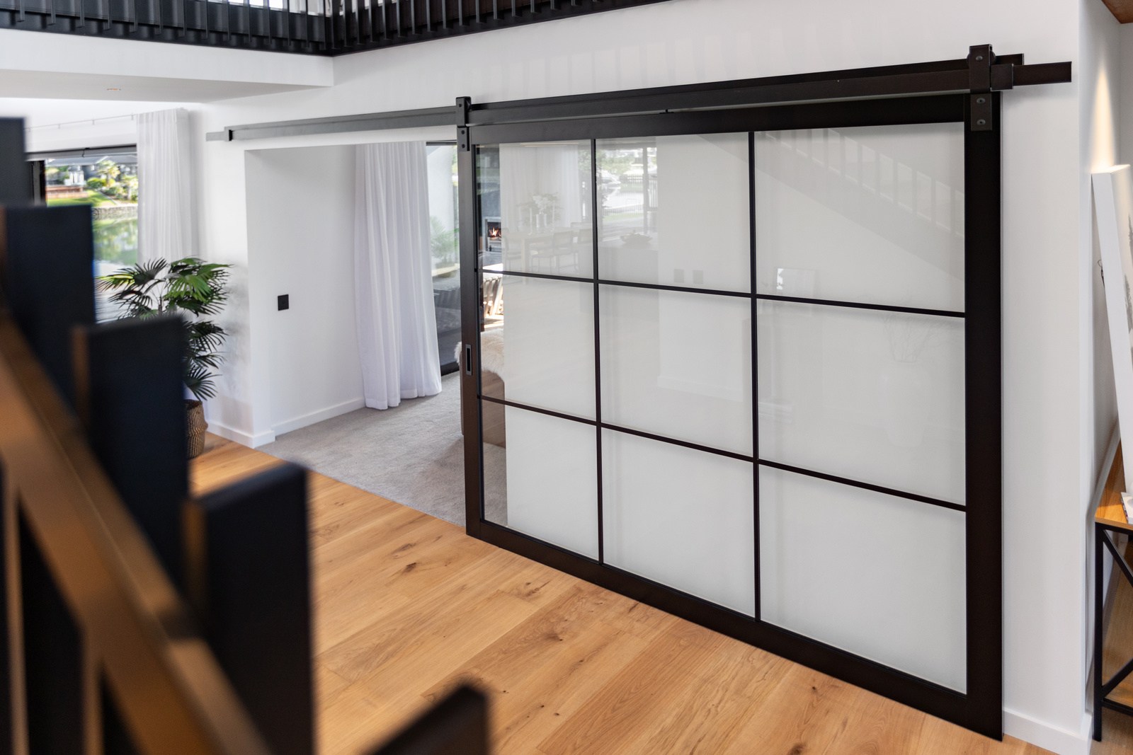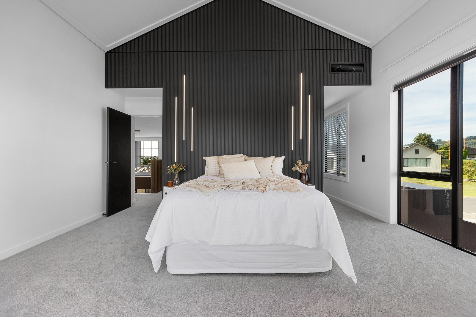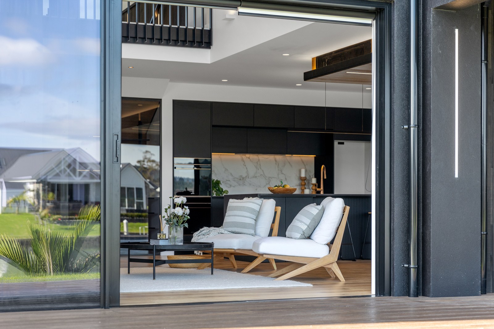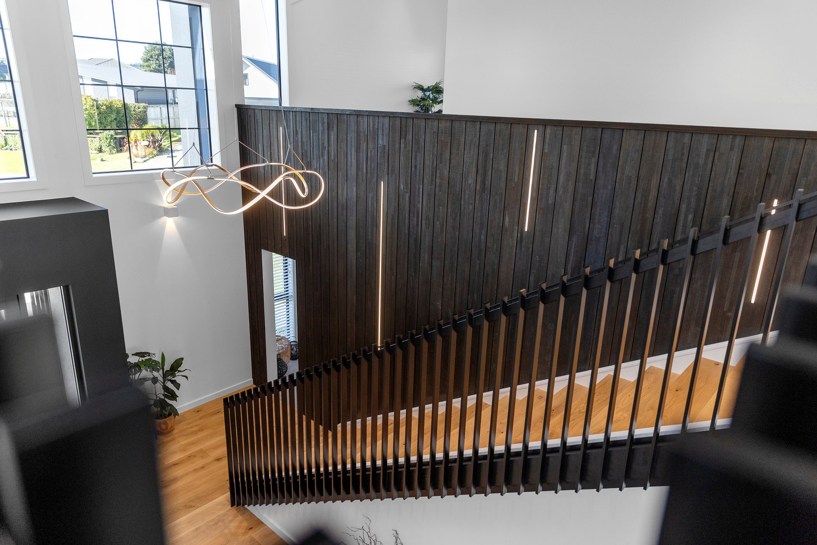 A prime canal-front section deserved an epic home. The result? This 413sqm four-bedroom house that matches the quality of the site in every way. Sea and hill views, top-class materials, designer features, special additions (such as a wine cellar) and rarely found grandeur can all be enjoyed in this home. The exterior, with twin gables and a horizontal link, and clad in black vertical timber, brick and timber screening, is a real showstopper on the waterfront. Inside, however, it’s all warmth, light, natural materials and carefully curated high-end details such as chandeliers and dark kitchen cabinetry.