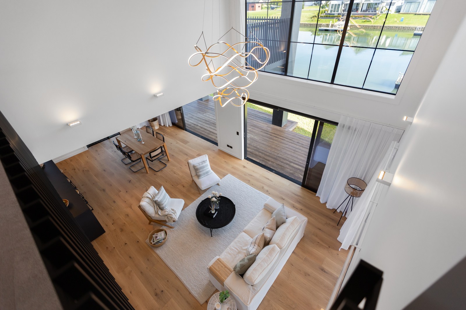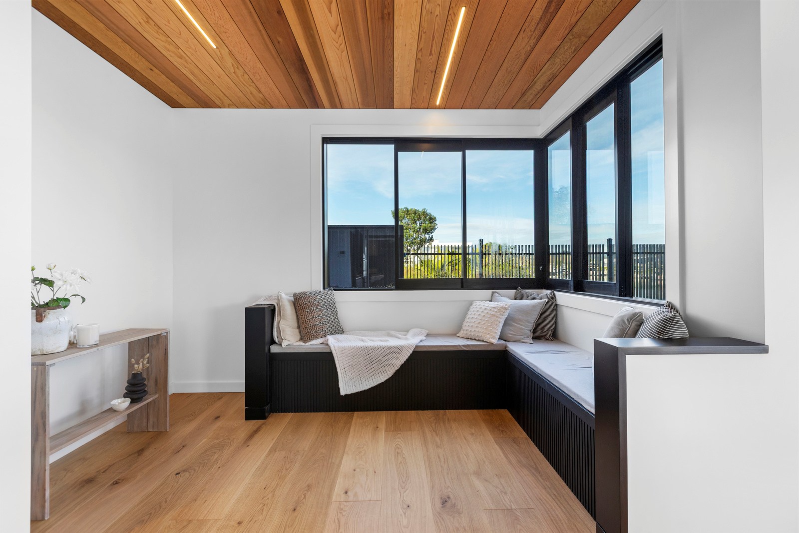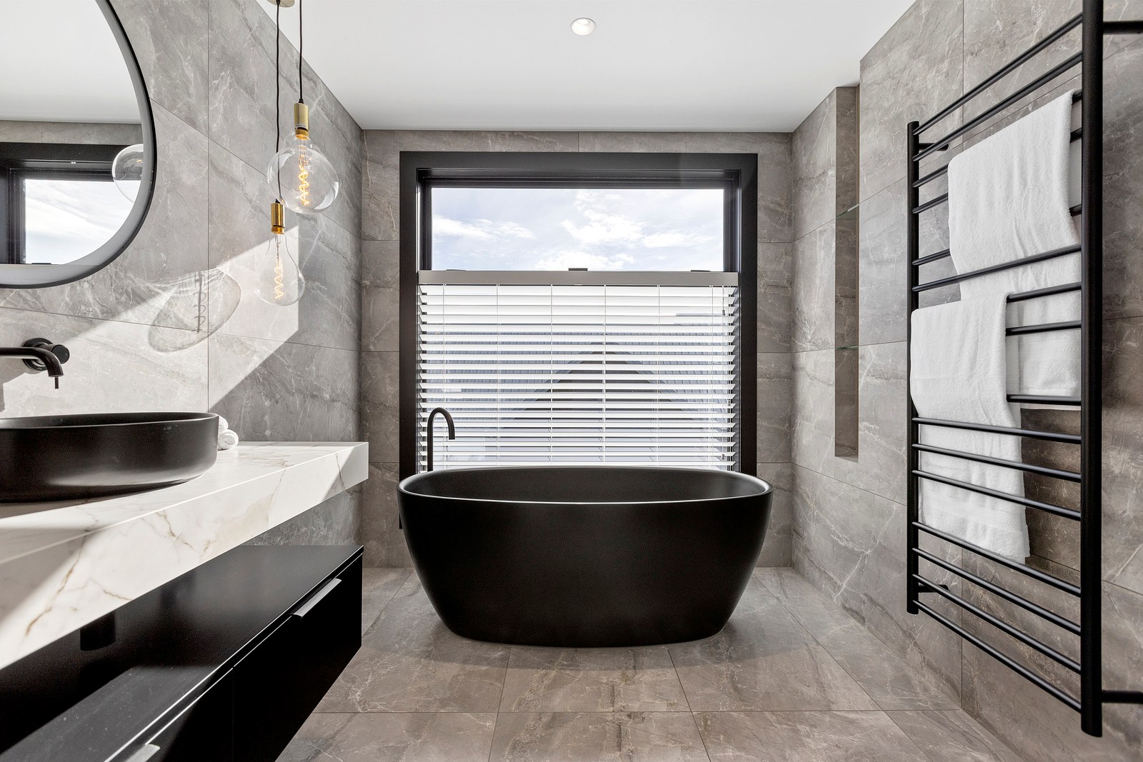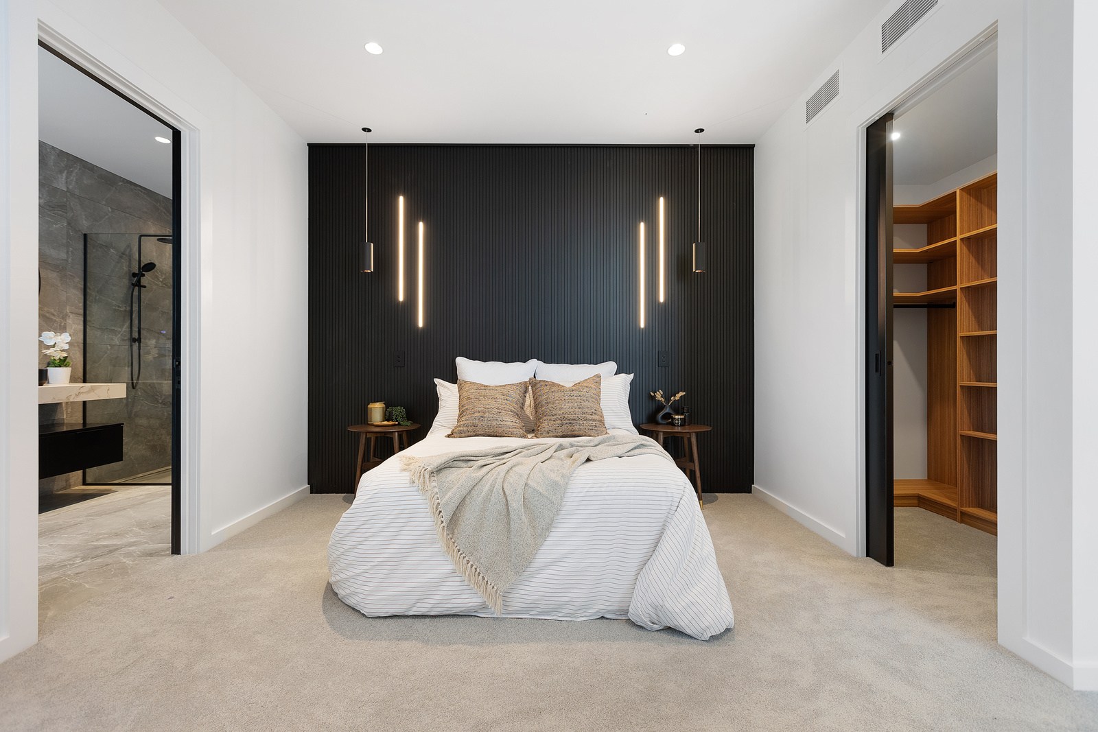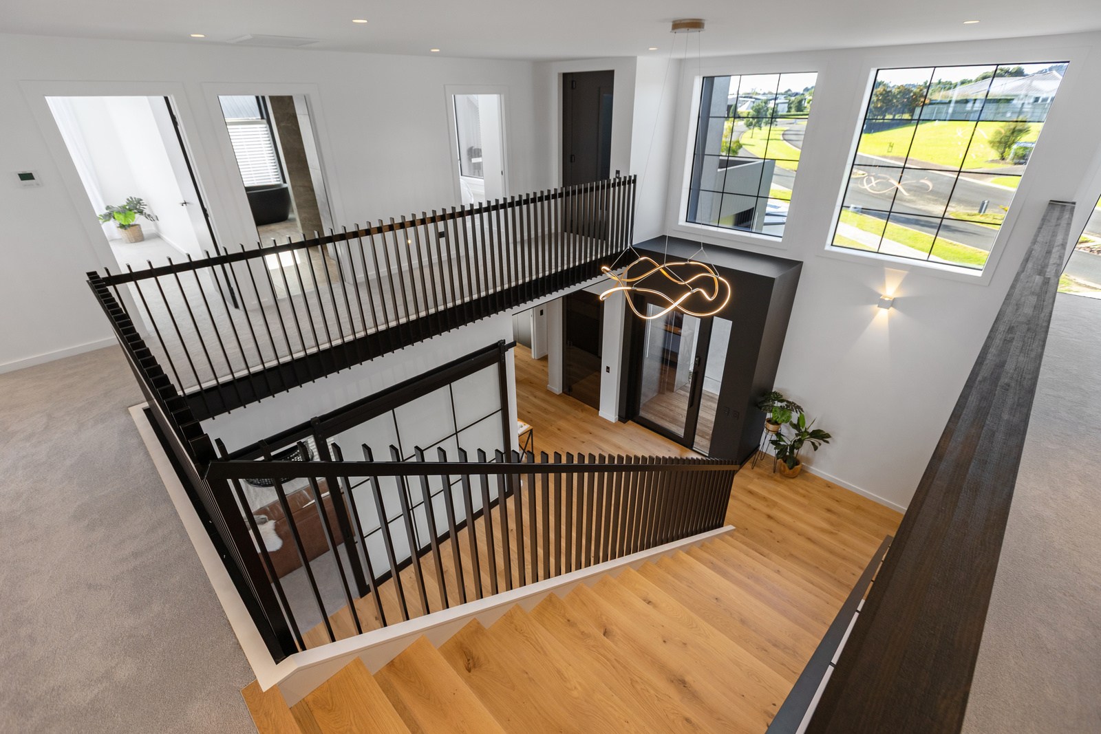 A prime canal-front section deserved an epic home. The result? This 413sqm four-bedroom house that matches the quality of the site in every way. Sea and hill views, top-class materials, designer features, special additions (such as a wine cellar) and rarely found grandeur can all be enjoyed in this home. The exterior, with twin gables and a horizontal link, and clad in black vertical timber, brick and timber screening, is a real showstopper on the waterfront. Inside, however, it’s all warmth, light, natural materials and carefully curated high-end details such as chandeliers and dark kitchen cabinetry.