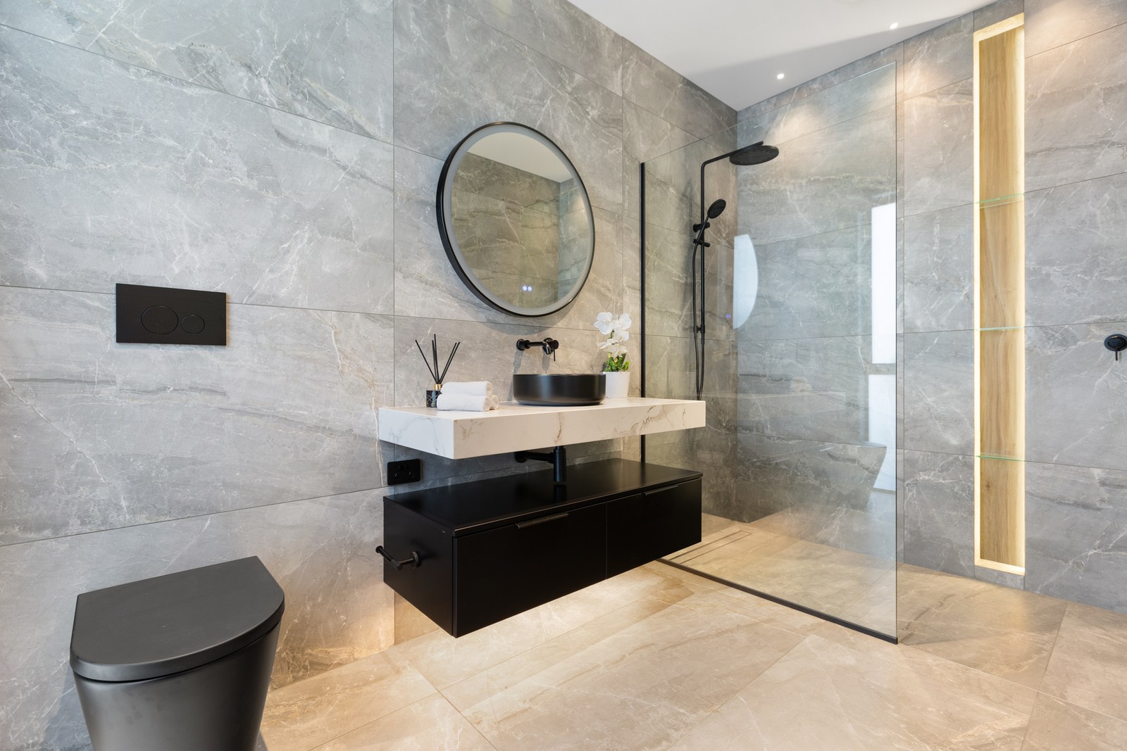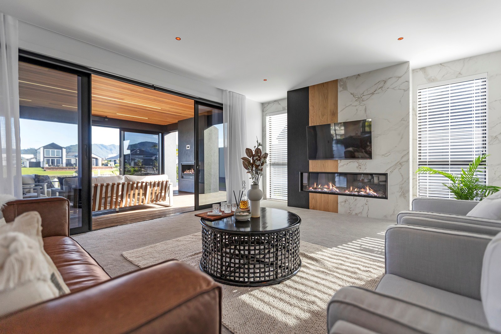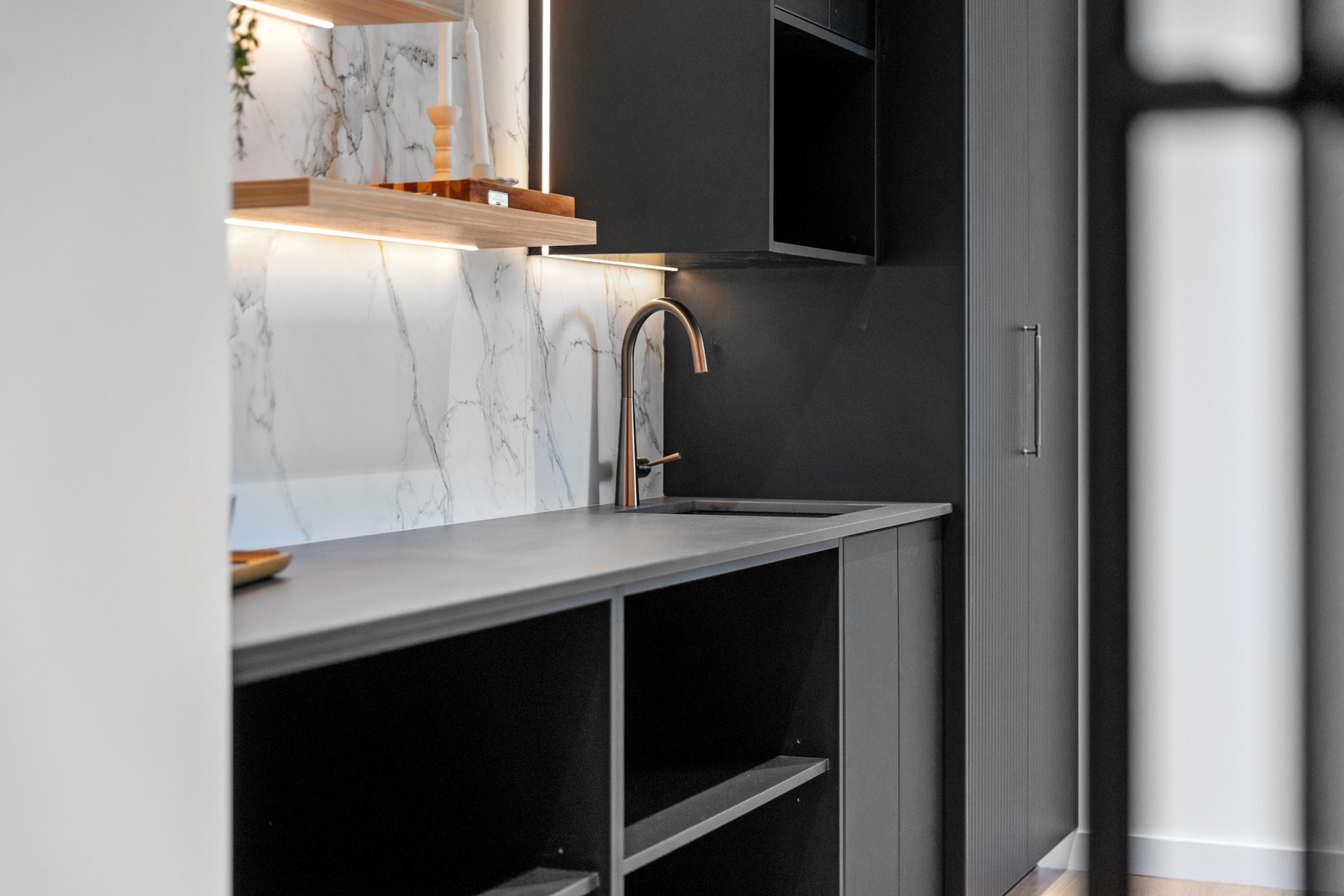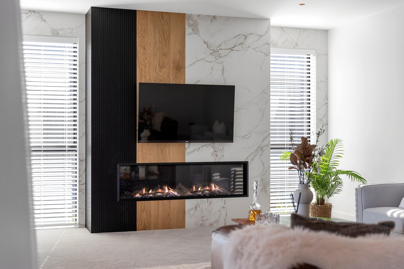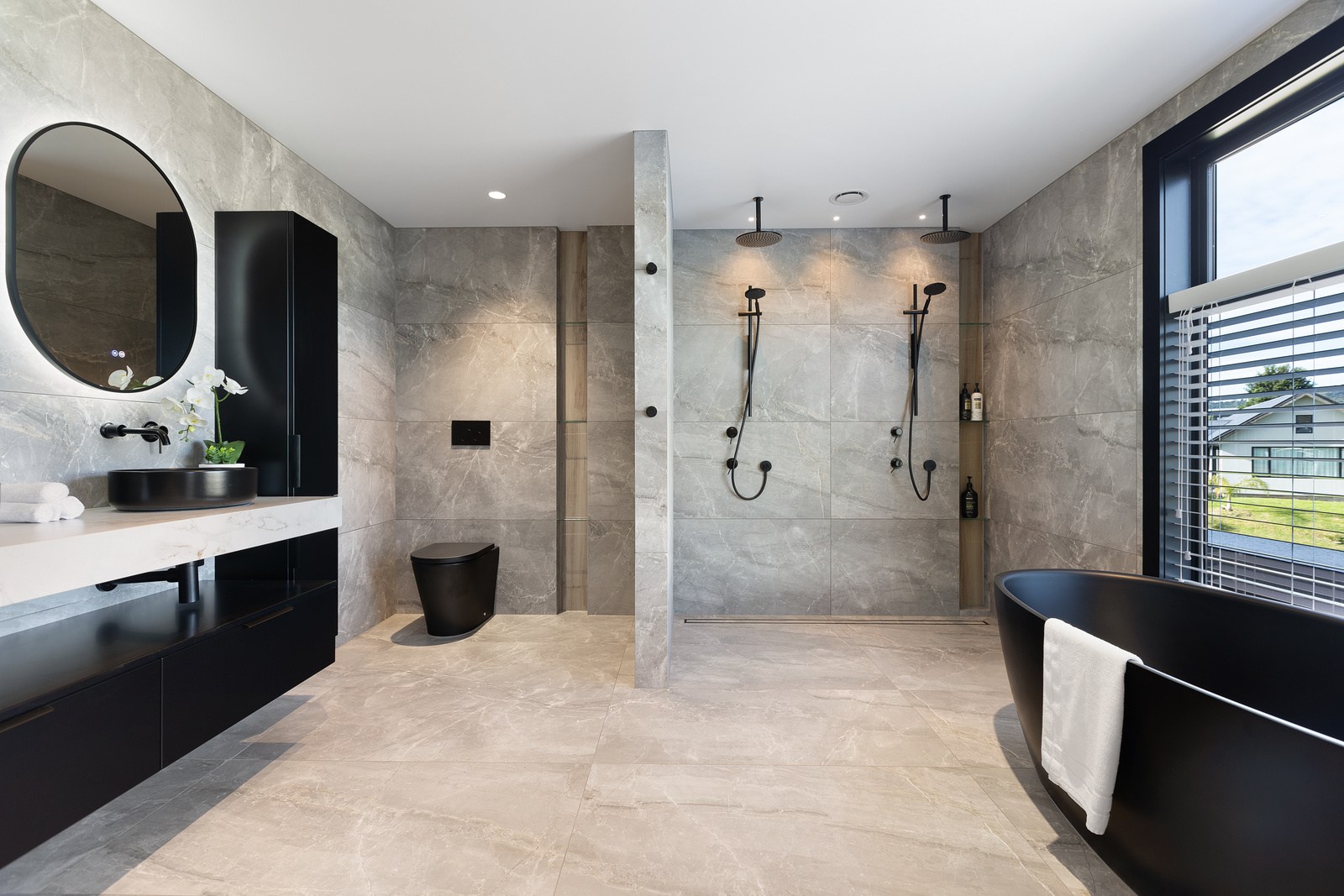 A prime canal-front section deserved an epic home. The result? This 413sqm four-bedroom house that matches the quality of the site in every way. Sea and hill views, top-class materials, designer features, special additions (such as a wine cellar) and rarely found grandeur can all be enjoyed in this home. The exterior, with twin gables and a horizontal link, and clad in black vertical timber, brick and timber screening, is a real showstopper on the waterfront. Inside, however, it’s all warmth, light, natural materials and carefully curated high-end details such as chandeliers and dark kitchen cabinetry.