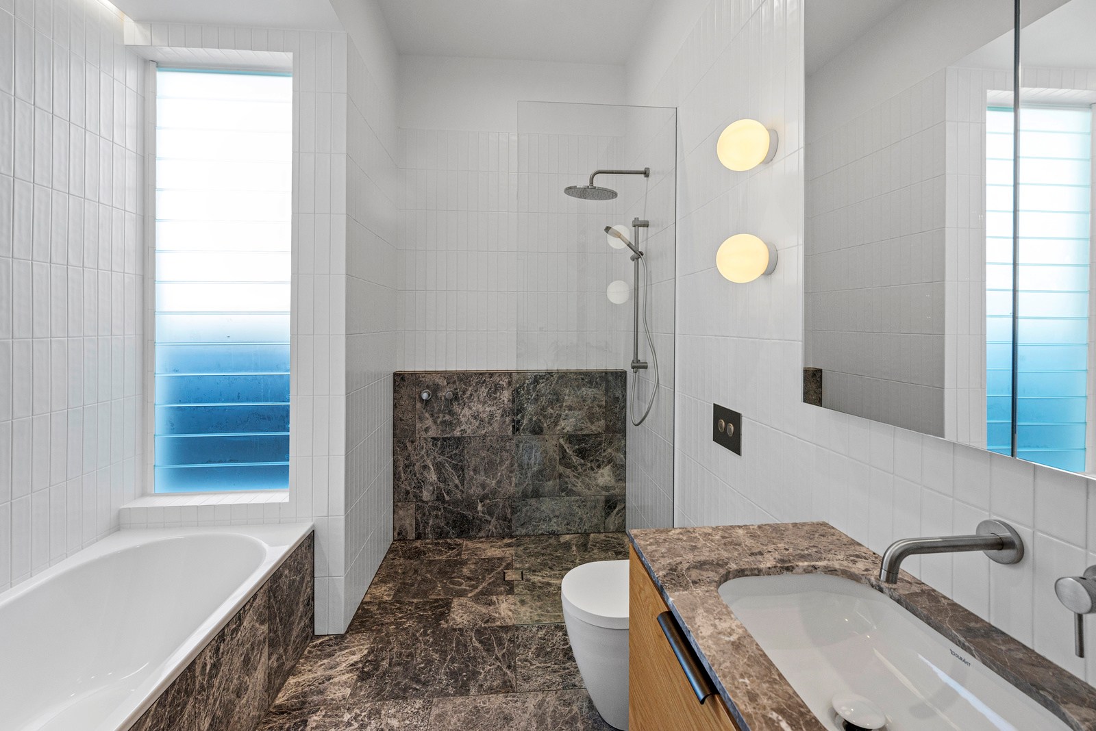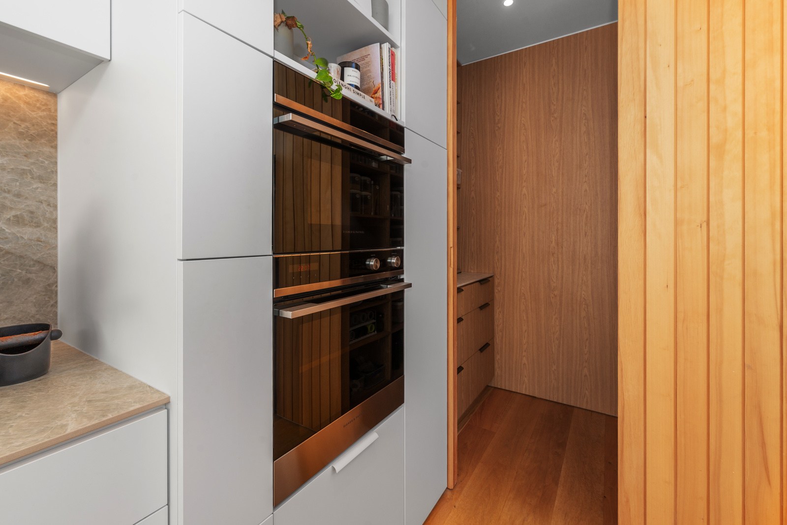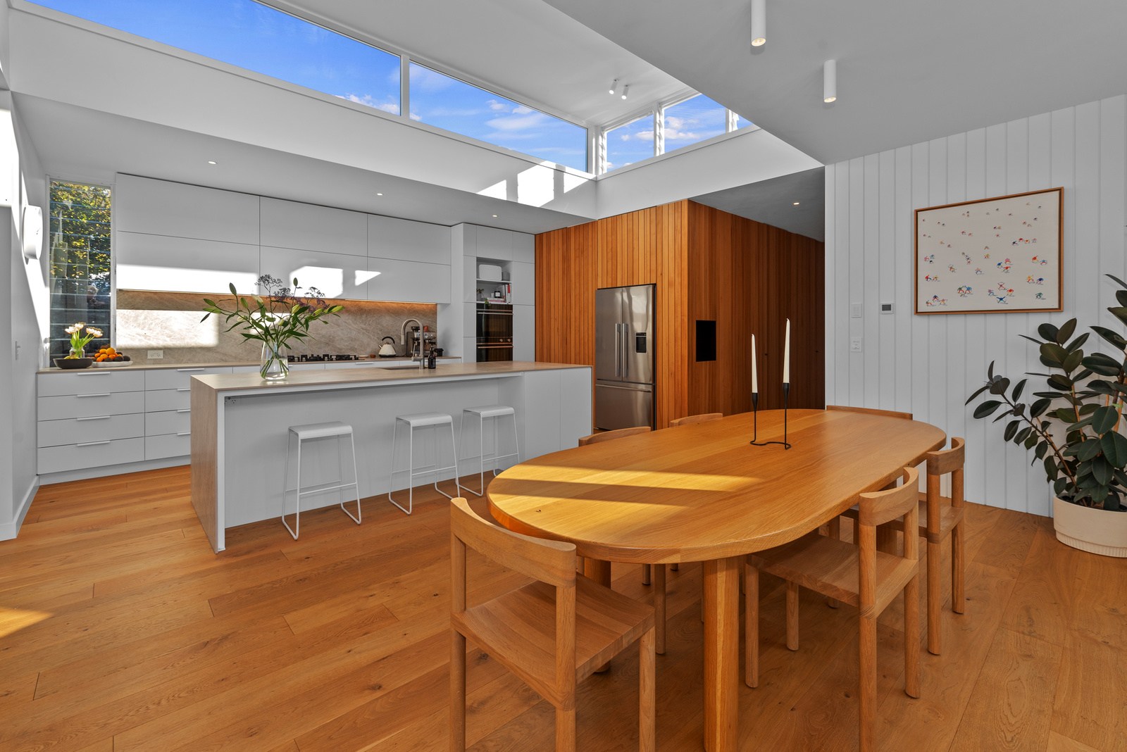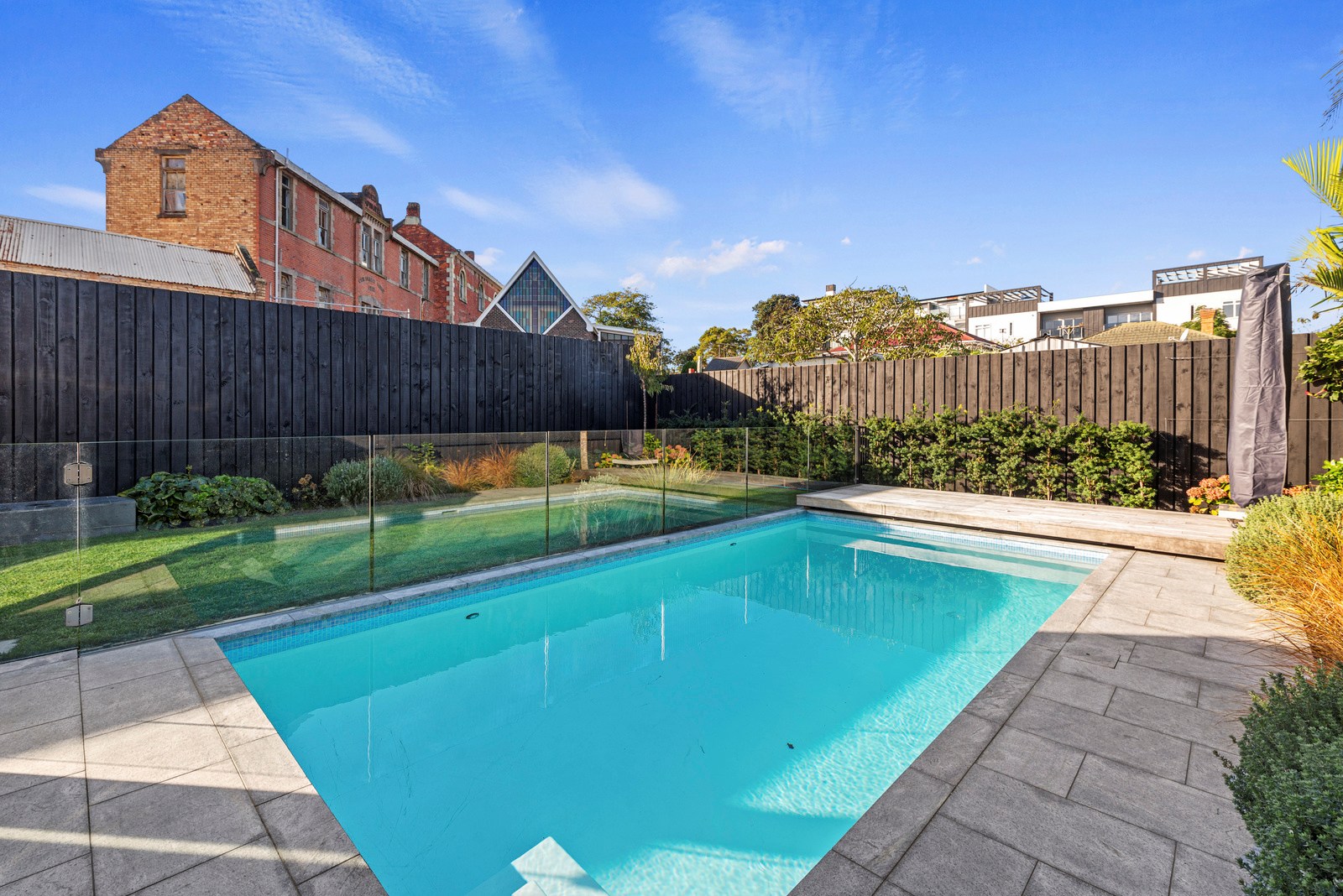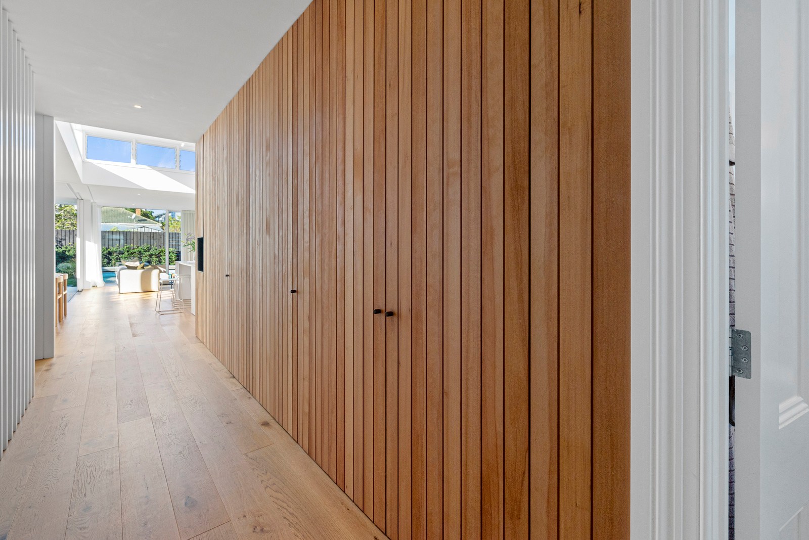 This was no straightforward project. The basement garage and separate guest rooms required a meticulously planned dig-out, given the proximity of neighbours on both sides. The addition — kitchen, dining and living spaces — extends to a back courtyard. A central lightwell in the kitchen and floor-to-ceiling windows usher in light and louvres provide ventilation. Timber vertical panelling and painted cladding guide the residents through the house, while panelled doors conceal the laundry and the office. The one-time poky cottage has a new lease on life with more space, light, indoor-outdoor flow and a backyard oasis with a pool.