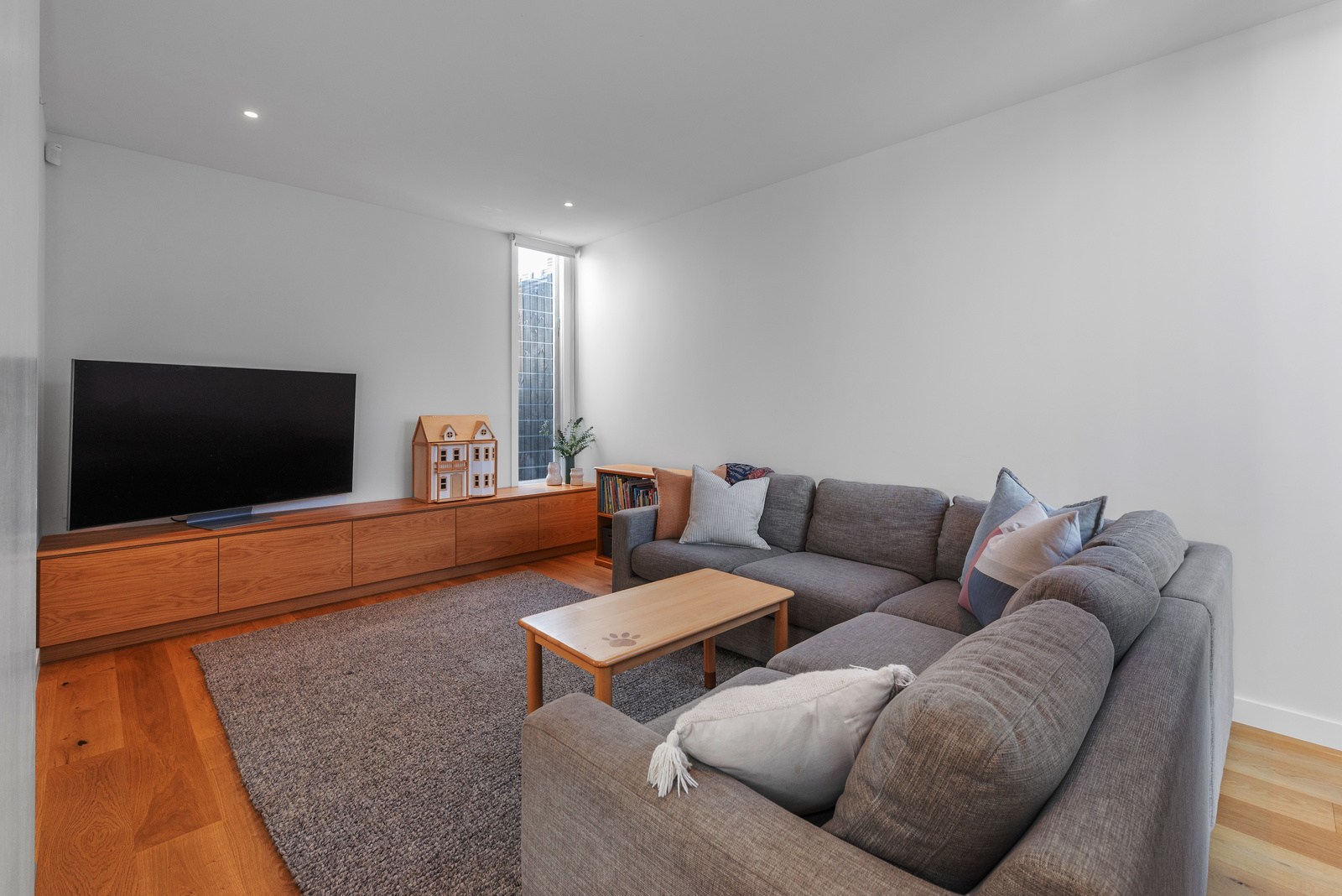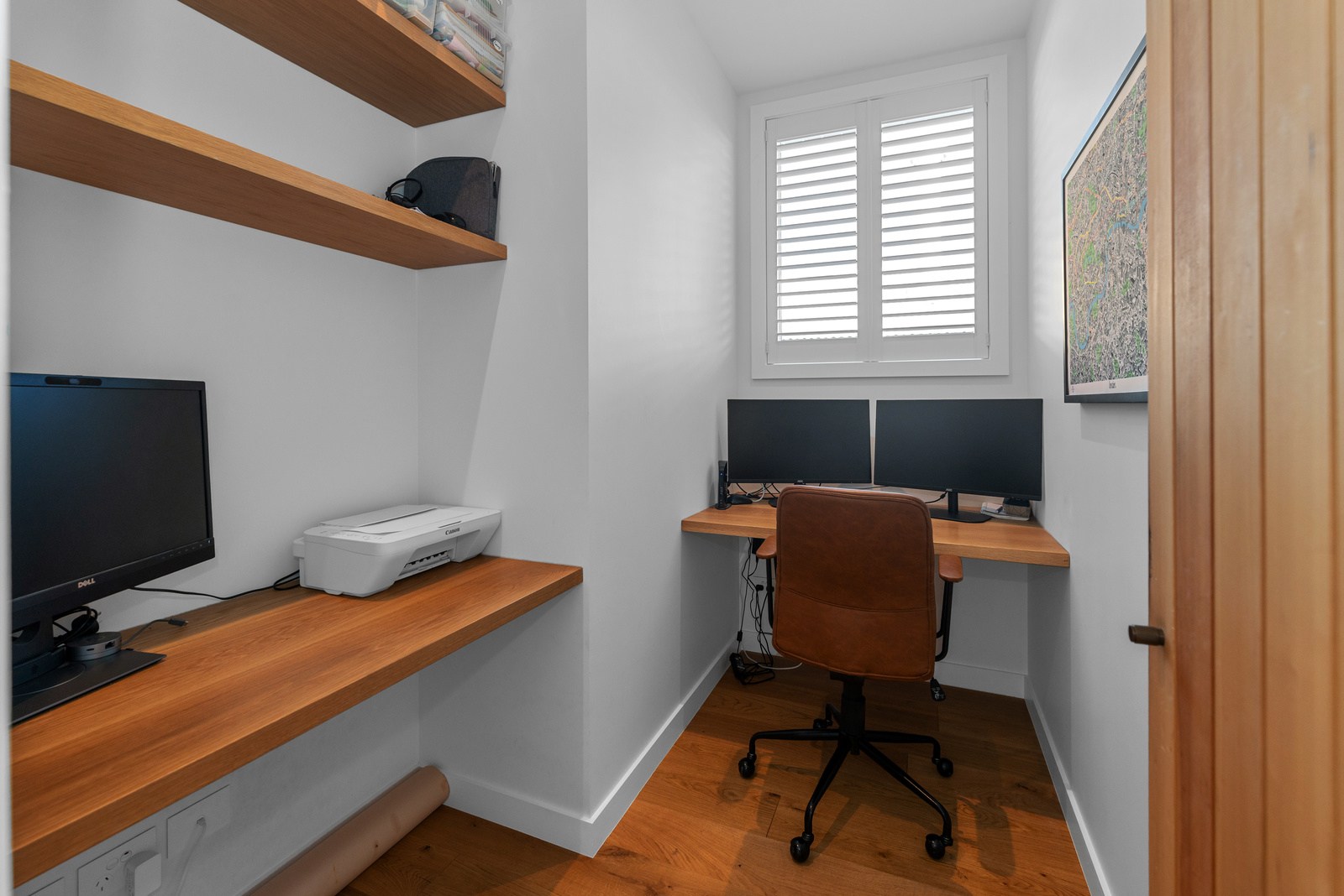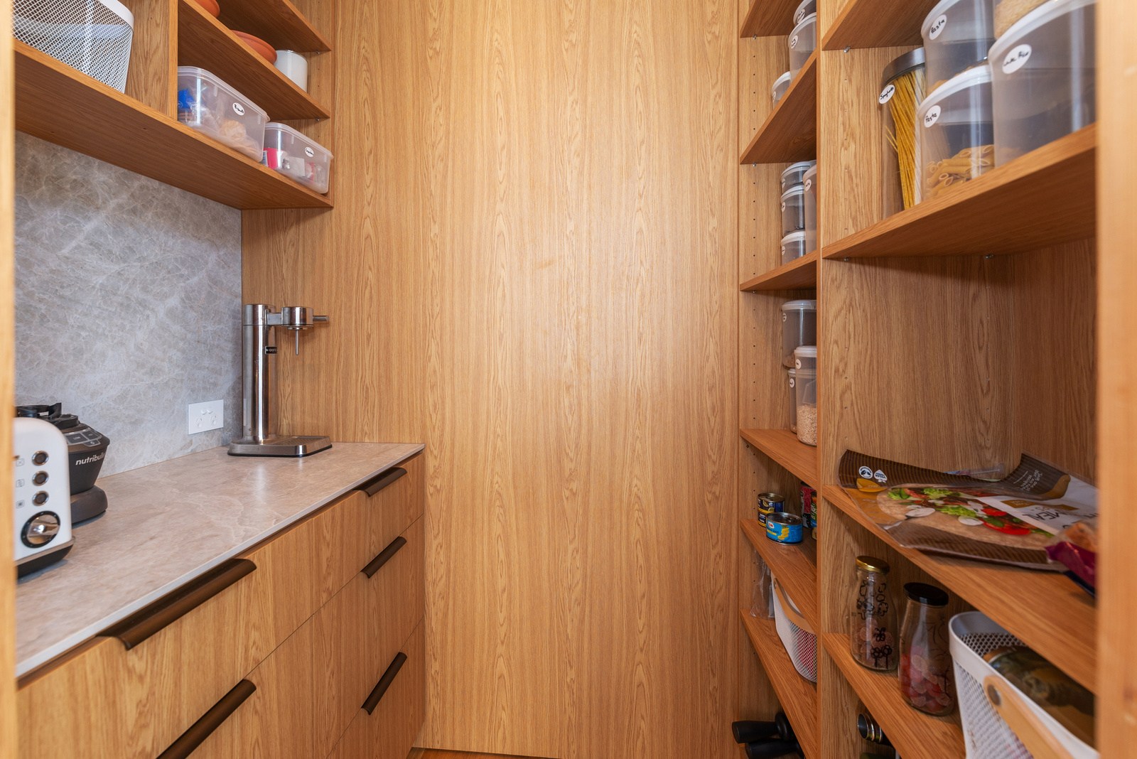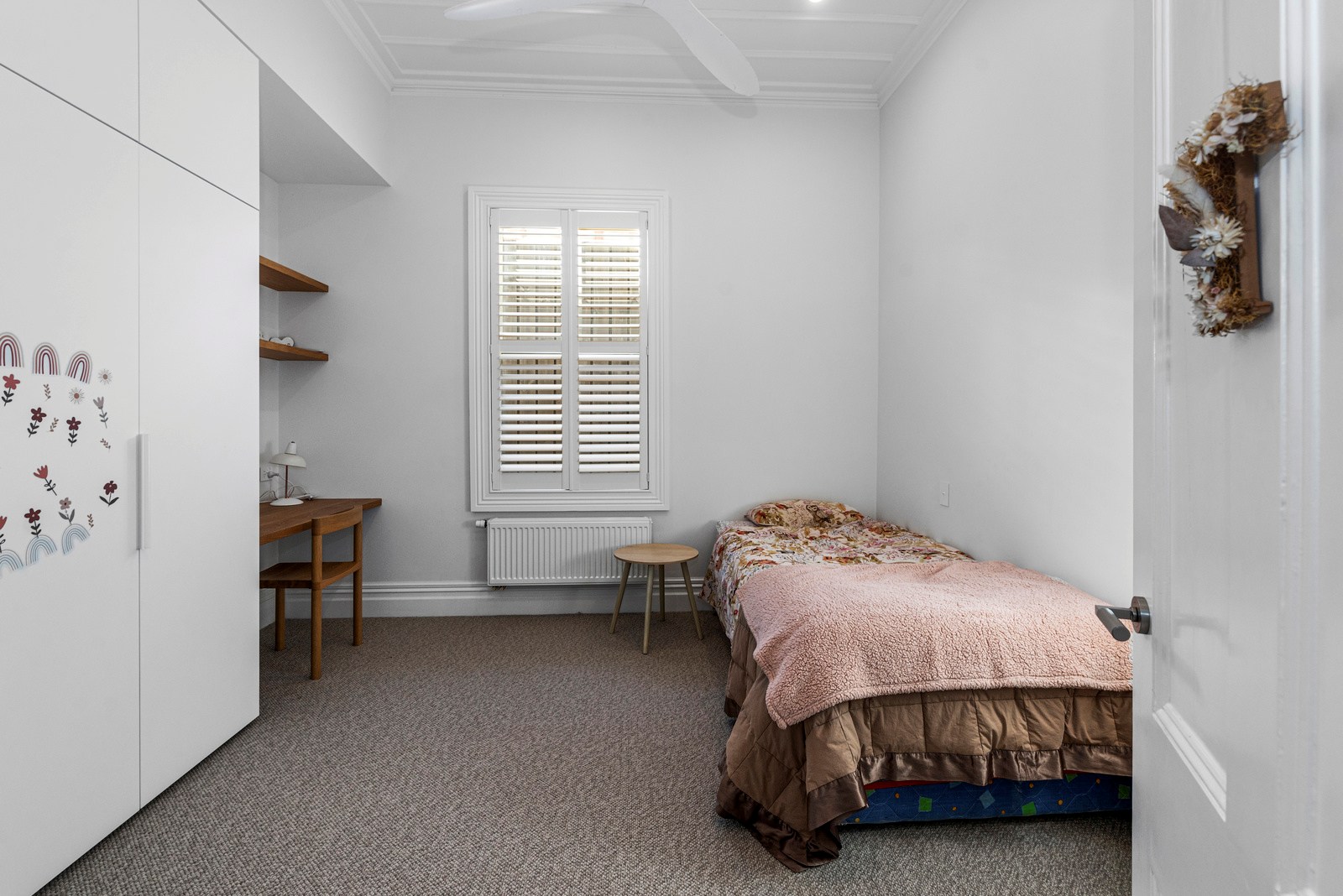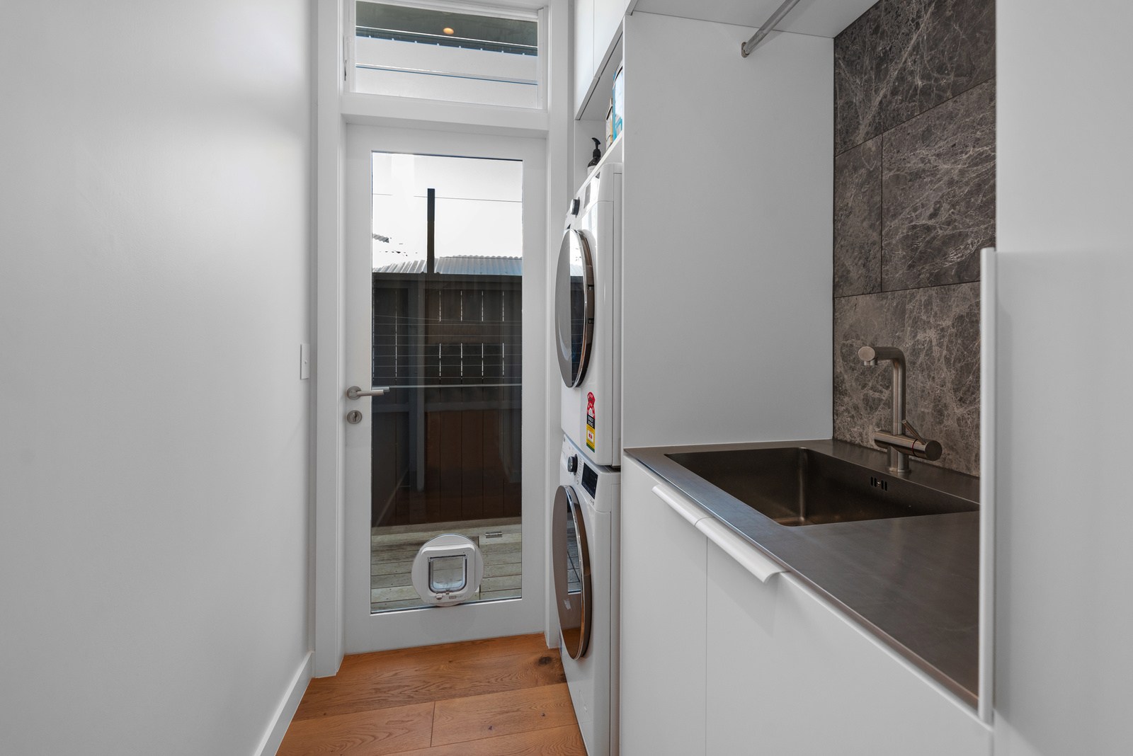 This was no straightforward project. The basement garage and separate guest rooms required a meticulously planned dig-out, given the proximity of neighbours on both sides. The addition — kitchen, dining and living spaces — extends to a back courtyard. A central lightwell in the kitchen and floor-to-ceiling windows usher in light and louvres provide ventilation. Timber vertical panelling and painted cladding guide the residents through the house, while panelled doors conceal the laundry and the office. The one-time poky cottage has a new lease on life with more space, light, indoor-outdoor flow and a backyard oasis with a pool.