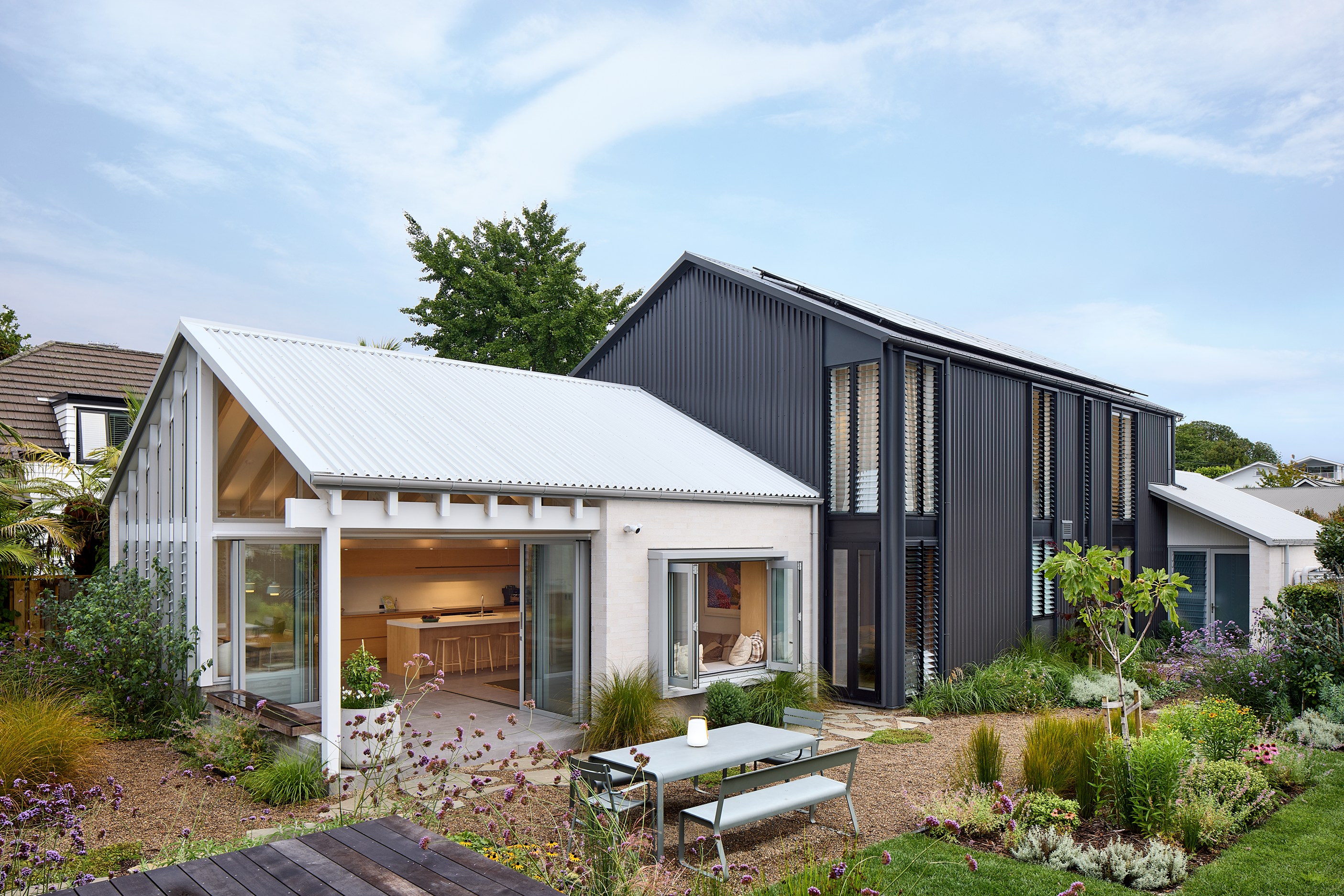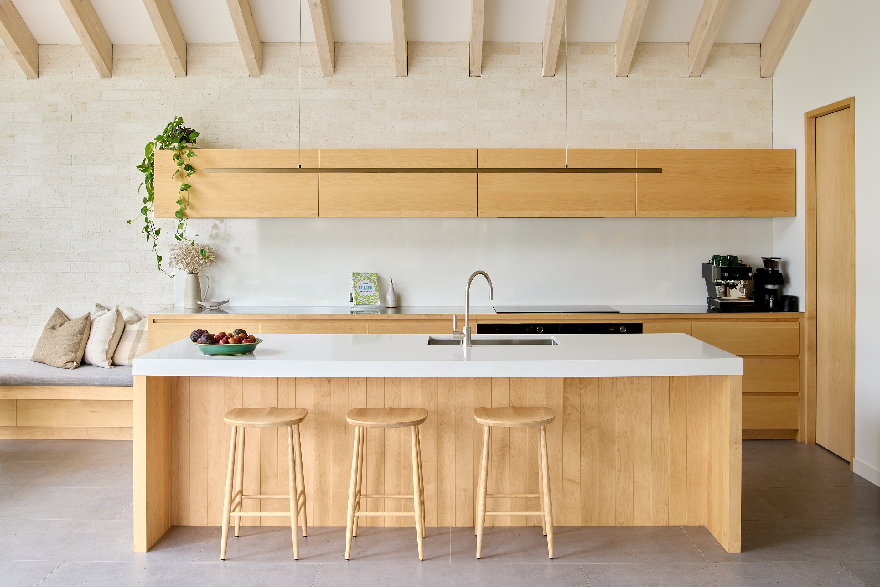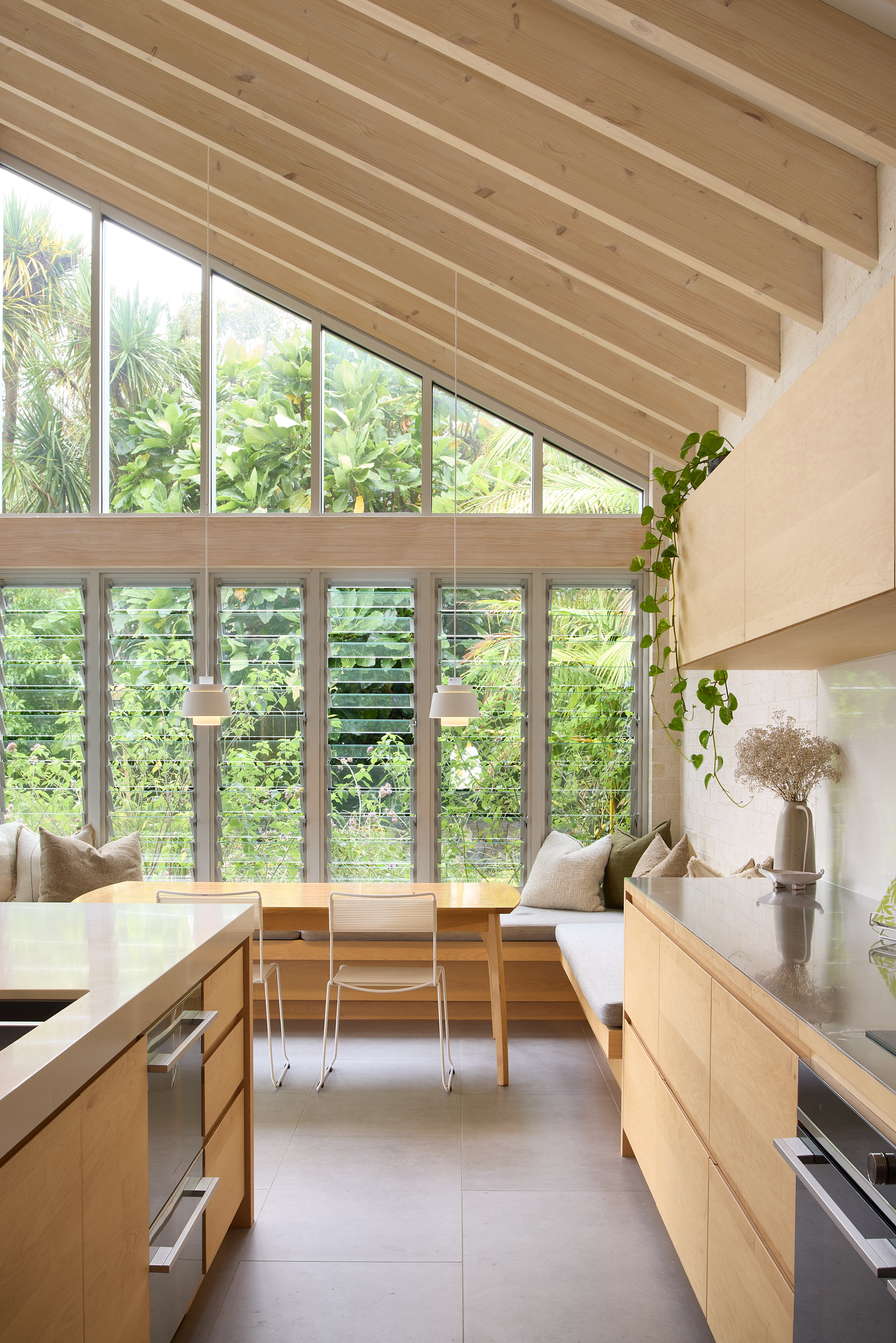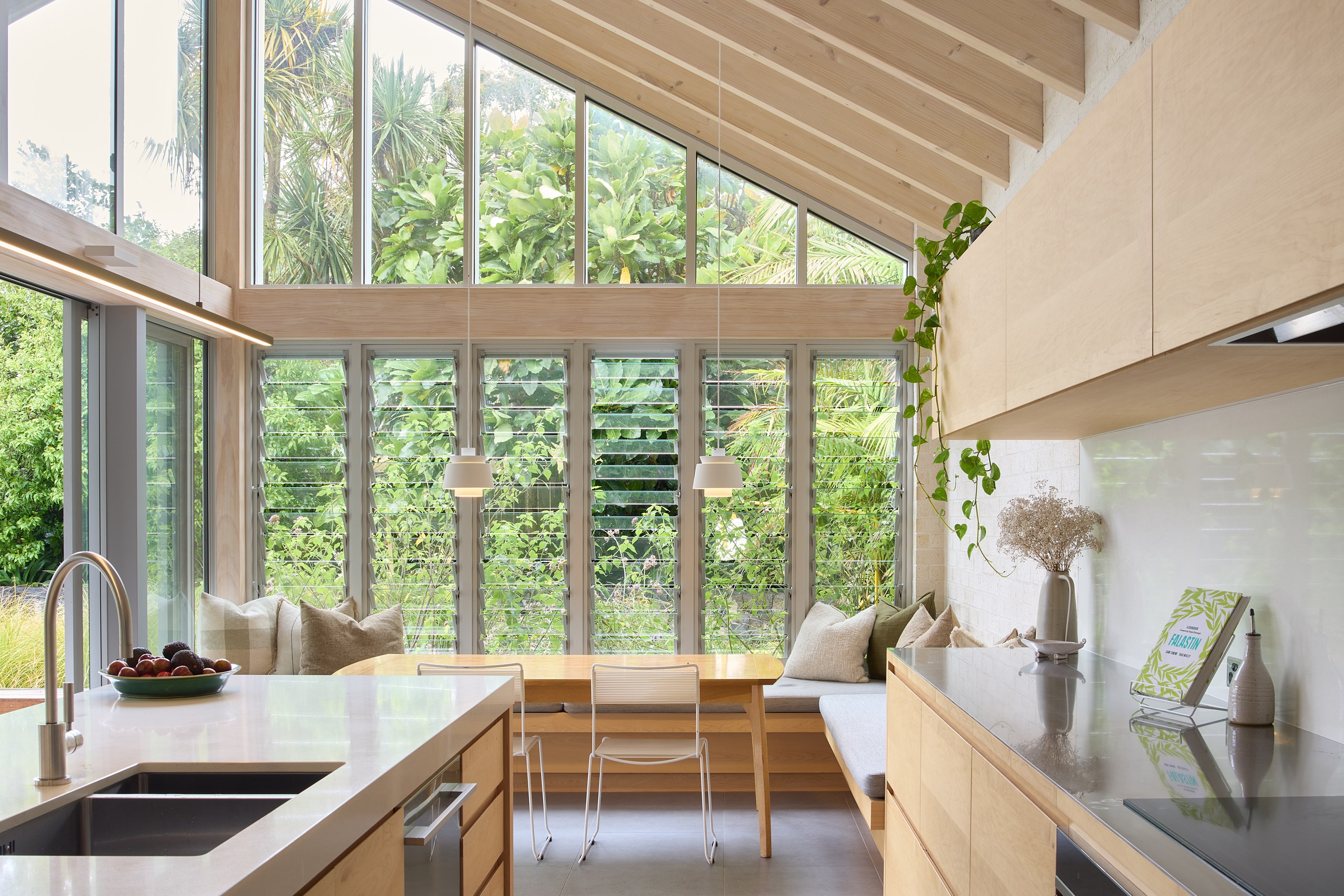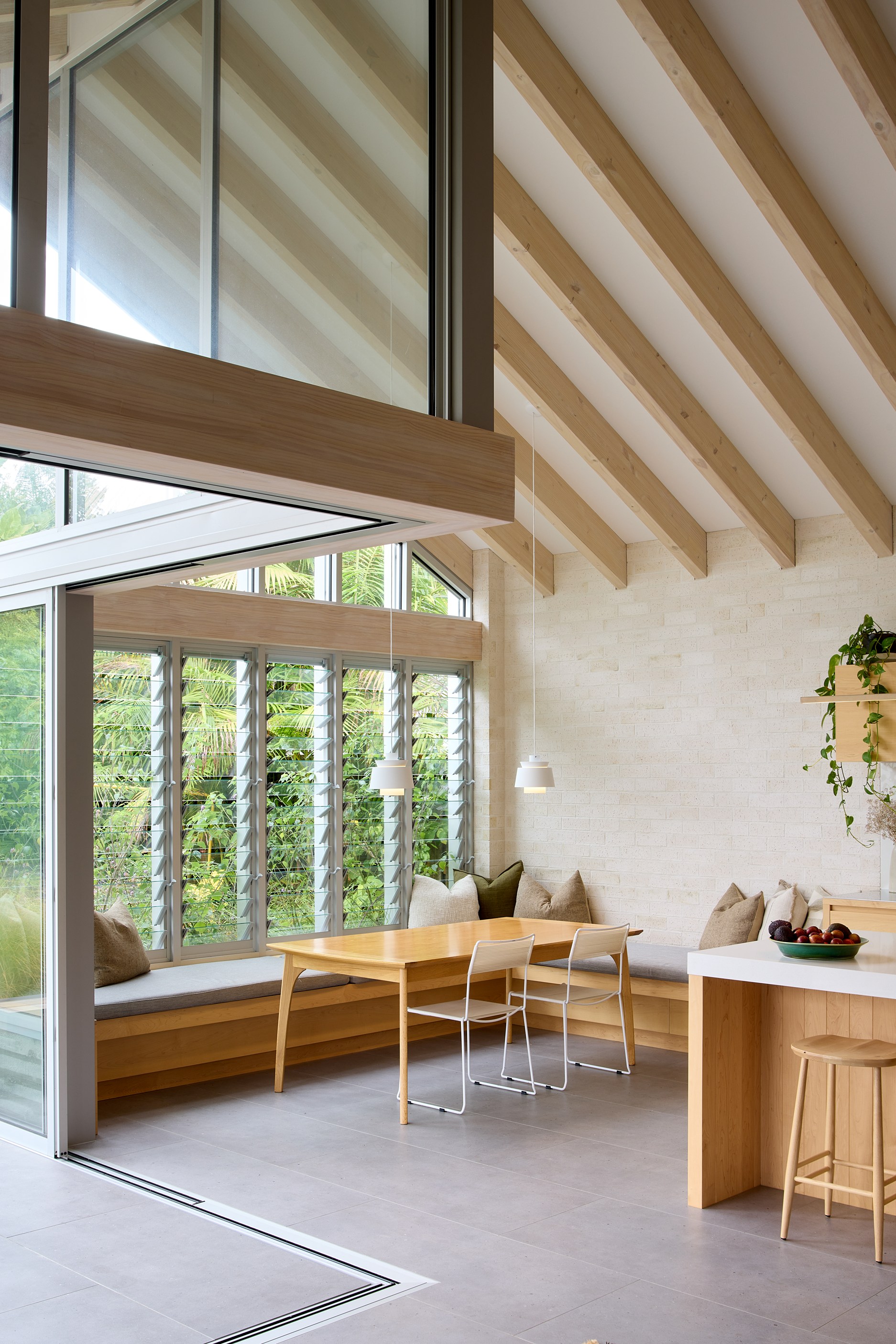 The exterior now boasts a refined, low-maintenance palette of New Zealand-made bricks, coloured steel and warm cedar accents, blending durability with aesthetic appeal. Inside, the brickwork continues as a tactile expression, complemented by maple joinery and carefully selected floor tiles. Together, these materials lend texture and warmth to the cleanlined interiors, beneath cathedral ceilings with exposed structural trusses. Every detail has been thoughtfully resolved, from the bespoke banquette to subtle lighting and smart spatial planning. Outdoors, the addition of a swimming pool and fully landscaped gardens enhances the sense of sanctuary. The result is a cohesive home designed for both comfort and sophistication. Completed over 15 months, the project exceeded expectations for both builder and owners ― a testament to collaboration, precision and design integrity.