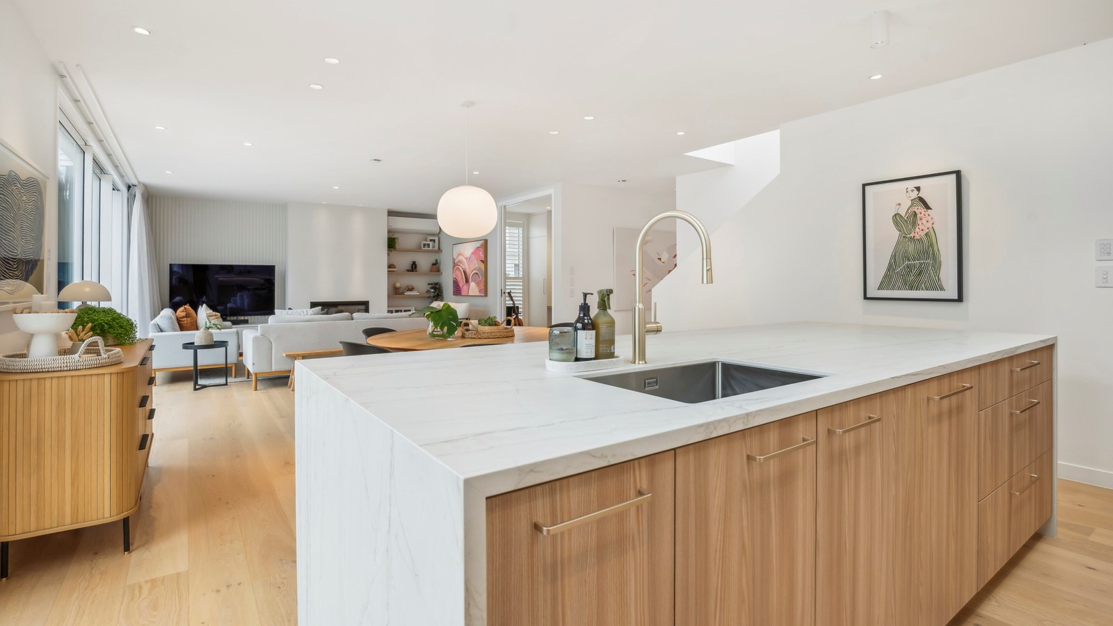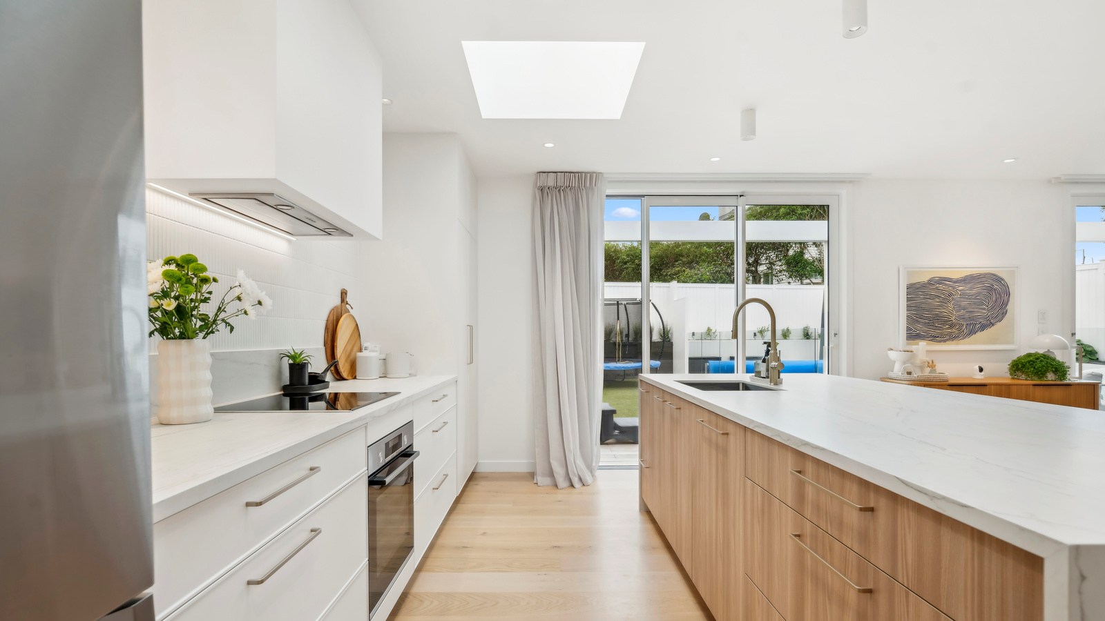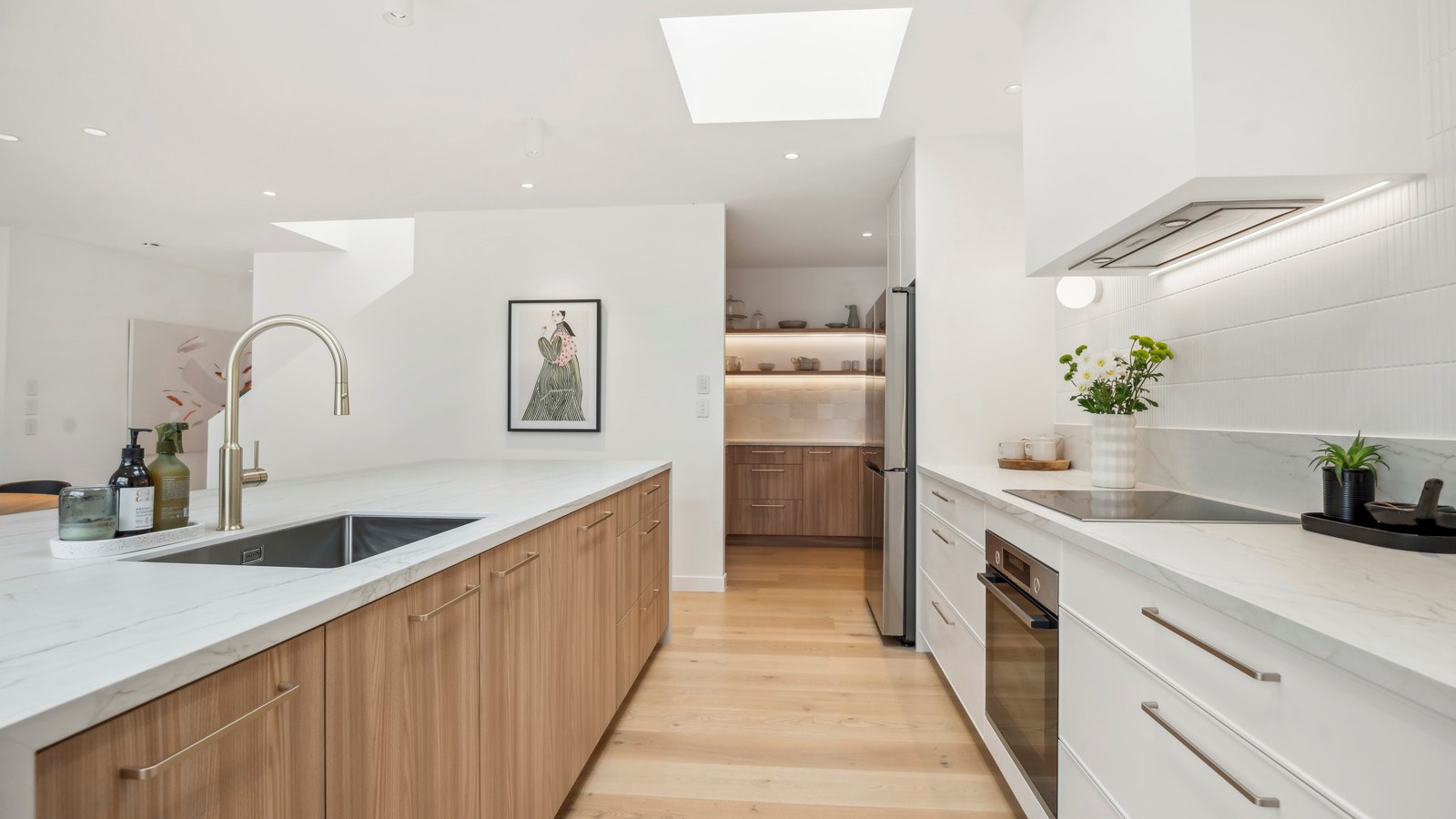At the heart of the home is a sleek designer kitchen with premium appliances and skylights above, bringing light deep into the space. The kitchen connects effortlessly to the living area, where a statement fireplace anchors the space both visually and functionally. Comfort is carefully considered throughout, with additional insulation to the midfloor and media room, high-quality glazing and top-tier fixtures. Expansive sliding doors lead to a large deck and landscaped outdoor areas, designed for seamless entertaining or relaxing in privacy. Every element reflects the care and craftsmanship invested in this build. It’s a home that celebrates architectural flair without sacrificing warmth, flow or everyday function.