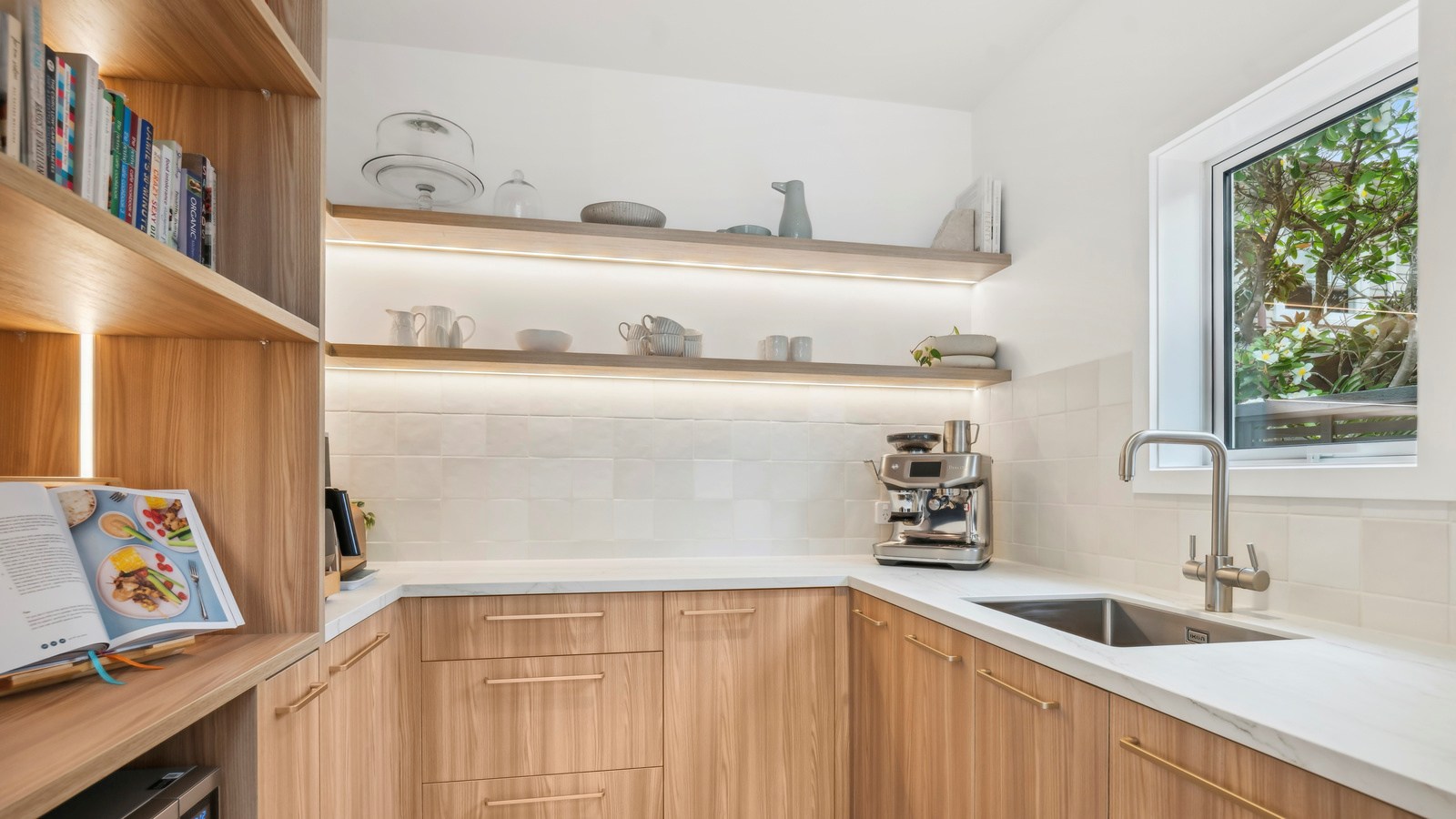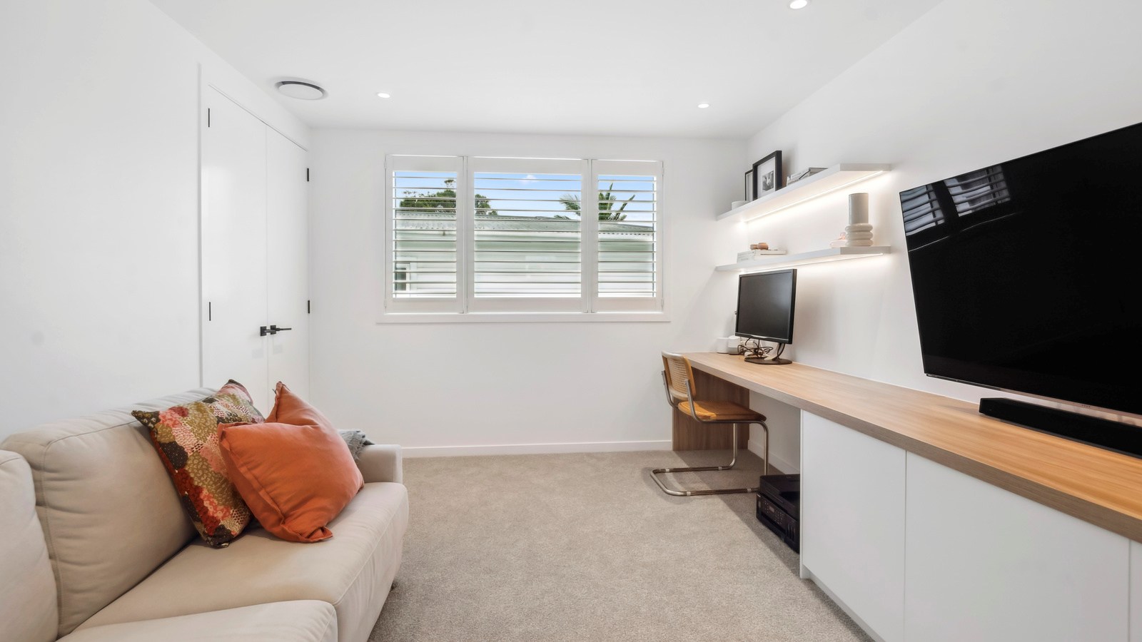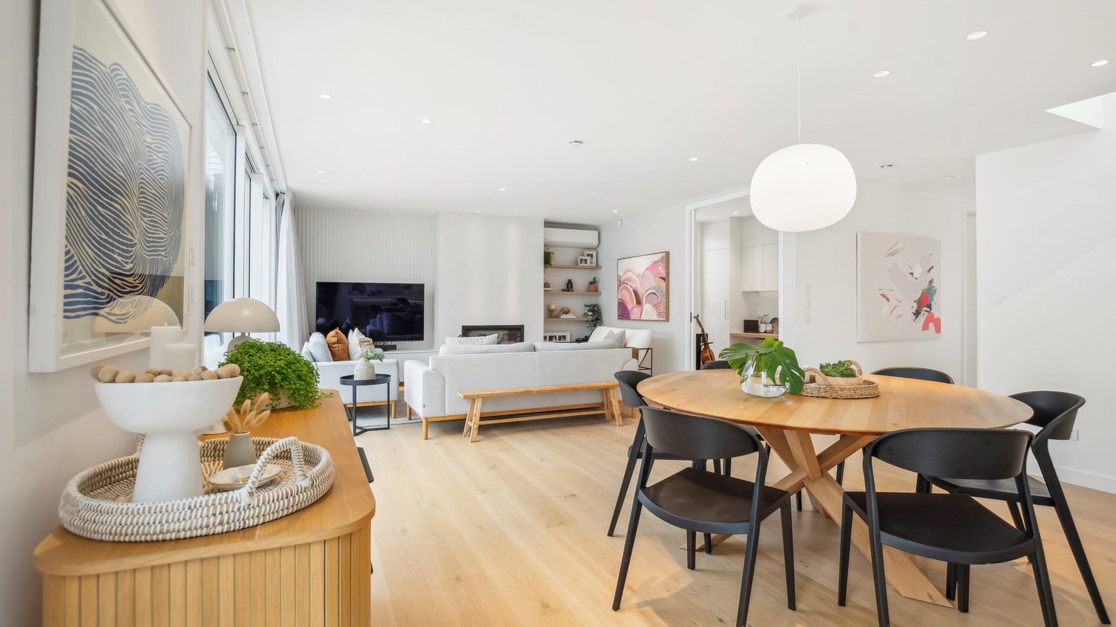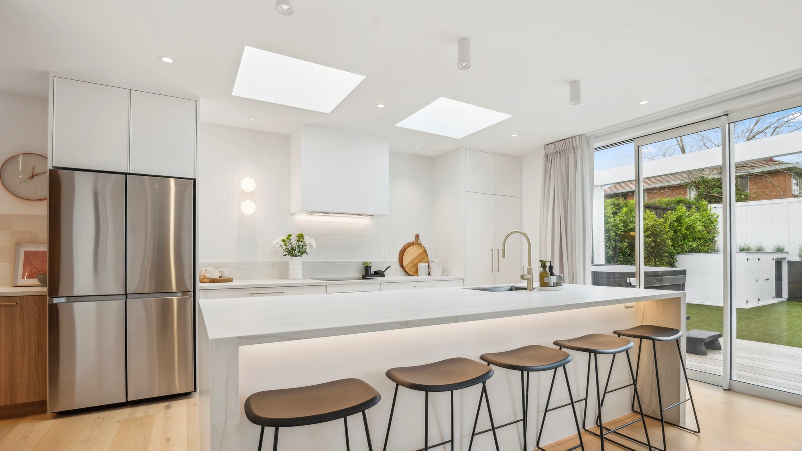 At the heart of the home is a sleek designer kitchen with premium appliances and skylights above, bringing light deep into the space. The kitchen connects effortlessly to the living area, where a statement fireplace anchors the space both visually and functionally. Comfort is carefully considered throughout, with additional insulation to the midfloor and media room, high-quality glazing and top-tier fixtures. Expansive sliding doors lead to a large deck and landscaped outdoor areas, designed for seamless entertaining or relaxing in privacy. Every element reflects the care and craftsmanship invested in this build. It’s a home that celebrates architectural flair without sacrificing warmth, flow or everyday function.