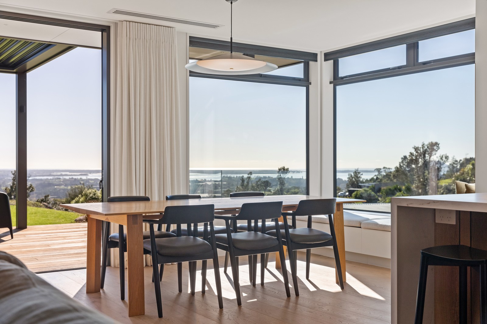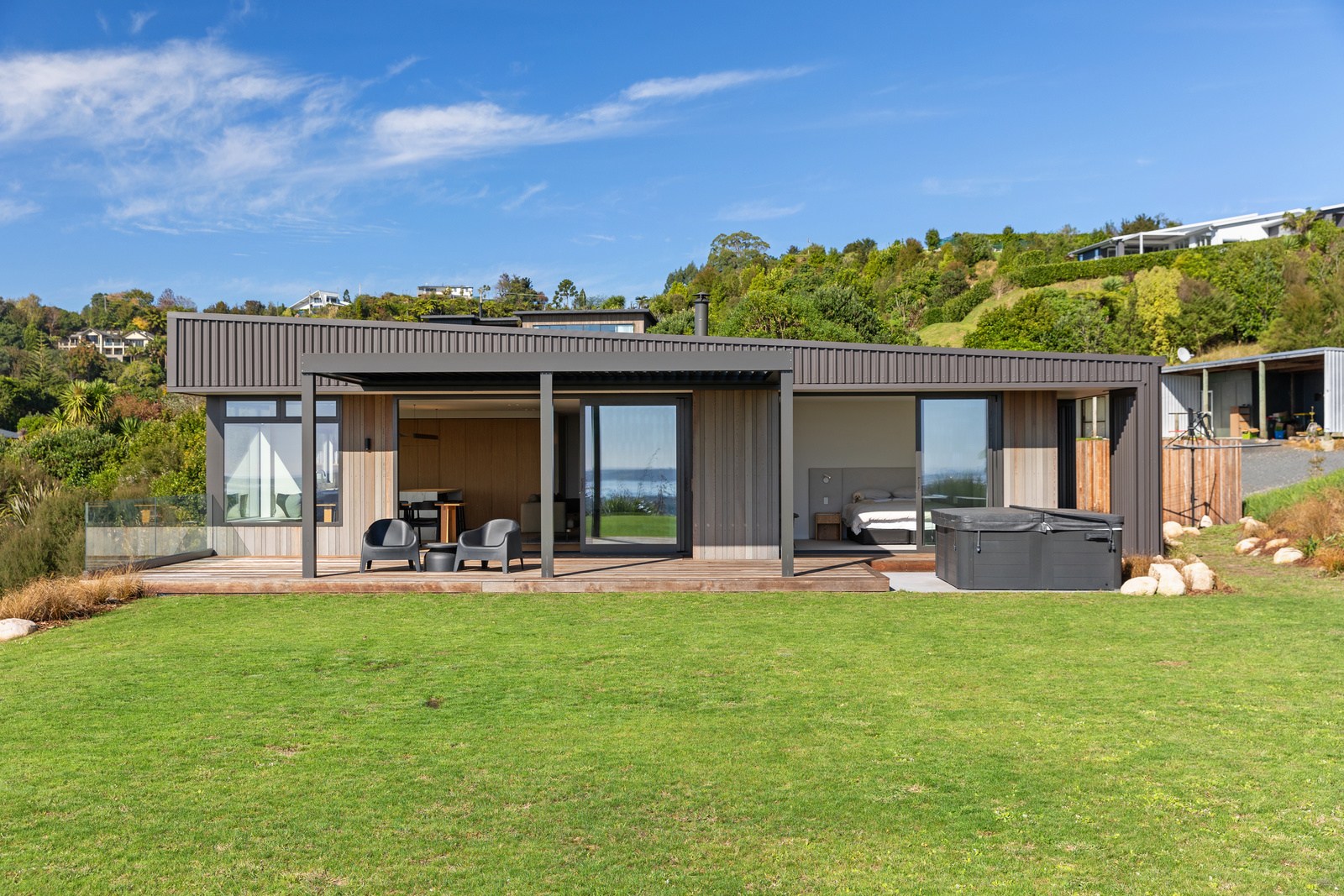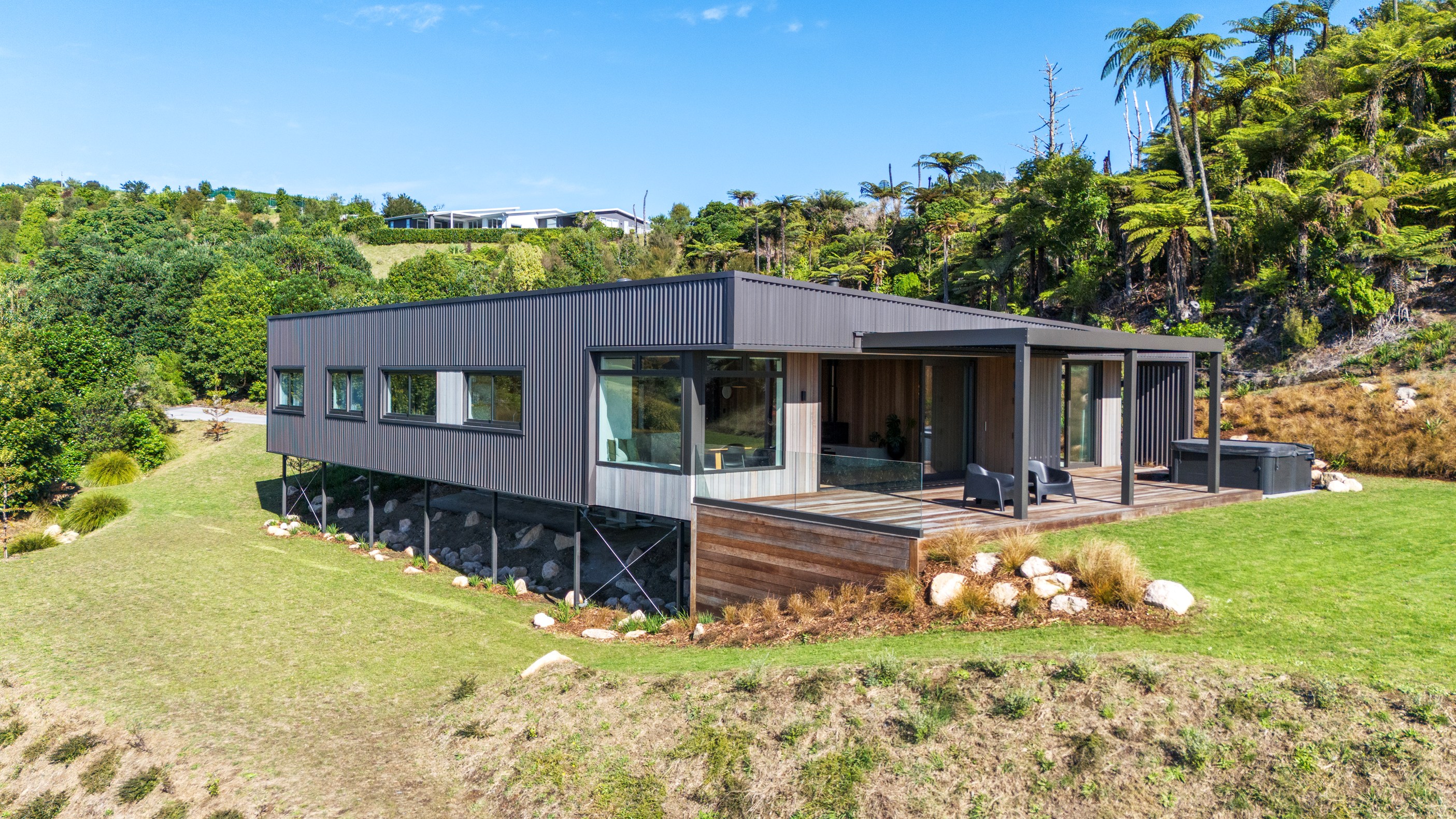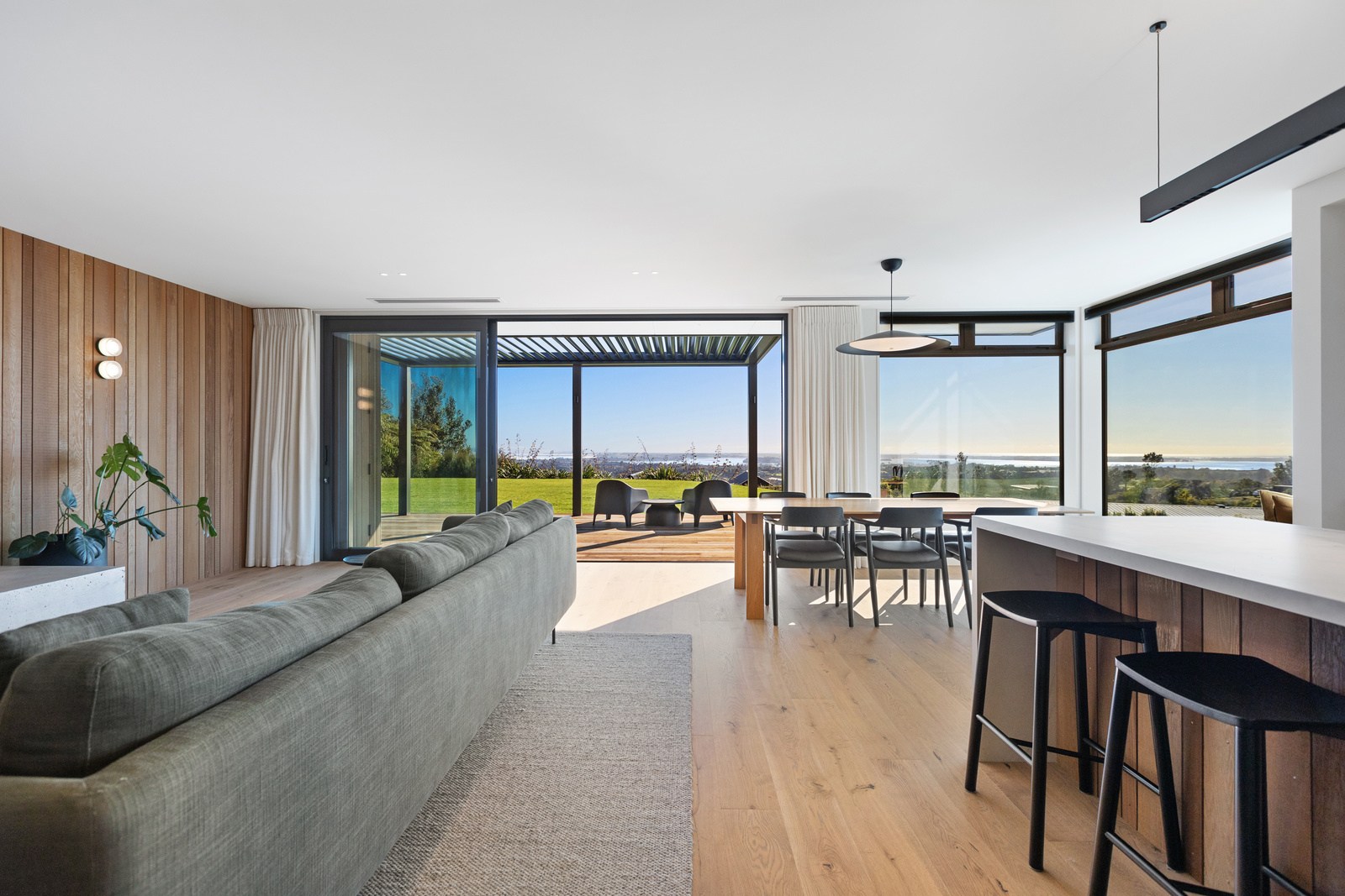 Two bedrooms, a family bathroom, media room and small office, tuck in privately beyond the open-plan living. The sweeping panoramic view is maximised by the home’s elevated site and expansive use of glazing throughout. Floor-to-ceiling stacking sliders, ensure uninterrupted flow between interior living spaces and the generous deck, shared by the main living area and the main suite. Outdoor living is further enhanced by an overhead pergola, providing year-round shelter and comfort. Every element has been curated to ensure this home feels both refined and deeply connected to its landscape.