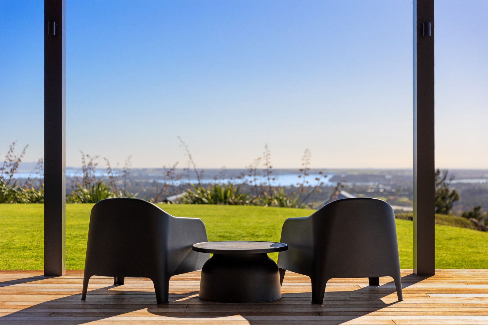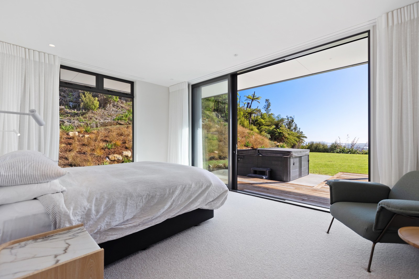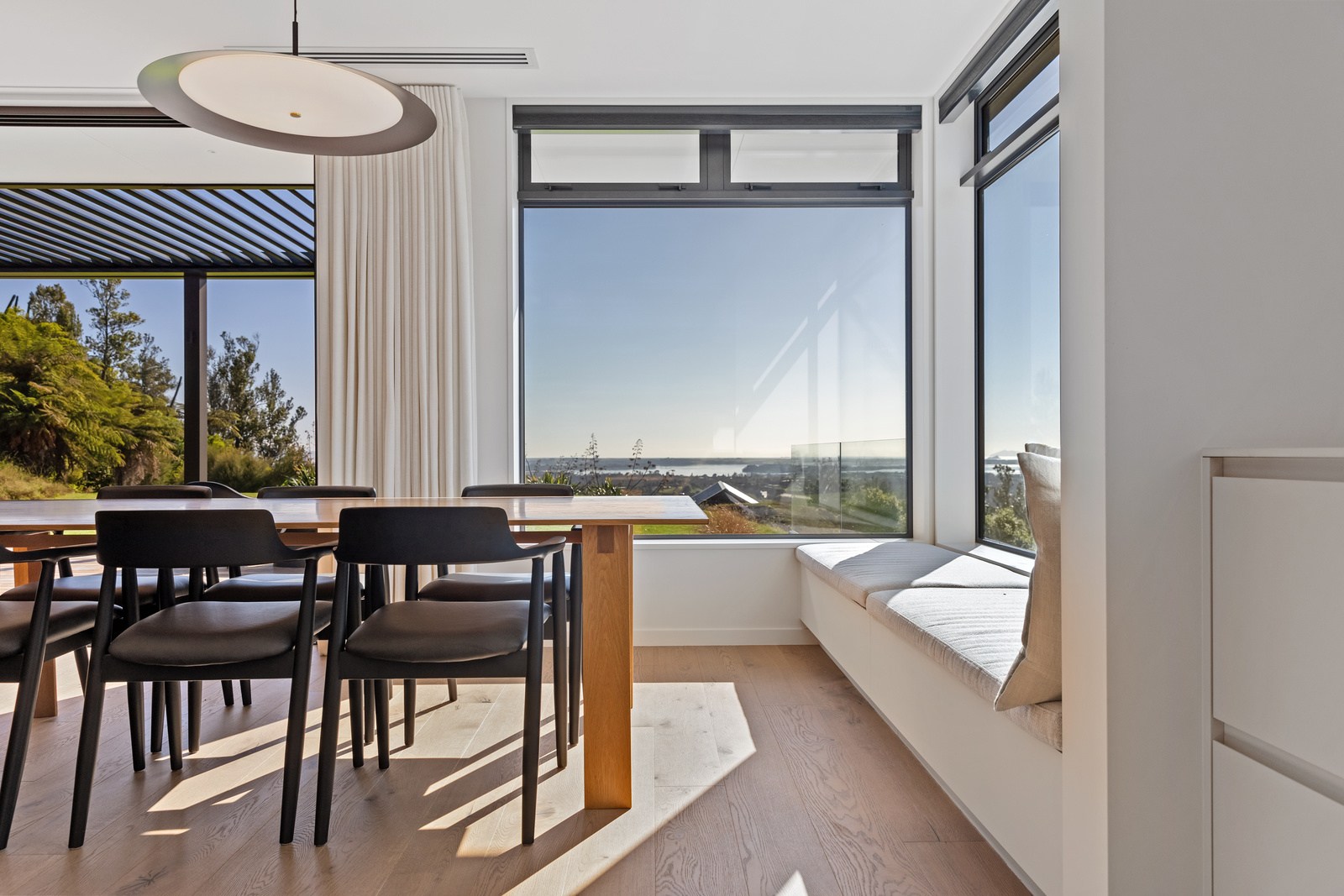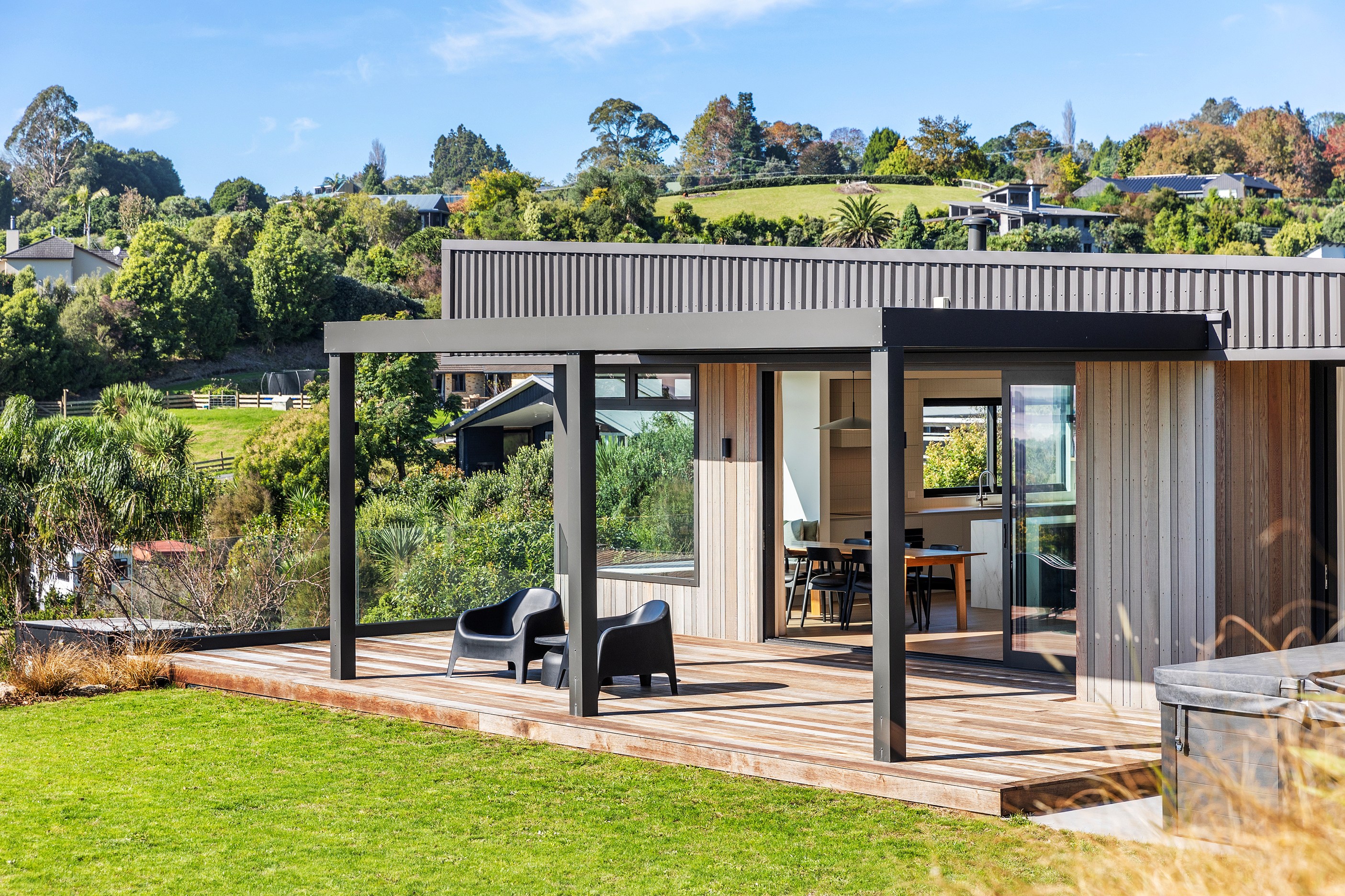 Two bedrooms, a family bathroom, media room and small office, tuck in privately beyond the open-plan living. The sweeping panoramic view is maximised by the home’s elevated site and expansive use of glazing throughout. Floor-to-ceiling stacking sliders, ensure uninterrupted flow between interior living spaces and the generous deck, shared by the main living area and the main suite. Outdoor living is further enhanced by an overhead pergola, providing year-round shelter and comfort. Every element has been curated to ensure this home feels both refined and deeply connected to its landscape.