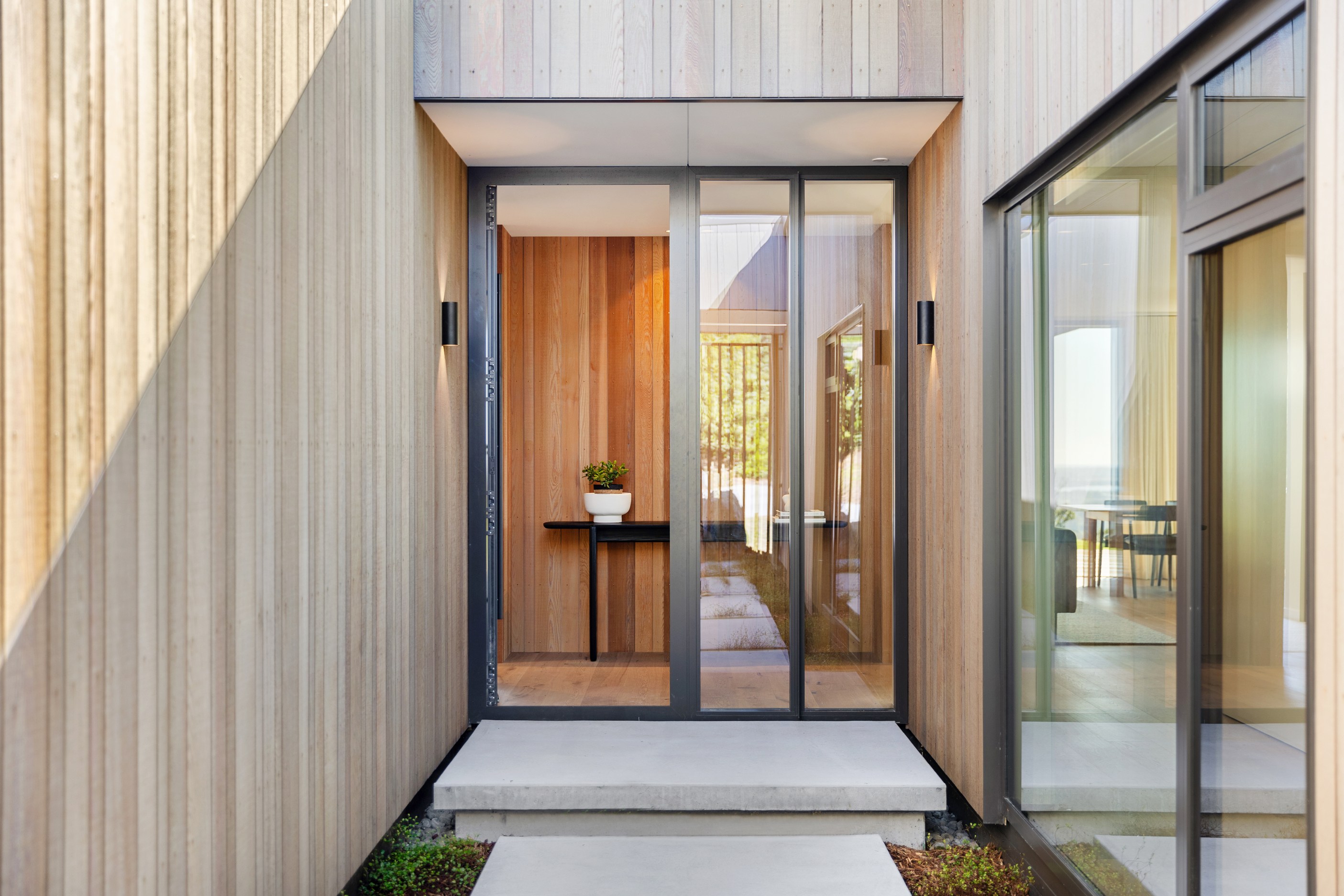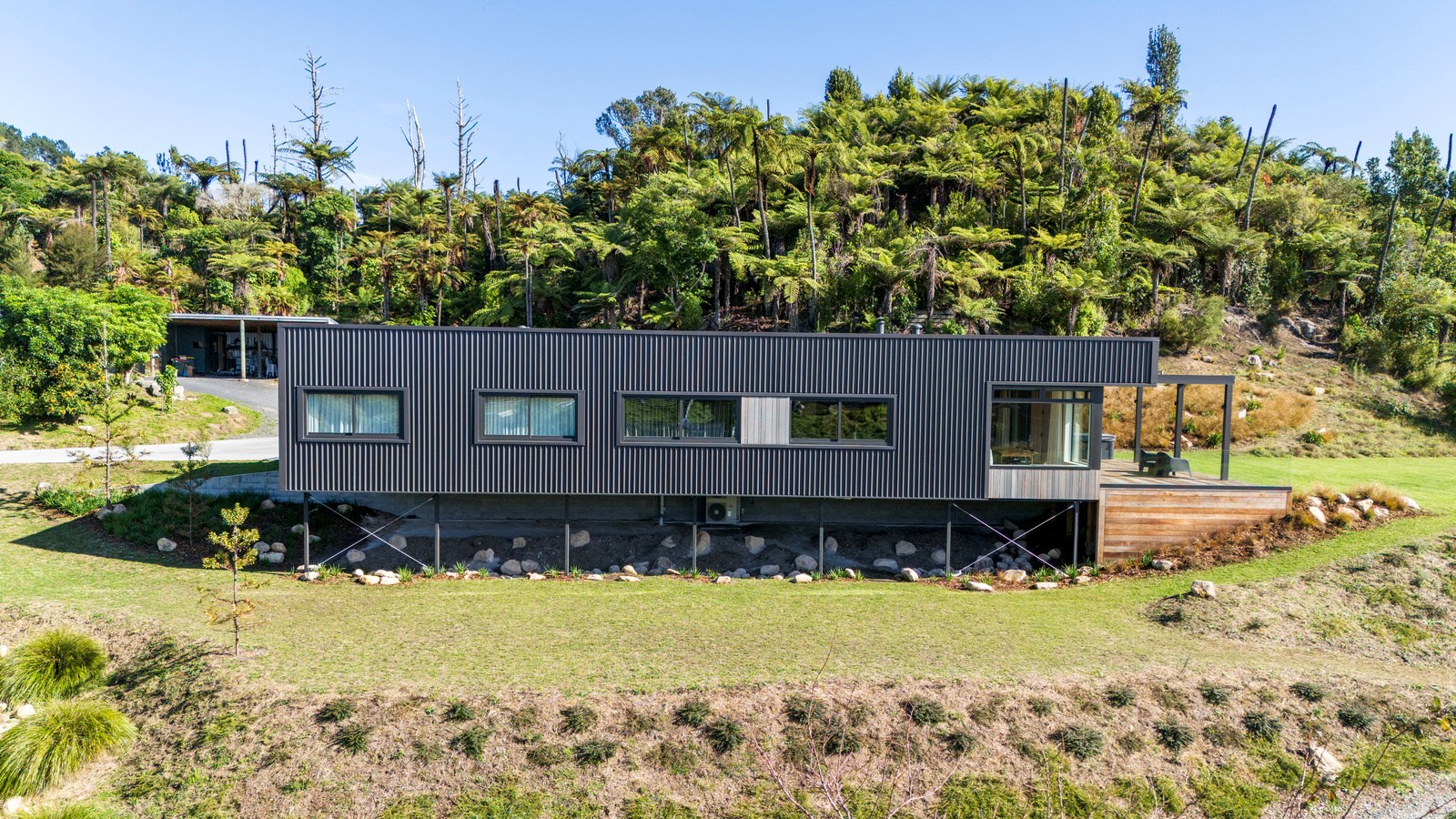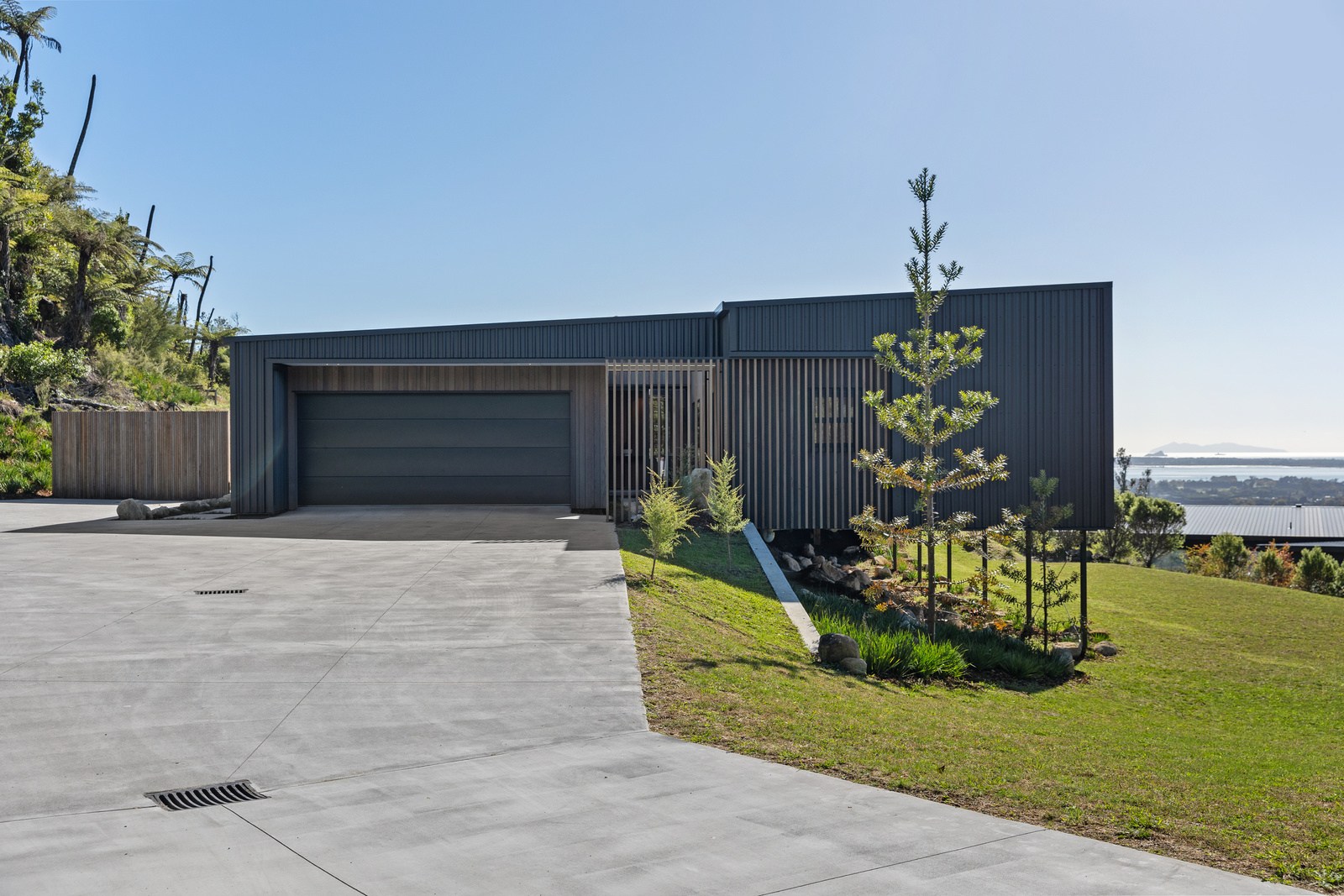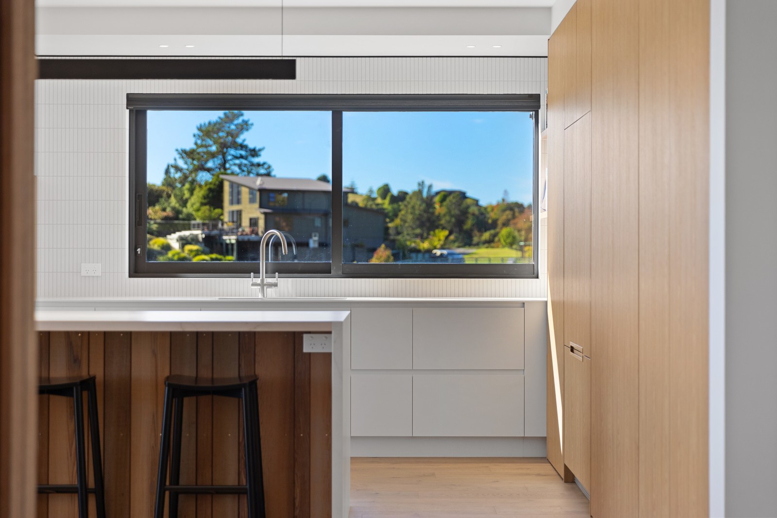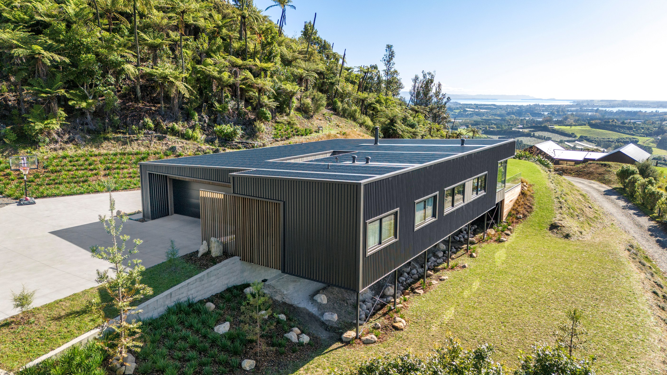 Two bedrooms, a family bathroom, media room and small office, tuck in privately beyond the open-plan living. The sweeping panoramic view is maximised by the home’s elevated site and expansive use of glazing throughout. Floor-to-ceiling stacking sliders, ensure uninterrupted flow between interior living spaces and the generous deck, shared by the main living area and the main suite. Outdoor living is further enhanced by an overhead pergola, providing year-round shelter and comfort. Every element has been curated to ensure this home feels both refined and deeply connected to its landscape.