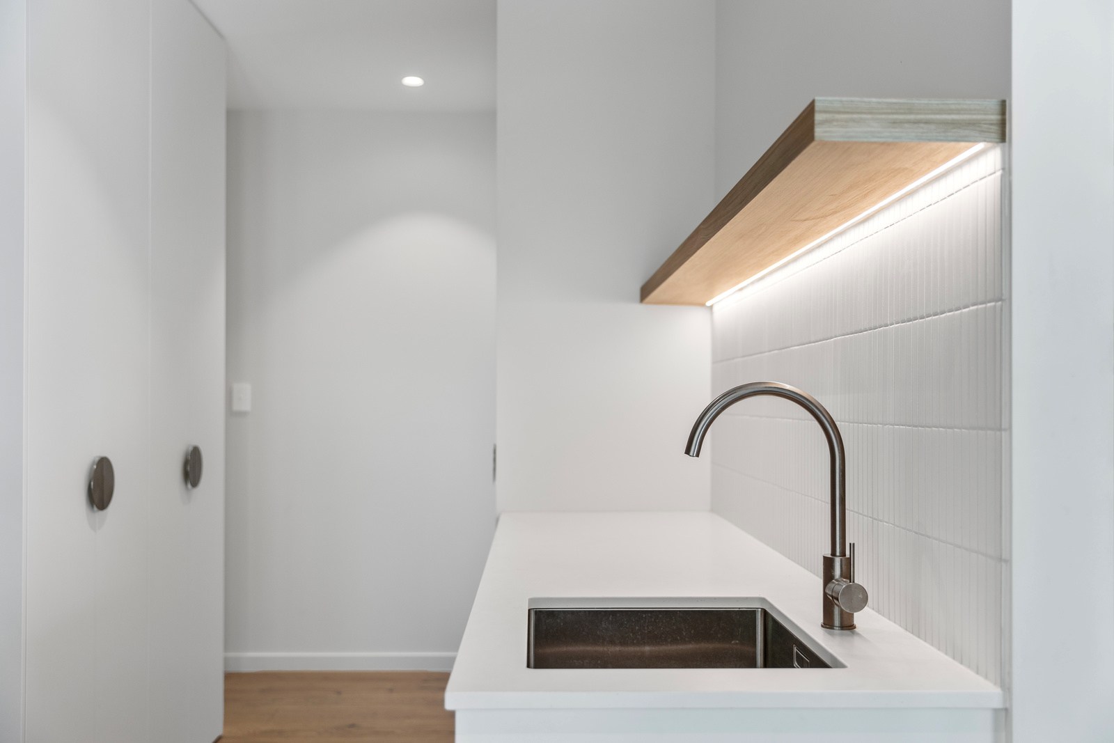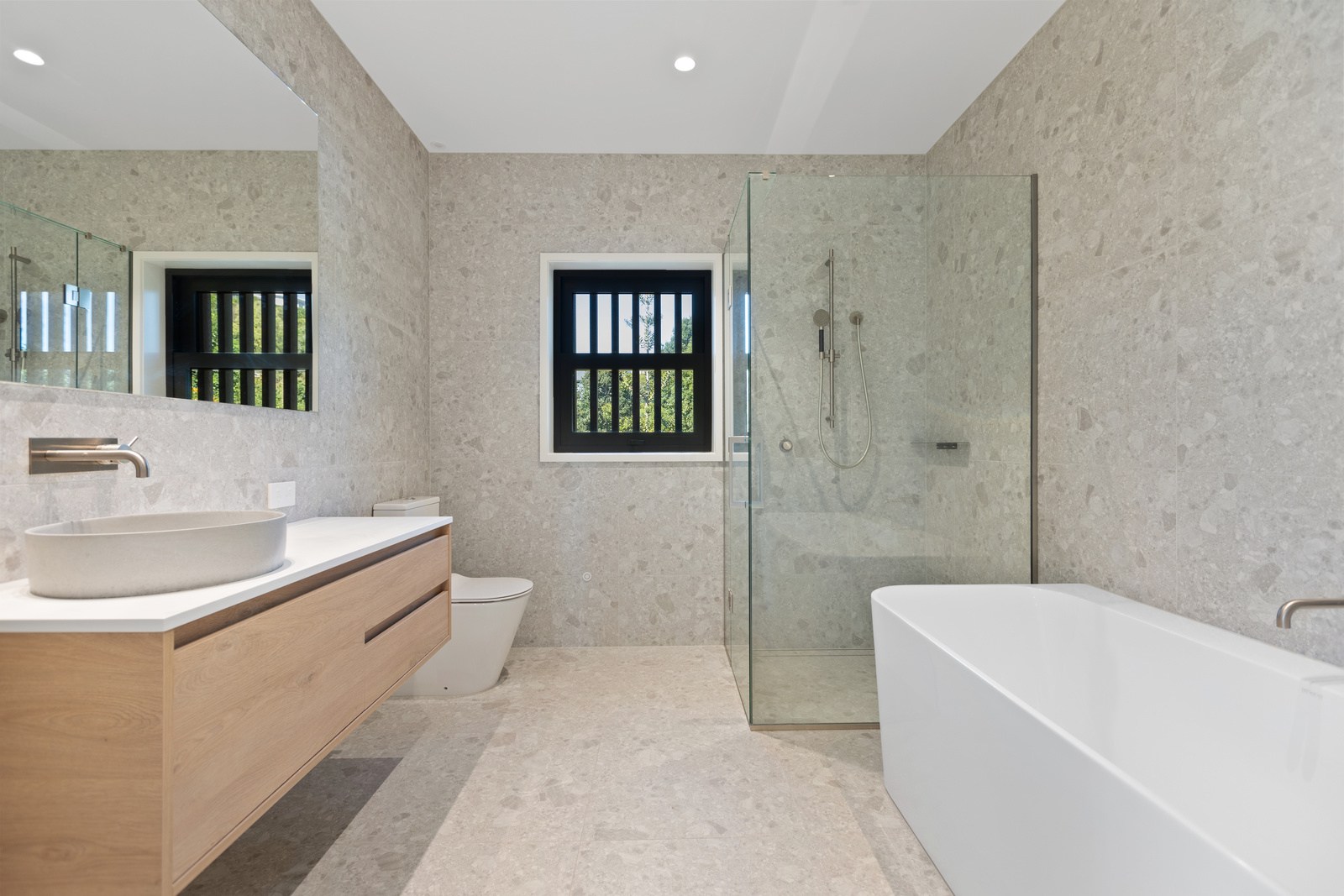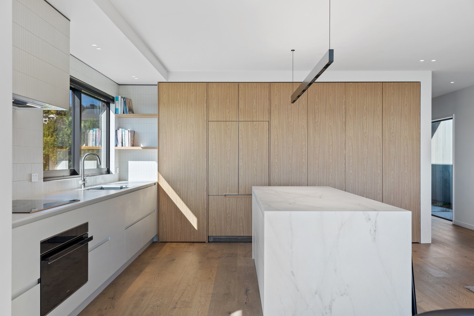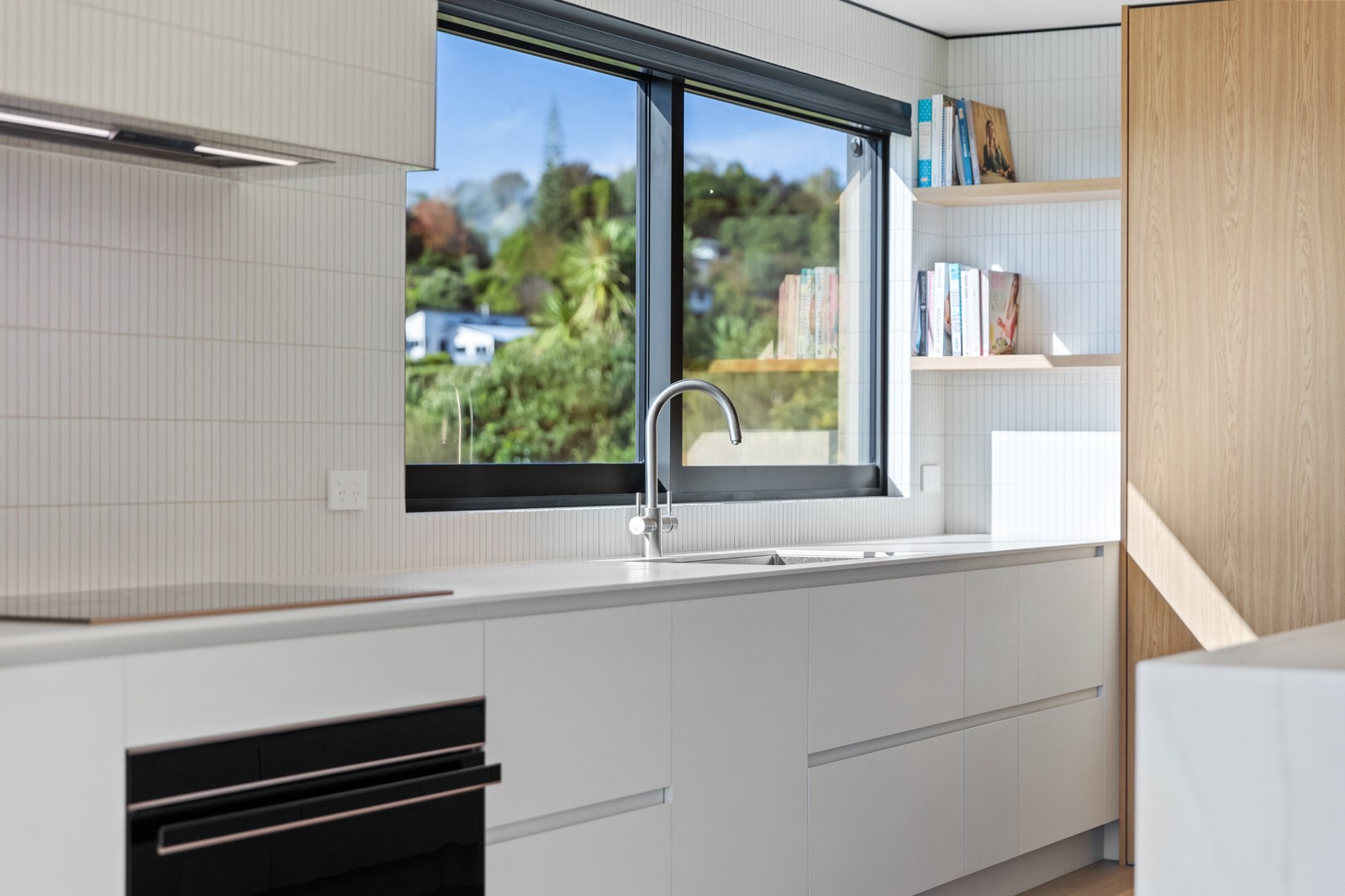 Two bedrooms, a family bathroom, media room and small office, tuck in privately beyond the open-plan living. The sweeping panoramic view is maximised by the home’s elevated site and expansive use of glazing throughout. Floor-to-ceiling stacking sliders, ensure uninterrupted flow between interior living spaces and the generous deck, shared by the main living area and the main suite. Outdoor living is further enhanced by an overhead pergola, providing year-round shelter and comfort. Every element has been curated to ensure this home feels both refined and deeply connected to its landscape.