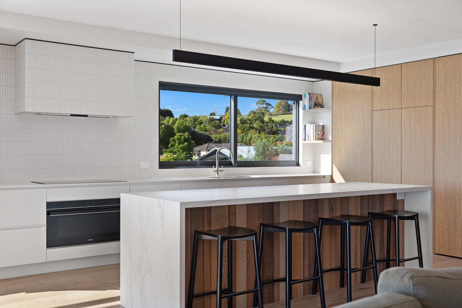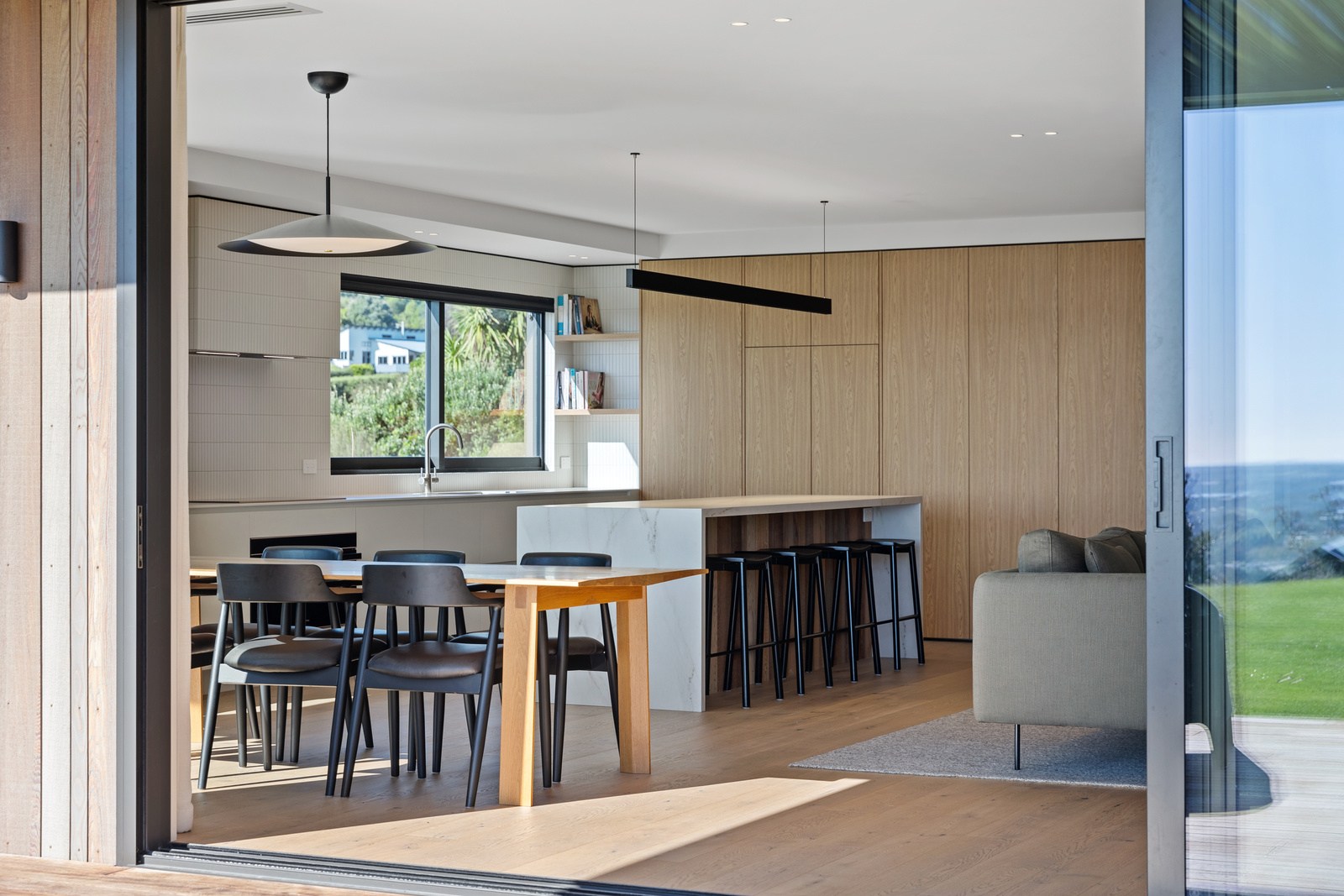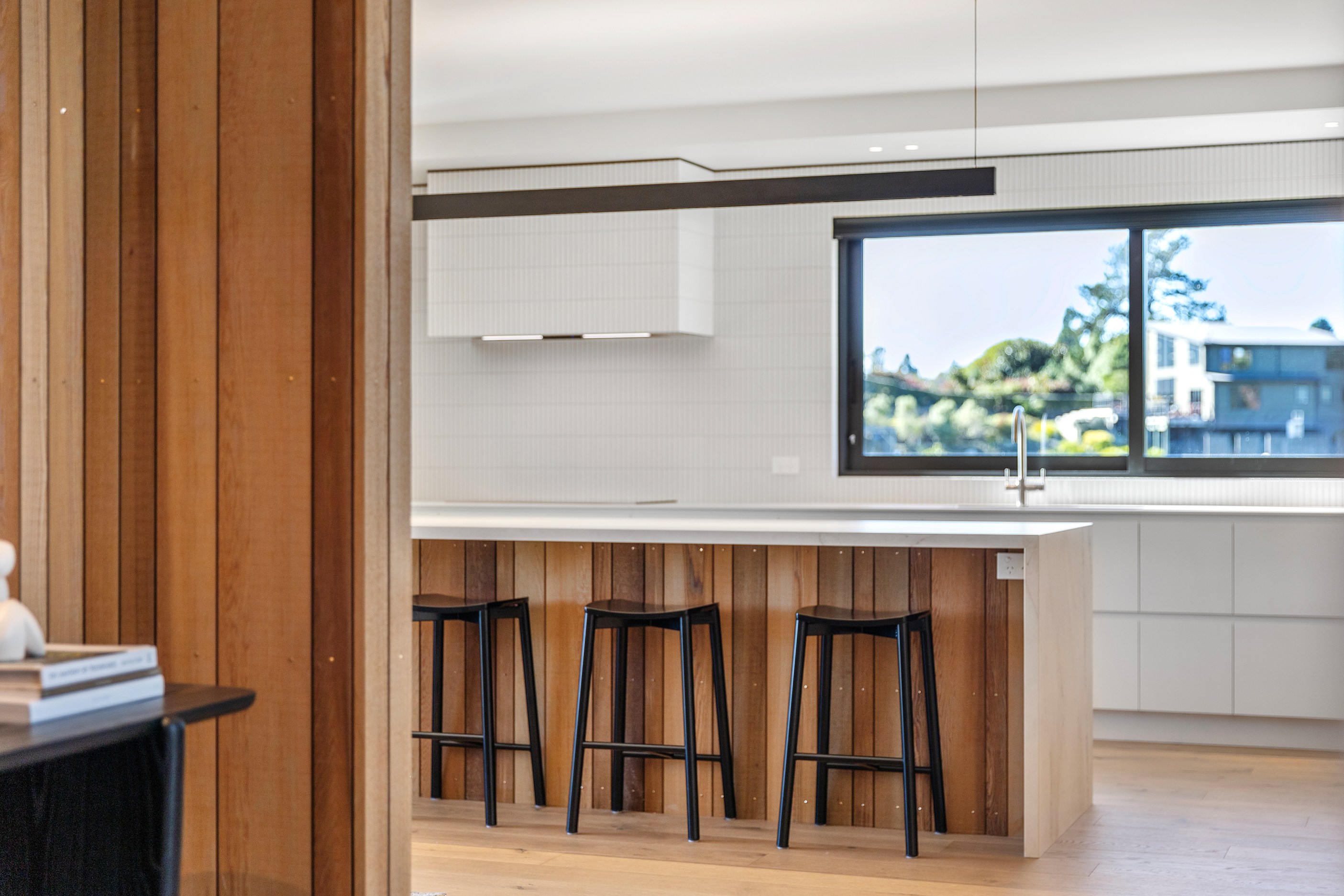 Set against the luscious bush of this rural ridgeline, this striking home blends architectural form with the natural environment. The exterior of the 247sqm residence is clad in a combination of cedar and dark steel that work to ensure it sits comfortably in its surrounds. The clean lines of this design begin at the welcoming entrance, which leads you through into the expansive, light-filled spaces beyond. Once inside, the home unfolds with meticulous attention to detail and craftsmanship. The interior design complements the architecture with a restrained, textural palette that champions natural materials and understated elegance. Cedar-panelled walls and streamlined cabinetry create layers of interest.