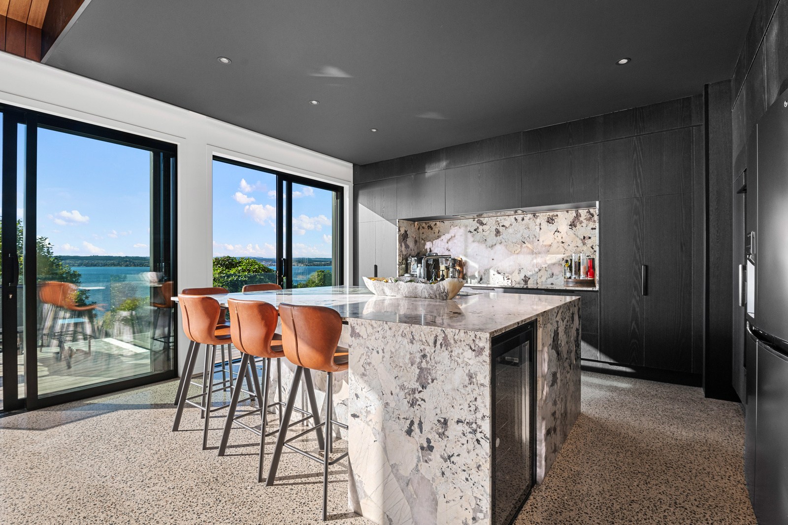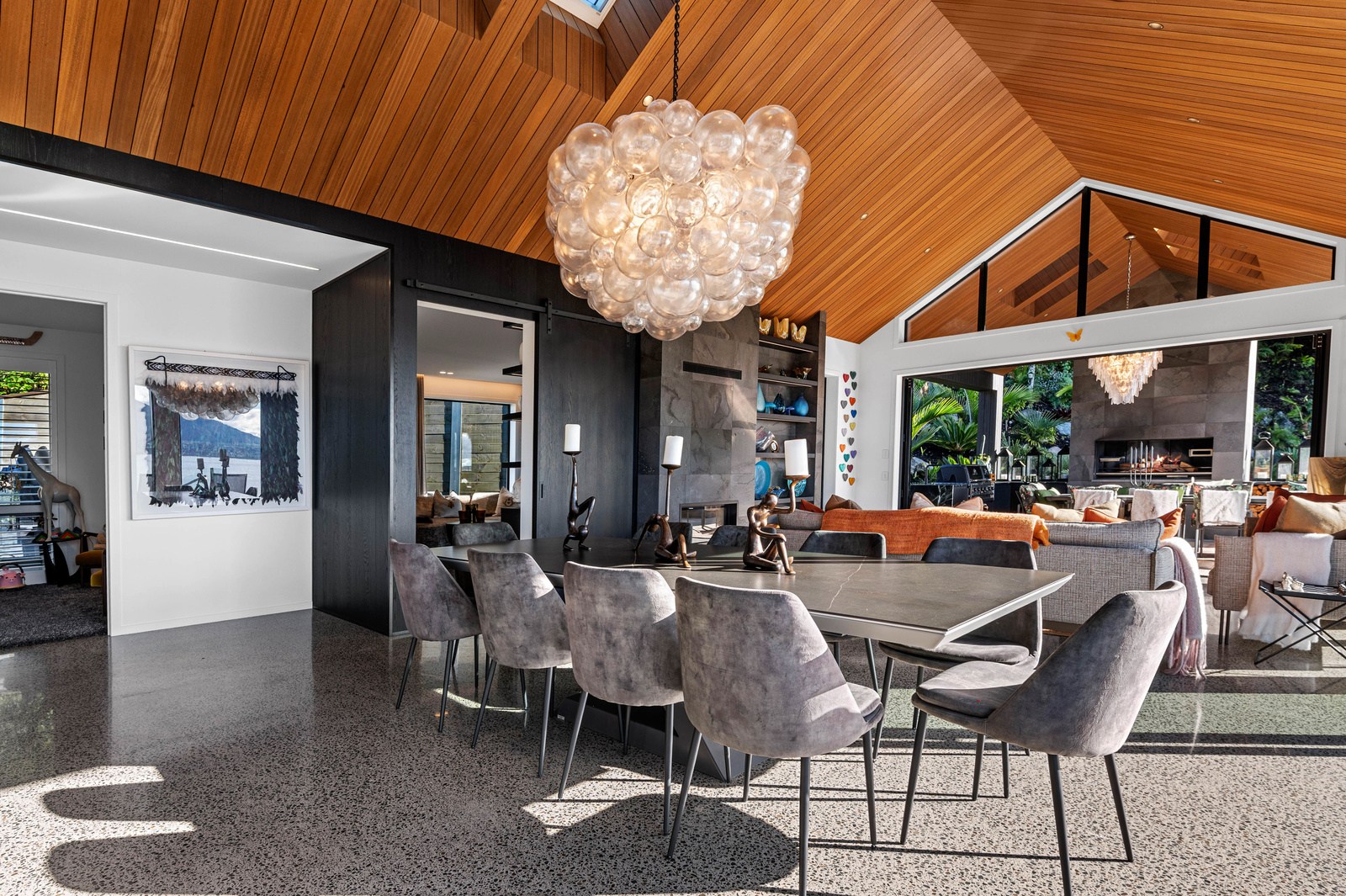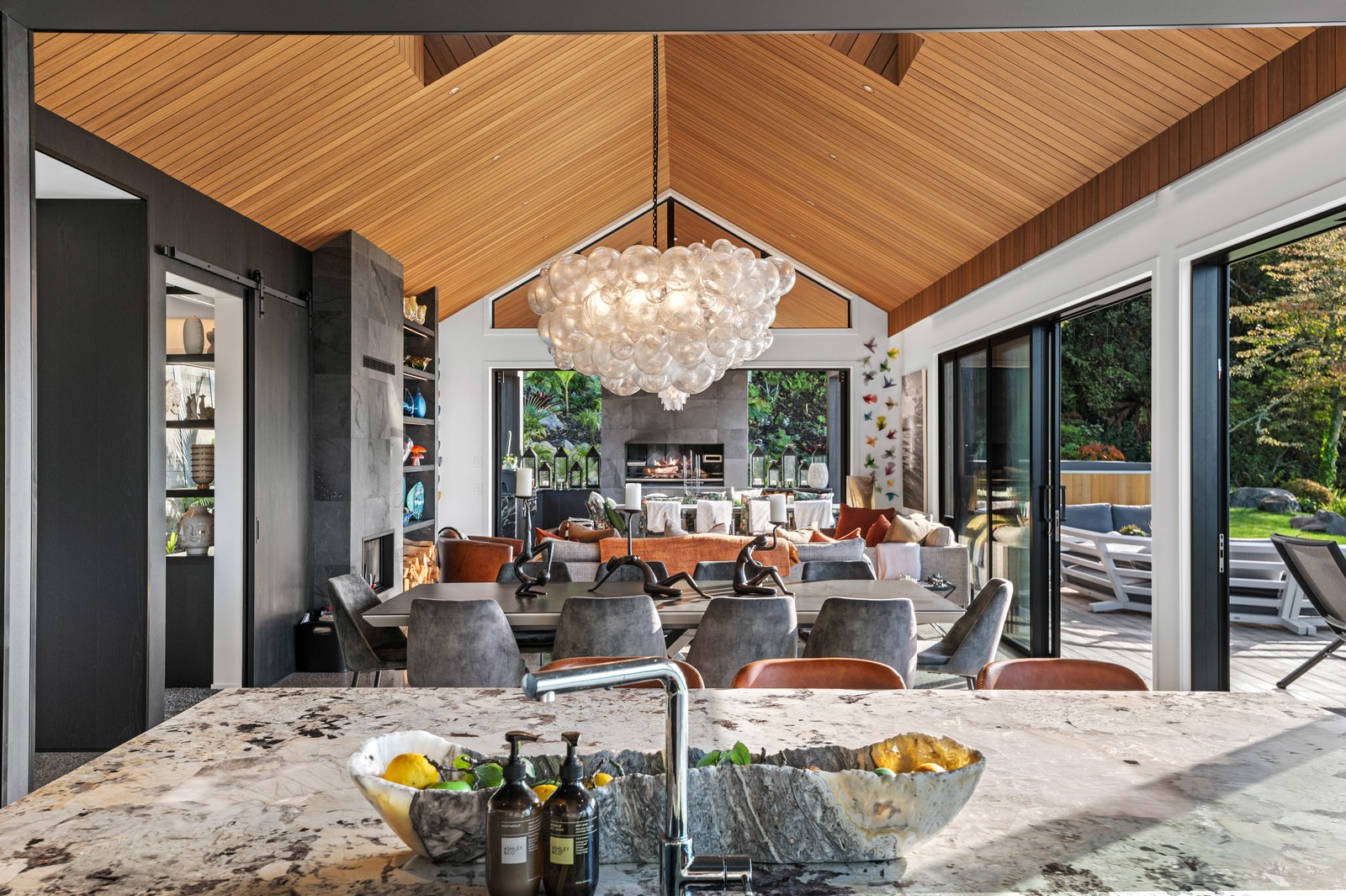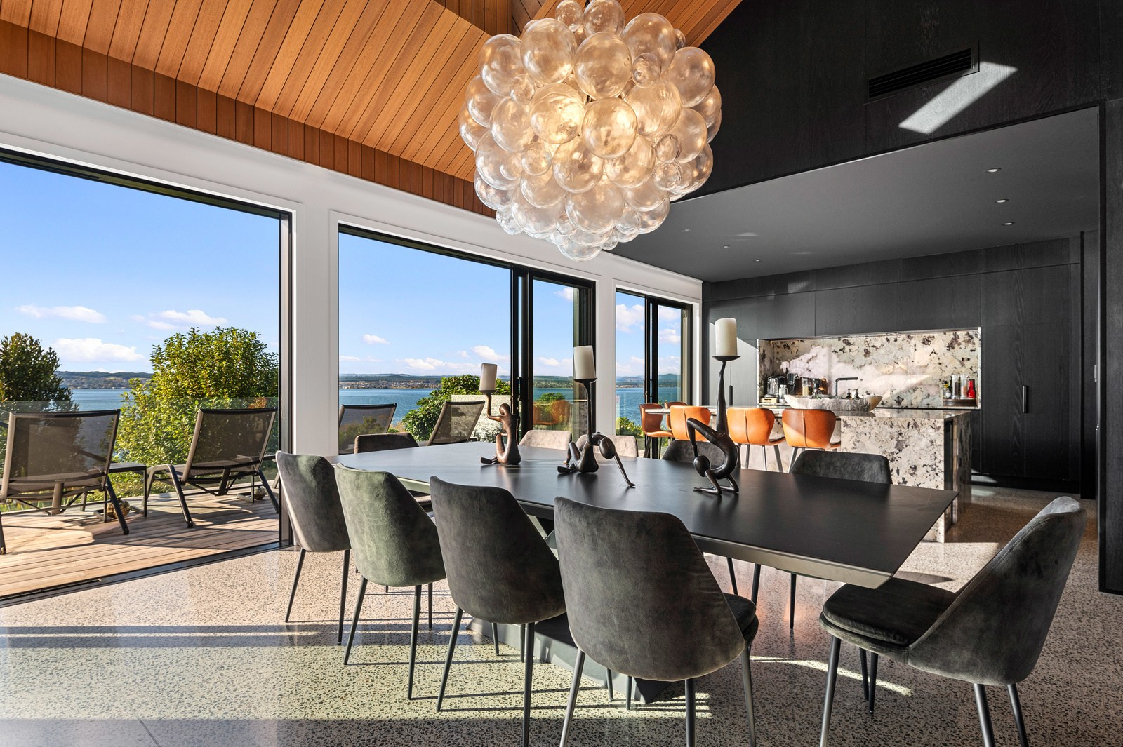 Inside, the central living space is a standout. Banks of windows and a continuous timber ceiling and soffits create a sense of flow between the kitchen, dining and lounge areas and the outdoor living room. A marble-slab island and splashback, backlit for dramatic effect, nod to the region’s volcanic history. Timber cladding and linings are paired with natural bluestone tiles, reinforcing the connection to the surrounding environment. Bedrooms are split across levels, with noise-reducing concreteslab flooring separating zones. One lower-level bathroom is cleverly designed to handle heavy family use. This home balances scale with softness — a retreat built for togetherness and tranquillity.
