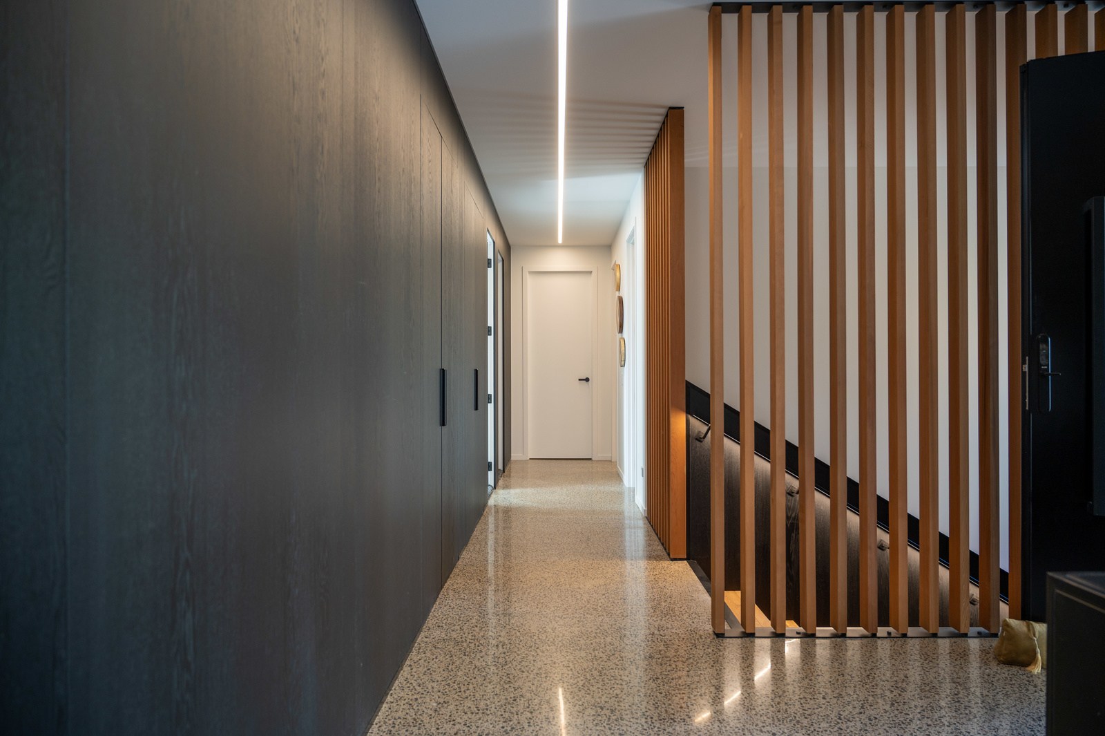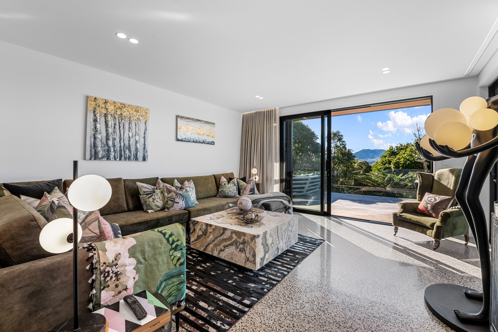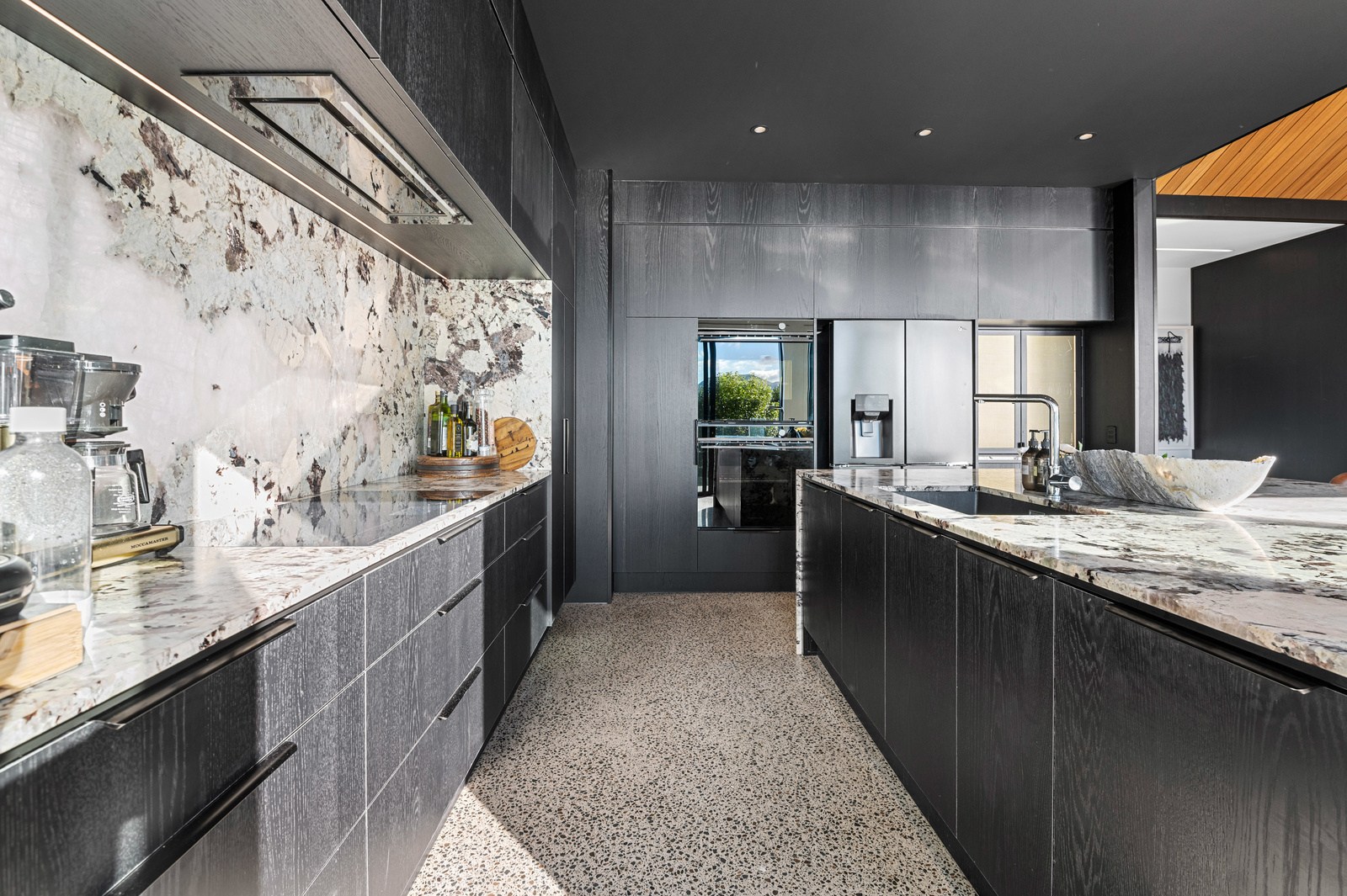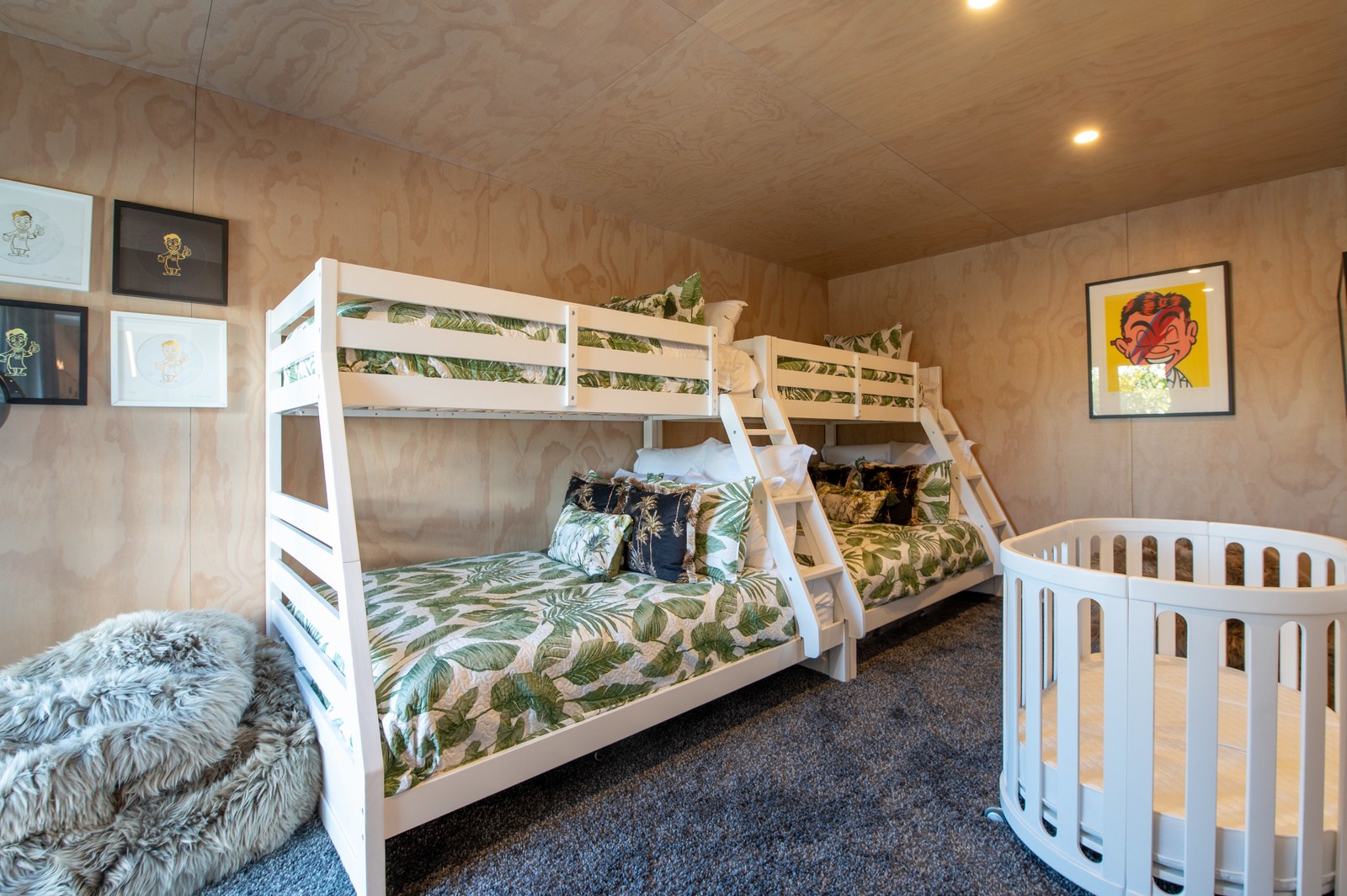 Inside, the central living space is a standout. Banks of windows and a continuous timber ceiling and soffits create a sense of flow between the kitchen, dining and lounge areas and the outdoor living room. A marble-slab island and splashback, backlit for dramatic effect, nod to the region’s volcanic history. Timber cladding and linings are paired with natural bluestone tiles, reinforcing the connection to the surrounding environment. Bedrooms are split across levels, with noise-reducing concreteslab flooring separating zones. One lower-level bathroom is cleverly designed to handle heavy family use. This home balances scale with softness — a retreat built for togetherness and tranquillity.