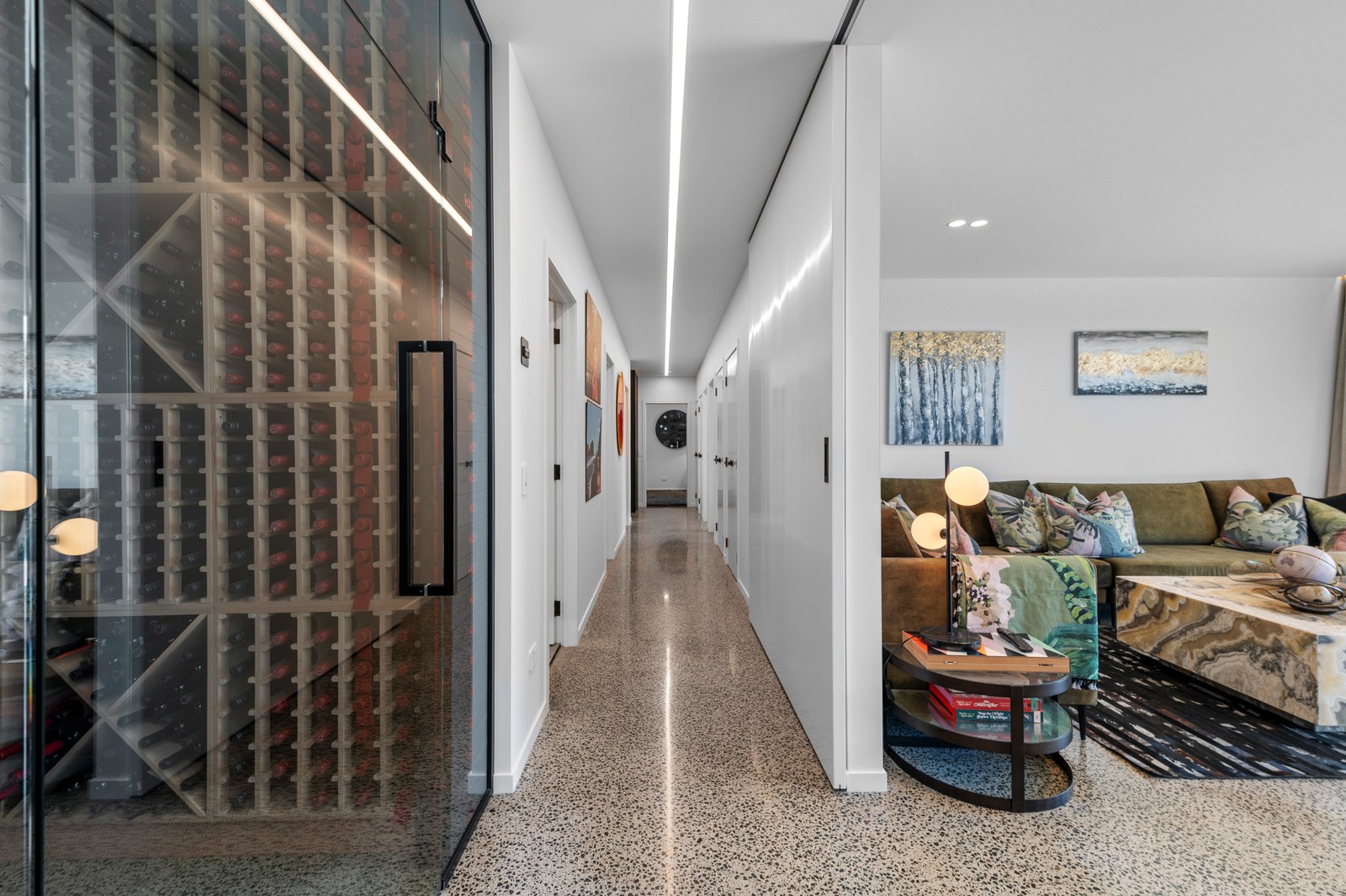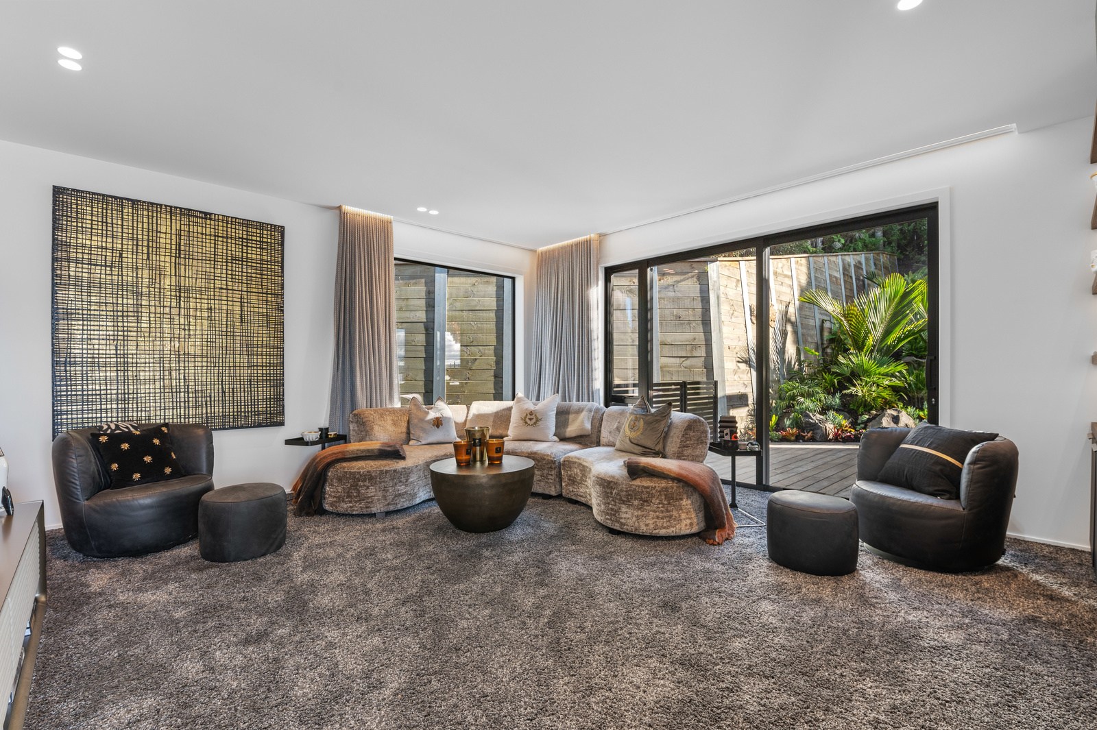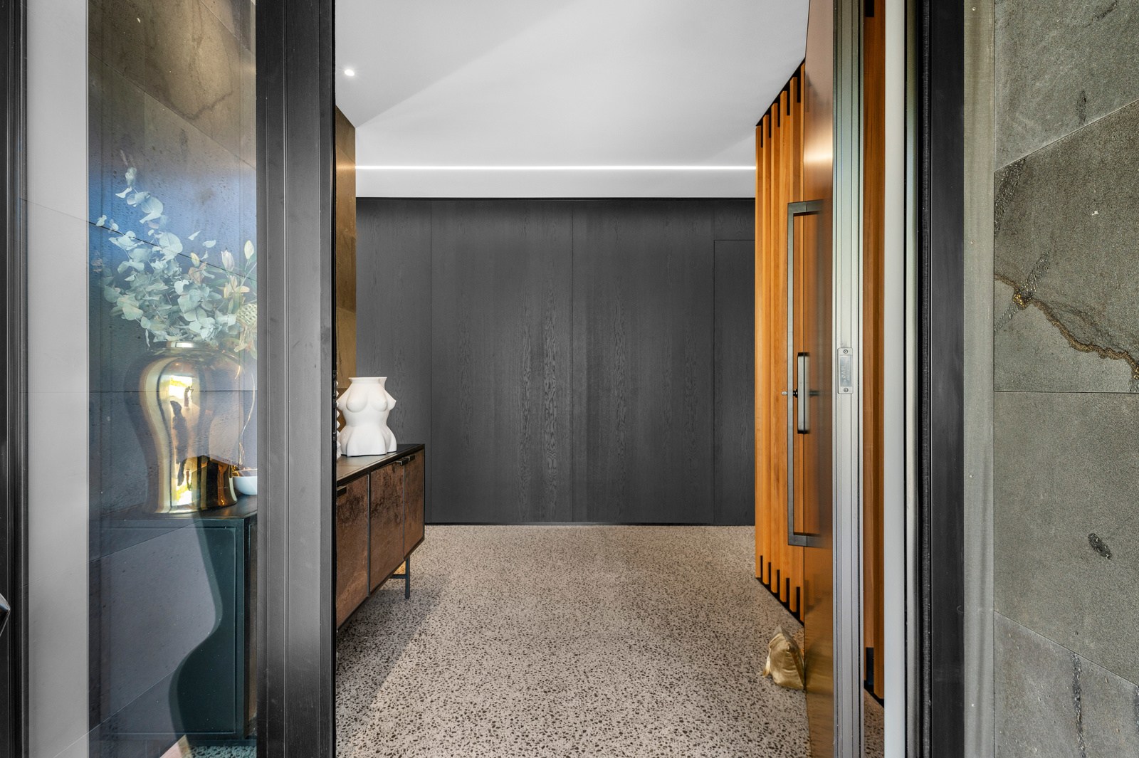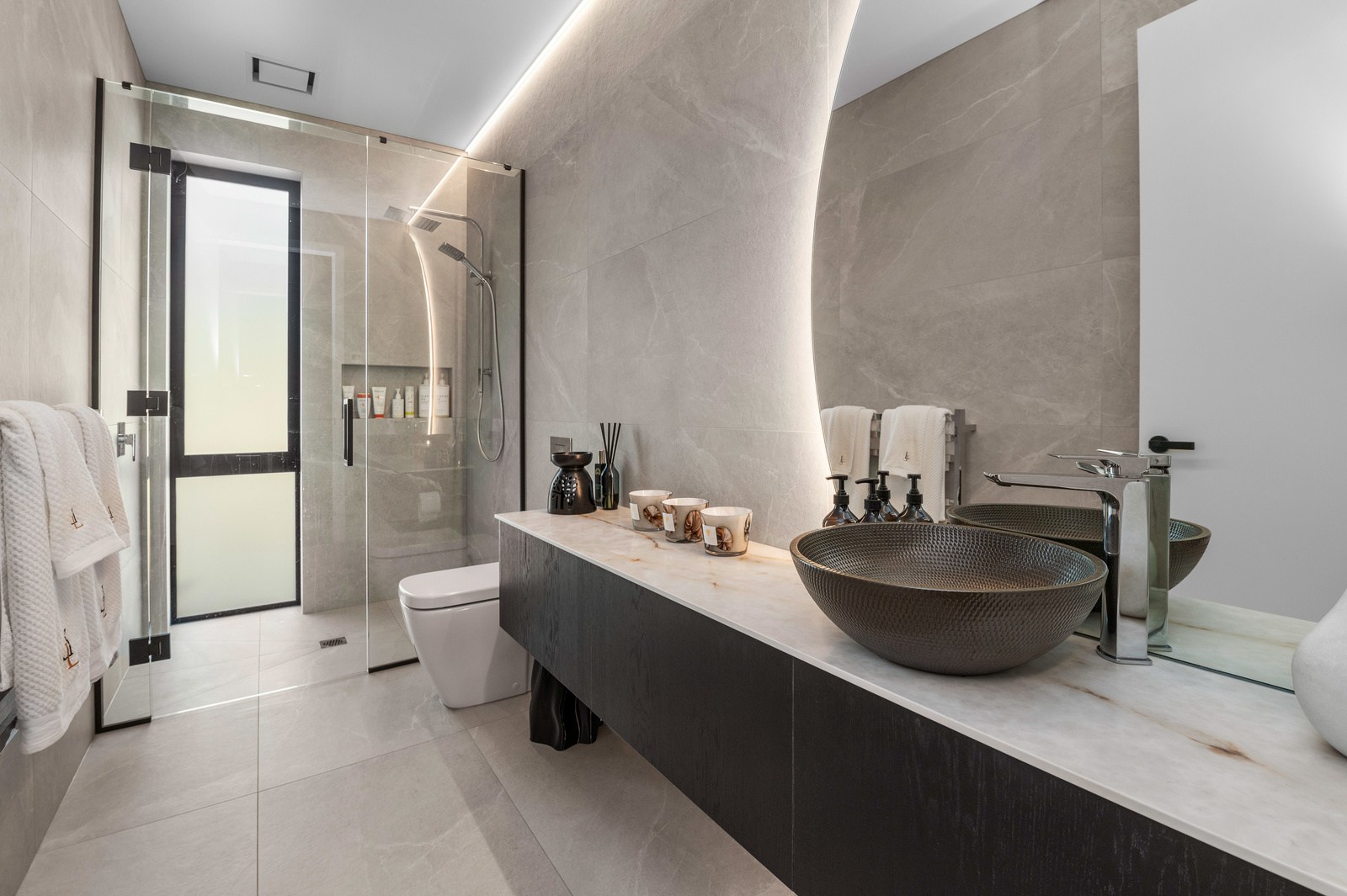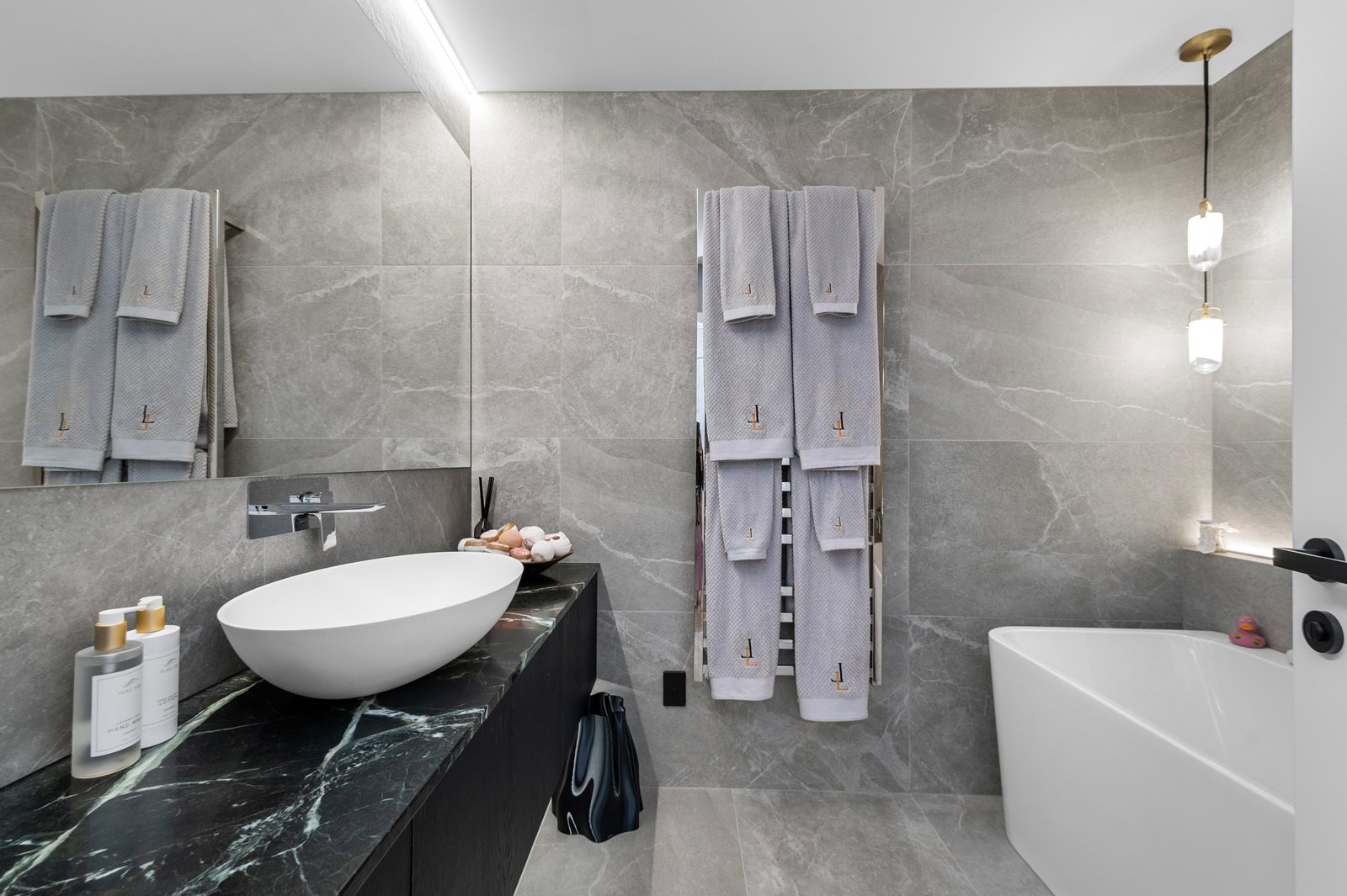 Inside, the central living space is a standout. Banks of windows and a continuous timber ceiling and soffits create a sense of flow between the kitchen, dining and lounge areas and the outdoor living room. A marble-slab island and splashback, backlit for dramatic effect, nod to the region’s volcanic history. Timber cladding and linings are paired with natural bluestone tiles, reinforcing the connection to the surrounding environment. Bedrooms are split across levels, with noise-reducing concreteslab flooring separating zones. One lower-level bathroom is cleverly designed to handle heavy family use. This home balances scale with softness — a retreat built for togetherness and tranquillity.