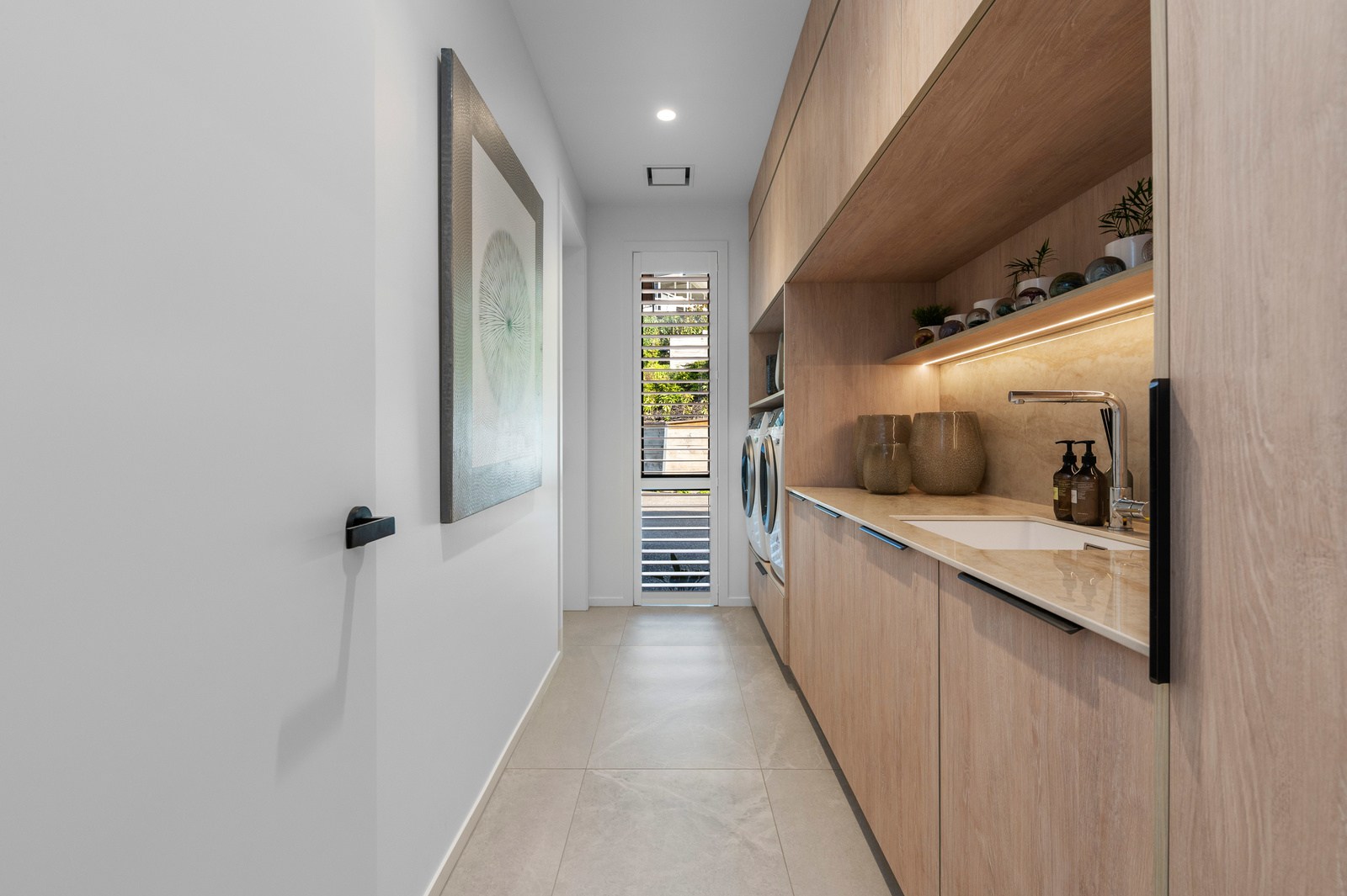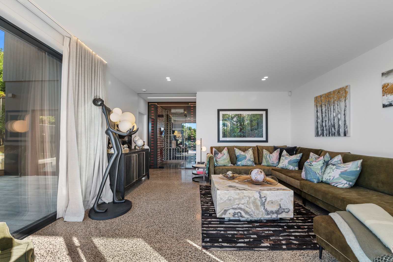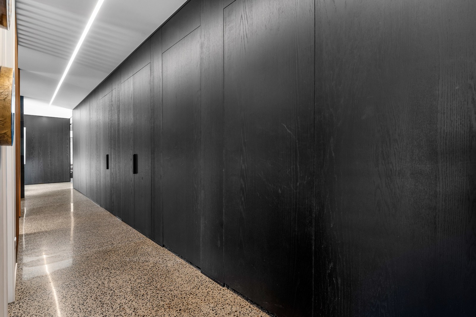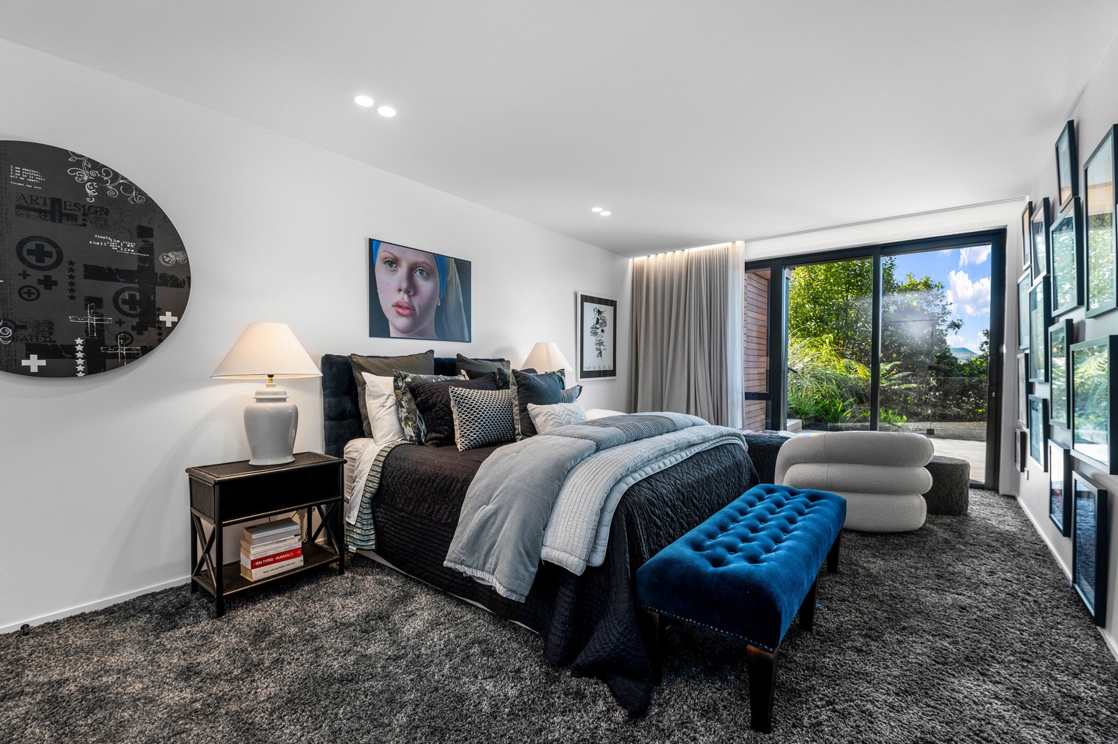 Inside, the central living space is a standout. Banks of windows and a continuous timber ceiling and soffits create a sense of flow between the kitchen, dining and lounge areas and the outdoor living room. A marble-slab island and splashback, backlit for dramatic effect, nod to the region’s volcanic history. Timber cladding and linings are paired with natural bluestone tiles, reinforcing the connection to the surrounding environment. Bedrooms are split across levels, with noise-reducing concreteslab flooring separating zones. One lower-level bathroom is cleverly designed to handle heavy family use. This home balances scale with softness — a retreat built for togetherness and tranquillity.