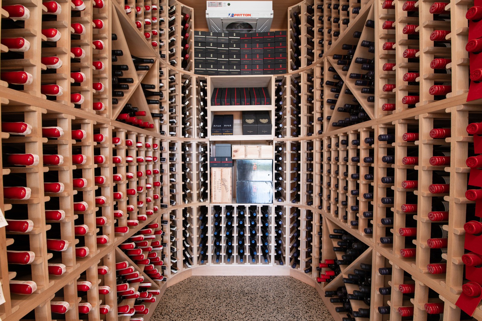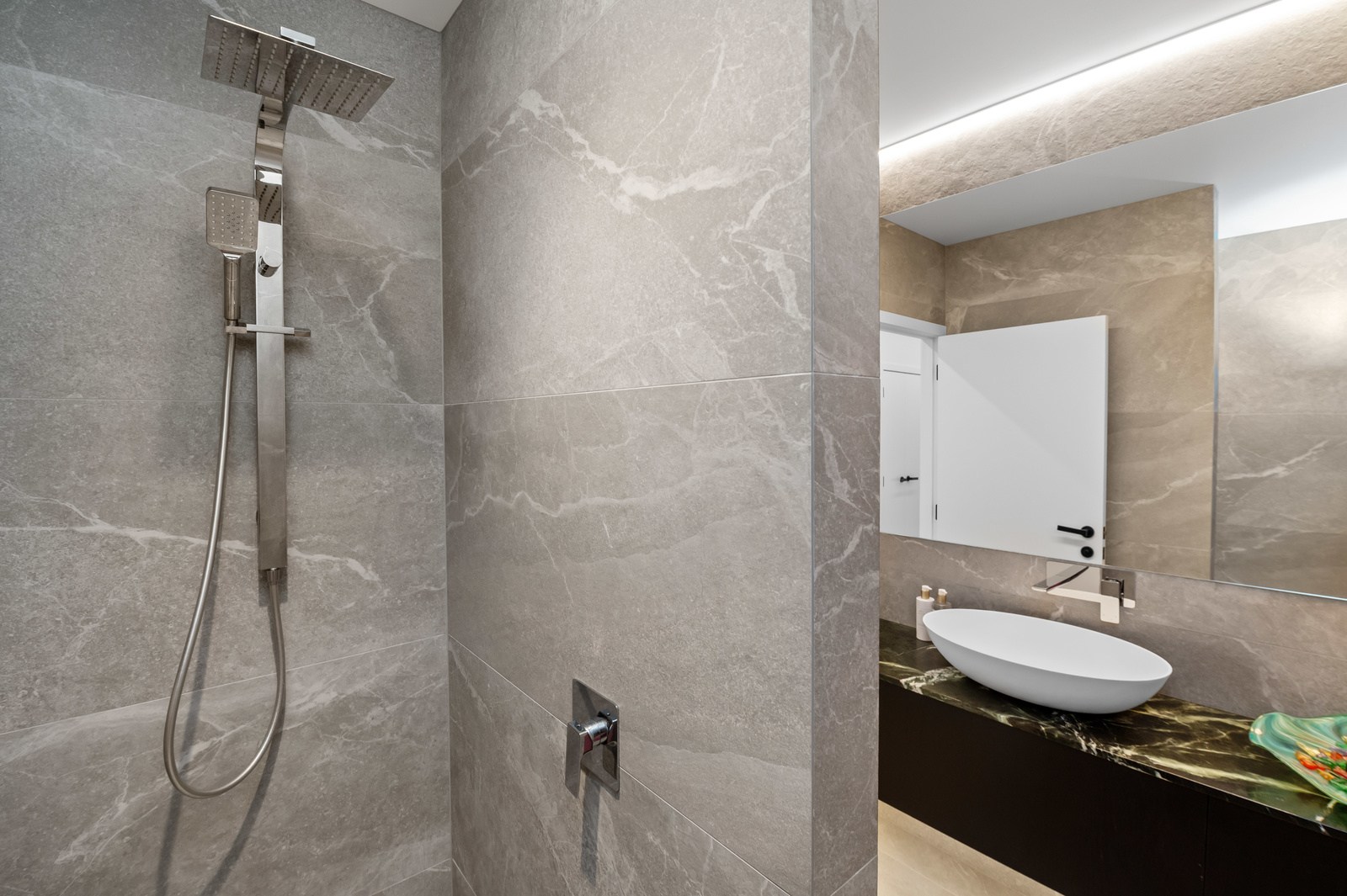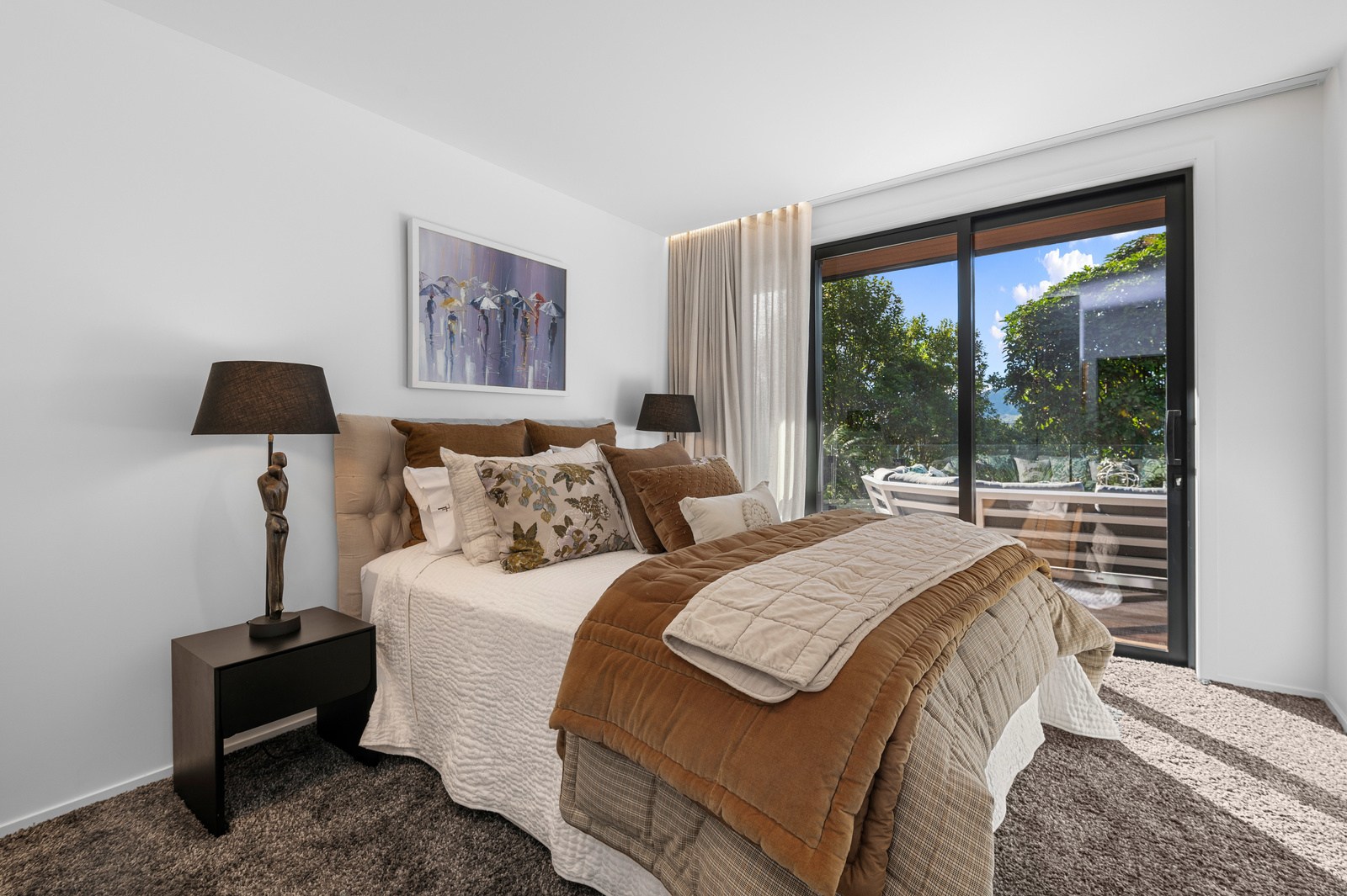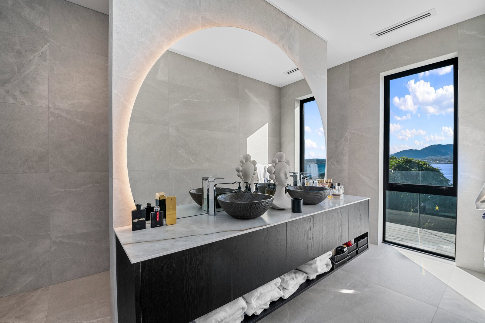 Inside, the central living space is a standout. Banks of windows and a continuous timber ceiling and soffits create a sense of flow between the kitchen, dining and lounge areas and the outdoor living room. A marble-slab island and splashback, backlit for dramatic effect, nod to the region’s volcanic history. Timber cladding and linings are paired with natural bluestone tiles, reinforcing the connection to the surrounding environment. Bedrooms are split across levels, with noise-reducing concreteslab flooring separating zones. One lower-level bathroom is cleverly designed to handle heavy family use. This home balances scale with softness — a retreat built for togetherness and tranquillity.