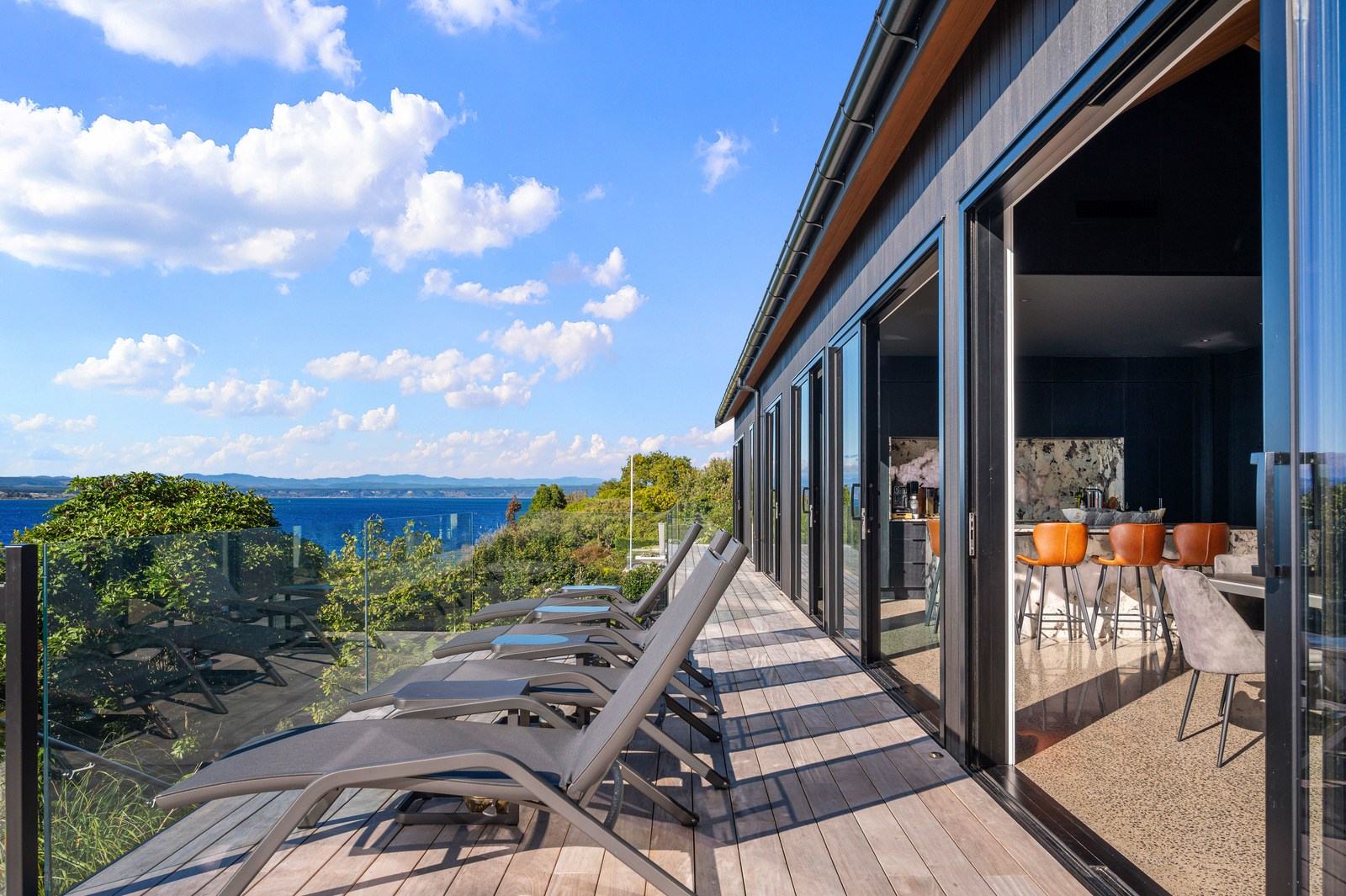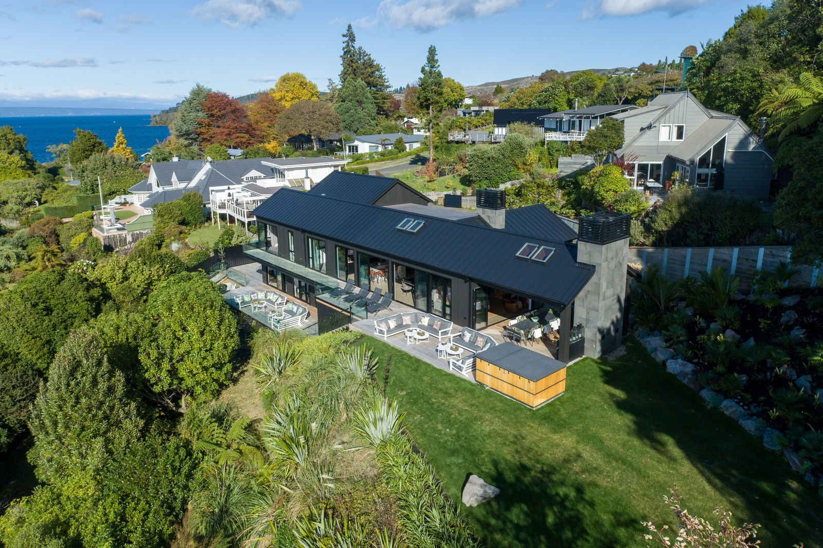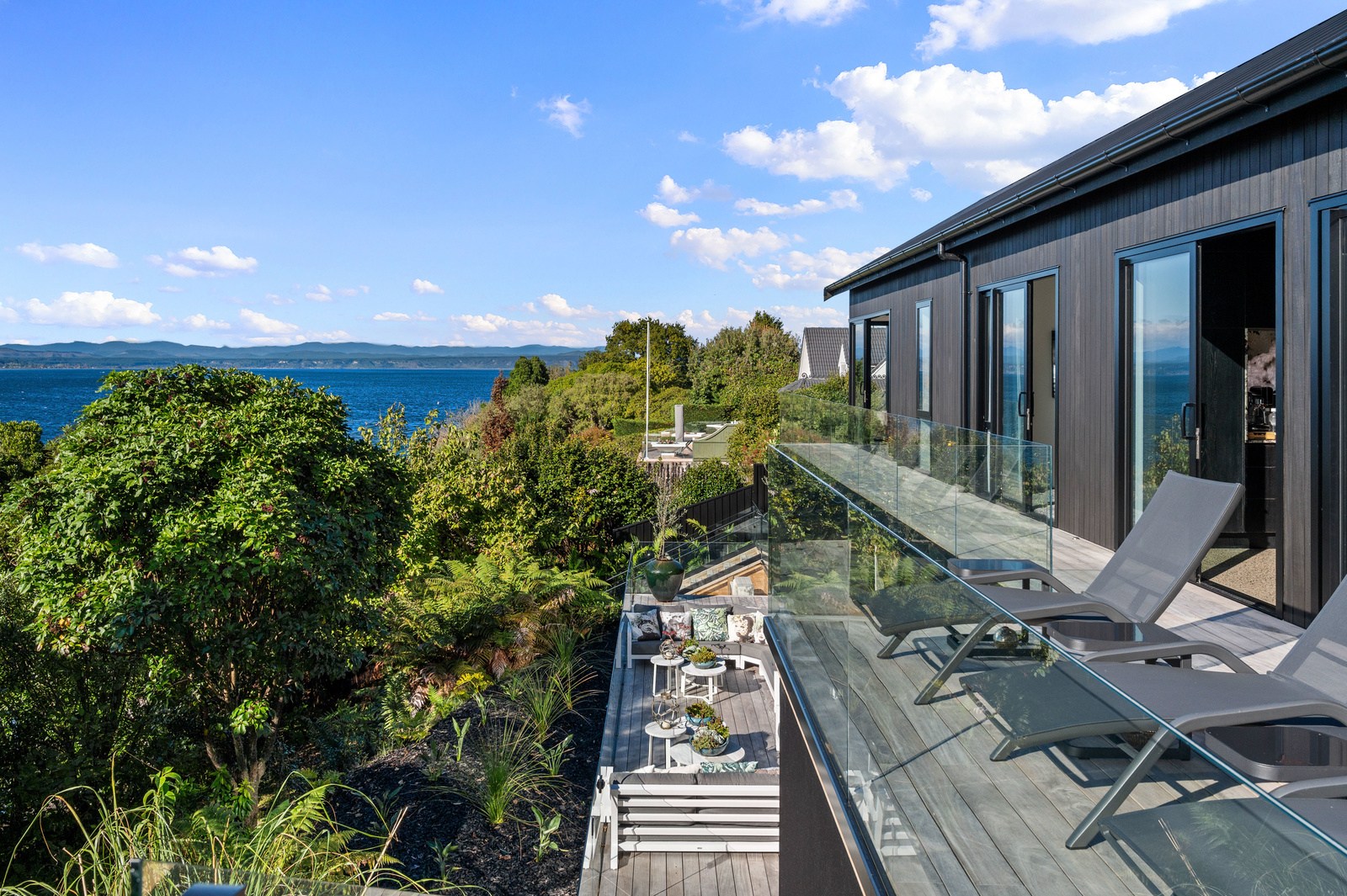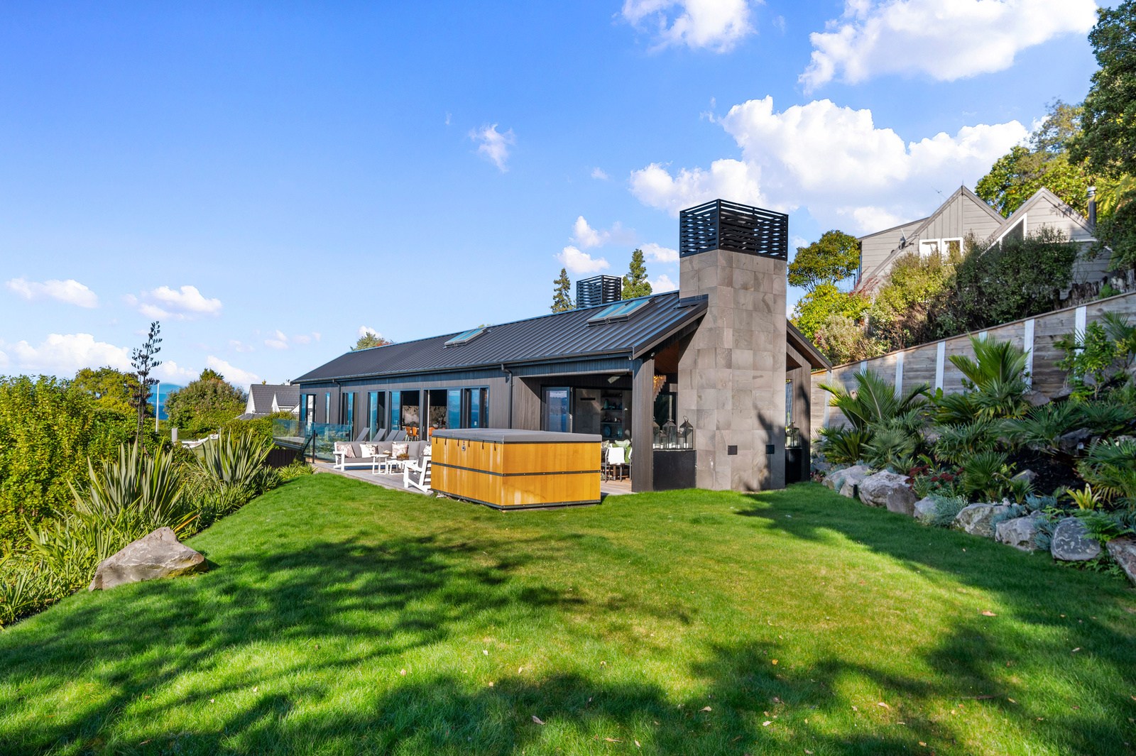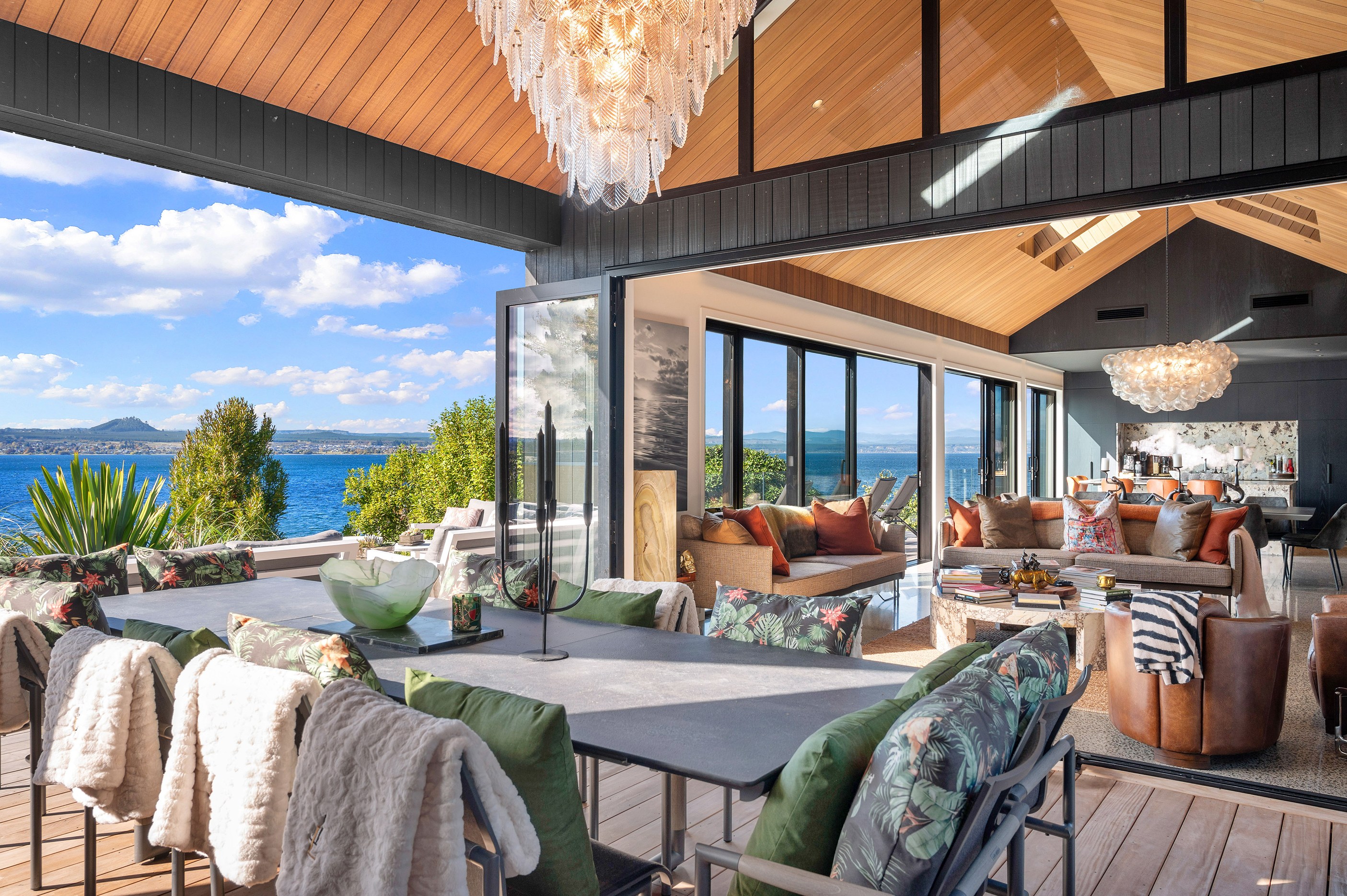 Set into the hillside above Lake Taupō, this expansive six-bedroom home was designed to accommodate an extended family, without overwhelming its surroundings. Known as Lakestone Lodge, the residence is thoughtfully positioned with a predominantly eastern outlook to the lake. Despite its 446sqm footprint, the home sits gently within the site thanks to careful use of form and materials. Gable and flat rooflines help to break up the visual mass from the approach, while dark cladding and a clean linear elevation allow the lake-facing side to recede into the landscape.
